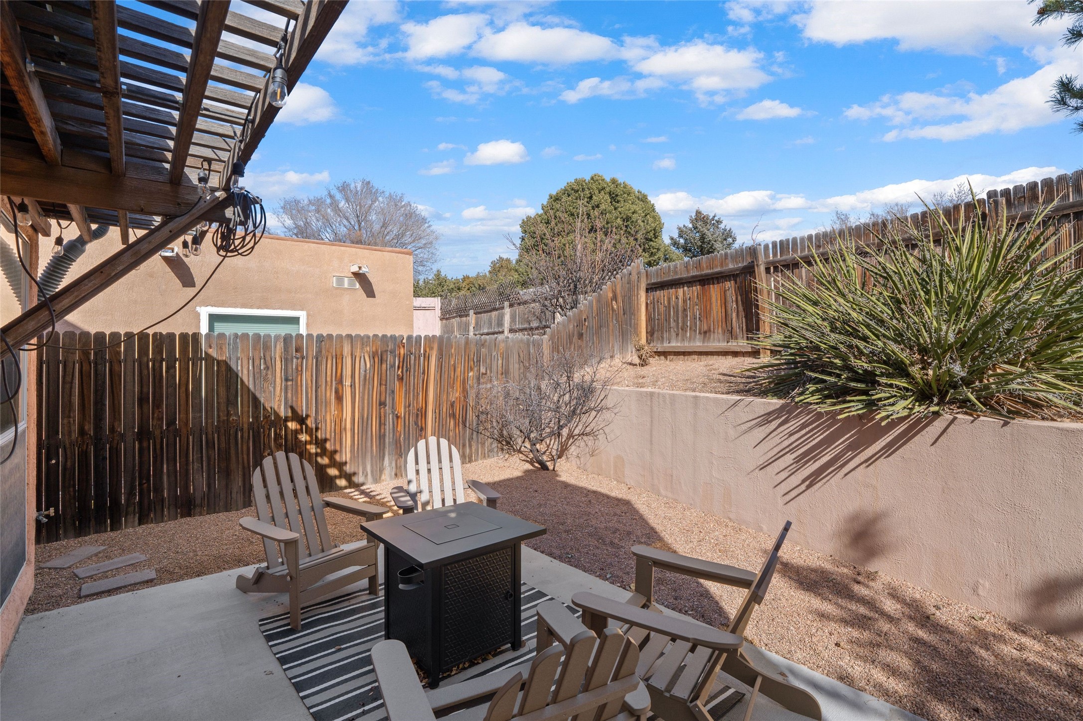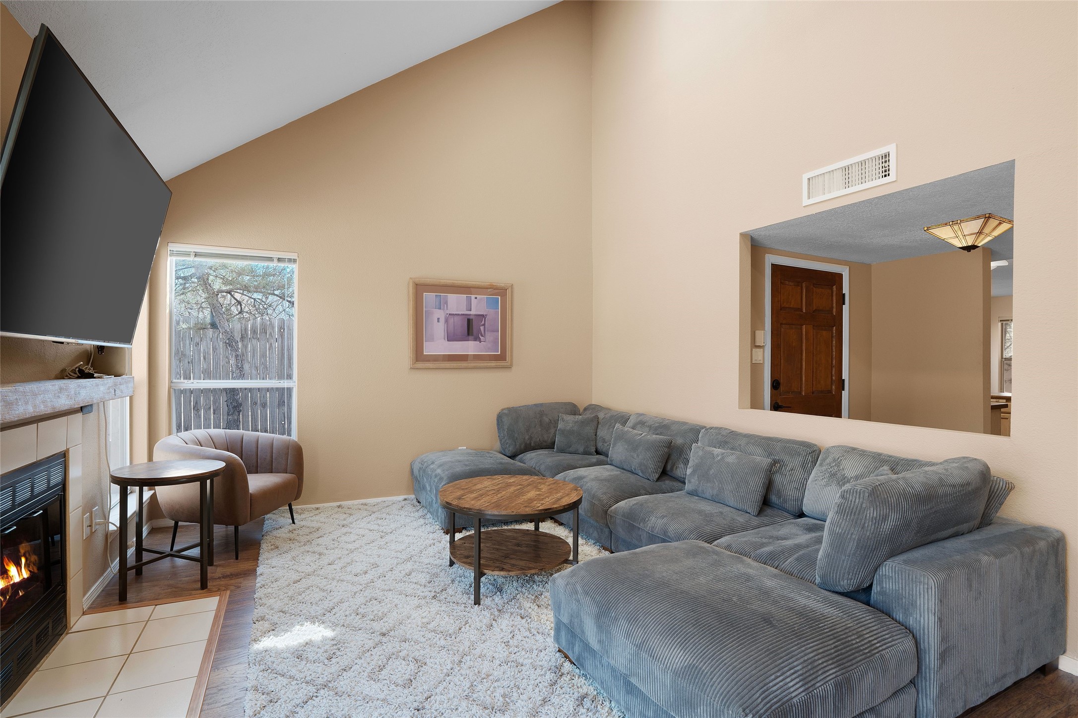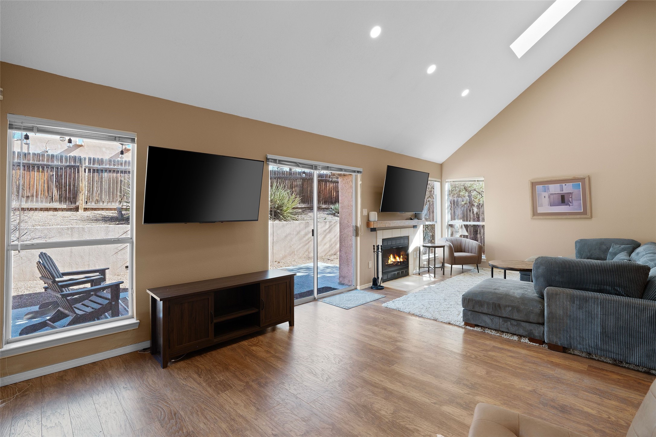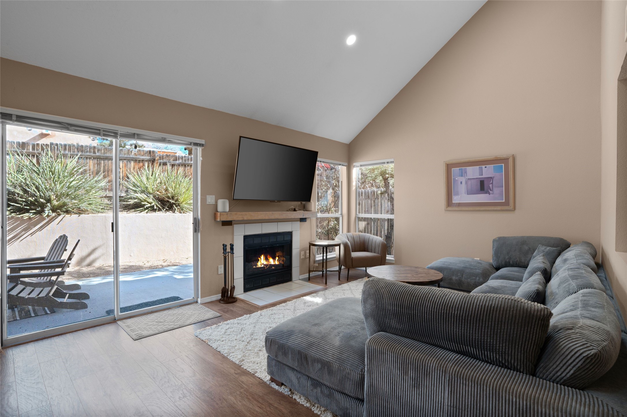 Located in the desirable Via Caballero III subdivision, this approximately 2,000 square foot home offers a blend of comfort and style, featuring three bedrooms and two and a half bathrooms. The primary bedroom features an expansive closet and sunset views. Open living spaces create an inviting atmosphere, perfect for entertaining and everday living. The heart of the home is the living room, featuring a lovely wood-burning fireplace and bathed in natural light from recently installed skylights. The space flows seamlessly to the private, fenced backyard, extending your living space outdoors. Enjoy the expansive new back patio perfect for outdoor gatherings, and the professionally updated landscaping. A new custom copper and metal Zia gate, along with new solar path lights, welcomes you at the front entrance. A thoughtful conversion of the family room provides a spacious third bedroom. Additional recent updates include a new TPO roof (with a 5 year transferable warranty), a new furnace and water heater, fresh interior paint, and a new irrigation/drainage system to expertly handle New Mexico's monsoons. This desirable home is ready for you to create lasting memories!