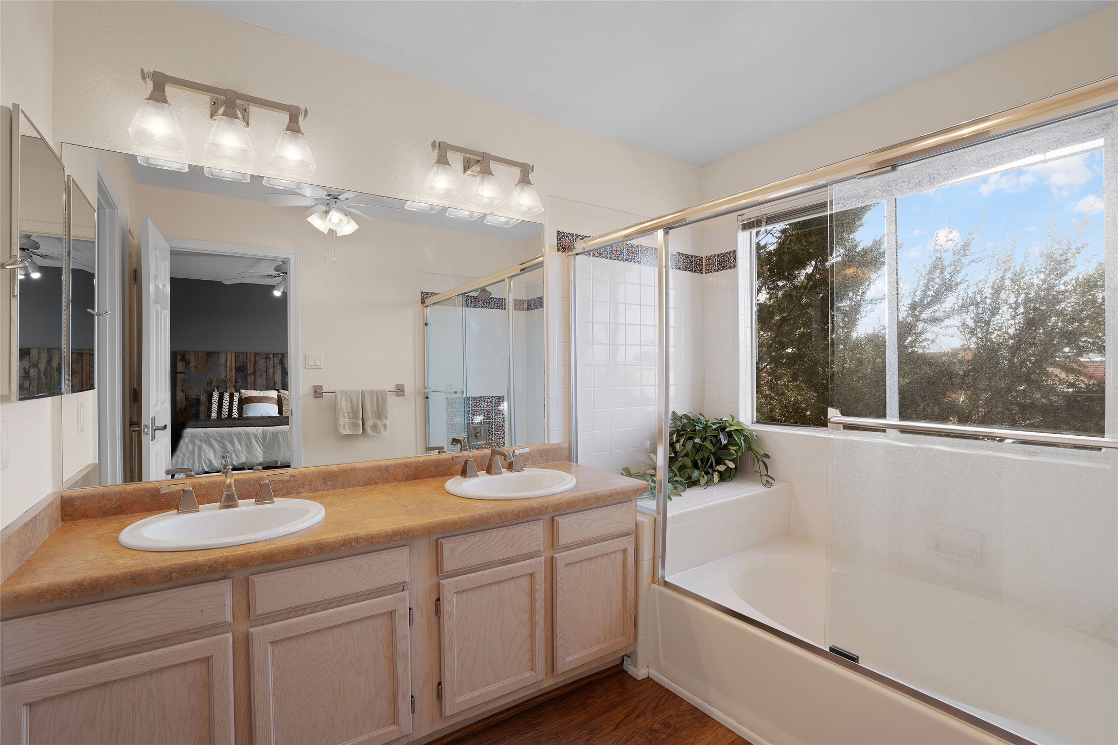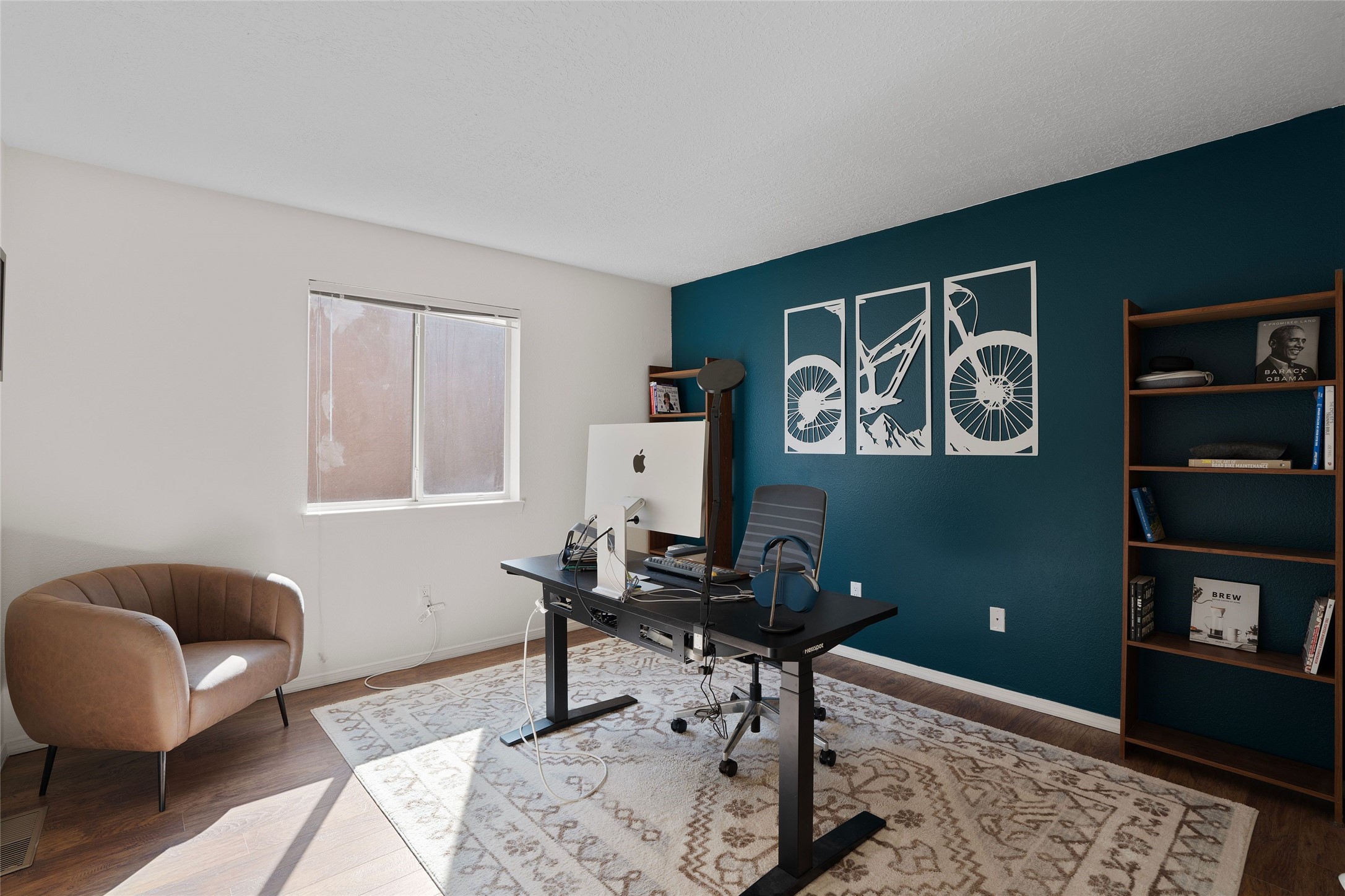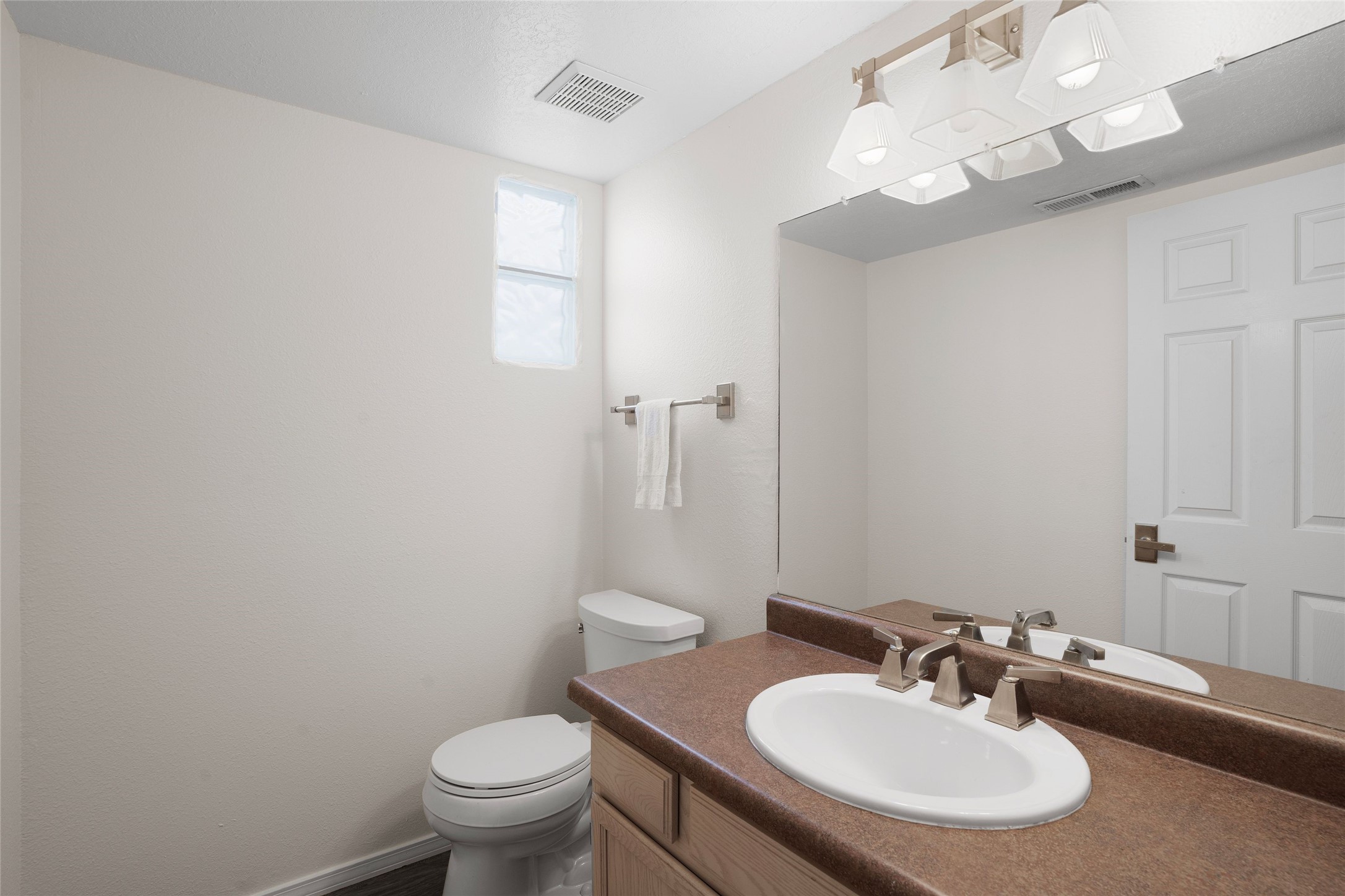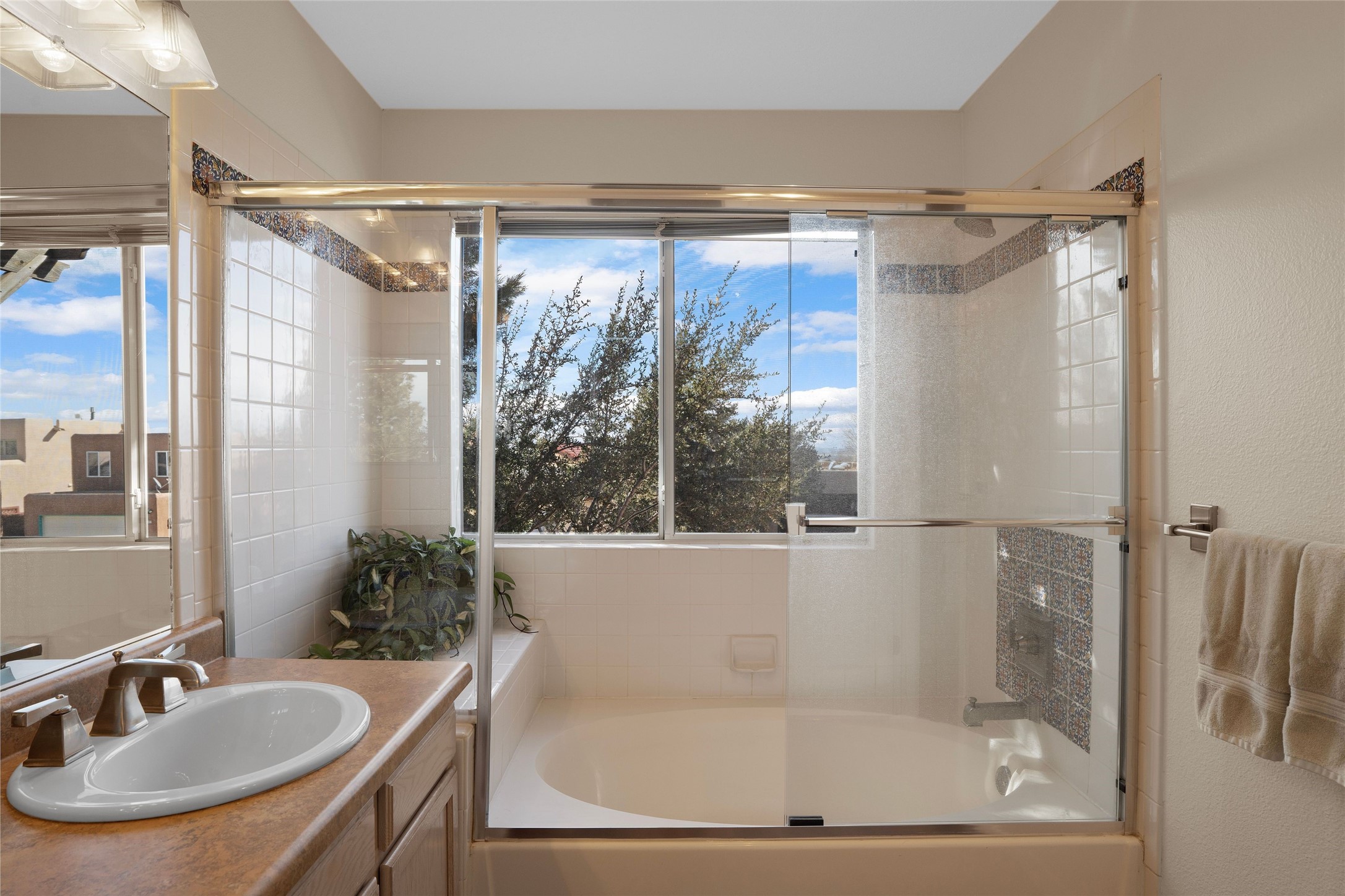 Located in the desirable Via Caballero III subdivision, this approximately 2,000 square foot home offers a blend of comfort and style, featuring three bedrooms and two and a half bathrooms. The primary bedroom features an expansive closet and sunset views. Open living spaces create an inviting atmosphere, perfect for entertaining and everday living. The heart of the home is the living room, featuring a lovely wood-burning fireplace and bathed in natural light from recently installed skylights. The space flows seamlessly to the private, fenced backyard, extending your living space outdoors. Enjoy the expansive new back patio perfect for outdoor gatherings, and the professionally updated landscaping. A new custom copper and metal Zia gate, along with new solar path lights, welcomes you at the front entrance. A thoughtful conversion of the family room provides a spacious third bedroom. Additional recent updates include a new TPO roof (with a 5 year transferable warranty), a new furnace and water heater, fresh interior paint, and a new irrigation/drainage system to expertly handle New Mexico's monsoons. This desirable home is ready for you to create lasting memories!