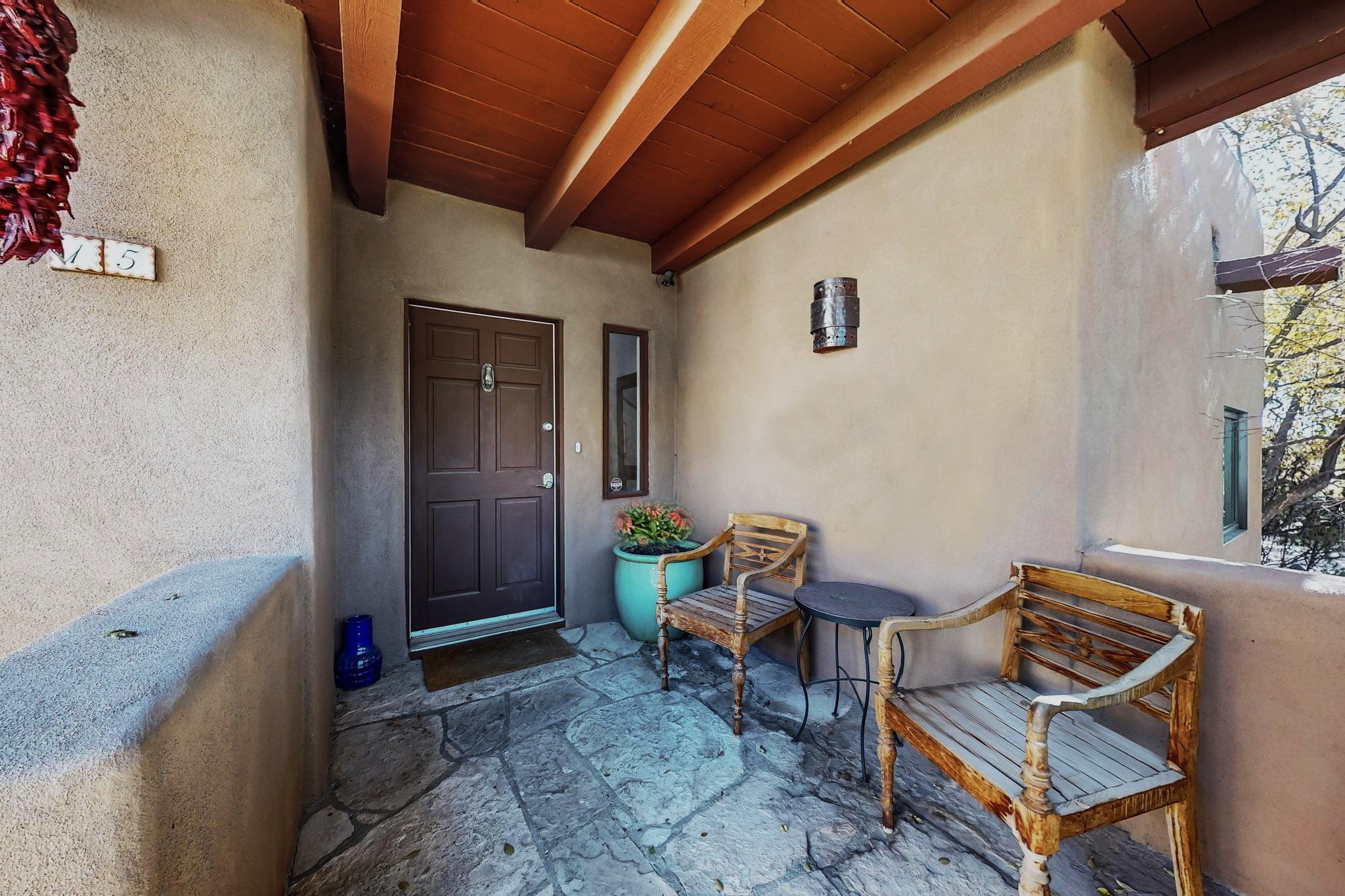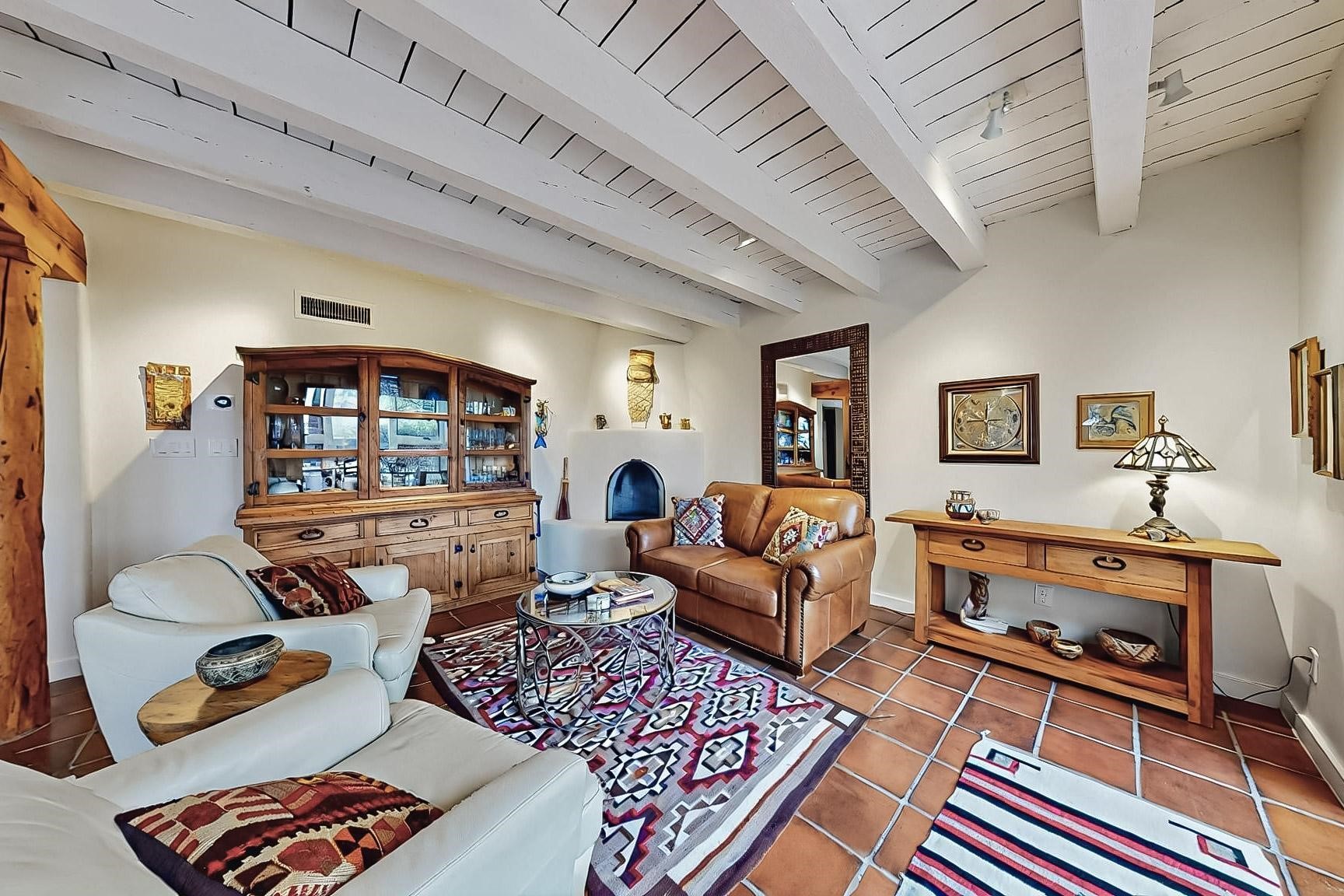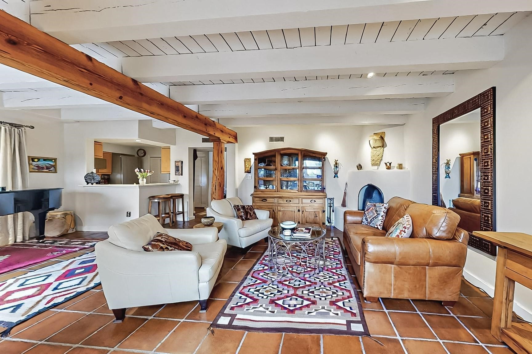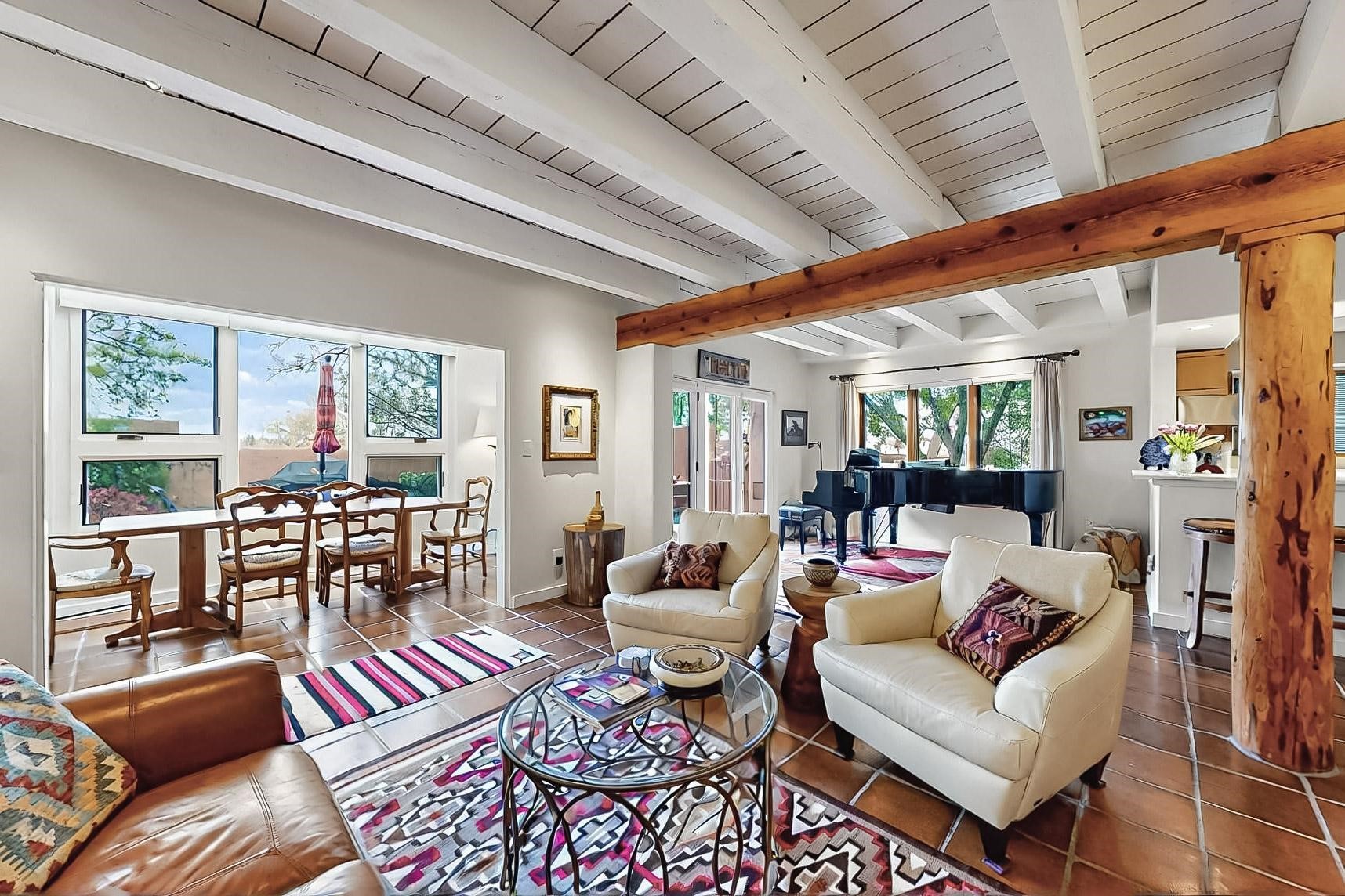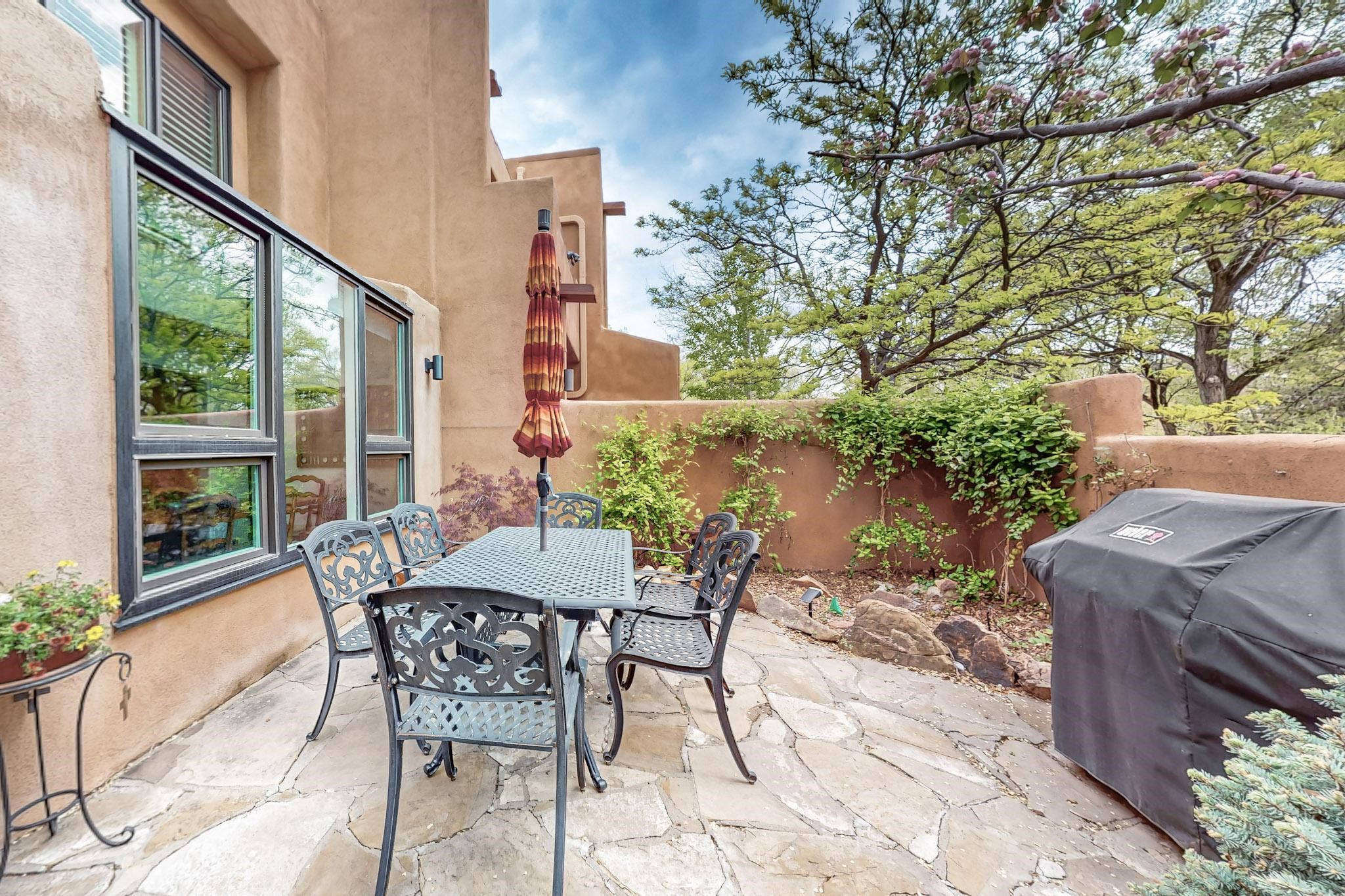 Perfectly located in the Historic Eastside, this 3 bedroom, 3 bath home with an attached 2 car garage is a rare offering. Located in the desirable La Vereda Compound, the home has been lovingly updated by the current and previous owners. Recent improvements include the kitchen with new counters and Miele appliances, central air conditioning and heating and bathroom upgrades. The open floor plan is perfect for entertaining and flows beautifully between the private patio and the living/dining areas. As an end unit it is bright and airy. The living room with a kiva fireplace, high ceilings, and glass roofed dining area is an inviting space. The drip irrigated, well landscaped gardens, with a zen-like water feature and mature trees offer a relaxing respite. The spacious upper-level primary bedroom suite features a kiva fireplace, walk-in closet, en-suite bath and opens onto a private deck overlooking the trees. The 2 guest bedrooms and baths are separated nicely offering privacy. The rarely found 2 car attached garage features a 220V vehicle charger, new opener, and bicycle storage. This home can be a perfect full-time residence or pied a tierre for a discerning buyer.
