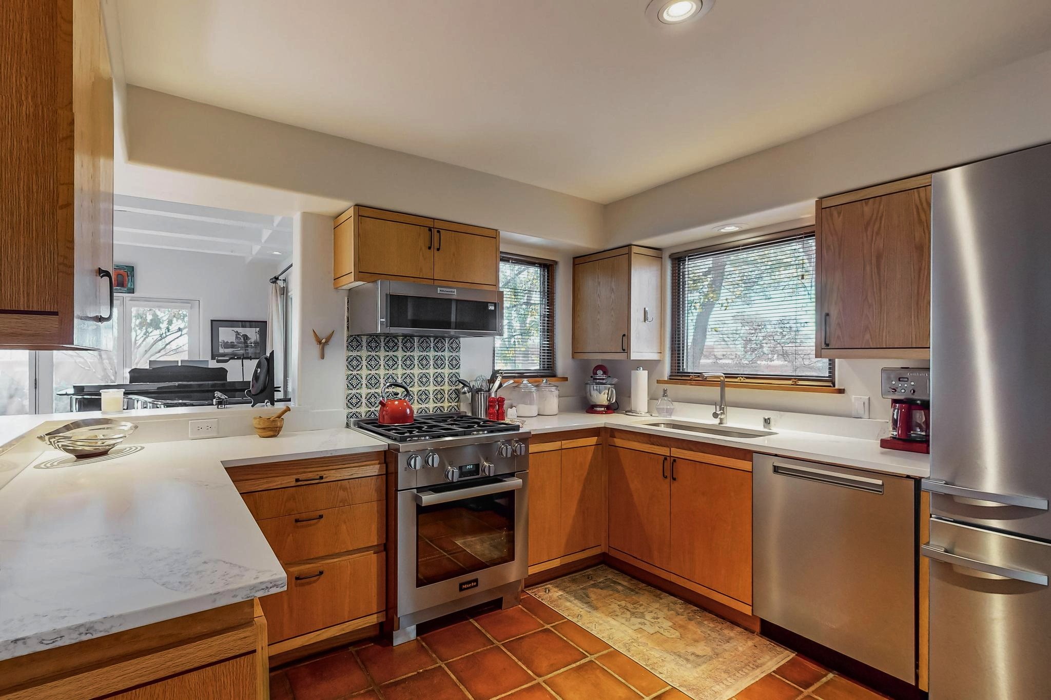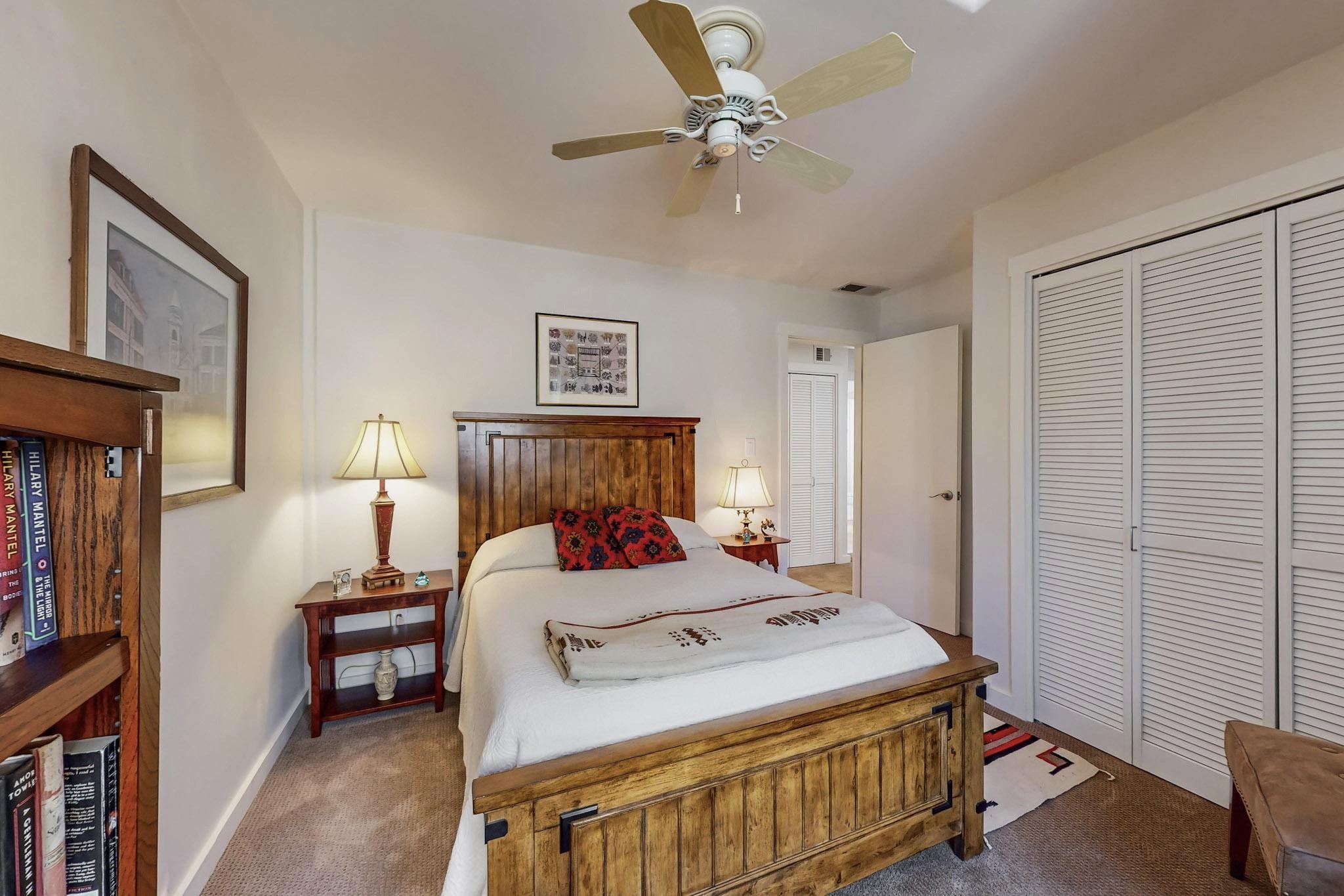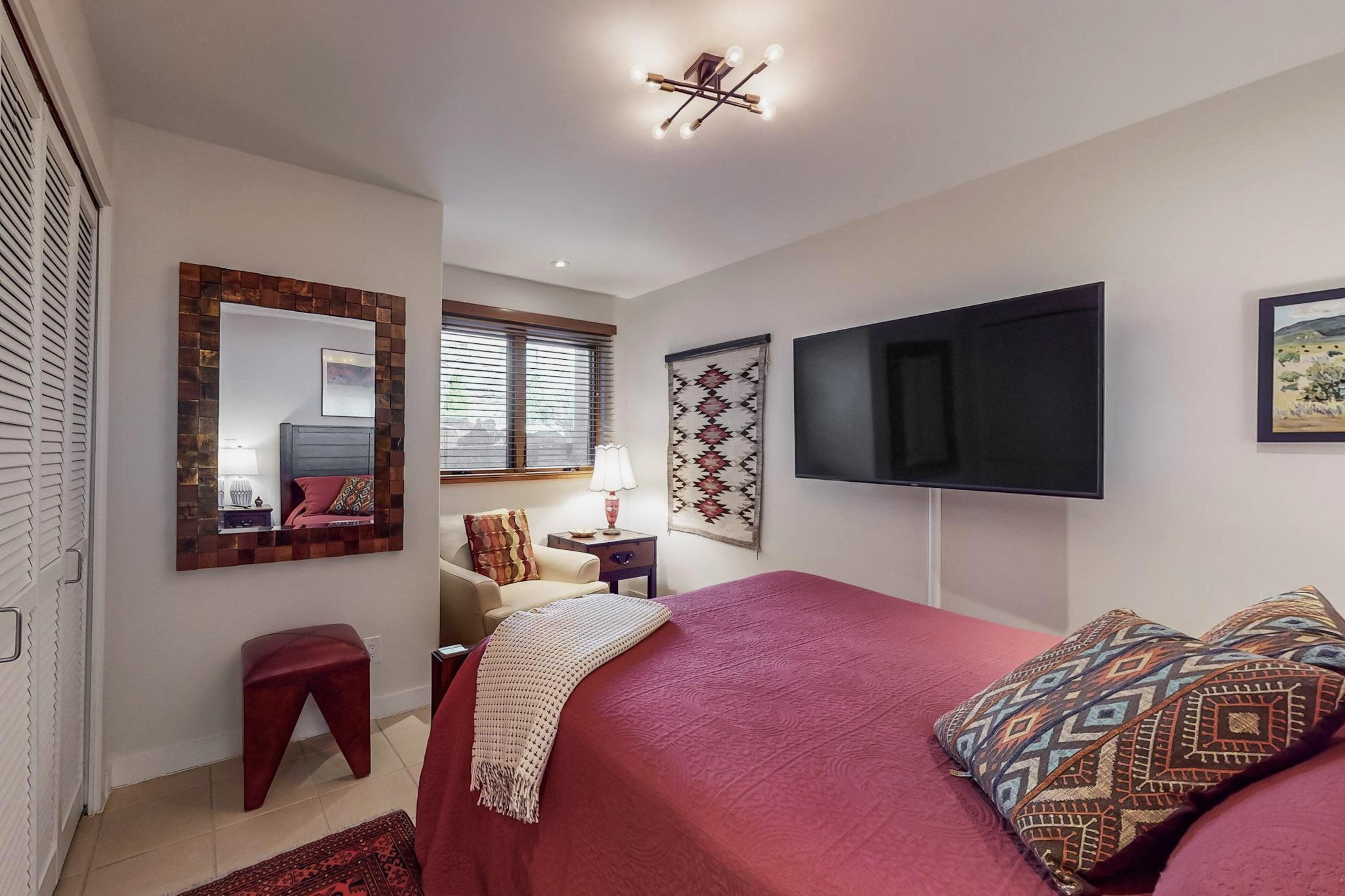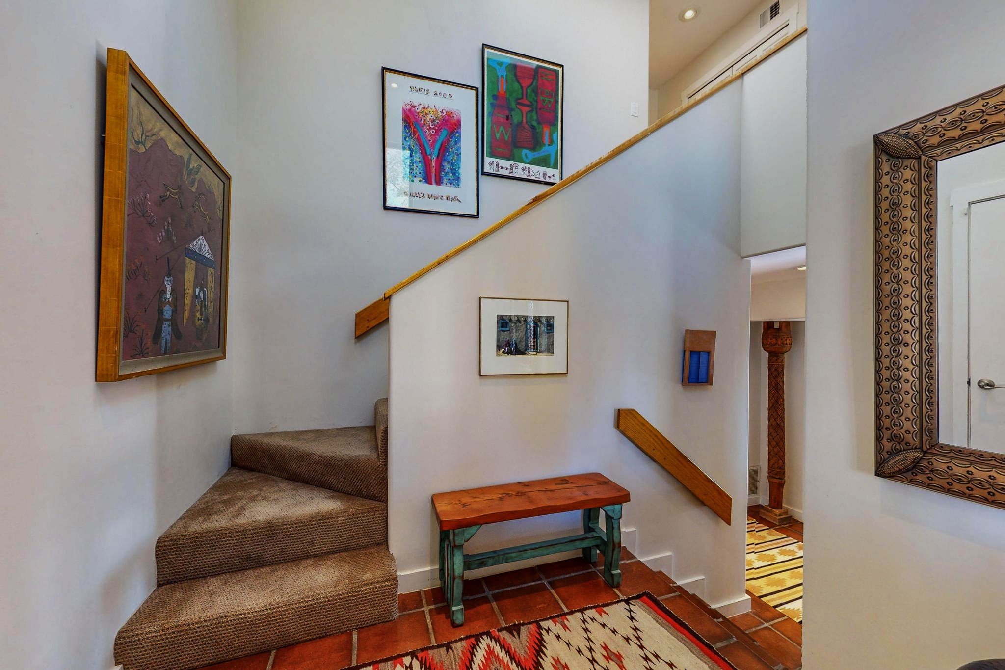Perfectly located in the Historic Eastside, this 3 bedroom, 3 bath home with an attached 2 car garage is a rare offering. Located in the desirable La Vereda Compound, the home has been lovingly updated by the current and previous owners. Recent improvements include the kitchen with new counters and Miele appliances, central air conditioning and heating and bathroom upgrades. The open floor plan is perfect for entertaining and flows beautifully between the private patio and the living/dining areas. As an end unit it is bright and airy. The living room with a kiva fireplace, high ceilings, and glass roofed dining area is an inviting space. The drip irrigated, well landscaped gardens, with a zen-like water feature and mature trees offer a relaxing respite. The spacious upper-level primary bedroom suite features a kiva fireplace, walk-in closet, en-suite bath and opens onto a private deck overlooking the trees. The 2 guest bedrooms and baths are separated nicely offering privacy. The rarely found 2 car attached garage features a 220V vehicle charger, new opener, and bicycle storage. This home can be a perfect full-time residence or pied a tierre for a discerning buyer.