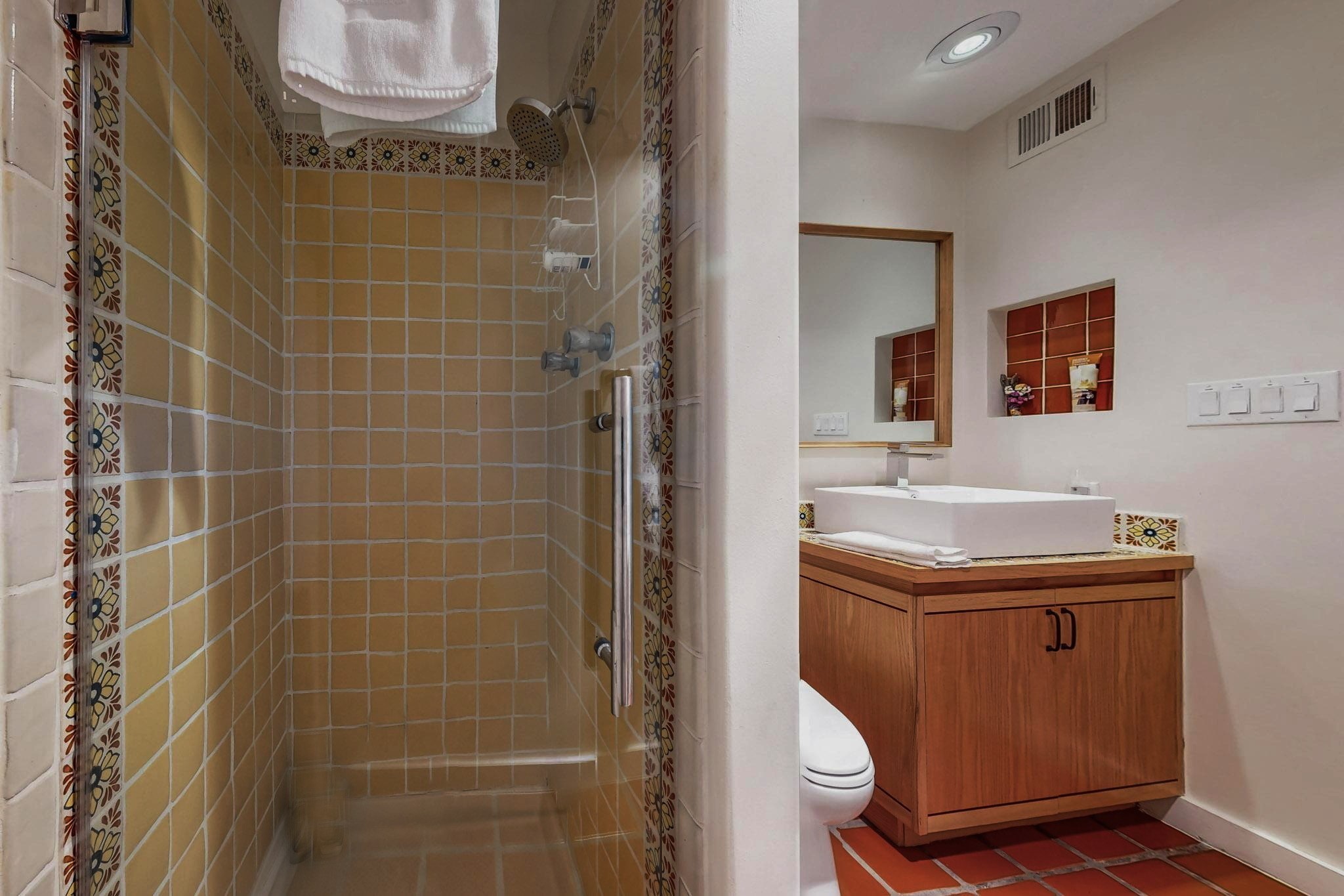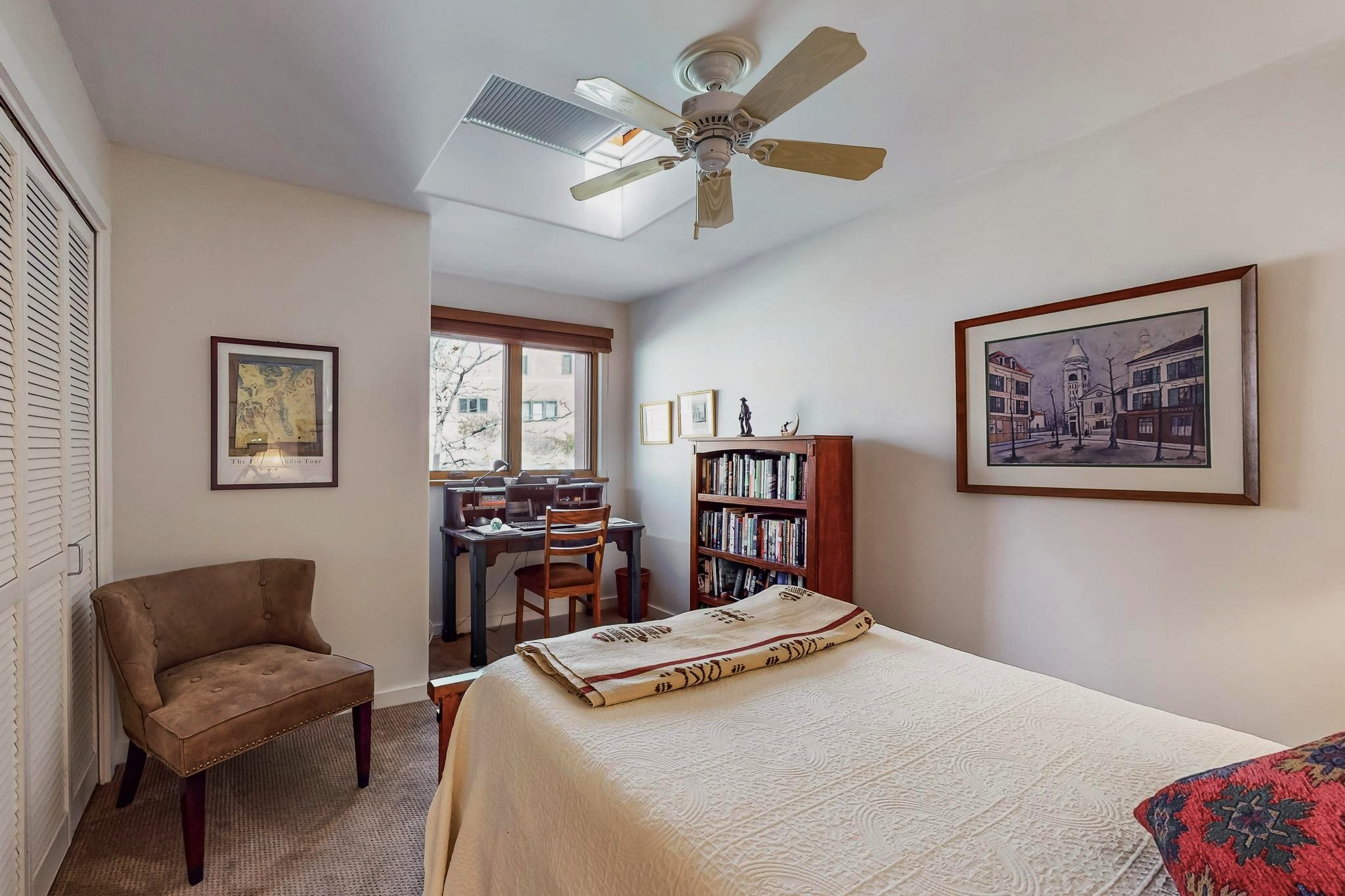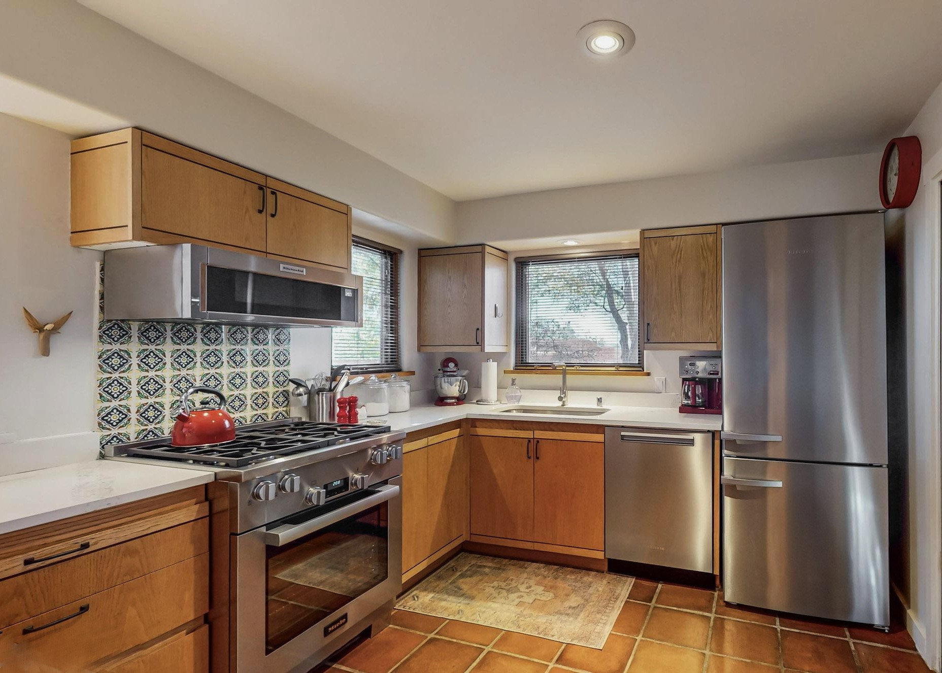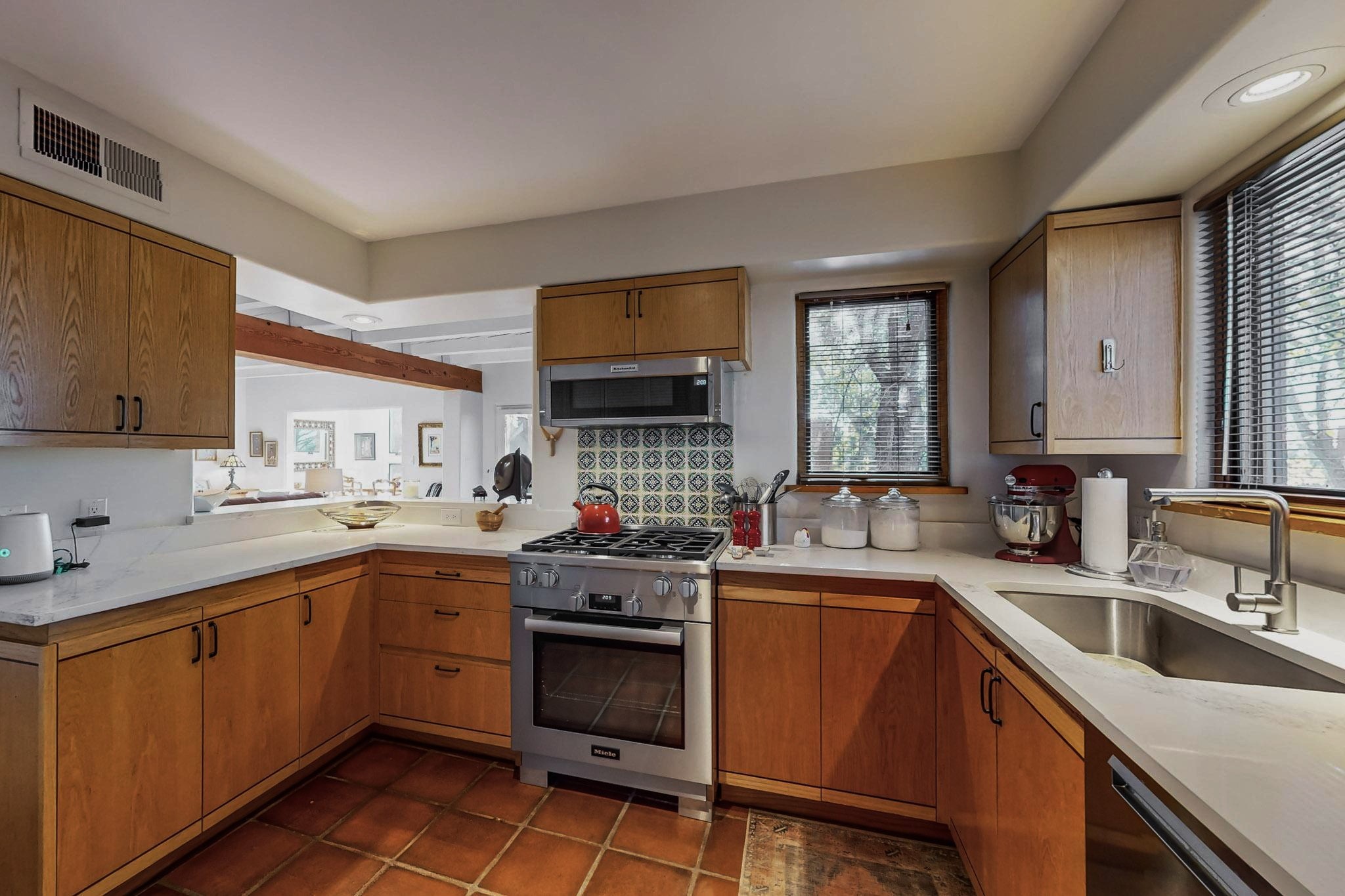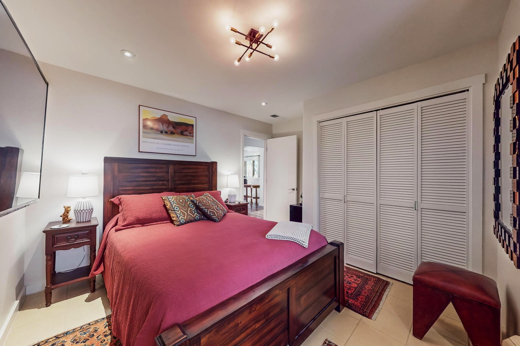 Perfectly located in the Historic Eastside, this 3 bedroom, 3 bath home with an attached 2 car garage is a rare offering. Located in the desirable La Vereda Compound, the home has been lovingly updated by the current and previous owners. Recent improvements include the kitchen with new counters and Miele appliances, central air conditioning and heating and bathroom upgrades. The open floor plan is perfect for entertaining and flows beautifully between the private patio and the living/dining areas. As an end unit it is bright and airy. The living room with a kiva fireplace, high ceilings, and glass roofed dining area is an inviting space. The drip irrigated, well landscaped gardens, with a zen-like water feature and mature trees offer a relaxing respite. The spacious upper-level primary bedroom suite features a kiva fireplace, walk-in closet, en-suite bath and opens onto a private deck overlooking the trees. The 2 guest bedrooms and baths are separated nicely offering privacy. The rarely found 2 car attached garage features a 220V vehicle charger, new opener, and bicycle storage. This home can be a perfect full-time residence or pied a tierre for a discerning buyer.