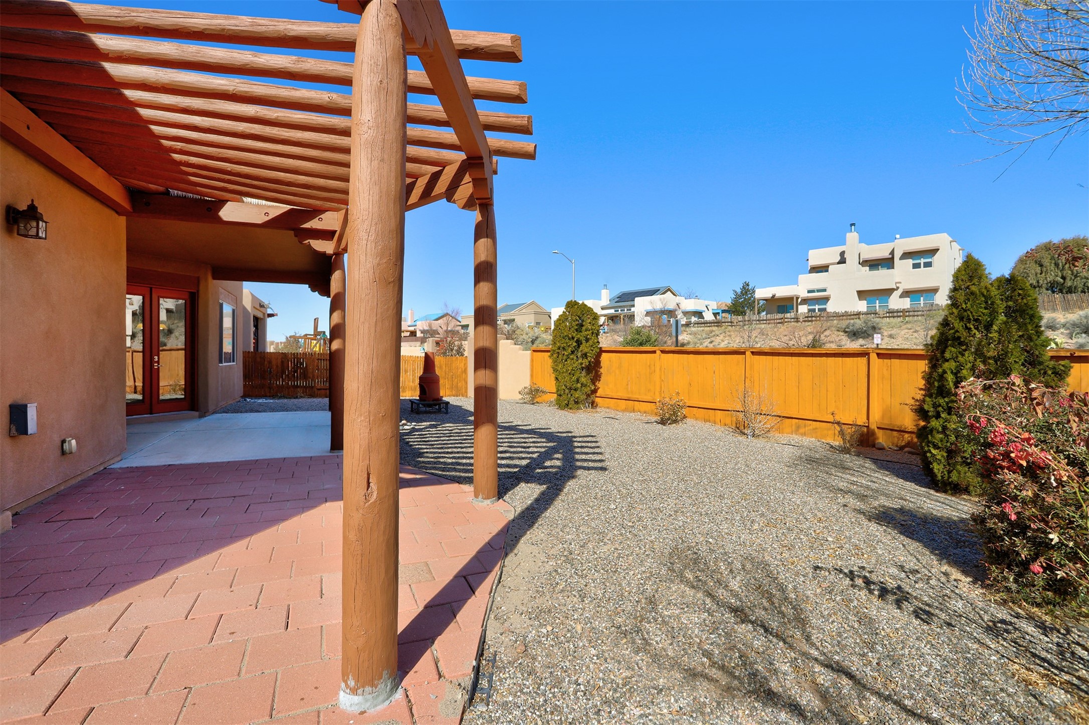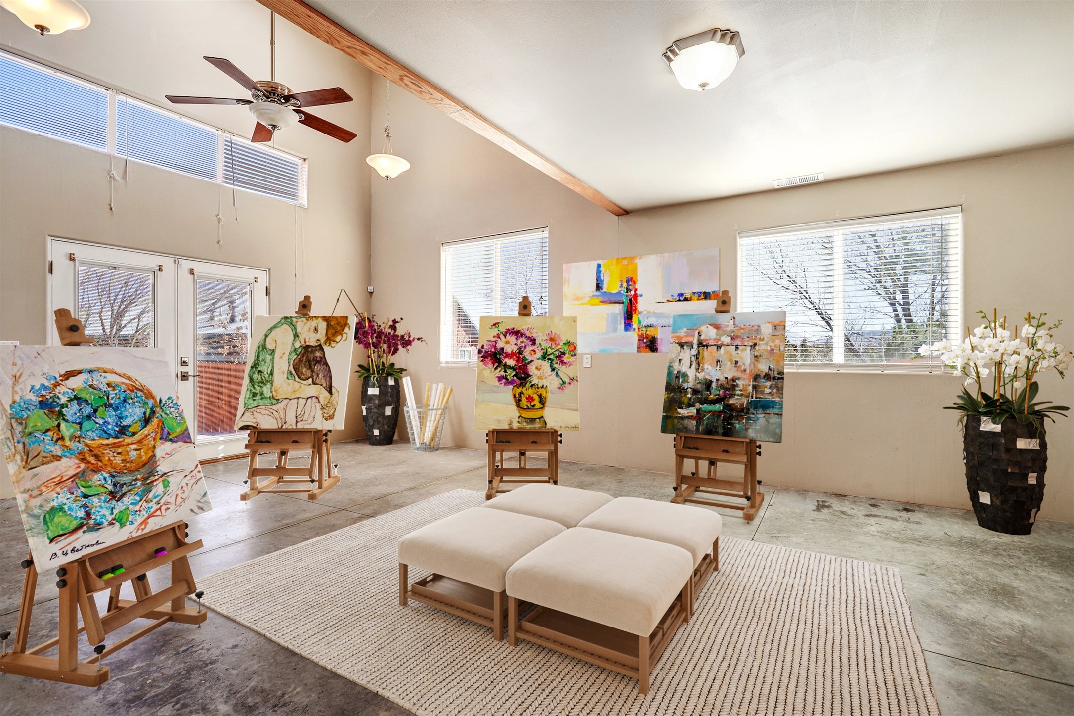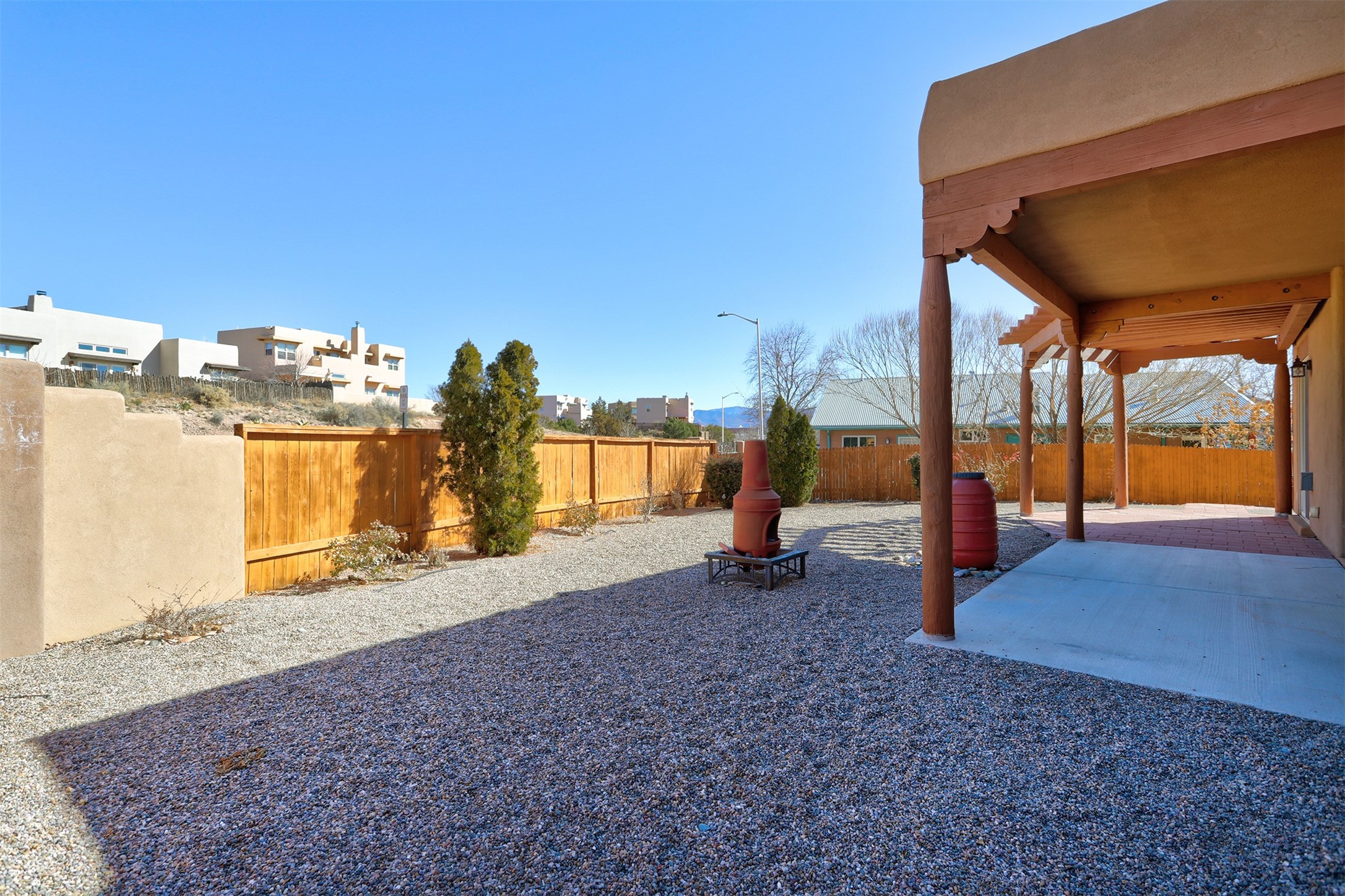 Welcome to this spacious and very well maintained 2,959 sq. ft. Pueblo-style home, offering four bedrooms, two bathrooms, and a 600 sq. ft. attached studio with a private entrance. Originally designed as an artist's space, the studio offers endless possibilities, making it ideal for a creative retreat, home office, or small business.This light-filled, single-level home features an open-concept design with a welcoming entryway, two illuminated Nichos, and a skylight that enhances its inviting ambiance. The living room boasts high ceilings, a gas Kiva fireplace, and a built-in speaker system, seamlessly flowing into the formal dining room. Patio doors open onto a covered portal, creating the perfect space for outdoor entertaining. The large, fully fenced backyard is landscaped with mature trees and a drip irrigation system, ensuring easy maintenance.The spacious kitchen is a culinary enthusiast's dream, featuring rich Alder cabinets, ample counter space, newer stainless steel appliances, and a center island with an eat-in area. A large pantry provides abundant storage, making this kitchen both functional and stylish.The generous primary suite offers two walk-in closets and direct access to the patio and outdoor entertaining spaces. The en-suite bathroom is designed for relaxation, complete with a soaking tub, a large shower, double sinks, and a skylight that fills the space with natural light. Additional bedrooms are located down the hallway, brightened by skylights and large windows with custom wood window treatments, and offer easy access to a full bathroom and the additional flex space.A finished and insulated two-car garage provides extra convenience, along with an advanced home security system for peace of mind. Freshly painted walls give the home a bright and refreshed feel, making it truly move-in ready. Conveniently located near community hiking trails, shopping centers, and schools, this home also offers easy freeway access for a smooth commute to Los Alamos and Albuquerque. Best of all, there are no HOA fees.