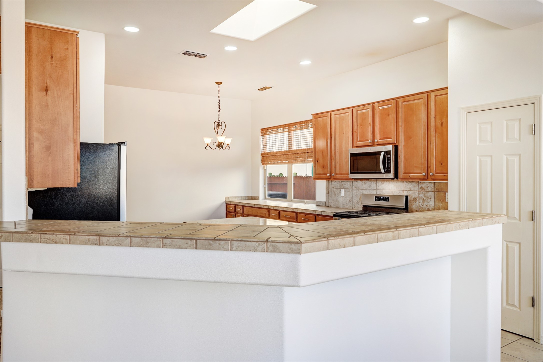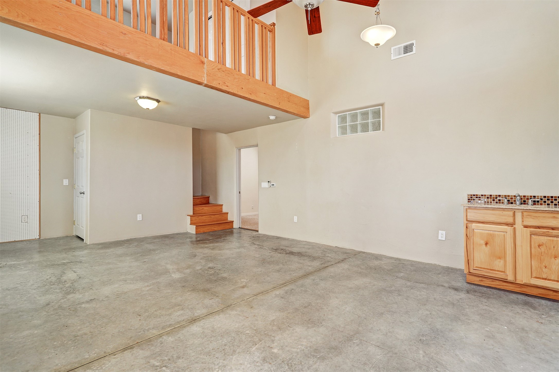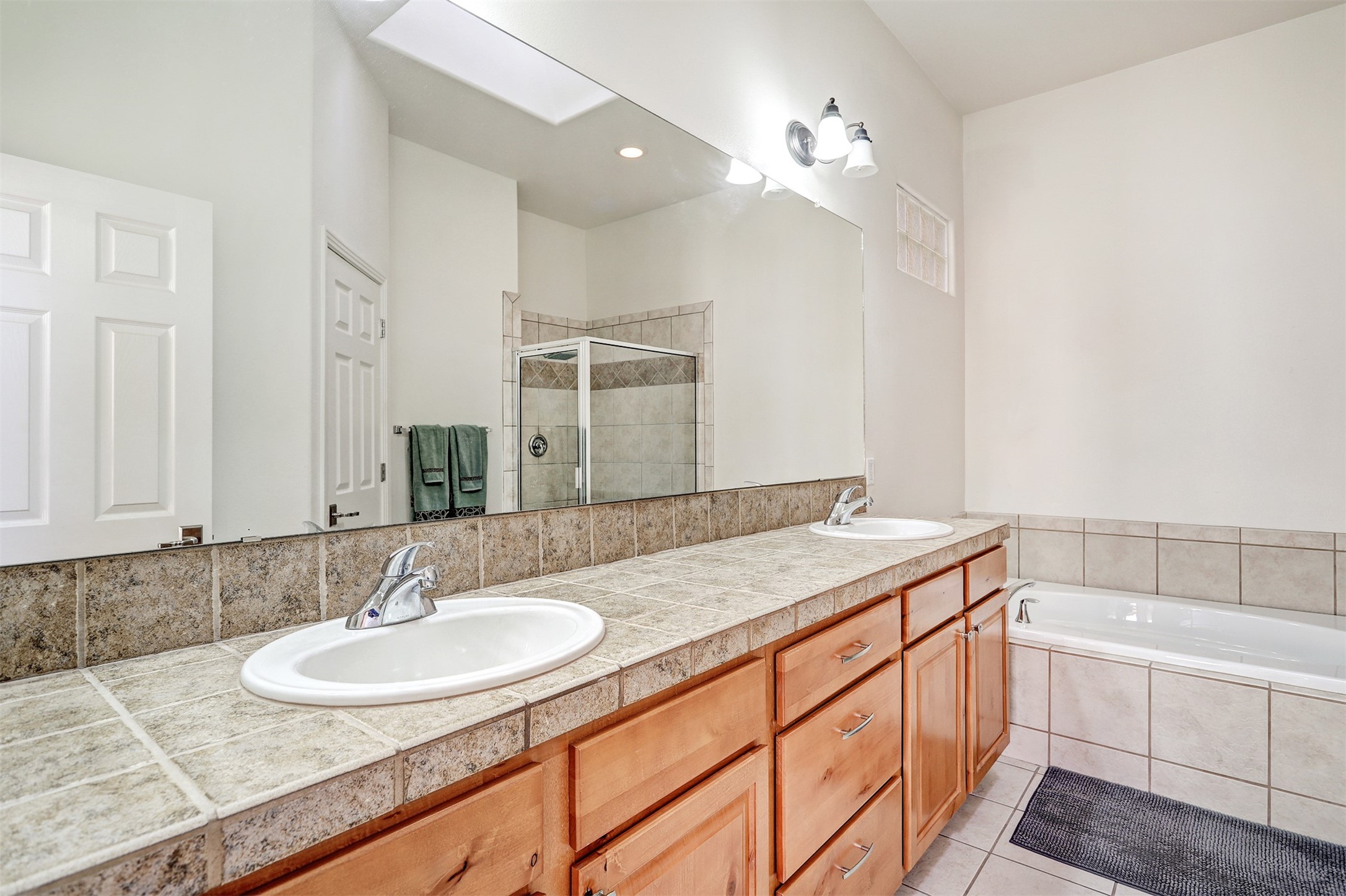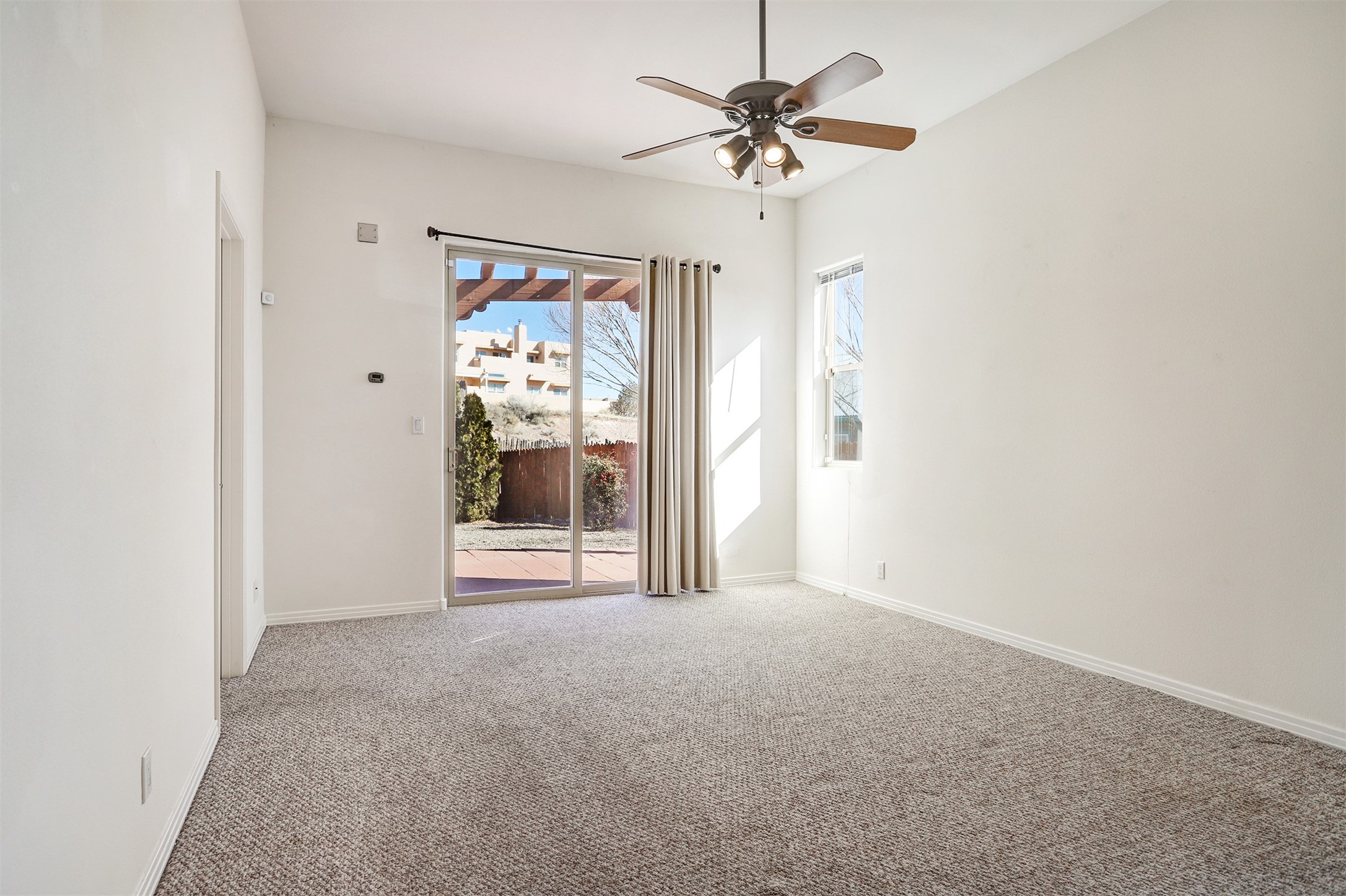 Welcome to this spacious and very well maintained 2,959 sq. ft. Pueblo-style home, offering four bedrooms, two bathrooms, and a 600 sq. ft. attached studio with a private entrance. Originally designed as an artist's space, the studio offers endless possibilities, making it ideal for a creative retreat, home office, or small business.This light-filled, single-level home features an open-concept design with a welcoming entryway, two illuminated Nichos, and a skylight that enhances its inviting ambiance. The living room boasts high ceilings, a gas Kiva fireplace, and a built-in speaker system, seamlessly flowing into the formal dining room. Patio doors open onto a covered portal, creating the perfect space for outdoor entertaining. The large, fully fenced backyard is landscaped with mature trees and a drip irrigation system, ensuring easy maintenance.The spacious kitchen is a culinary enthusiast's dream, featuring rich Alder cabinets, ample counter space, newer stainless steel appliances, and a center island with an eat-in area. A large pantry provides abundant storage, making this kitchen both functional and stylish.The generous primary suite offers two walk-in closets and direct access to the patio and outdoor entertaining spaces. The en-suite bathroom is designed for relaxation, complete with a soaking tub, a large shower, double sinks, and a skylight that fills the space with natural light. Additional bedrooms are located down the hallway, brightened by skylights and large windows with custom wood window treatments, and offer easy access to a full bathroom and the additional flex space.A finished and insulated two-car garage provides extra convenience, along with an advanced home security system for peace of mind. Freshly painted walls give the home a bright and refreshed feel, making it truly move-in ready. Conveniently located near community hiking trails, shopping centers, and schools, this home also offers easy freeway access for a smooth commute to Los Alamos and Albuquerque. Best of all, there are no HOA fees.