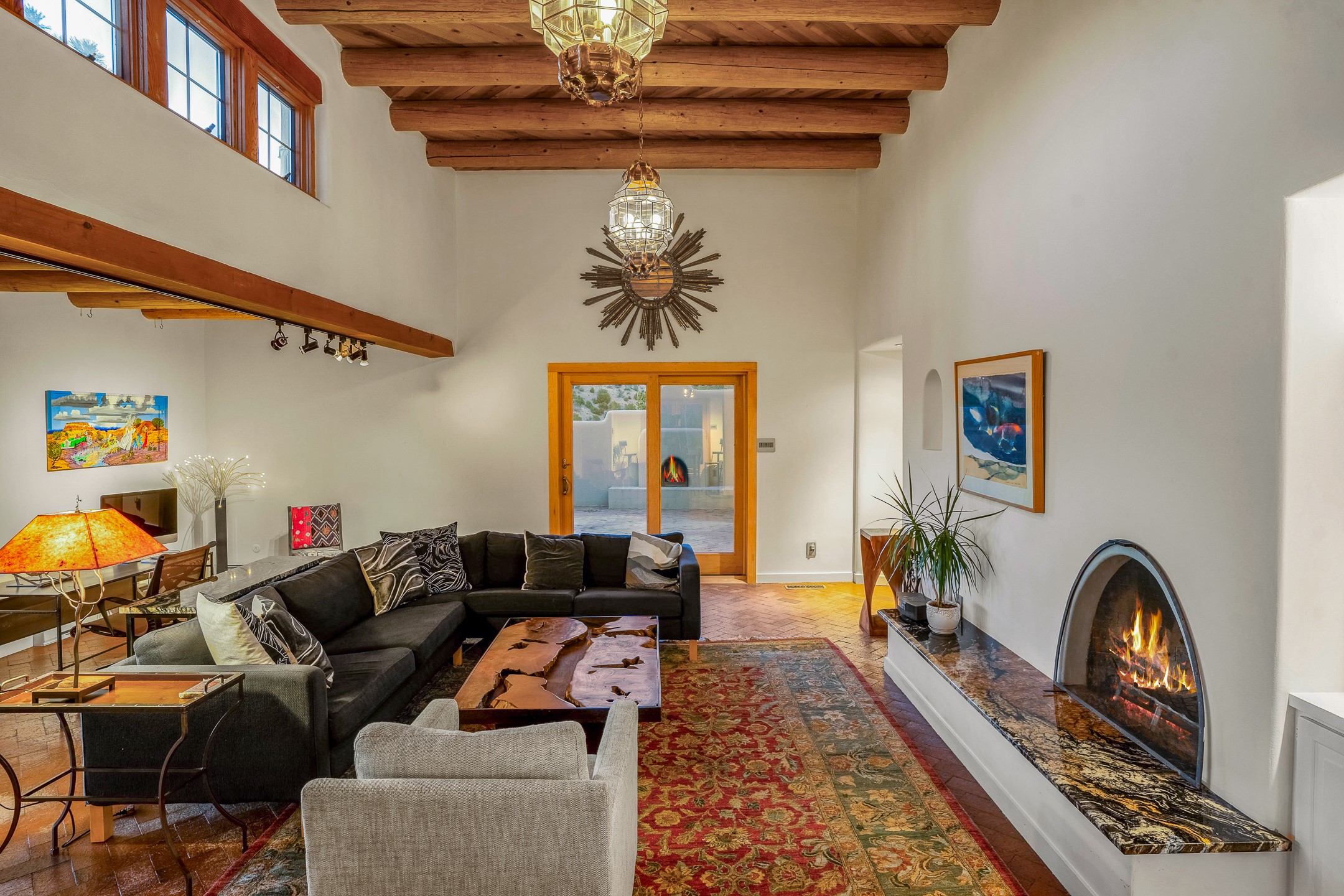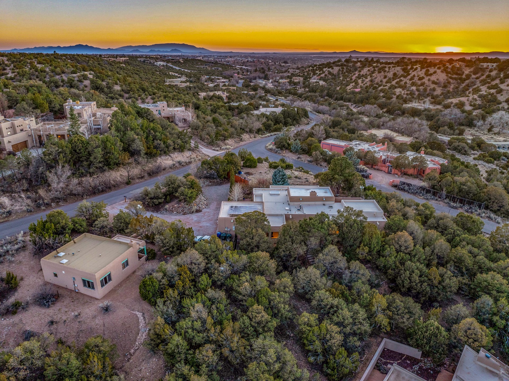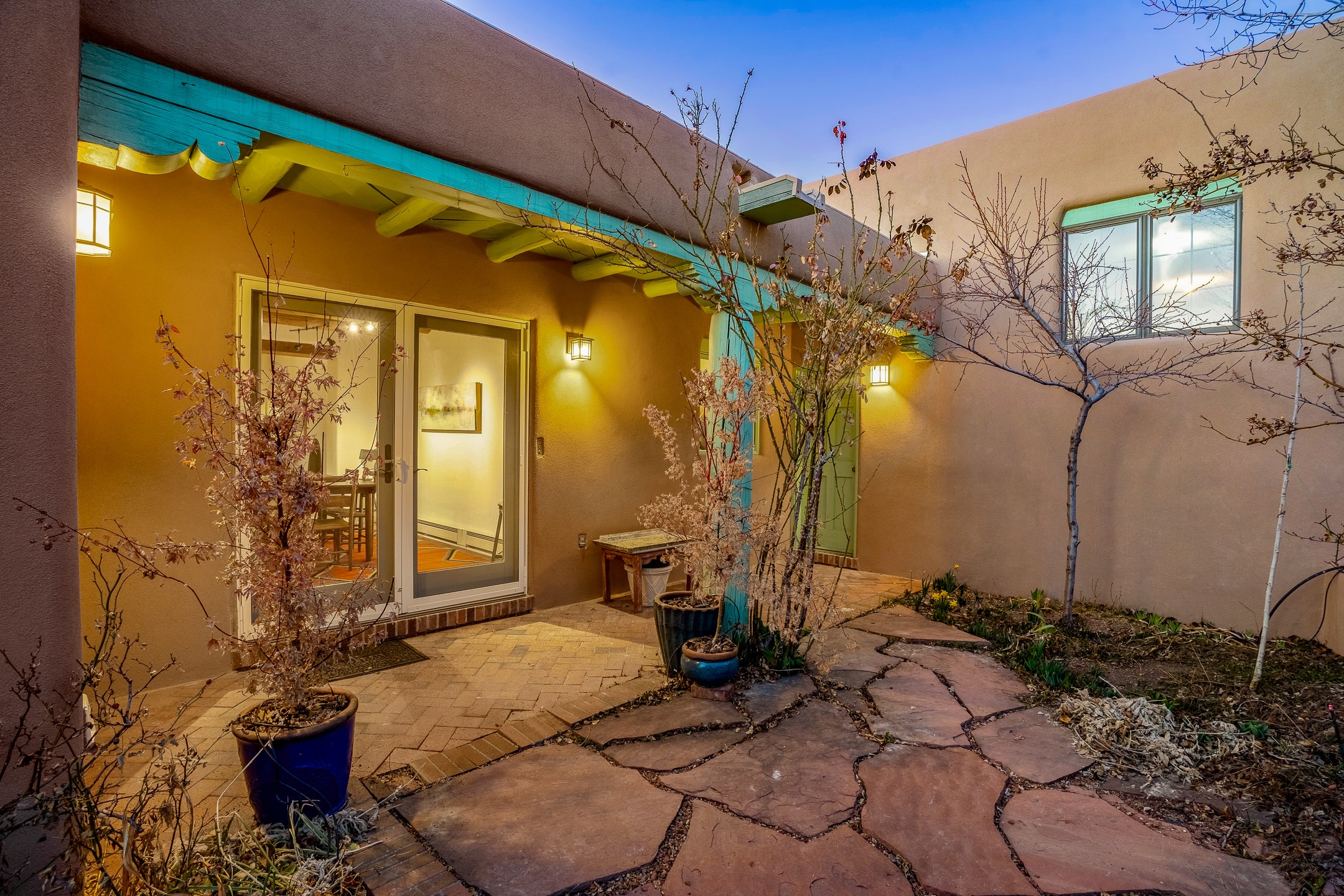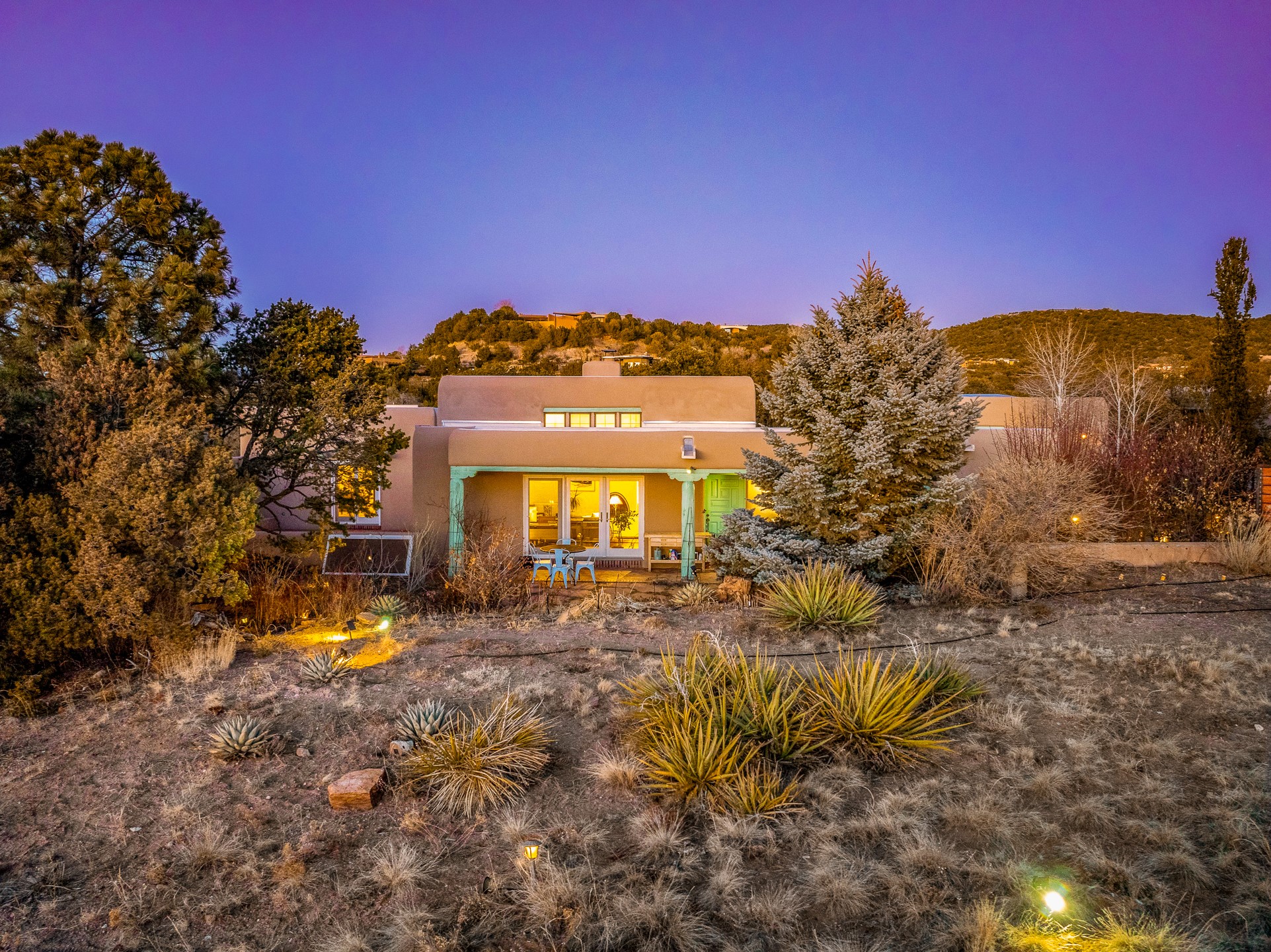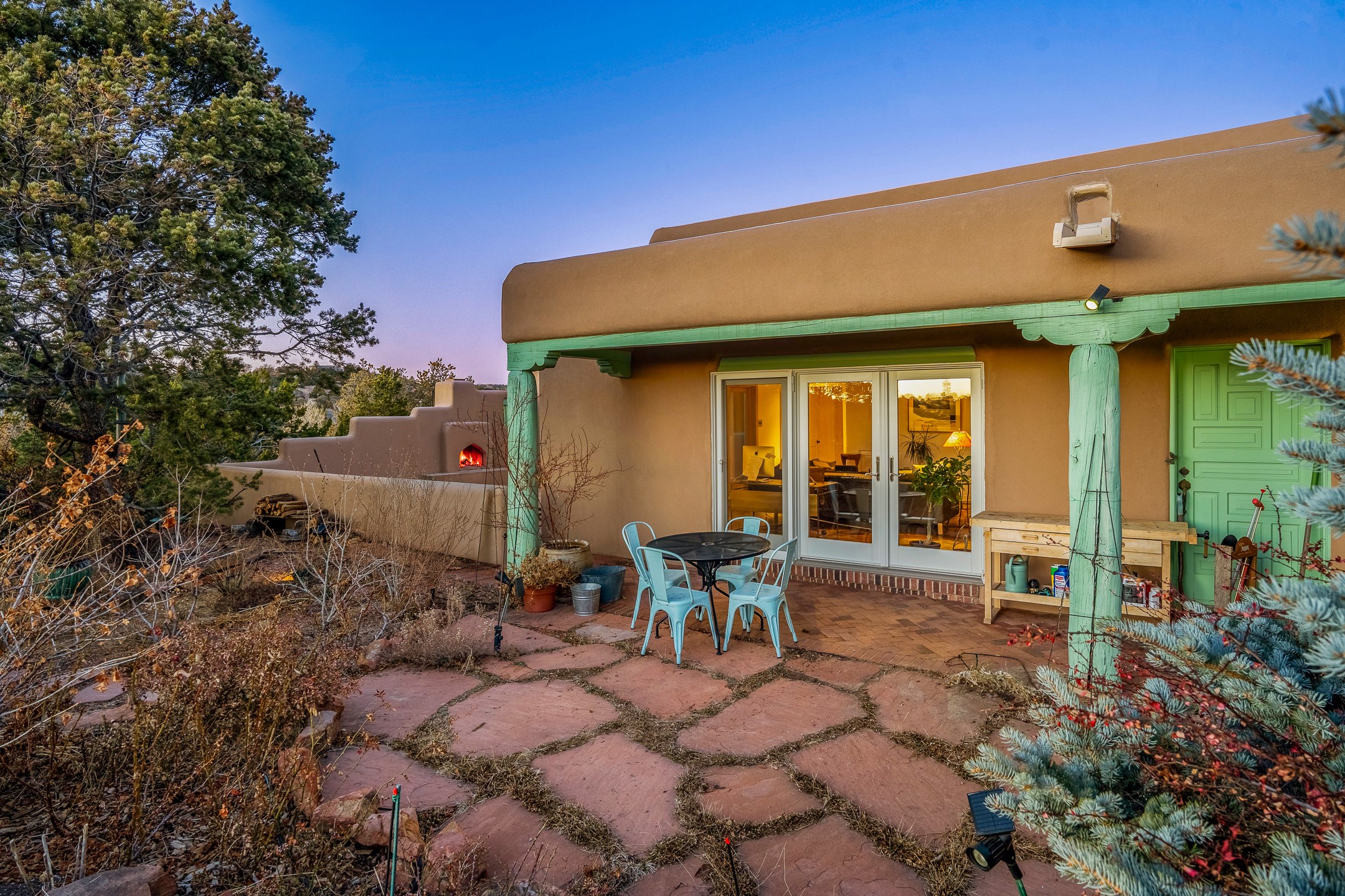 Beauty and elegance abound in this exquisite north east Santa Fe home. Nestled into the rolling hills just minutes from the Plaza, this NE gem has sweeping sunset views of the Sandia Mountains. A lush and tranquil garden with mature fruit trees, roses, aspen, and a towering ponderosa pine surround the house providing privacy. The single level Main house has a flowing open floor plan replete with Southwest charm, including beamed high ceilings, two Kiva fireplaces, a fully remodeled kitchen with granite countertops and breakfast bar seating. The large bedrooms have an abundance of closet space and built in shelving. The primary bedroom includes lovely picture windows, french doors leading out to the patio with outdoor fireplace and an ensuite bathroom with jacuzzi tub. The Main house has Tesla Solar Panels which were purchased in 2016 and have a 20 year warranty, a New Roof and recent stucco, as well as recently added french doors in the living room and Primary bedroom. An income-producing detached Casita with lovely views is privately set away from the Main House, and includes a full kitchen, 3/4 bath, and its own portal.