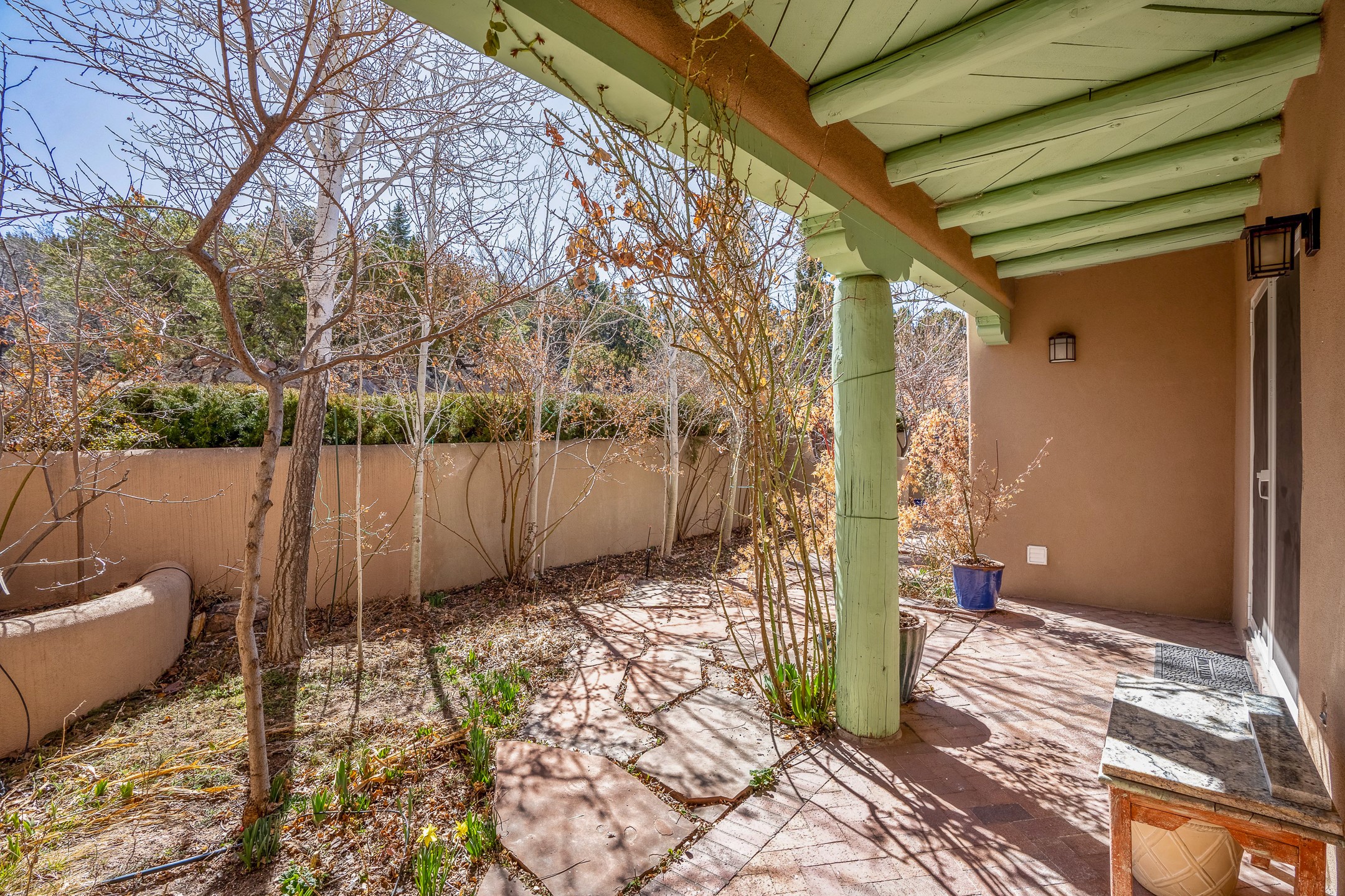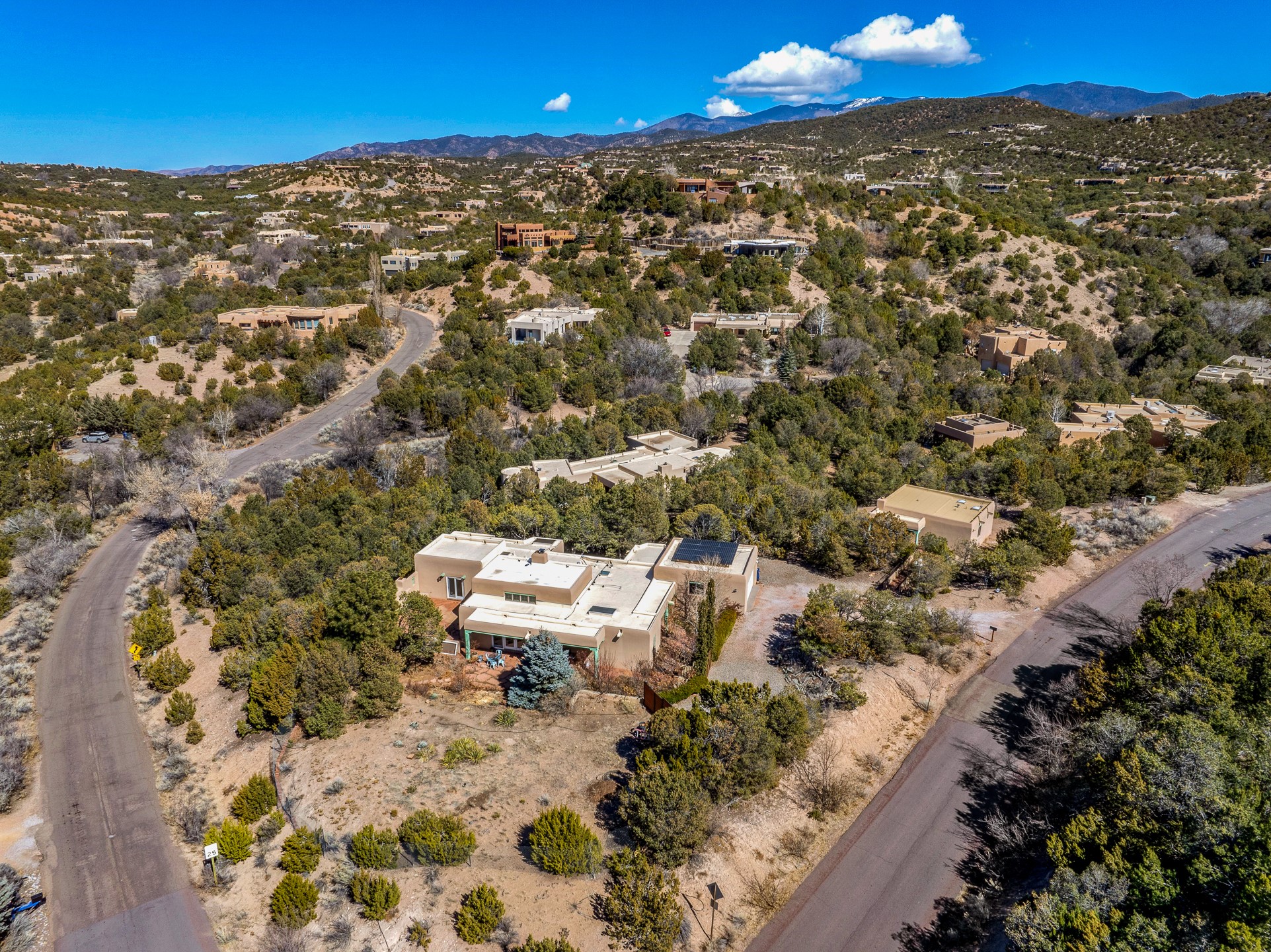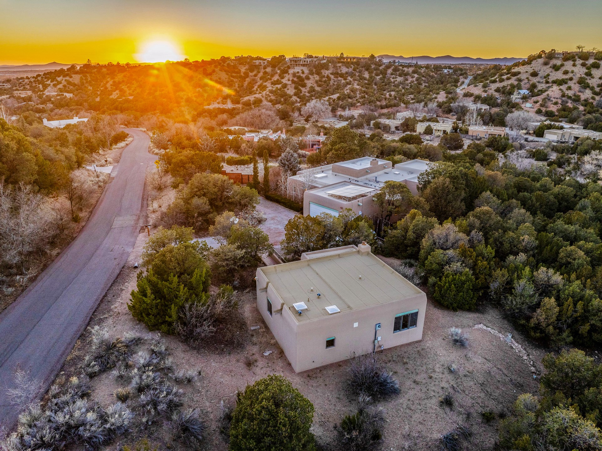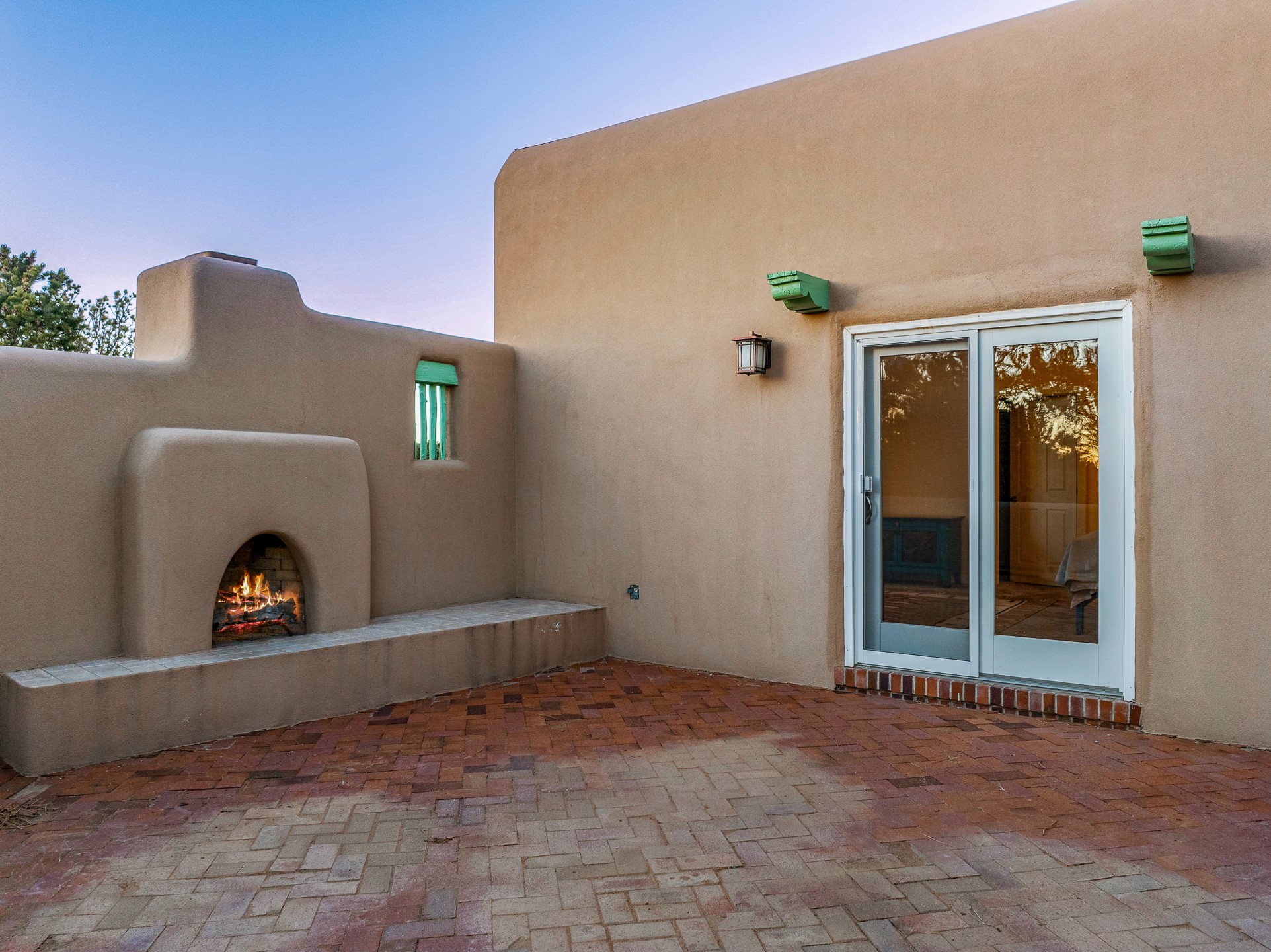 Beauty and elegance abound in this exquisite north east Santa Fe home. Nestled into the rolling hills just minutes from the Plaza, this NE gem has sweeping sunset views of the Sandia Mountains. A lush and tranquil garden with mature fruit trees, roses, aspen, and a towering ponderosa pine surround the house providing privacy. The single level Main house has a flowing open floor plan replete with Southwest charm, including beamed high ceilings, two Kiva fireplaces, a fully remodeled kitchen with granite countertops and breakfast bar seating. The large bedrooms have an abundance of closet space and built in shelving. The primary bedroom includes lovely picture windows, french doors leading out to the patio with outdoor fireplace and an ensuite bathroom with jacuzzi tub. The Main house has Tesla Solar Panels which were purchased in 2016 and have a 20 year warranty, a New Roof and recent stucco, as well as recently added french doors in the living room and Primary bedroom. An income-producing detached Casita with lovely views is privately set away from the Main House, and includes a full kitchen, 3/4 bath, and its own portal.
