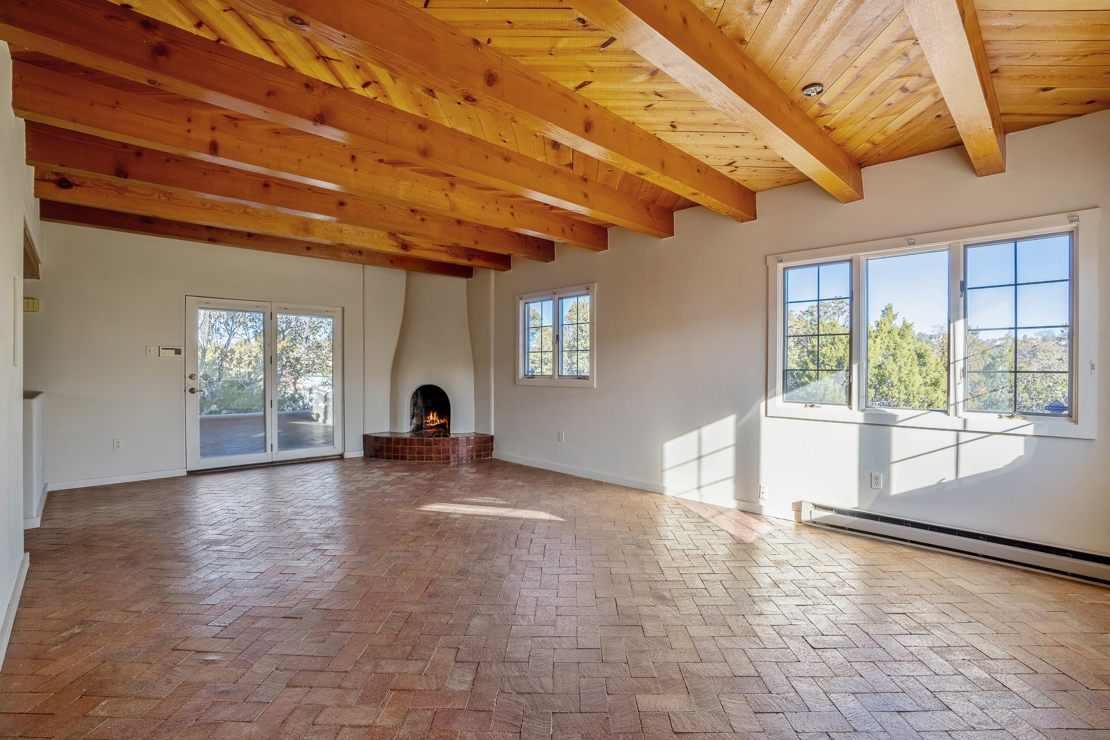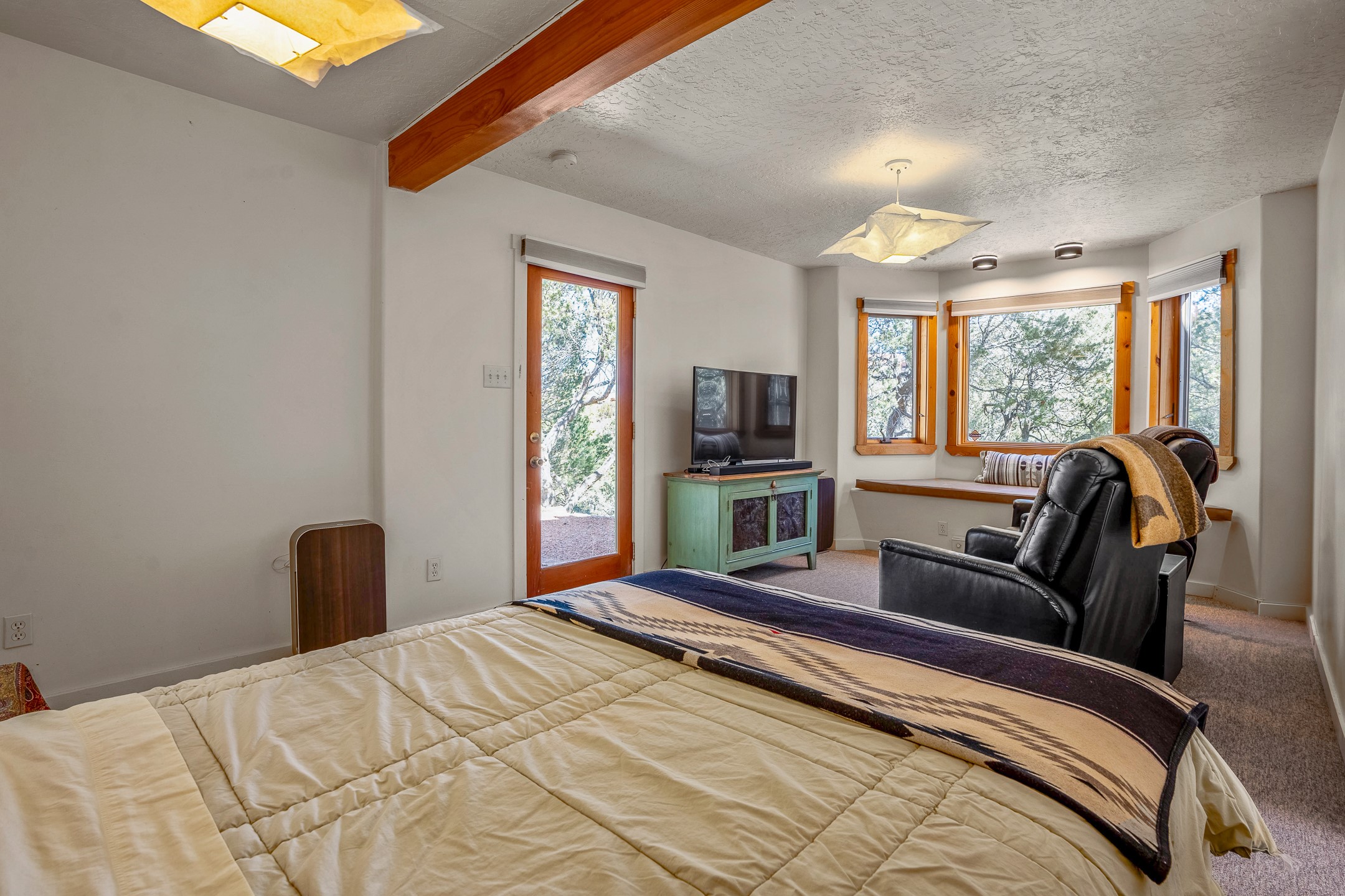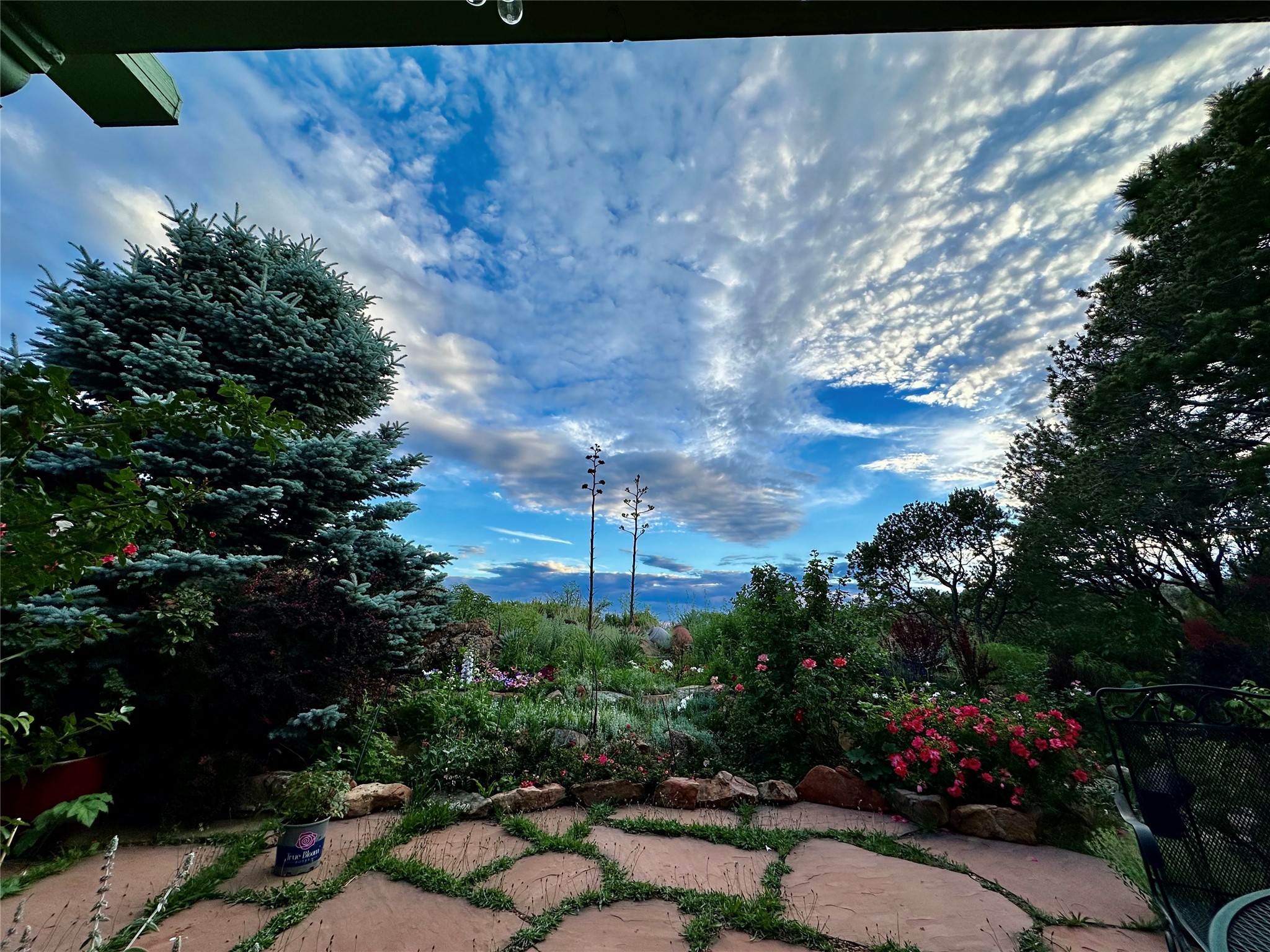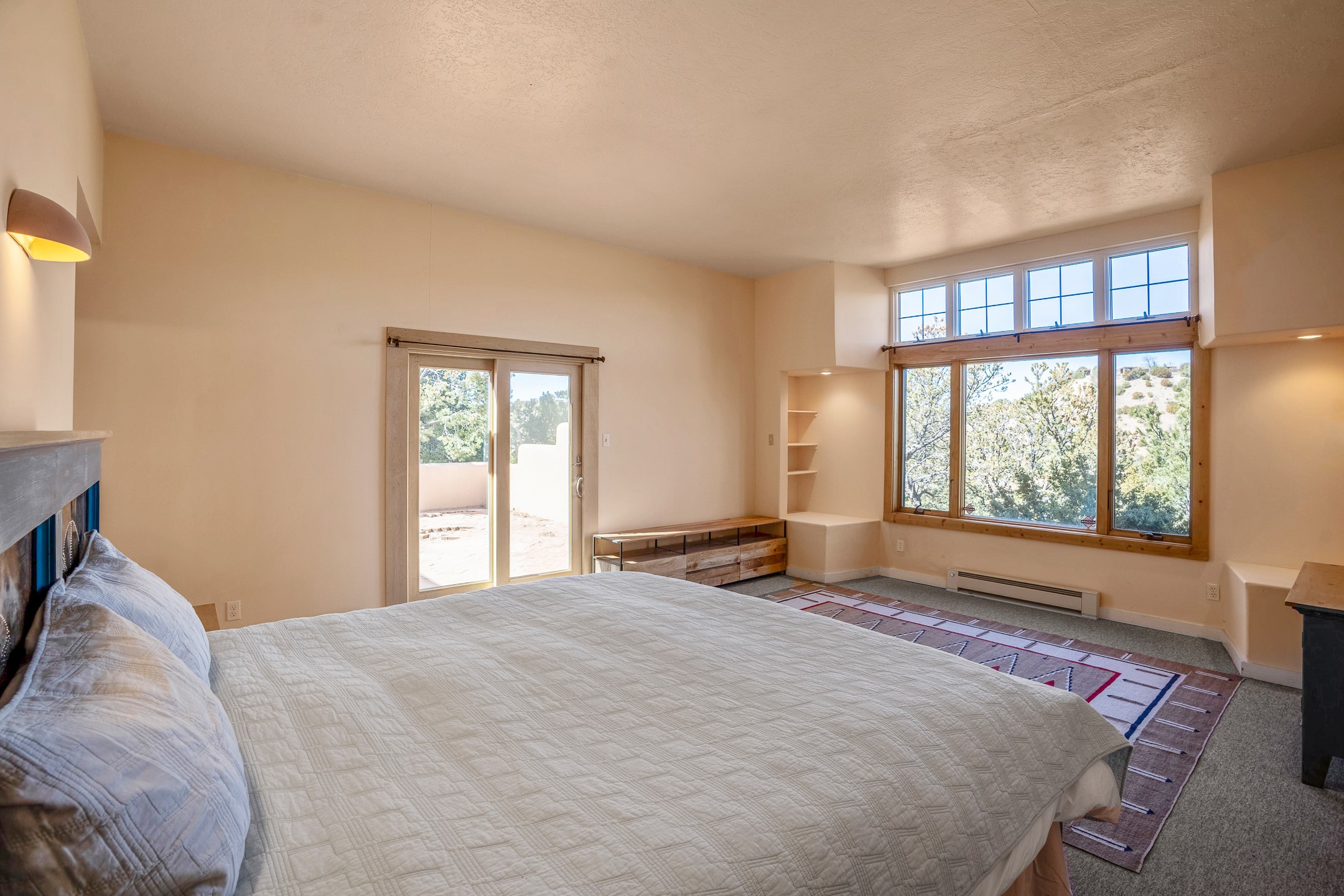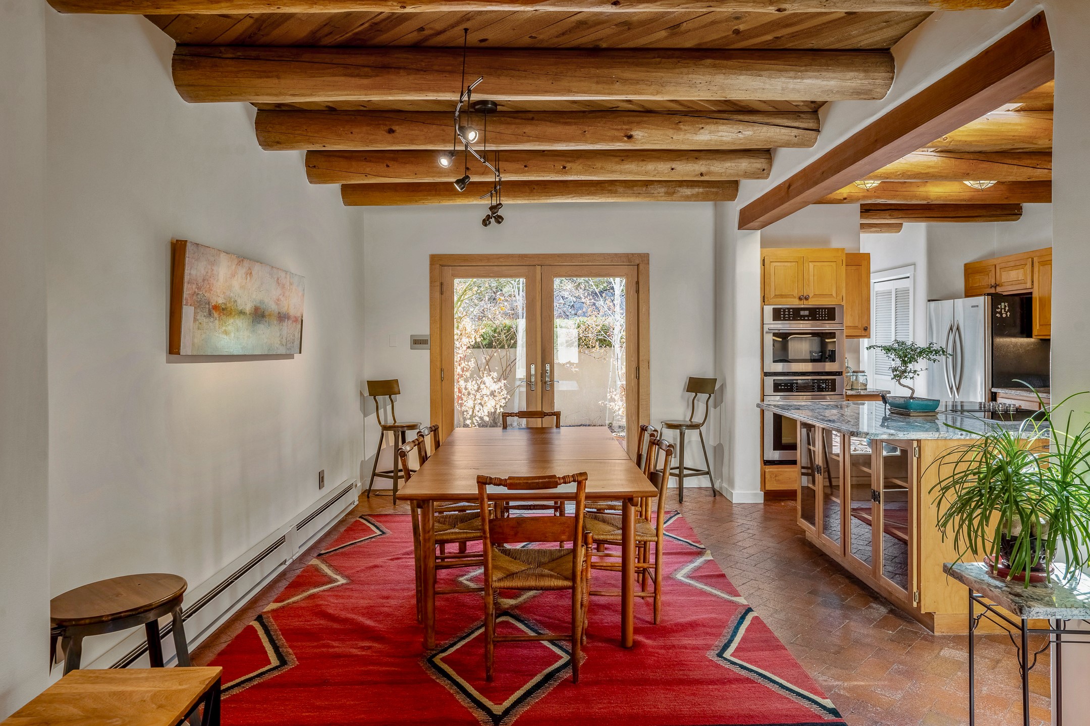 Beauty and elegance abound in this exquisite north east Santa Fe home. Nestled into the rolling hills just minutes from the Plaza, this NE gem has sweeping sunset views of the Sandia Mountains. A lush and tranquil garden with mature fruit trees, roses, aspen, and a towering ponderosa pine surround the house providing privacy. The single level Main house has a flowing open floor plan replete with Southwest charm, including beamed high ceilings, two Kiva fireplaces, a fully remodeled kitchen with granite countertops and breakfast bar seating. The large bedrooms have an abundance of closet space and built in shelving. The primary bedroom includes lovely picture windows, french doors leading out to the patio with outdoor fireplace and an ensuite bathroom with jacuzzi tub. The Main house has Tesla Solar Panels which were purchased in 2016 and have a 20 year warranty, a New Roof and recent stucco, as well as recently added french doors in the living room and Primary bedroom. An income-producing detached Casita with lovely views is privately set away from the Main House, and includes a full kitchen, 3/4 bath, and its own portal.