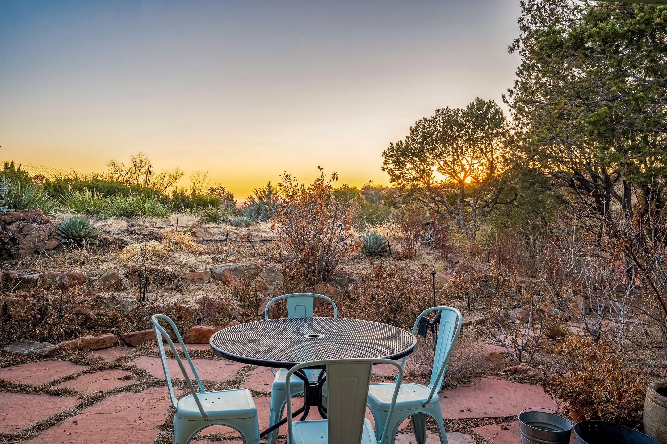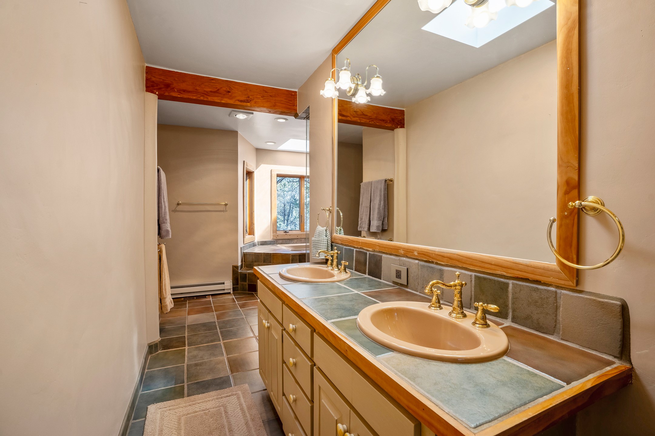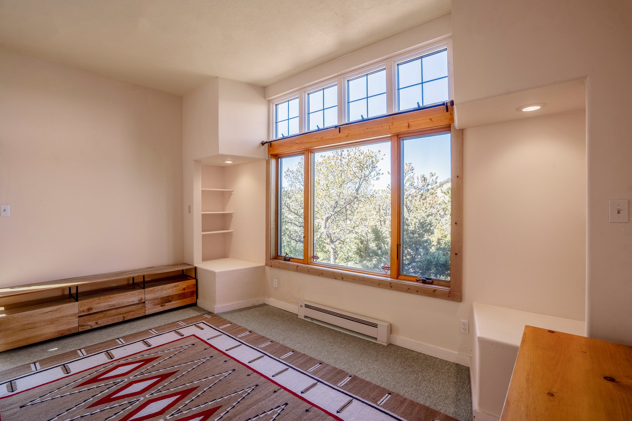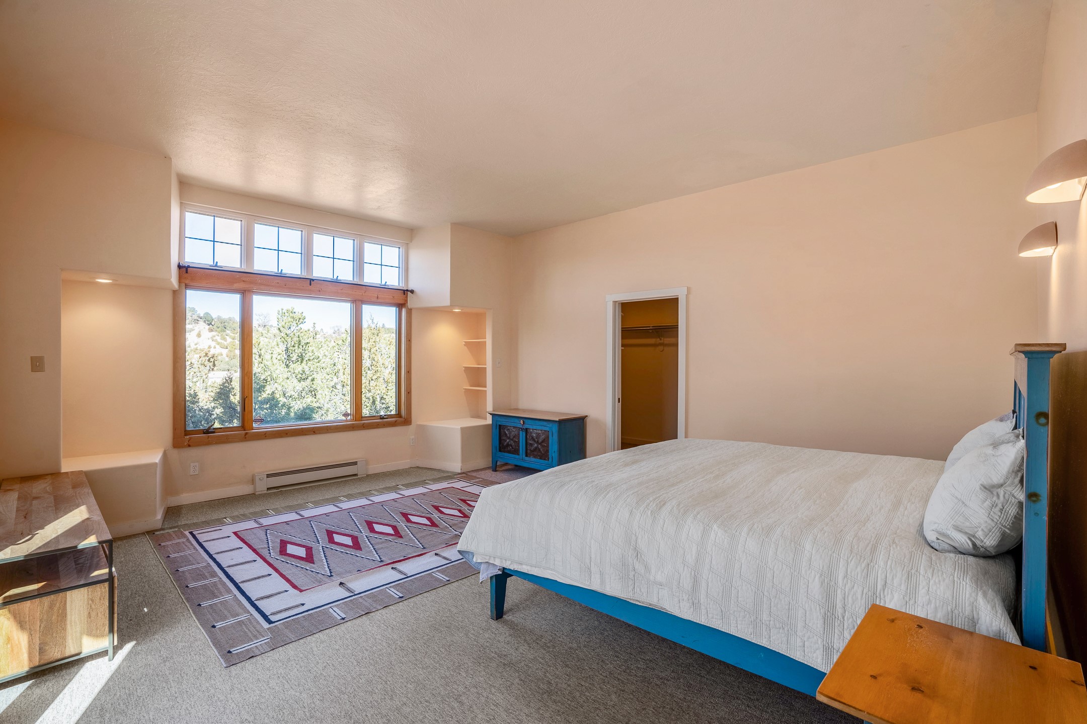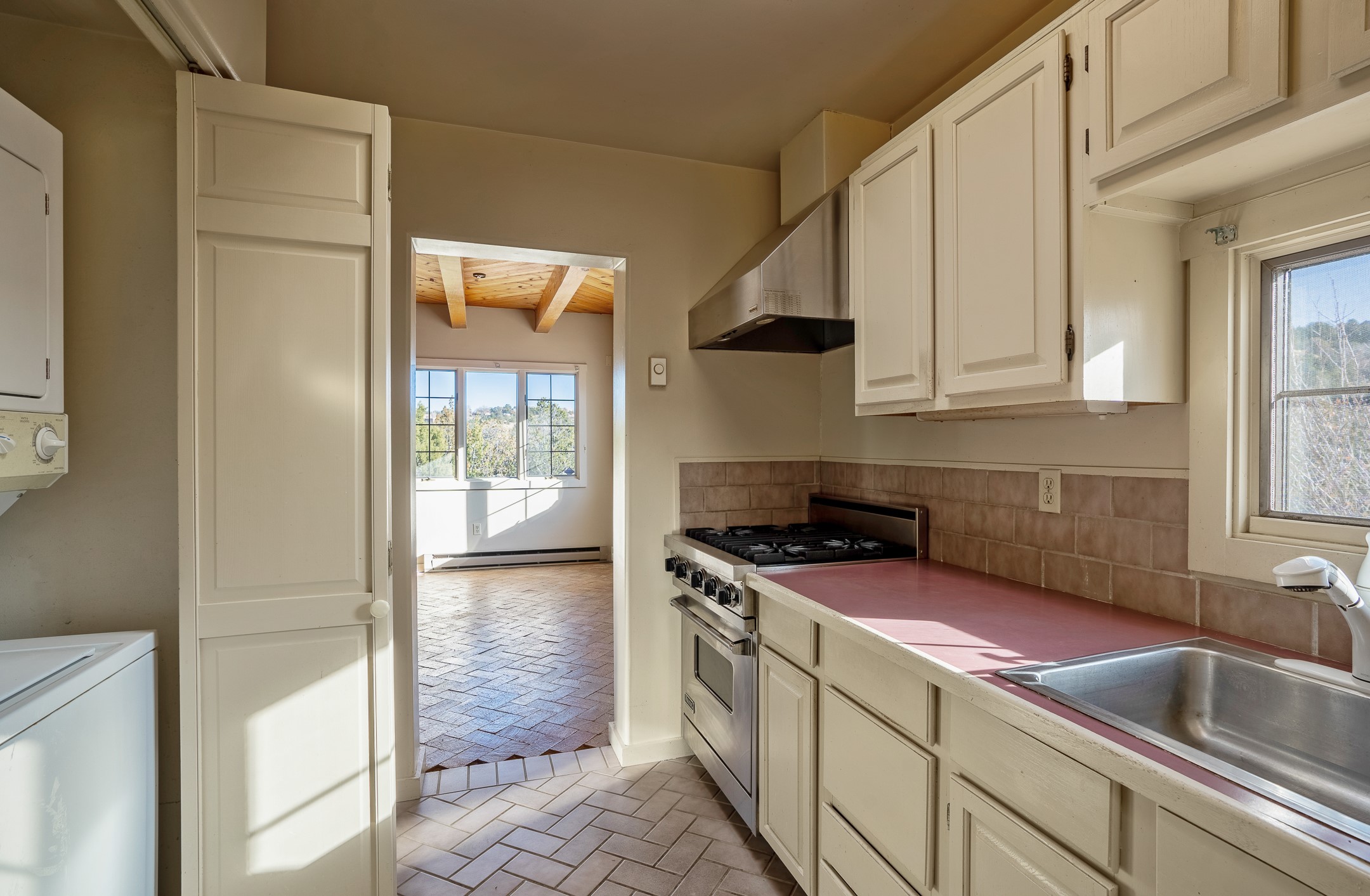 Beauty and elegance abound in this exquisite north east Santa Fe home. Nestled into the rolling hills just minutes from the Plaza, this NE gem has sweeping sunset views of the Sandia Mountains. A lush and tranquil garden with mature fruit trees, roses, aspen, and a towering ponderosa pine surround the house providing privacy. The single level Main house has a flowing open floor plan replete with Southwest charm, including beamed high ceilings, two Kiva fireplaces, a fully remodeled kitchen with granite countertops and breakfast bar seating. The large bedrooms have an abundance of closet space and built in shelving. The primary bedroom includes lovely picture windows, french doors leading out to the patio with outdoor fireplace and an ensuite bathroom with jacuzzi tub. The Main house has Tesla Solar Panels which were purchased in 2016 and have a 20 year warranty, a New Roof and recent stucco, as well as recently added french doors in the living room and Primary bedroom. An income-producing detached Casita with lovely views is privately set away from the Main House, and includes a full kitchen, 3/4 bath, and its own portal.