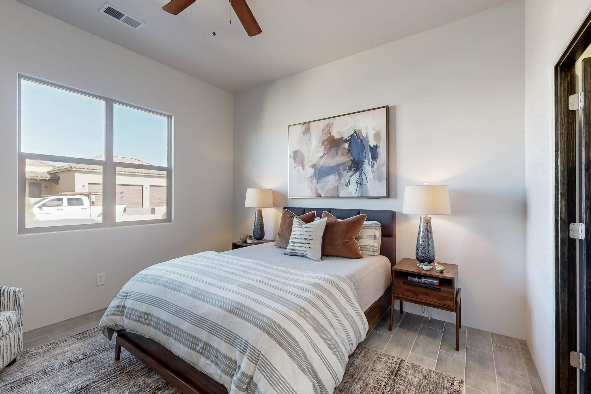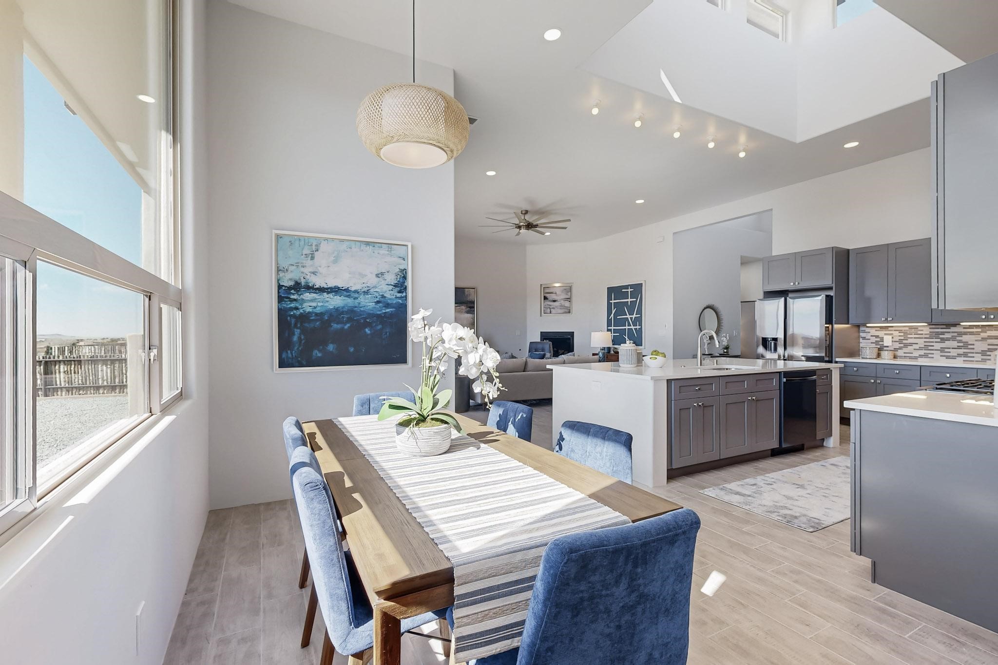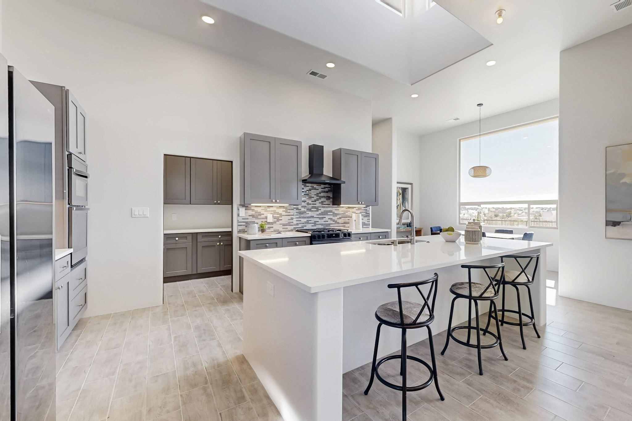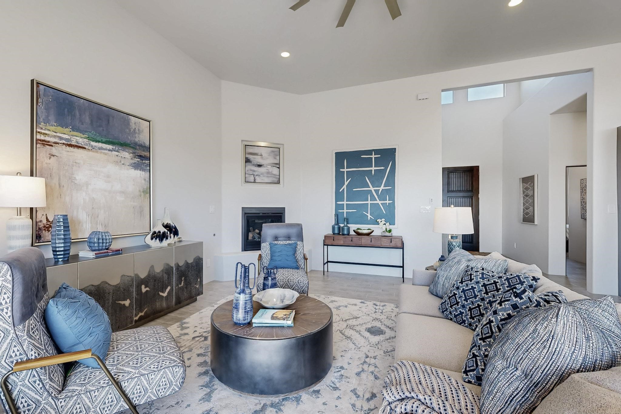 Step into luxury at 28 La Pradera, a 2350 square foot contemporary home designed for comfort, entertaining and breathtaking 180-degree territorial views. A brick-paved covered entry leads to an eight-foot high solid wood door opening into a soaring atrium with clerestory windows. To the right of the entry is a bedroom with a full bath that would be perfect for a home office. To the left is a second bedroom with a walk-in closet. A hall closet provides extra storage. Across is a sliding barn door accessing a large butler's pantry that connects to the kitchen with a swinging door. Open kitchen design with quartz countertops, 17-foot-tall skylight with clerestory windows on all four sides and wired for a chandelier. A powder room has direct access to the rear portal. Also, a secure room for a safe and storage of valuables. The generous owner's suite has wonderful views and double counters and sinks, a free-standing tub, a separate shower with marble and rainfall tile, linen closet, and a 72 sq. ft. walk-in closet. The two-car garage has an epoxied floor and a large room for holiday storage or gift wrapping.