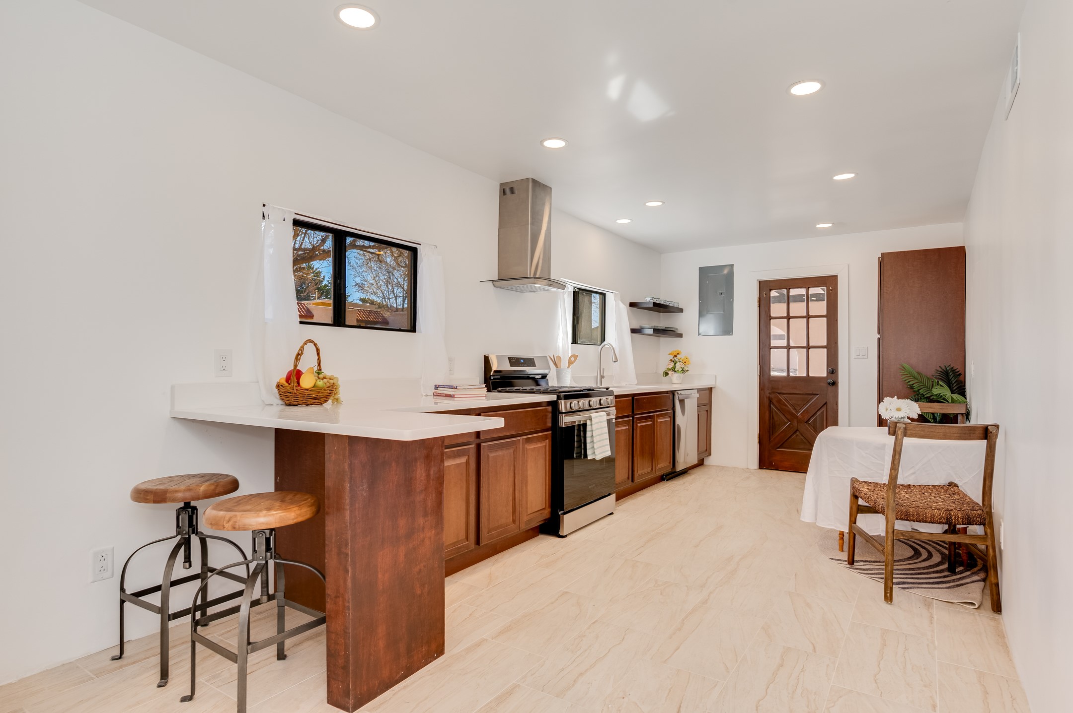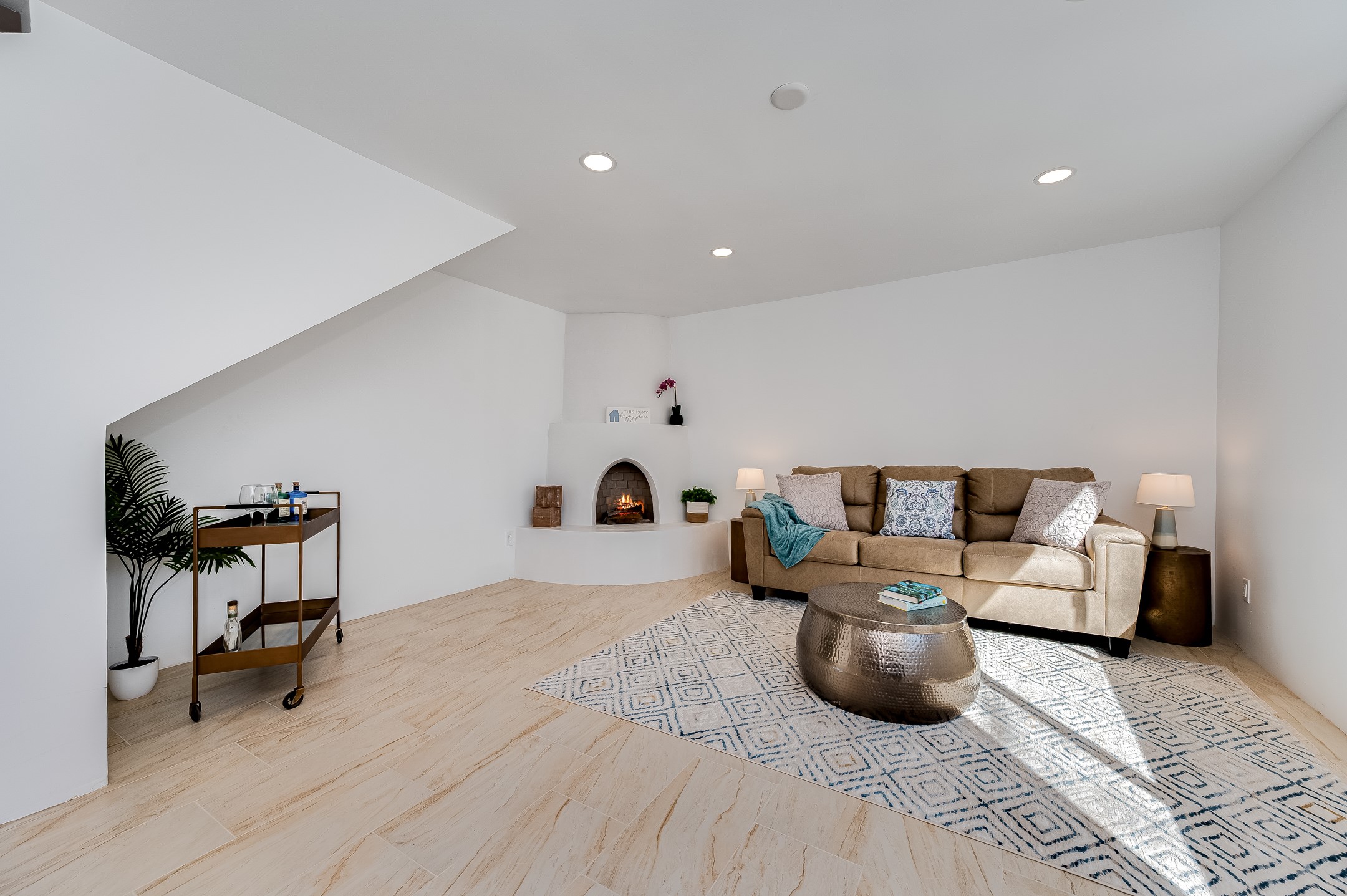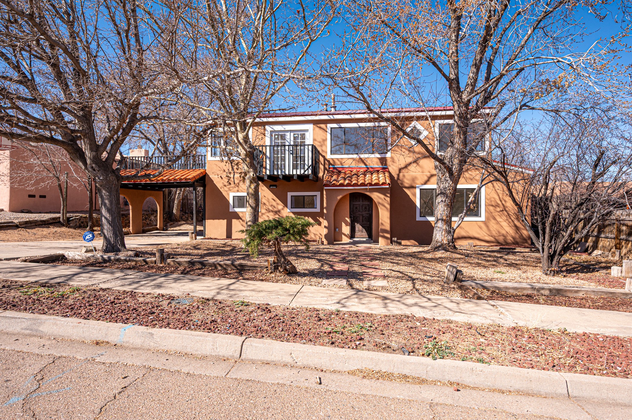 This beautifully renovated 2-level home covers 2,672 square feet of artful design and practicality. Offering an adaptable layout that can be tailored as two or three units, the entire home has been updated with recessed lighting, new kitchens complete with stainless appliances, new bathrooms, and gorgeous tile flooring. With many more features to love, including A/C, kiva fireplace, large balcony, a huge backyard and carport, this stellar property is in a prime location for commuters and ready for move-in! The main home offers two bedrooms on the main level. Upstairs, a spacious and light filled suite with secondary living area also has a separate private entry that can easily double as a light-filled studio or in-law suite, while the attached guest house presents another passive income opportunity. This established neighborhood with no HOA is ideal for commuters, a stones throw from shops, and central to everything Santa Fe has to offer.
