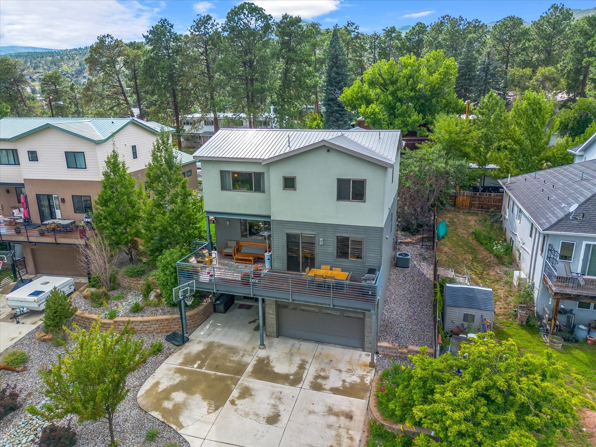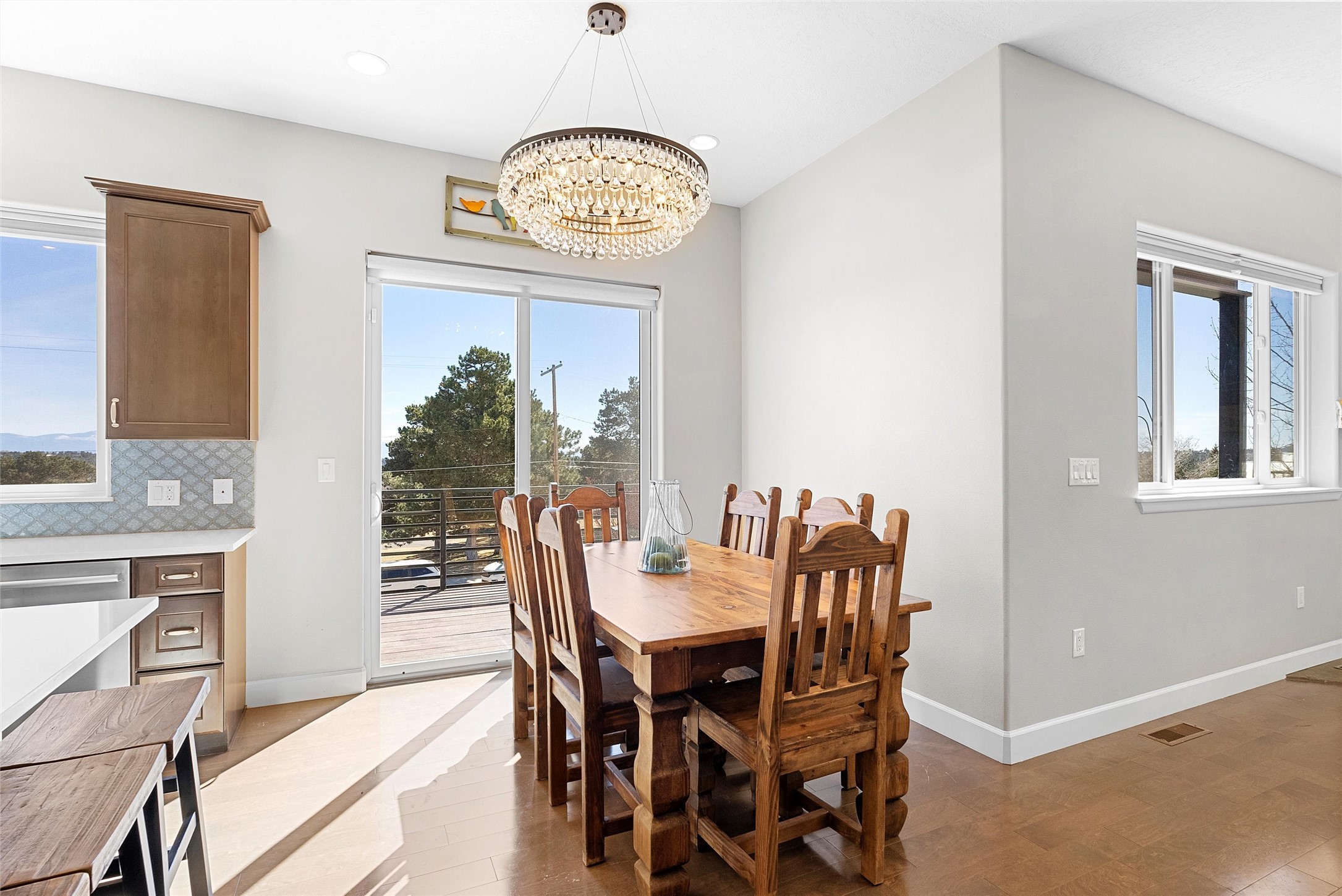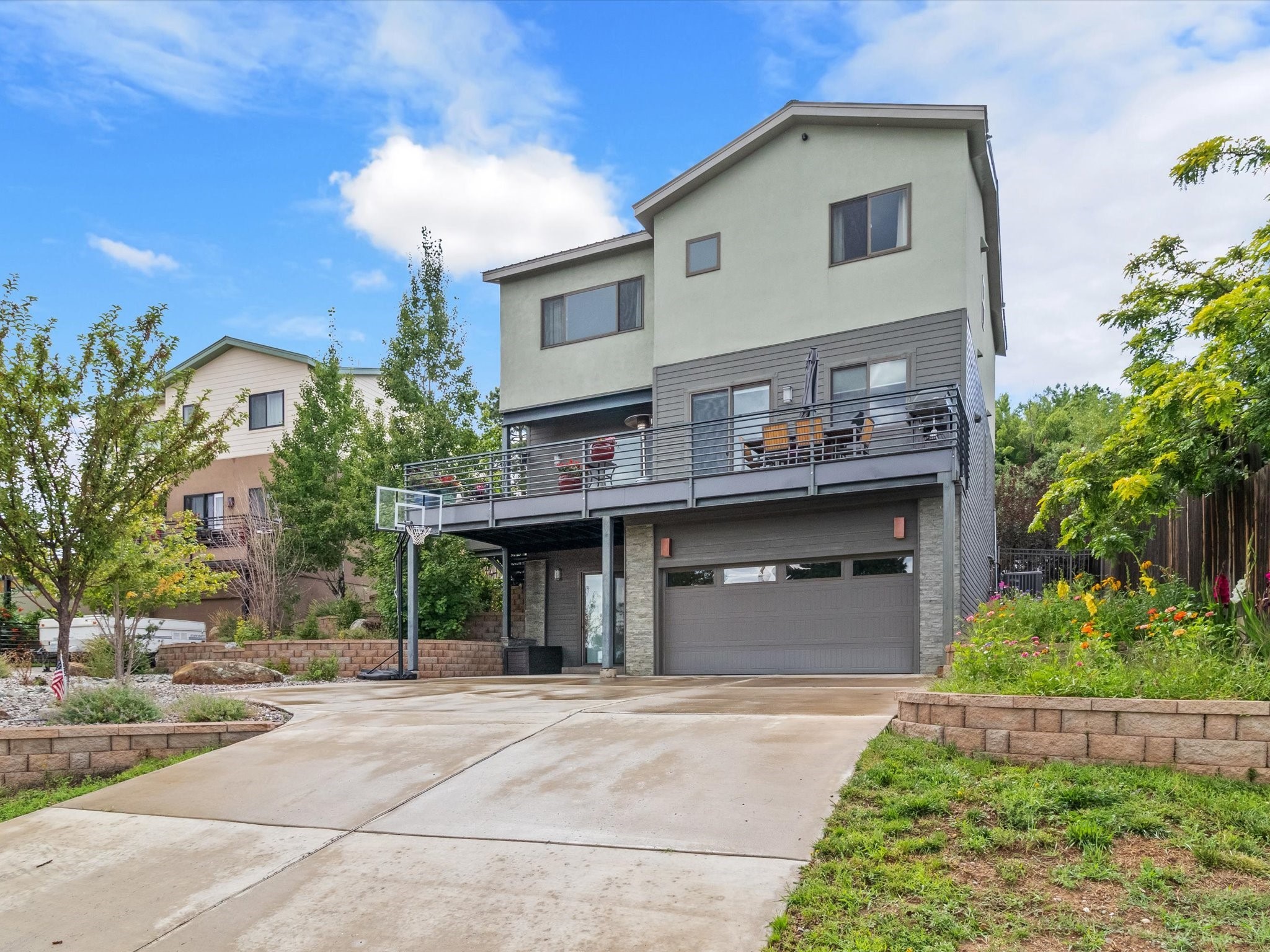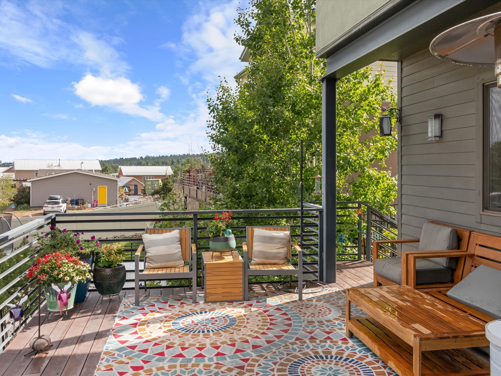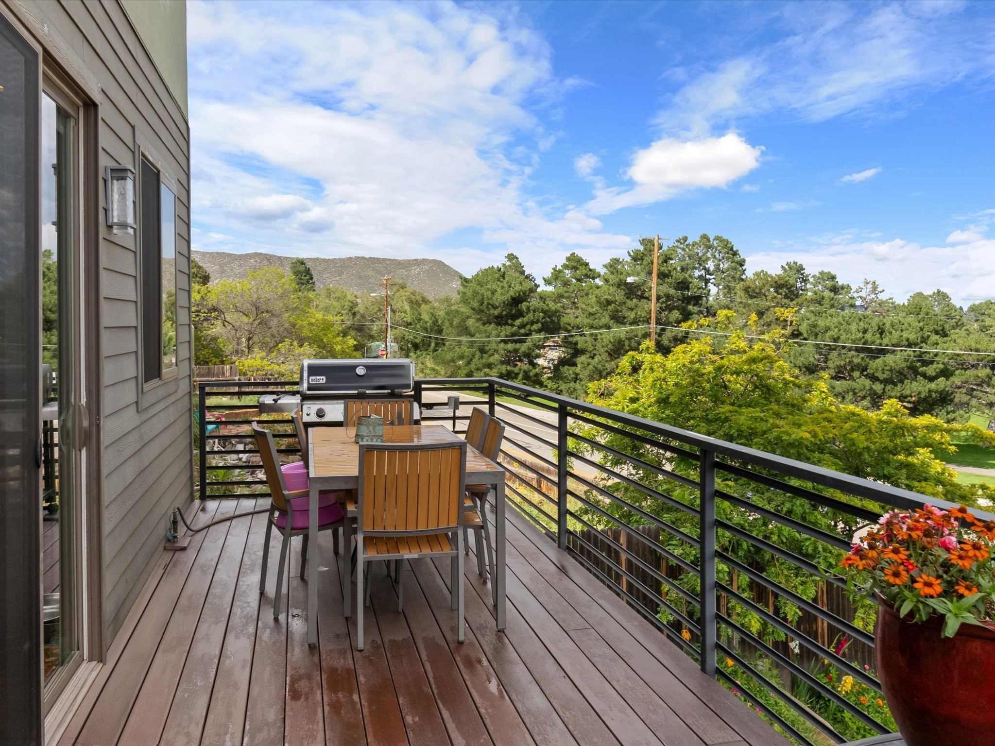 **SELLER OFFERING BONUS 5K CONCESSION (RATE BUY-DOWN) ** with acceptable offer! READY for breathtaking views of the Sangre de Cristo Mountains and Jemez Mountains, this custom 5-bedroom, 4 bath home has it all. Nestled in a family-friendly neighborhood within the highly sought-after Mountain Elementary School District, this modern home built in 2017 by Alan Mascord Design Associates Inc.--offers the perfect blend of contemporary style and functional amenities.The home features a stone veneer exterior and a meticulously kept fenced-in front yard with a drip irrigation system. Inside, cathedral vaulted ceilings with wood beams create a spacious, airy ambiance throughout. The layout includes five bedrooms and 2 full, 1 three quarter and one-half bath, enhanced by a versatile triplex configuration that offers two primary bedrooms or mother-in-law suite--each with its own en-suite bathroom for added luxury and privacy. The living room boasts a striking stacked stone fireplace as its focal point, complemented by large windows that fill the space with natural light and frame the stunning mountain views. A spacious elevated deck extends the living area outdoors, providing an ideal spot for entertaining or simply enjoying the scenery. Luxury wood floors, no carpet other than interior steps! The gourmet kitchen features quartz countertops, upgraded appliances, high-profile cabinets, and a custom architectural pass-through with built-in cabinetry that seamlessly connects to the living space. Elegant quartz accents continue into the bathrooms, and lavish overhead lighting paired with custom copper touches adds warmth and unique character throughout. BEAUTIFULLY SEPARATED ENTRANCE FOR MOTHER IN LAW QUARTERS lower level access!For added convenience, utility sinks are included in both the laundry room and the garage. The 3-car tandem garage provides ample parking and storage, accessible from North Road by Urban Park. Additional features include refrigerated air, a durable metal roof, a tankless water heater, and an electric vehicle charging station. This exceptional custom home offers everything you need--from form to function. Contact us today for your private showing!