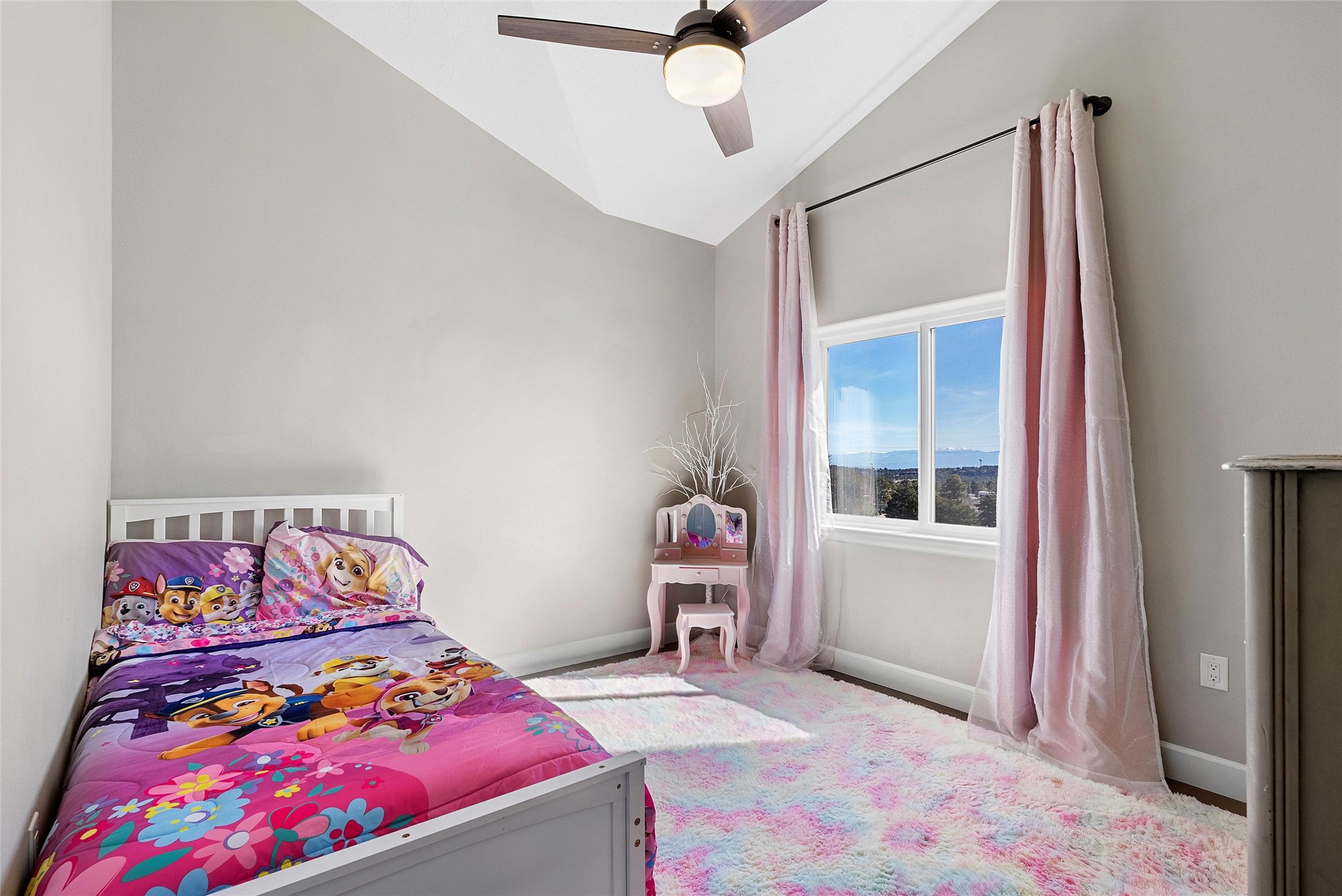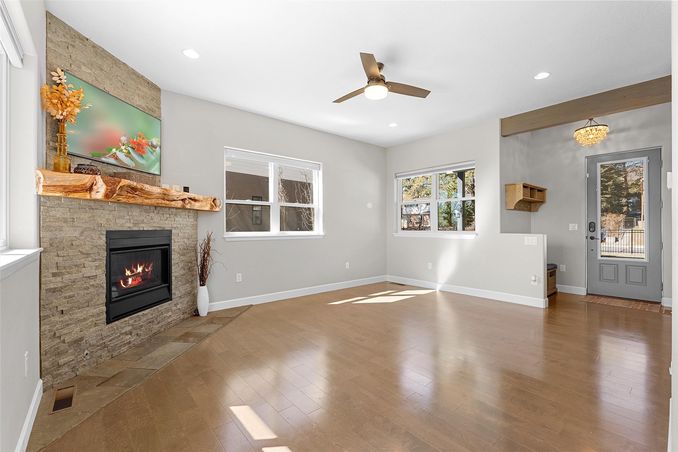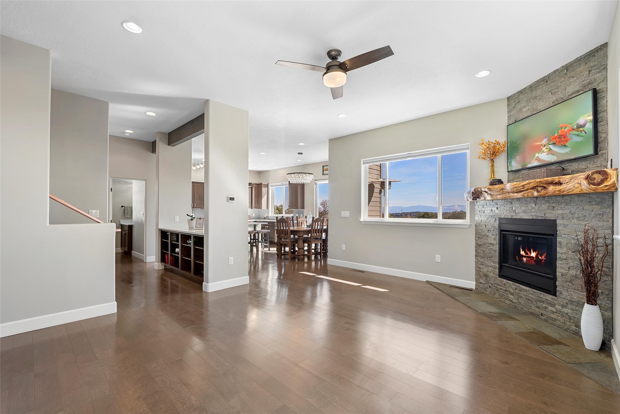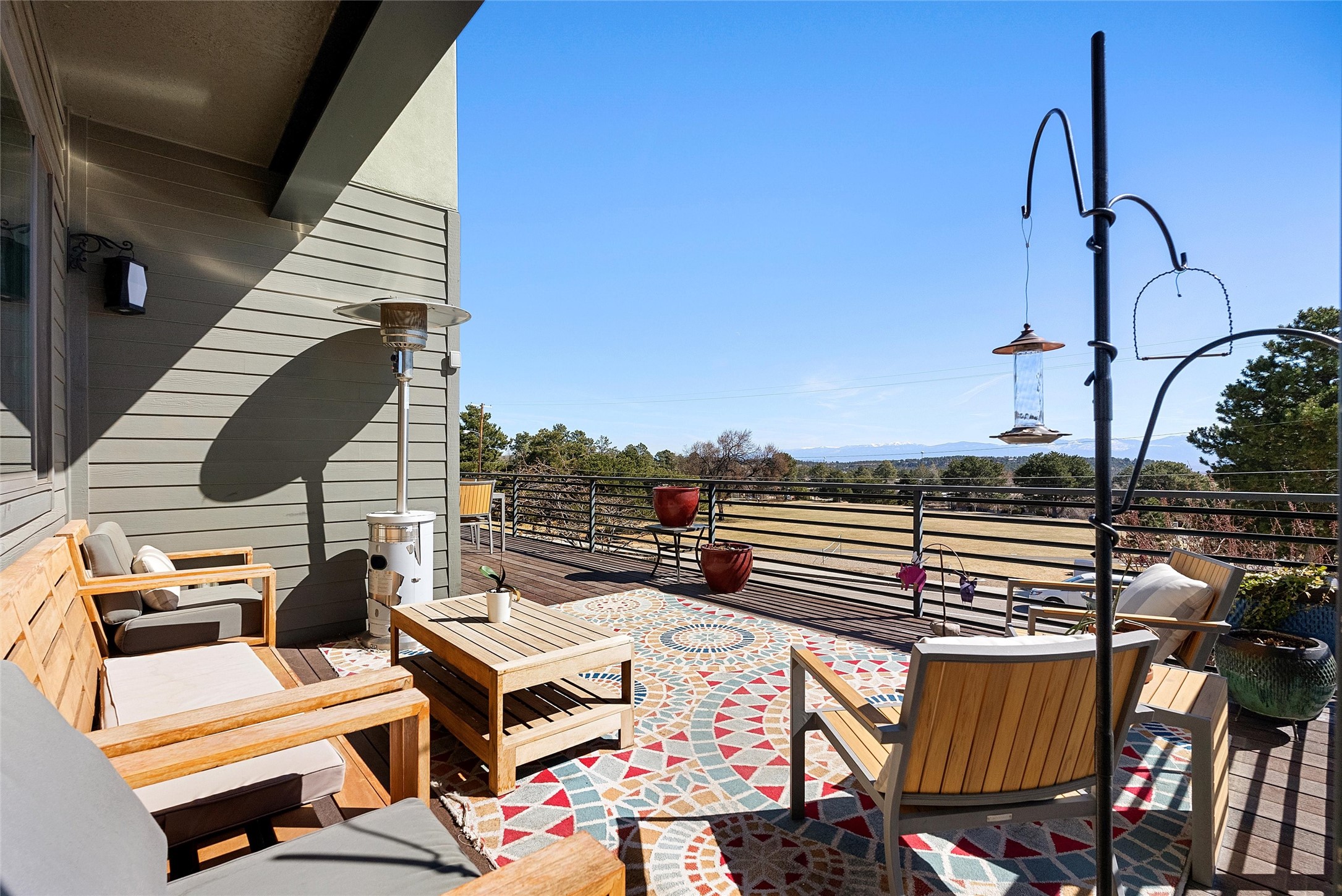 **SELLER OFFERING BONUS 5K CONCESSION (RATE BUY-DOWN) ** with acceptable offer! READY for breathtaking views of the Sangre de Cristo Mountains and Jemez Mountains, this custom 5-bedroom, 4 bath home has it all. Nestled in a family-friendly neighborhood within the highly sought-after Mountain Elementary School District, this modern home built in 2017 by Alan Mascord Design Associates Inc.--offers the perfect blend of contemporary style and functional amenities.The home features a stone veneer exterior and a meticulously kept fenced-in front yard with a drip irrigation system. Inside, cathedral vaulted ceilings with wood beams create a spacious, airy ambiance throughout. The layout includes five bedrooms and 2 full, 1 three quarter and one-half bath, enhanced by a versatile triplex configuration that offers two primary bedrooms or mother-in-law suite--each with its own en-suite bathroom for added luxury and privacy. The living room boasts a striking stacked stone fireplace as its focal point, complemented by large windows that fill the space with natural light and frame the stunning mountain views. A spacious elevated deck extends the living area outdoors, providing an ideal spot for entertaining or simply enjoying the scenery. Luxury wood floors, no carpet other than interior steps! The gourmet kitchen features quartz countertops, upgraded appliances, high-profile cabinets, and a custom architectural pass-through with built-in cabinetry that seamlessly connects to the living space. Elegant quartz accents continue into the bathrooms, and lavish overhead lighting paired with custom copper touches adds warmth and unique character throughout. BEAUTIFULLY SEPARATED ENTRANCE FOR MOTHER IN LAW QUARTERS lower level access!For added convenience, utility sinks are included in both the laundry room and the garage. The 3-car tandem garage provides ample parking and storage, accessible from North Road by Urban Park. Additional features include refrigerated air, a durable metal roof, a tankless water heater, and an electric vehicle charging station. This exceptional custom home offers everything you need--from form to function. Contact us today for your private showing!