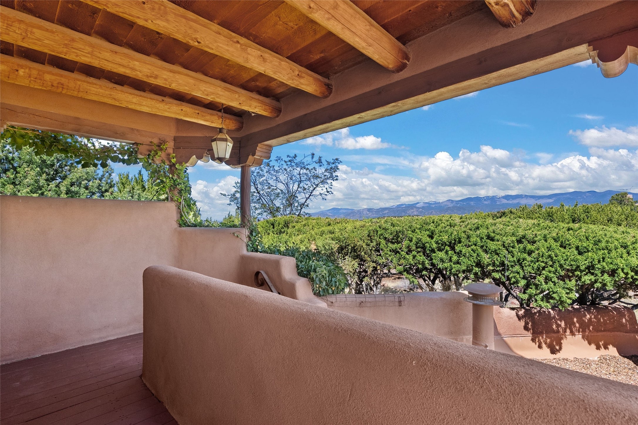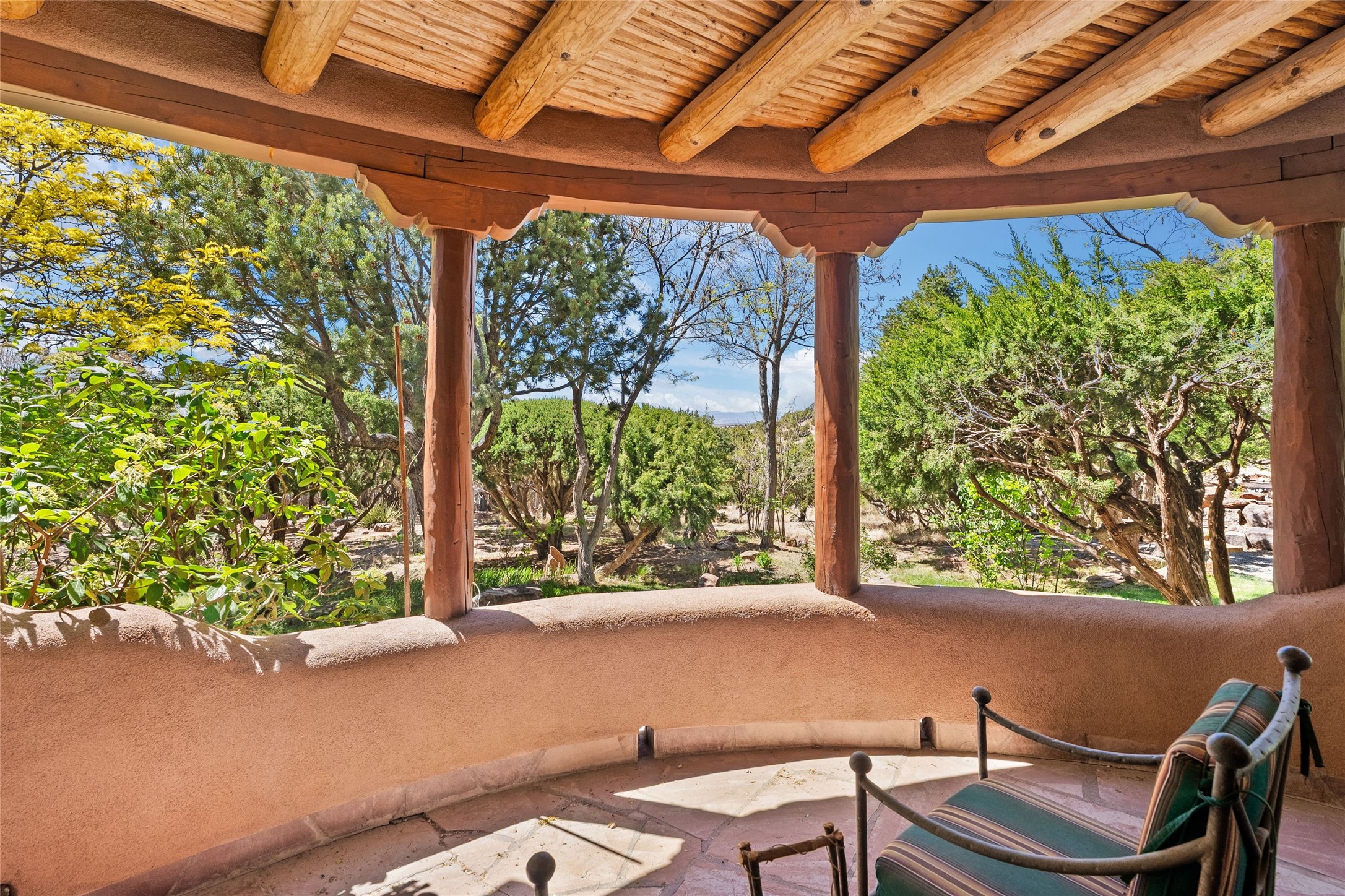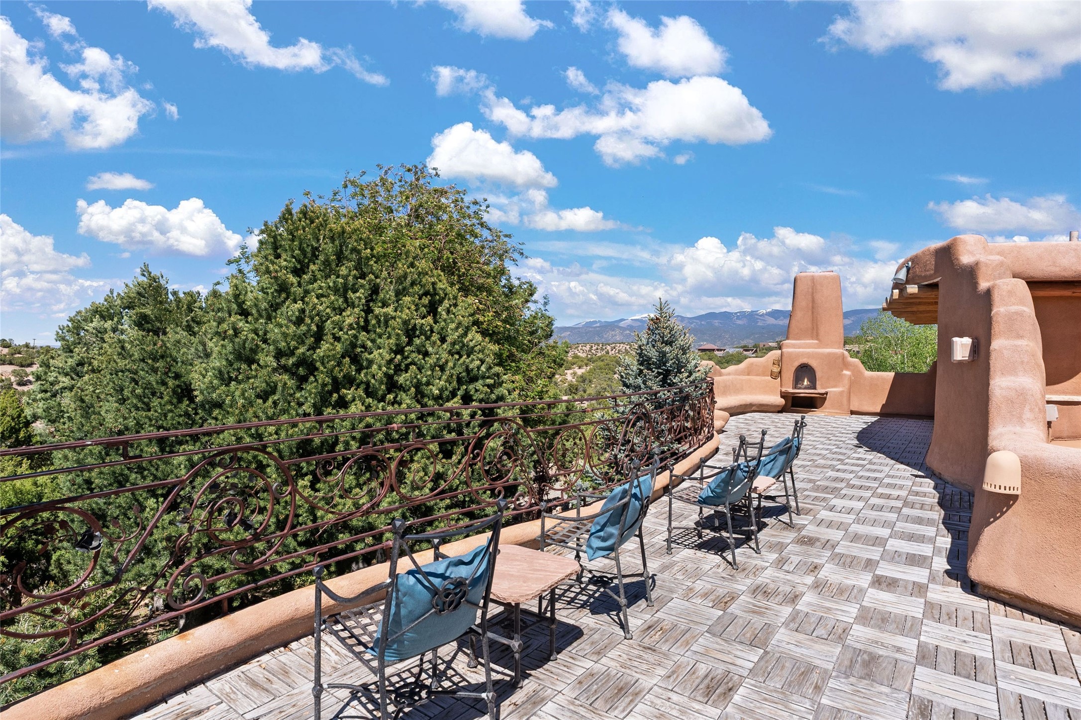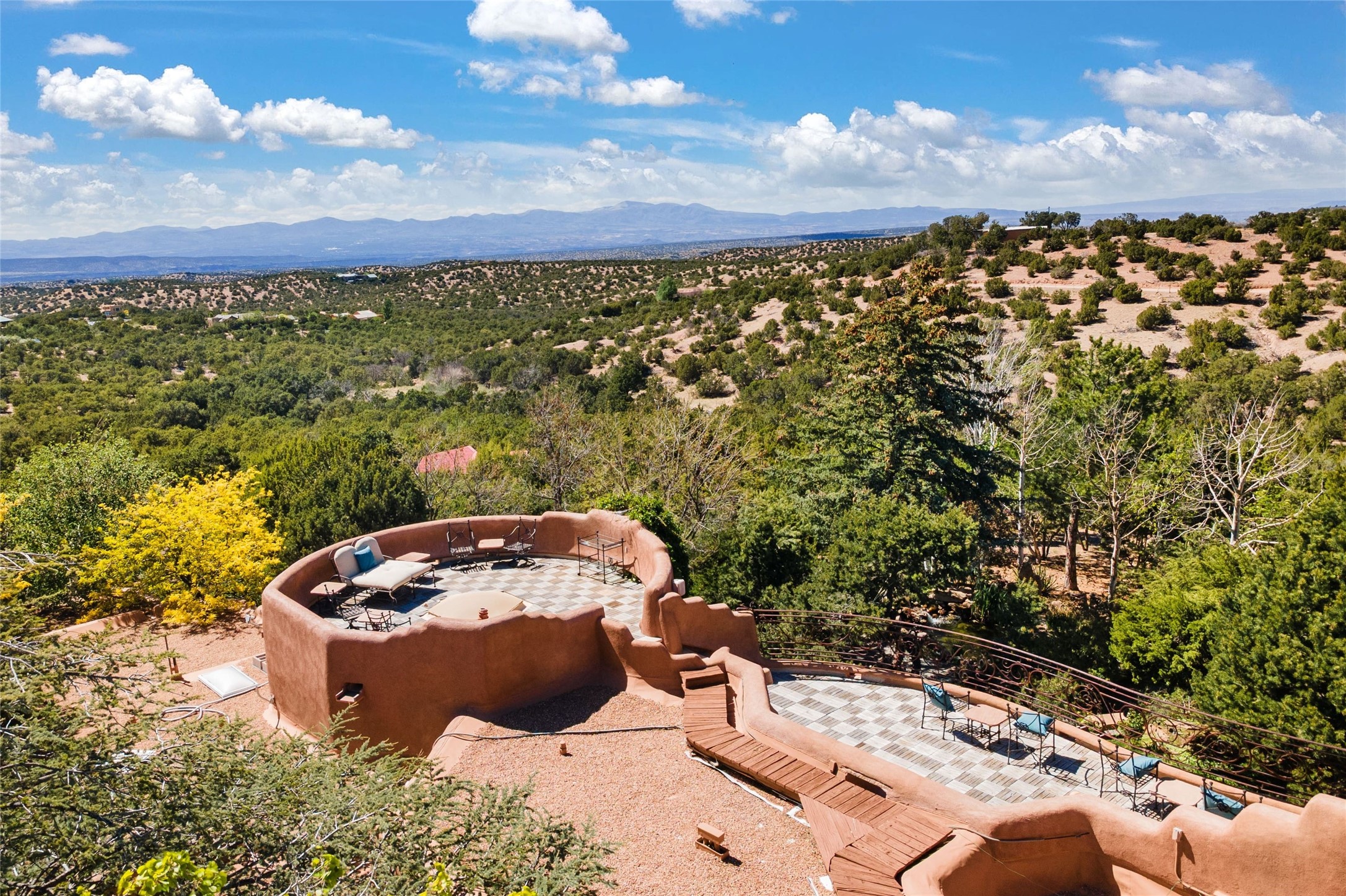 Perched in serene seclusion, this extraordinary estate embodies timeless New Mexico charm, offering breathtaking panoramic views from expansive rooftop decks and refined indoor-outdoor living. A lush courtyard leads into the heart of the home where artisan craftsmanship meets authentic Southwestern style. Curving adobe walls, Saltillo tile floors, carved wooden doors and kiva fireplaces echo throughout. The circular living room features a tiered beamed ceiling, kiva fireplace and intimate west-facing portal. The elegant dining room opens onto the courtyard creating harmony with nature. The kitchen flows to a covered portal with a built-in grill, cabinetry, dual sinks and ample seating--ideal for entertaining. A flagstone stairway leads to a luminous office with built-ins, powder room and rooftop deck. With stunning views of Sangre de Cristo sunrises and Jemez sunsets, this elevated open-air living space includes a kiva fireplace, bancos and a "crow's nest" retreat. The expansive primary suite offers a fireplace-side sitting area, access to a private garden with heated wading pool and outdoor shower and a spa bath with double vanity, soaking tub, steam shower and makeup station. Nearby flex rooms suit a gym, office or library. Two additional bedrooms--one with kiva fireplace and portal--share a beautifully appointed bath. A charming elevated casita includes a kitchen, full bath and mountain views. Meandering pathways wind through curated gardens, a koi pond, fenced garden with raised beds and potting shed, with many portals and patios. A 2-car garage with built-in storage and a separate third garage with a versatile studio and work sink round out the property. This exceptional estate is more than a home--it's a masterpiece of Southwestern living where art, nature and architecture converge in soulful, inspiring harmony.