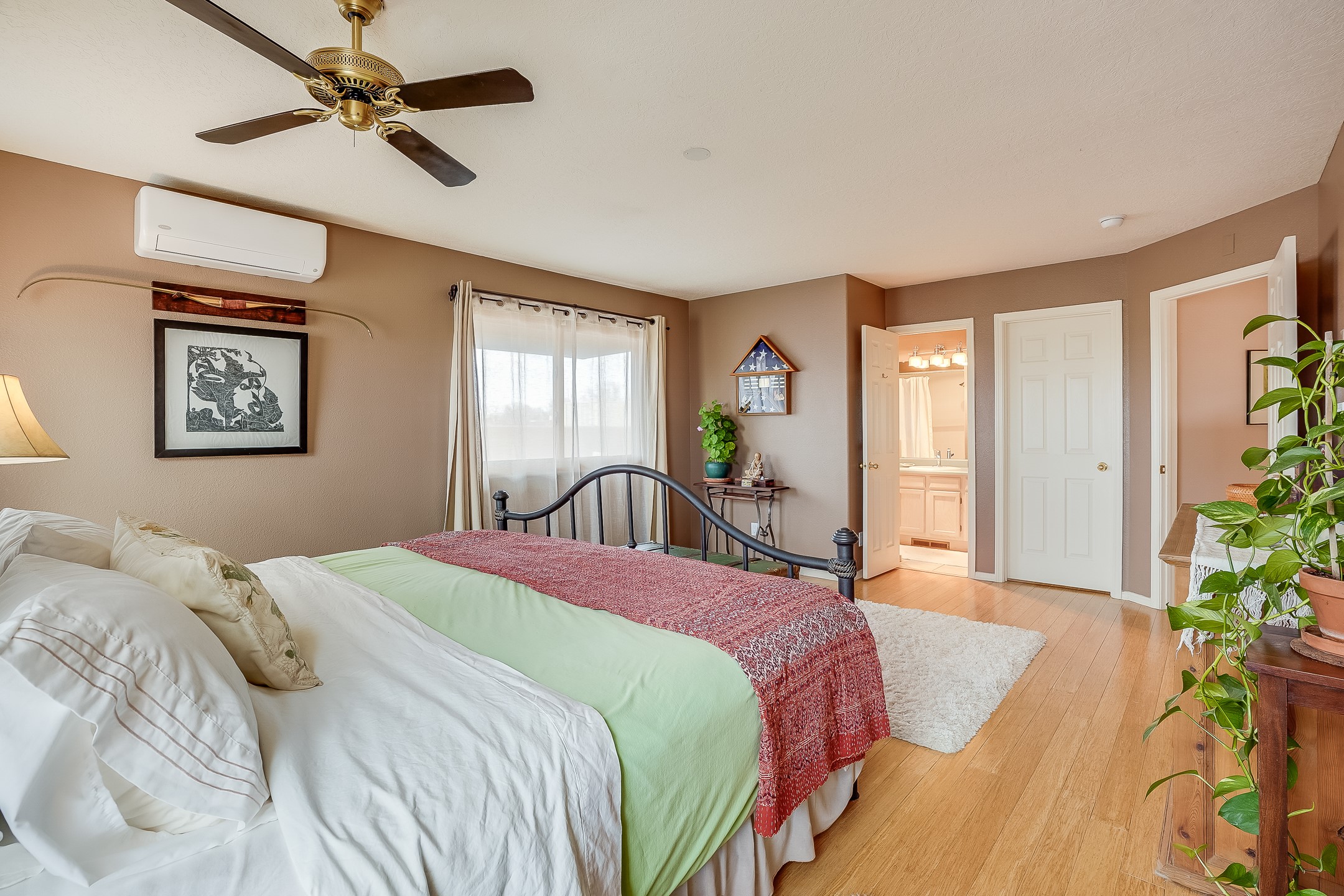 Natural light fills this wonderfully maintained three bed, two bath home in Midtown. The downstairs features a bright living room under a soaring, double-height wood ceiling with skylights, and an open dining/kitchen area. A beautiful wood-burning fireplace serves both the living and dining areas. The stairs and 2nd floor are clad with bamboo floors and both guest rooms open onto a second story deck. The generous primary suite has a full bath and walk in closet. Each bedroom has a separate mini-split for maximum comfort. The home also boasts double paned windows and a fully fenced in backyard great for gardening and entertaining.