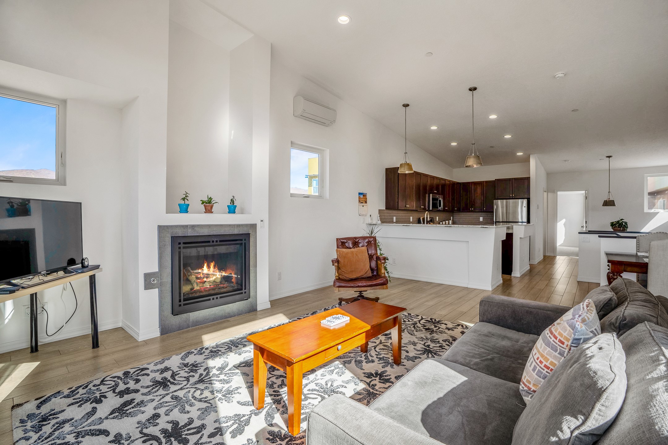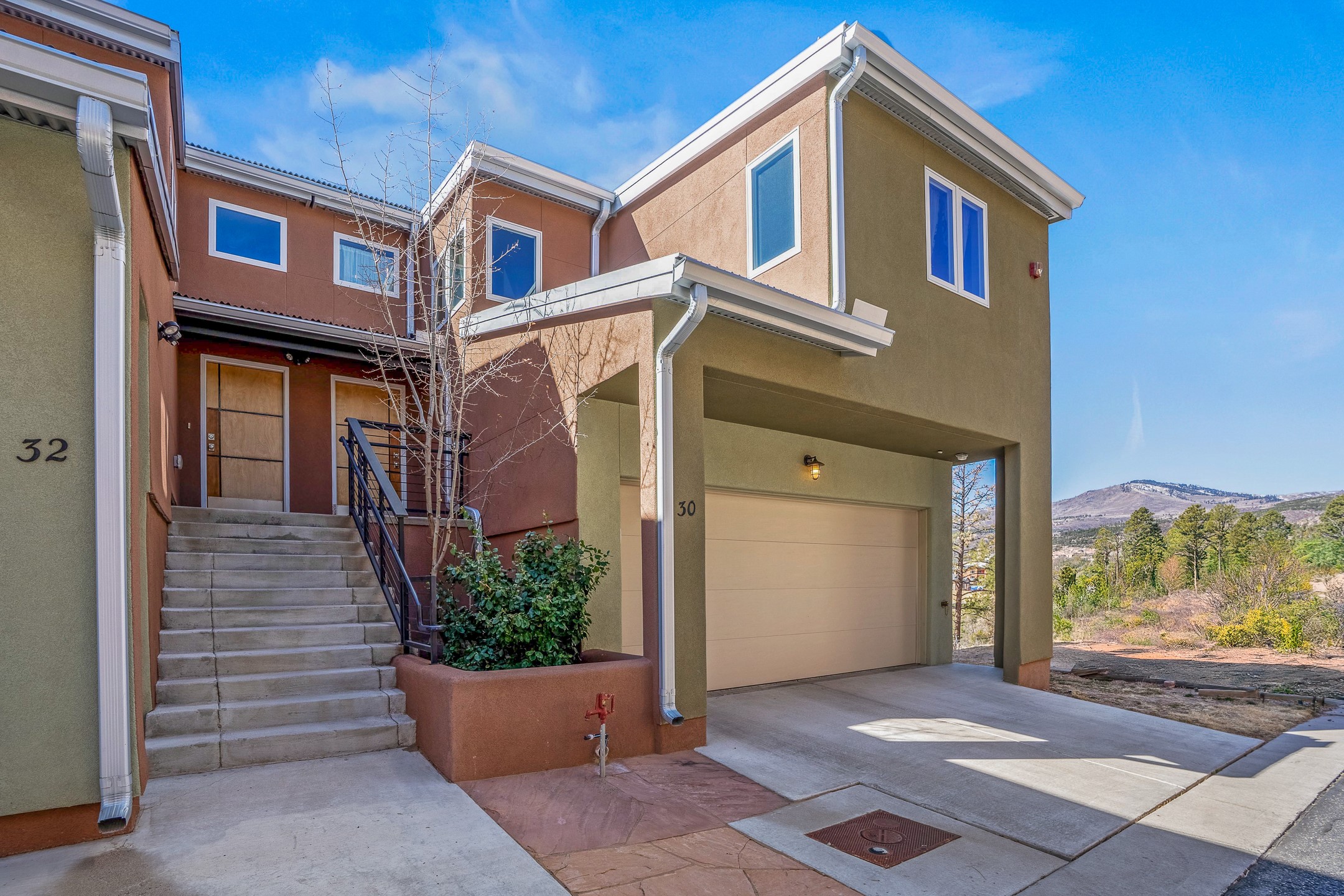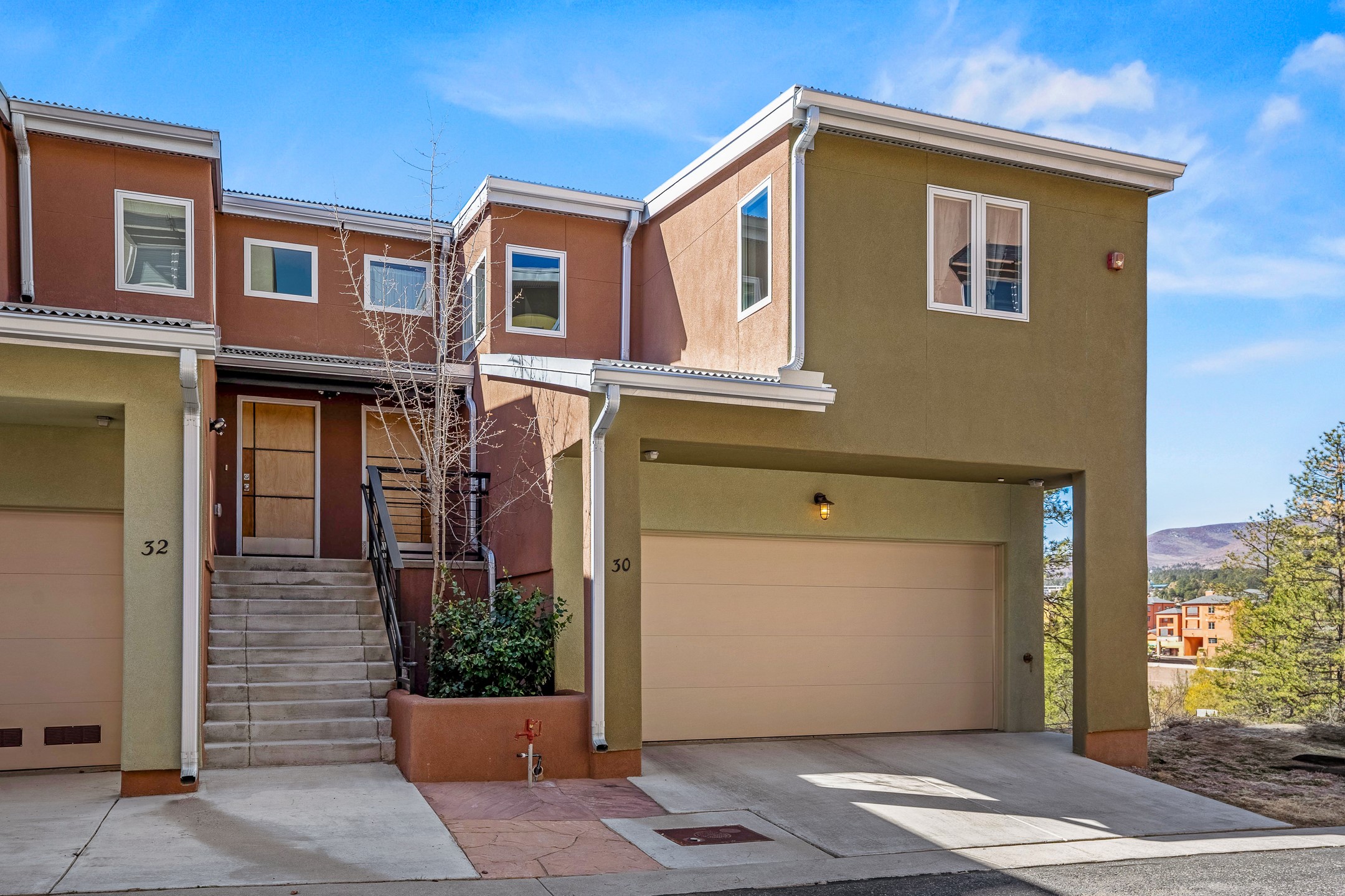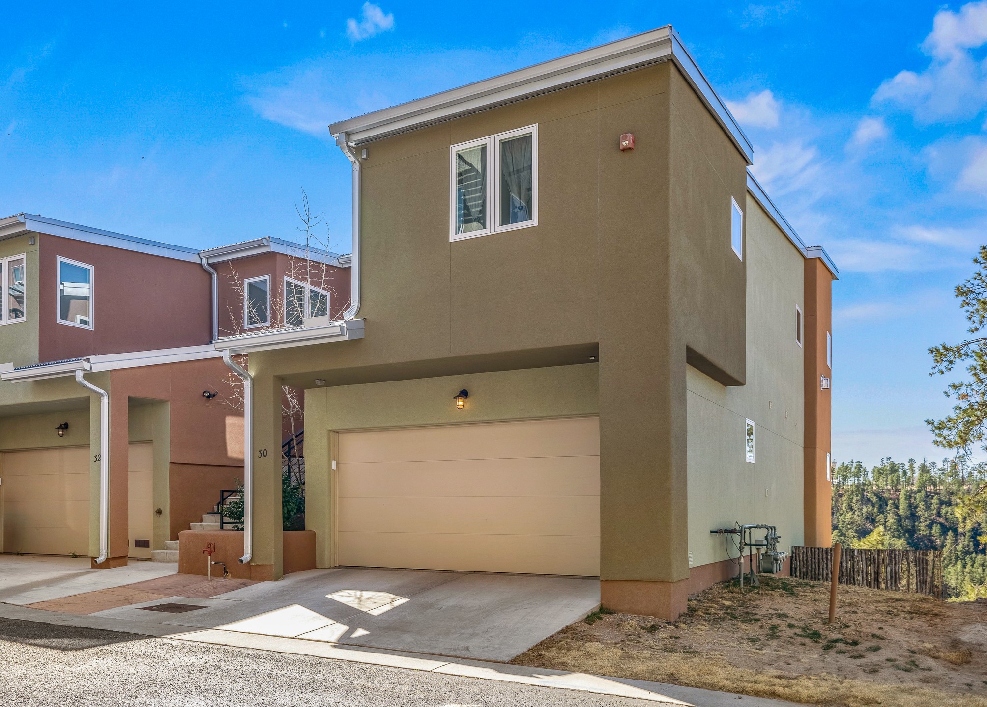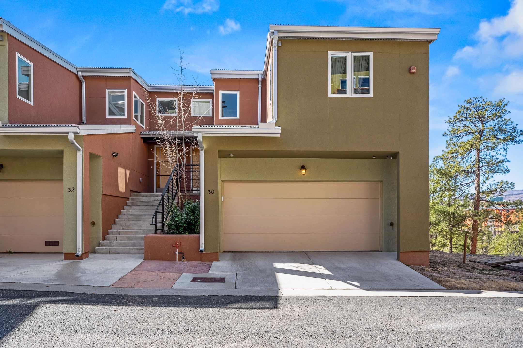 Like-New Modern Canyon View Condo Built in 2019, 3 Bedrooms + Office, 3 Full Bathrooms, Primary Suite, Great Kitchen, Air Conditioning (Mini-Splits), South-Facing Windows for Abundant Natural Light, 2 Car Garage, Meticulously Maintained, Smart-Home and Move-In Ready! Welcome to 30 Canyon View! This newer condo, perched on the canyon and offering great views from multiple balconies and a ground-level patio, provides modern luxury living near downtown Los Alamos. The top floor features an open floor plan with seamless transitions between the kitchen, living room, and dining room, as well as slanted lofted ceilings for a high-end architectural touch. The kitchen includes gas cooking, granite countertops, tile backsplash, stainless steel appliances, barstool seating, and abundant cabinet space. The living room offers great south-facing canyon views and natural light, a gas fireplace, mini-split air conditioning, and a balcony for enjoying your morning coffee while breathing in the fresh mountain air. A full bathroom and an office (or fourth bedroom) complete the top floor. The primary bedroom suite features a large walk-in closet, a private south-facing balcony, mini-split cooling for comfort, and an en suite bathroom with glass shower enclosure, soaking tub, and dual vanities. Two additional bedrooms are on the ground level, and each include access to the patio. A full bathroom services these two guest bedrooms. The property also includes a fire suppression system with ballast tank and code-compliant piping to each room in the house for peace of mind. A Lochinvar tankless water heater provides hot water and three-zone heating. The property has also Smart Home ready! This property is sure to sell quickly, so schedule your showing today before this opportunity is gone!