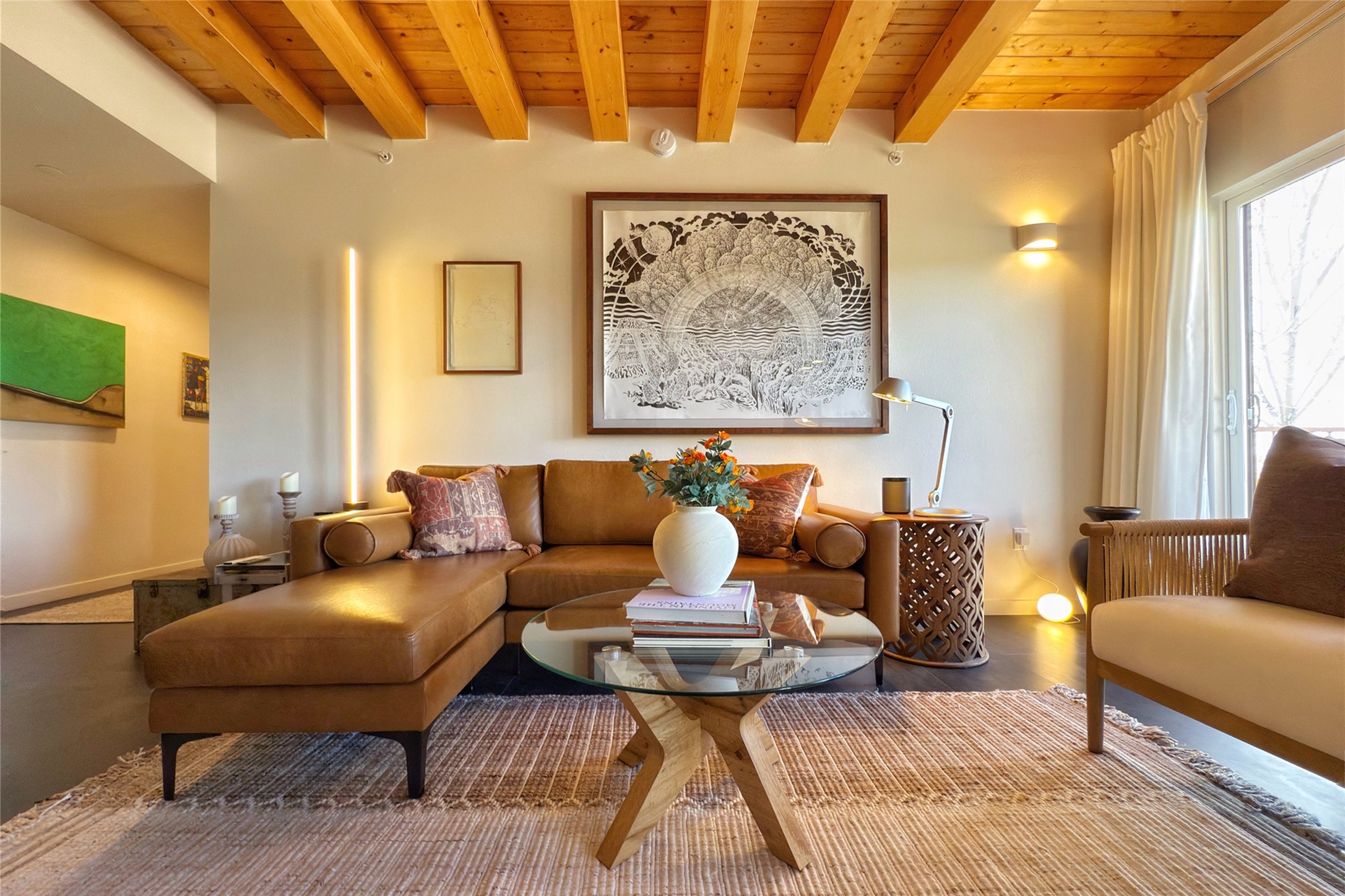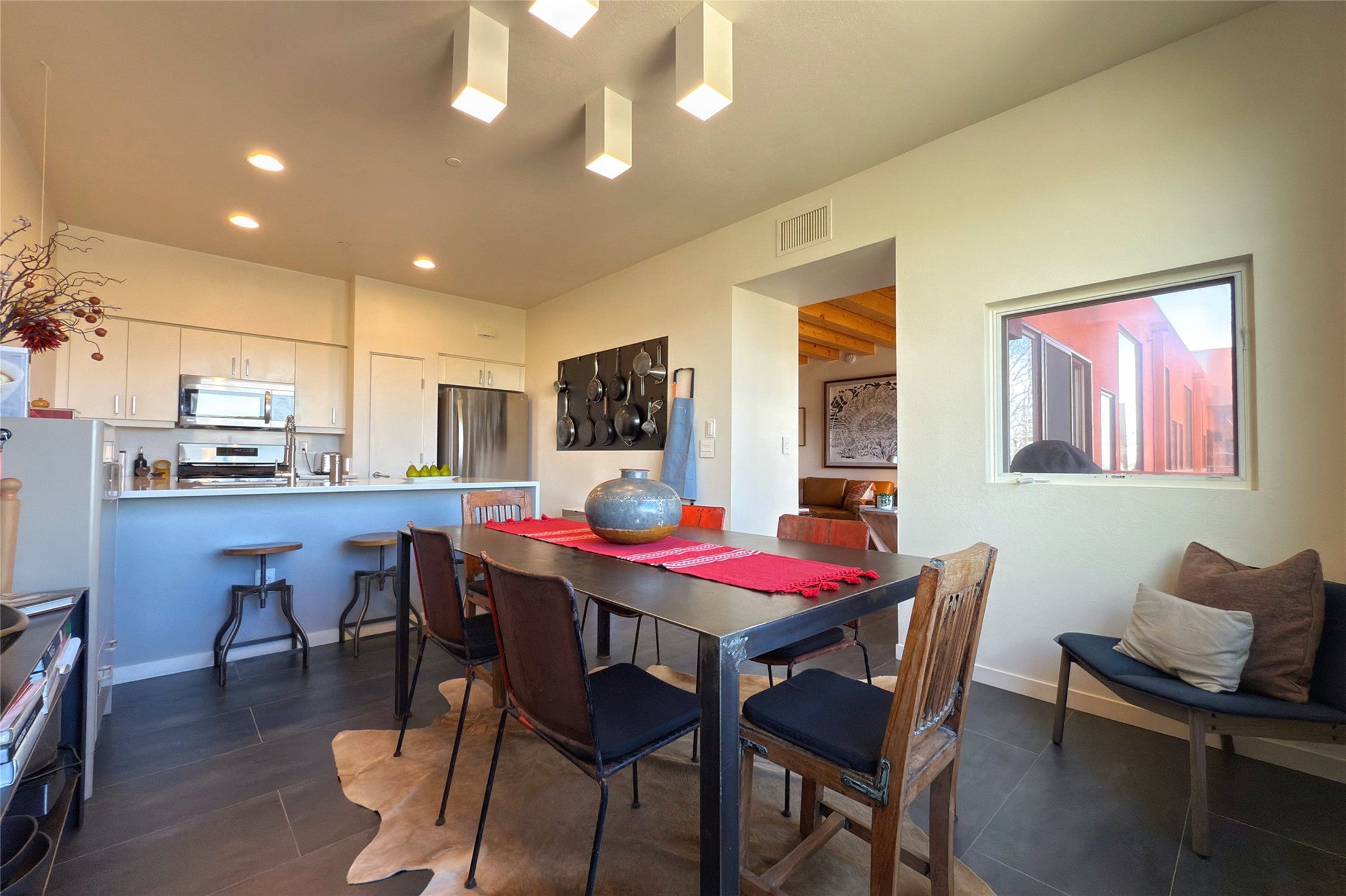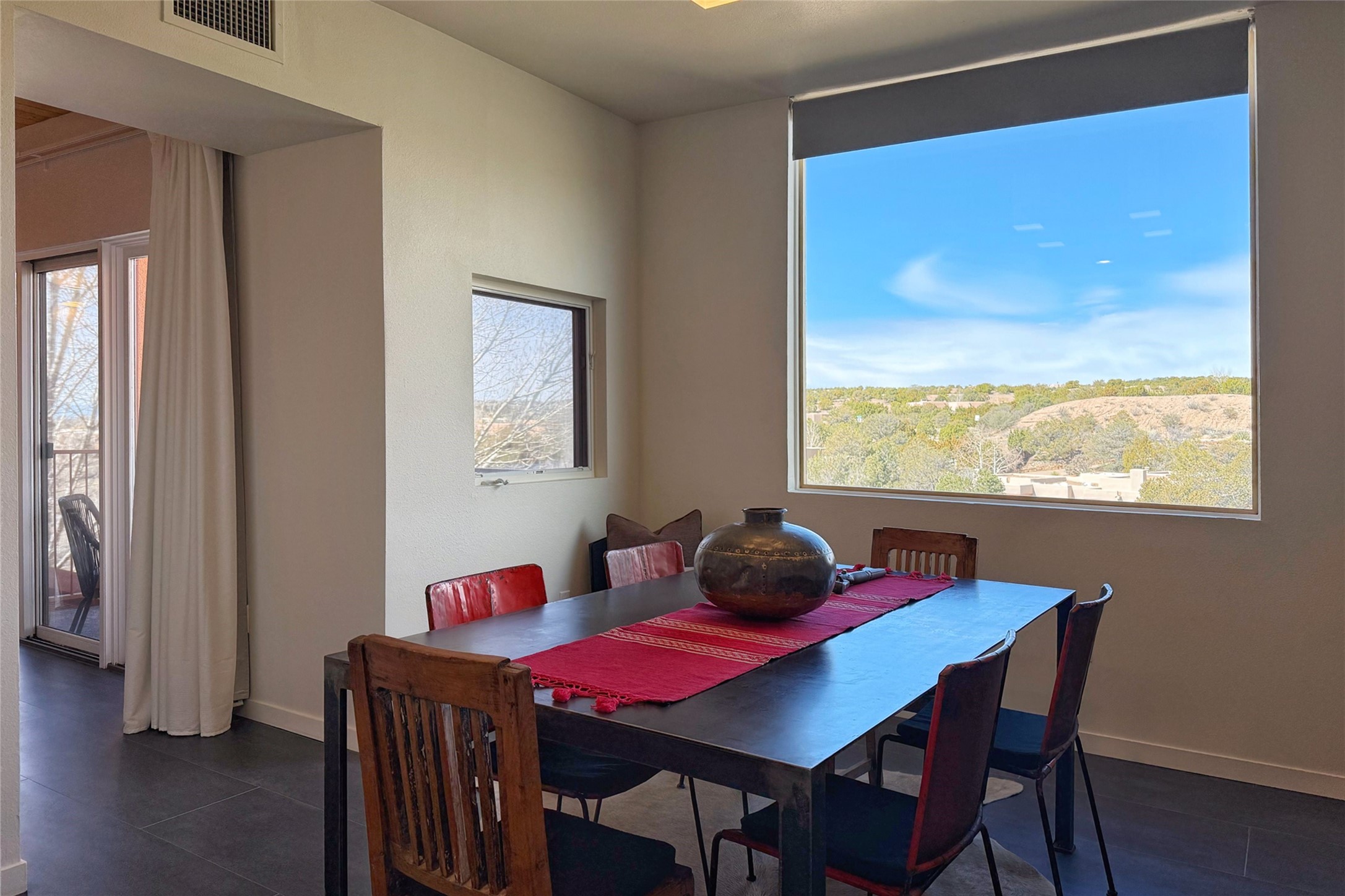 The nicest unit in Zocalo, spectacular views, superior patios, tastefully updated contemporary three bedroom, two bath condominium in Zocalo designed by award-winning architect Ricardo Legorreta. Light-filled, second-level home offers massive western views overlooking the natural arroyo and hillsides and eastern views that include Atalaya peak in the distance. New, giant picture windows do indeed make pictures of the surrounding classic Santa Fe colored landscape and skies so close you can almost touch! Updates include new insulated windows, remote controlled shades, new flooring and paint throughout, new stainless steel appliances and washer and dryer, updated kitchen with chef's appliances and bathrooms with solid surface counters, programmable lighting, Legrand switch and outlet covers, on-demand tankless hot water heater, new deck and refinished balcony. Community amenities include two fitness facilities, pool, hot tub, and clubhouse. Newly completed trail for walking and biking connects to the city trail system. Large garage with EV charger. Close to town yet far from the hustle and bustle, quiet and serene yet vibrant and alive! Check out the video and take the virtual tour!