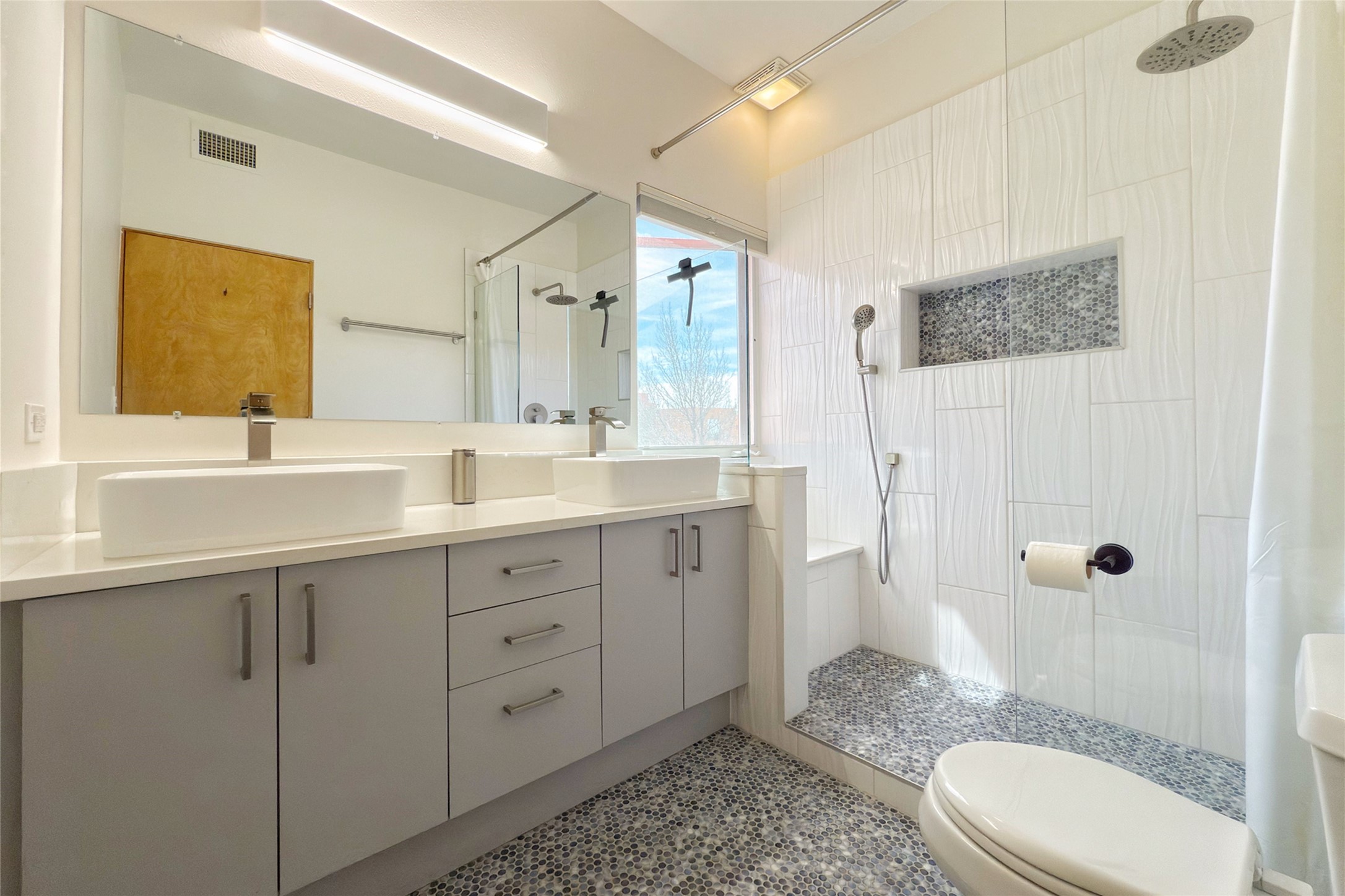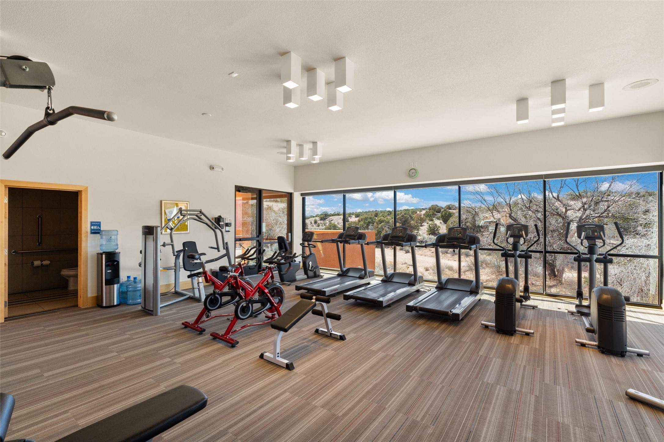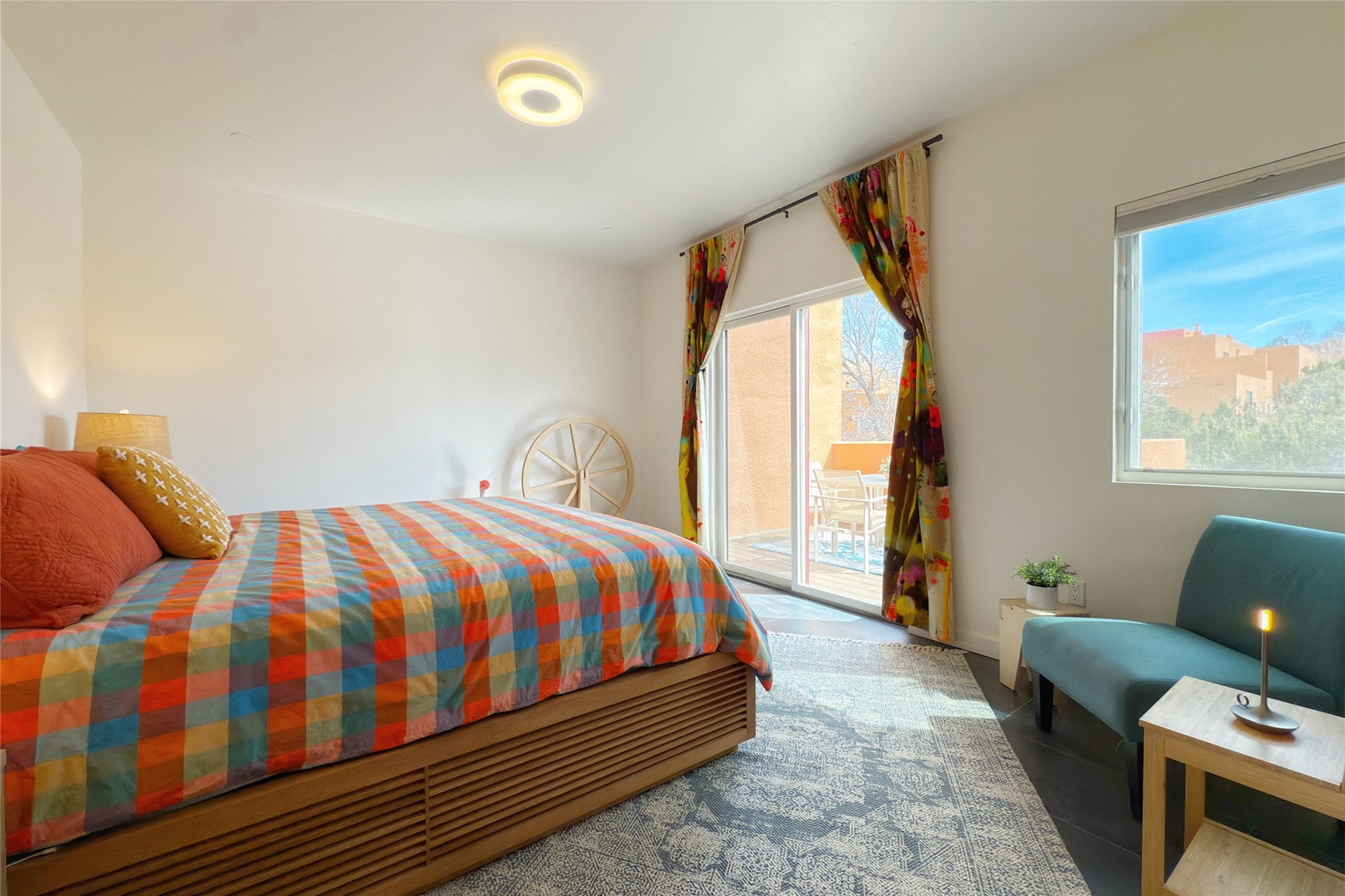 The nicest unit in Zocalo, spectacular views, superior patios, tastefully updated contemporary three bedroom, two bath condominium in Zocalo designed by award-winning architect Ricardo Legorreta. Light-filled, second-level home offers massive western views overlooking the natural arroyo and hillsides and eastern views that include Atalaya peak in the distance. New, giant picture windows do indeed make pictures of the surrounding classic Santa Fe colored landscape and skies so close you can almost touch! Updates include new insulated windows, remote controlled shades, new flooring and paint throughout, new stainless steel appliances and washer and dryer, updated kitchen with chef's appliances and bathrooms with solid surface counters, programmable lighting, Legrand switch and outlet covers, on-demand tankless hot water heater, new deck and refinished balcony. Community amenities include two fitness facilities, pool, hot tub, and clubhouse. Newly completed trail for walking and biking connects to the city trail system. Large garage with EV charger. Close to town yet far from the hustle and bustle, quiet and serene yet vibrant and alive! Check out the video and take the virtual tour!