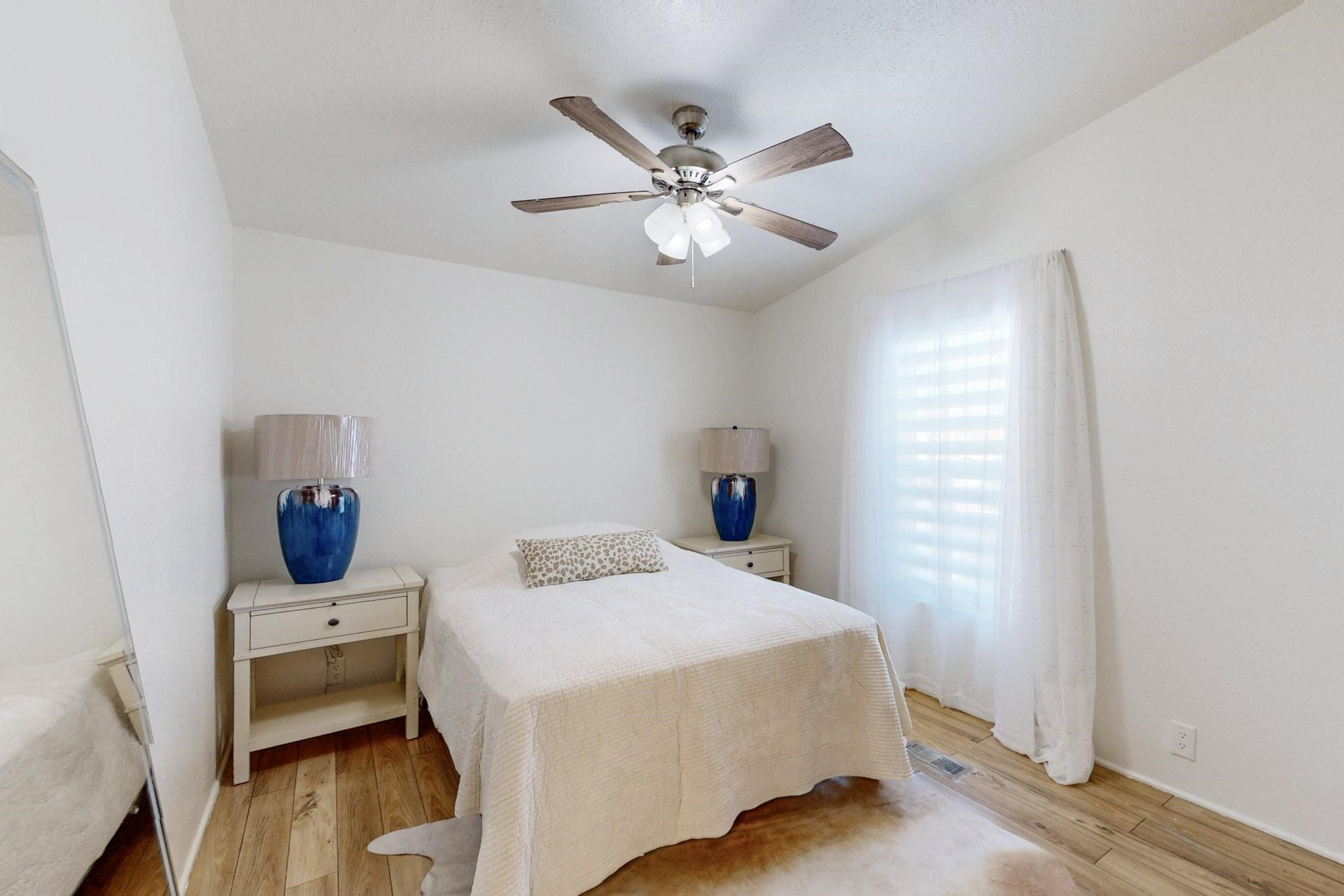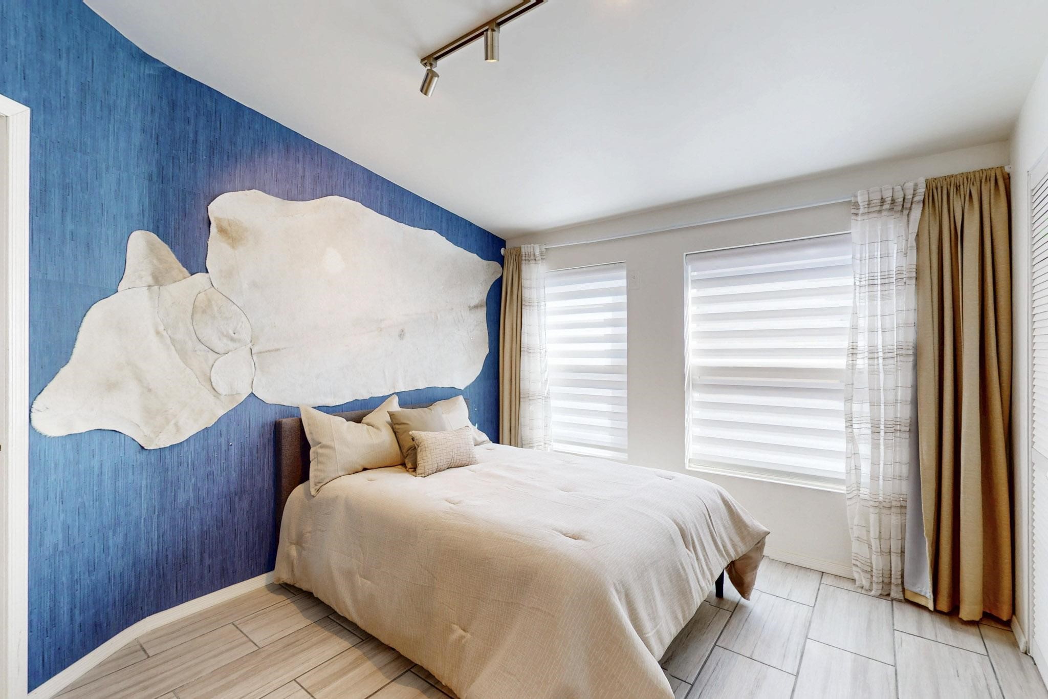 This beautiful single level contemporary style home exudes a modern flair and boasts an updated interior designed to cater to the needs of modern livng. The tasteful neutral color palette creates a warm & inviting atmosphere. Five bedrooms, each equipped with closets & built in cabinetry, offering ample storage and a clean, organized look. The primay bedroom with an adjoining bath features a huge walk-in closet with built in cabinetry. A fabulous kitchen featuring large countertop dining - perfect for casual meals and socializing. Designer cabinetry and upscale appliances including a Subzero refrigerator add to the appeal. The living area open to the kitchen features a stunning electric fireplace, providing both a cativating visual effect and ambiance. Just off this area is a versatile room - currently used as a media room but could be a formal dining room for family gatherings. Enjoy outdoor seating under a charming pergola, perfect for relaxing or entertaining guests. The gated driveway and side entrance offer privacy and security. Mini splits with solar panels providing low energy costs.