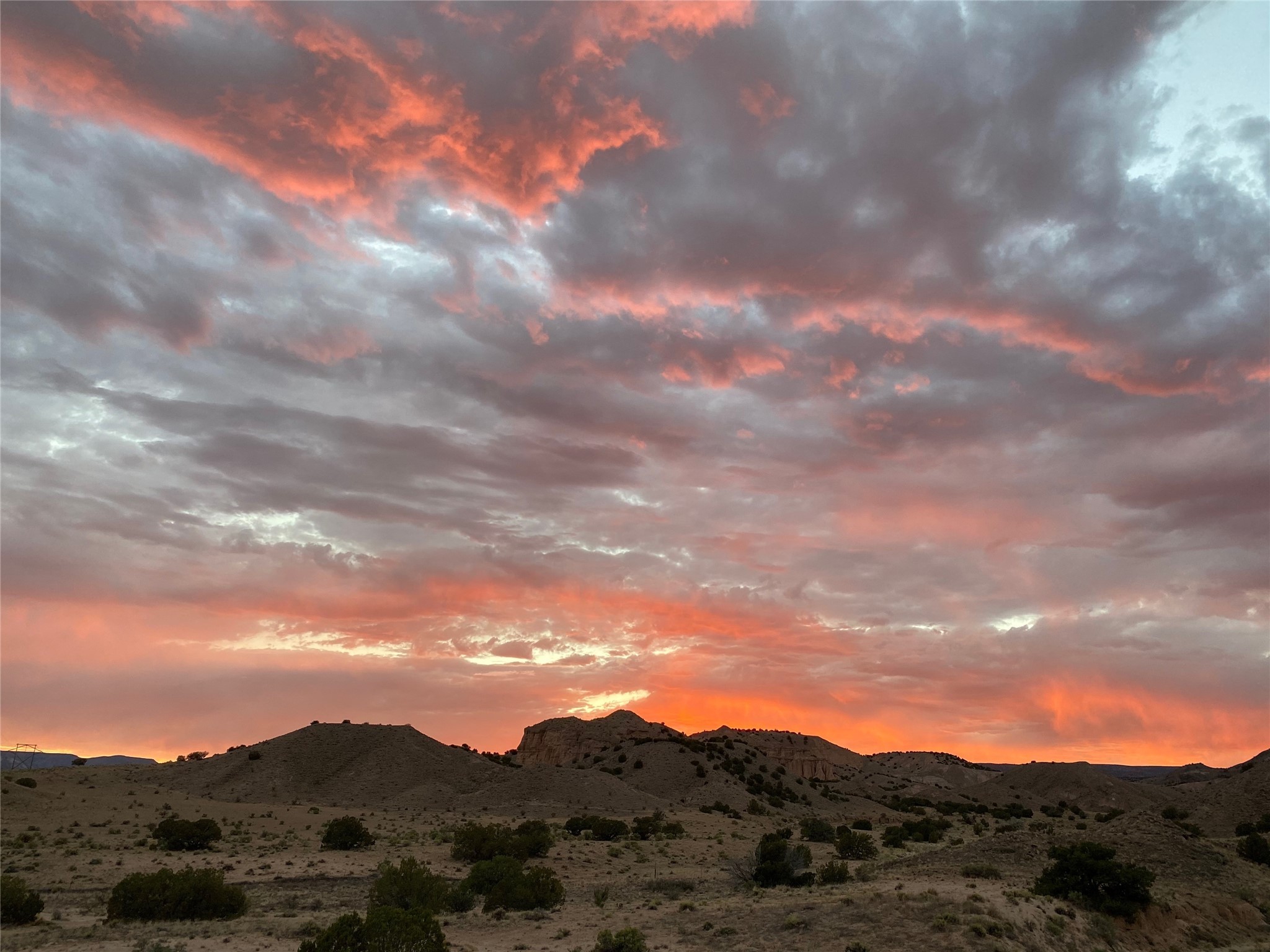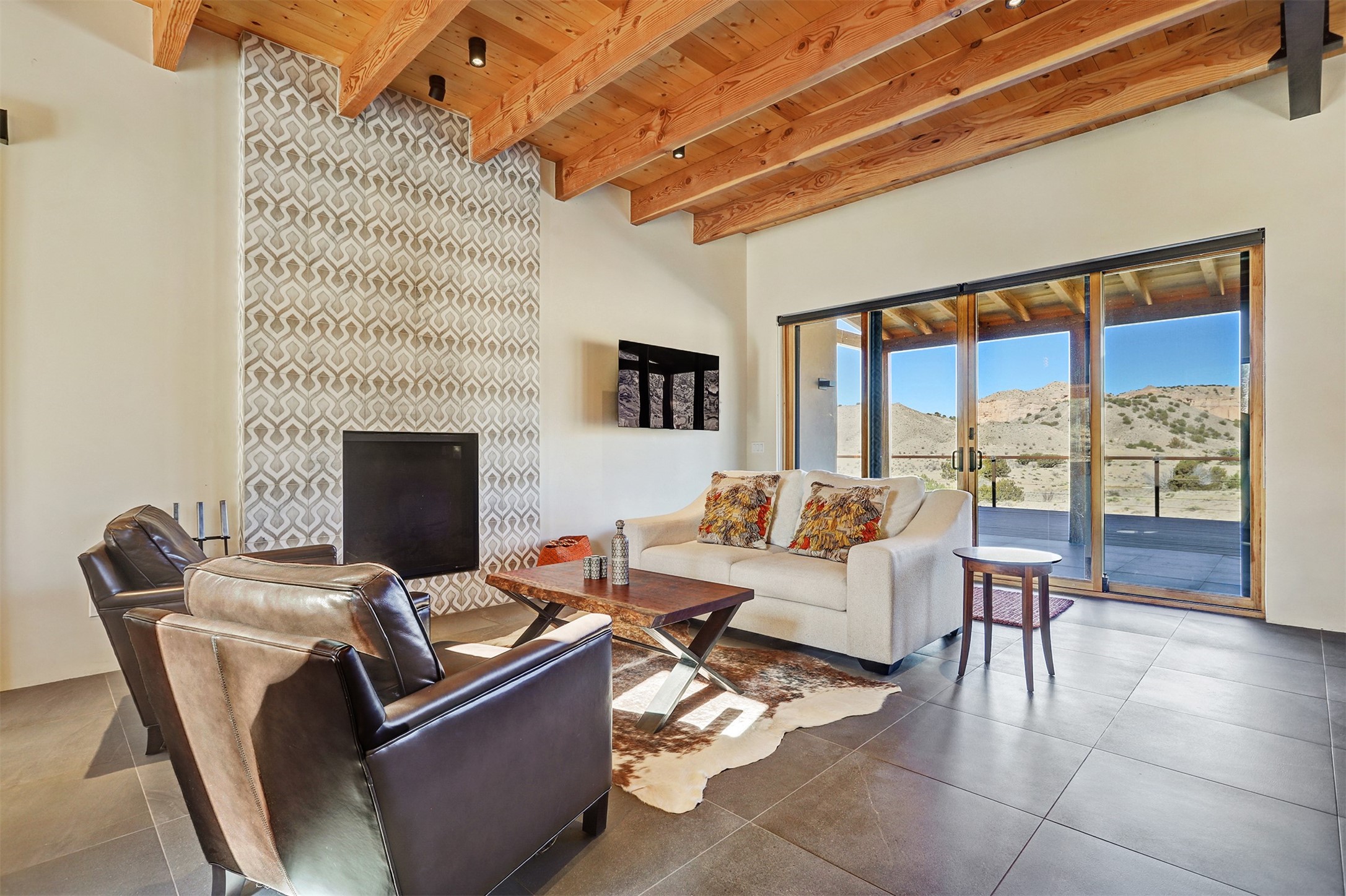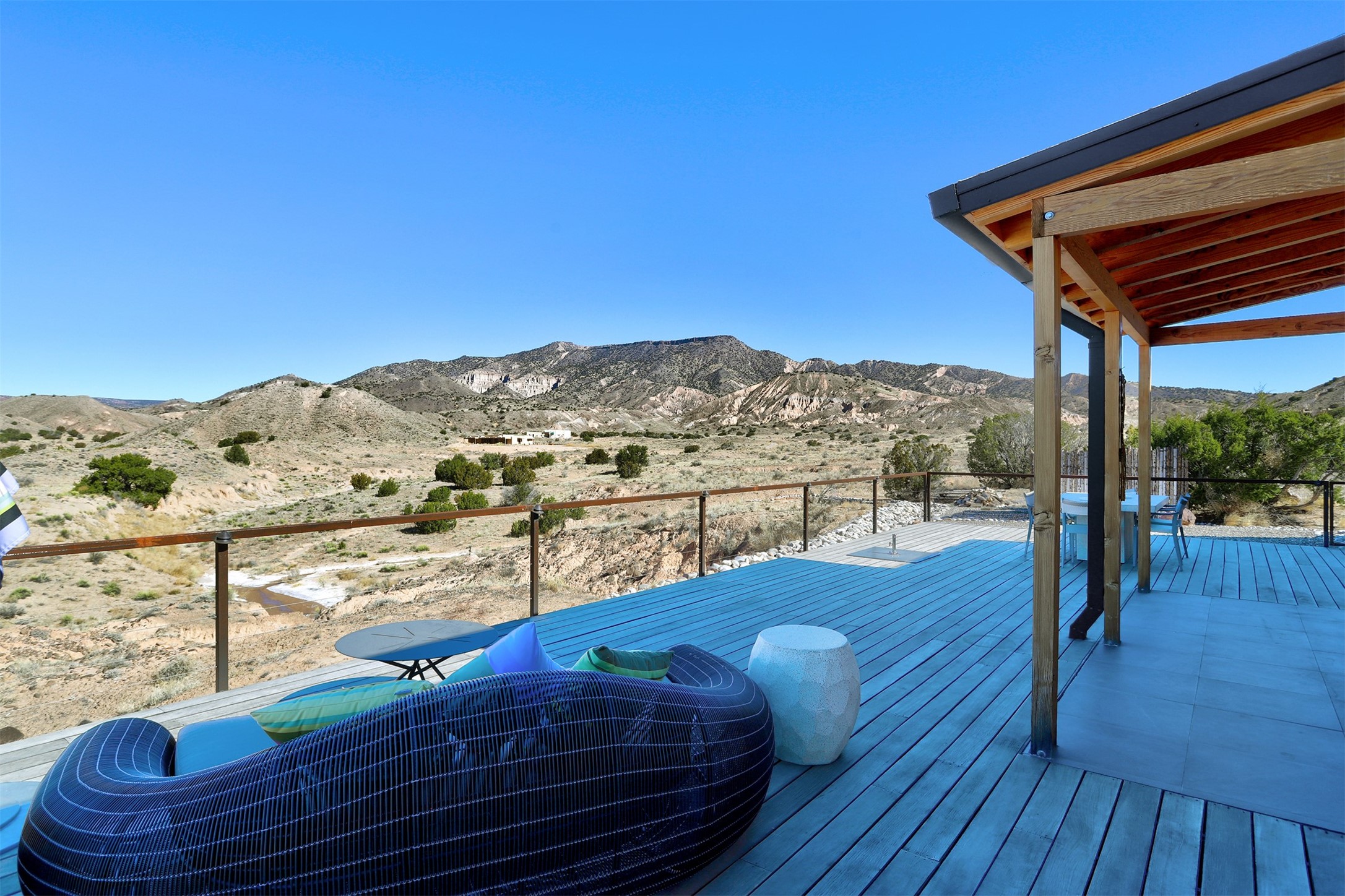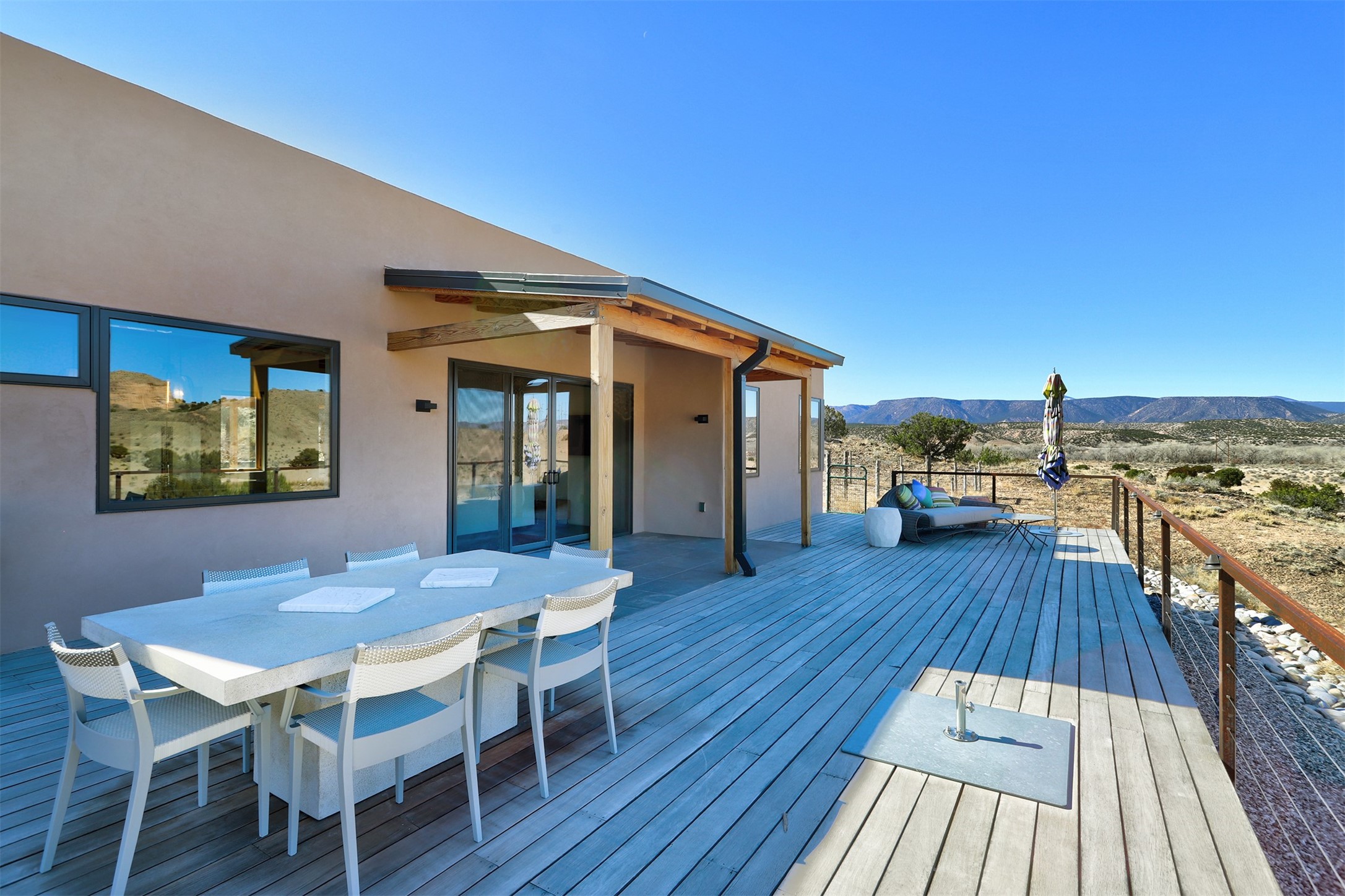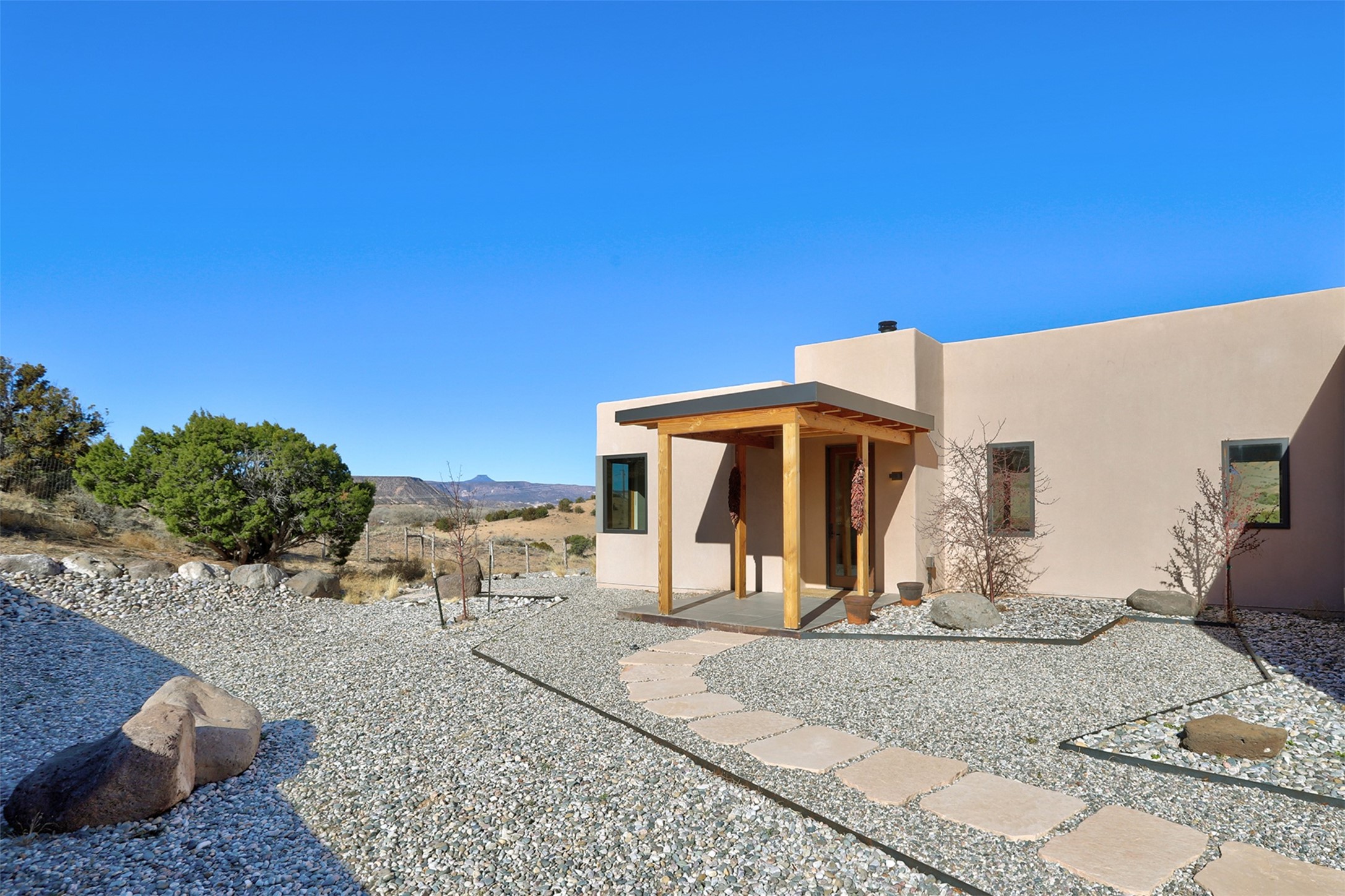 Rare new construction on nearly 8 acres with endless views and luxury finishes in a private Abiquiu community. This 1,620 sq. ft. home offers two bedrooms, two bathrooms and separate office, as well as chef's kitchen and generous great room. The Great Room is accented by a marble tiled high-efficiency wood burning fireplace. Luxury finishes and features throughout include marble kitchen counters, custom tile, designer lighting/flooring, high-end appliances. Architectural landscape design is sophisticated with near-zero maintenance. A 700 sq. ft. elevated deck provides ample entertainment space and unimpeded sunset, mountain, and valley views --including Pedernal!The property's location in gated la Canada de Abiquiu offers convenient distances to Santa Fe (45 min.), Ghost Ranch (20 min.),Bodes/Abiquiu Inn (7 min.), as well as gate security and a well-maintained community. High quality construction includes high efficiency wall/ceiling insulation, Low-E windows, high efficiency water heater, in-floor radiant heat, high efficiency evaporative cooler, a full-house reverse osmosis water system and full-size insulated two car garage.Adjacent 7.3 acre lot with electric transformer and water is available under separate contract. The additional lot would provide an additional building opportunity or privacy and unobstructed mountain views.