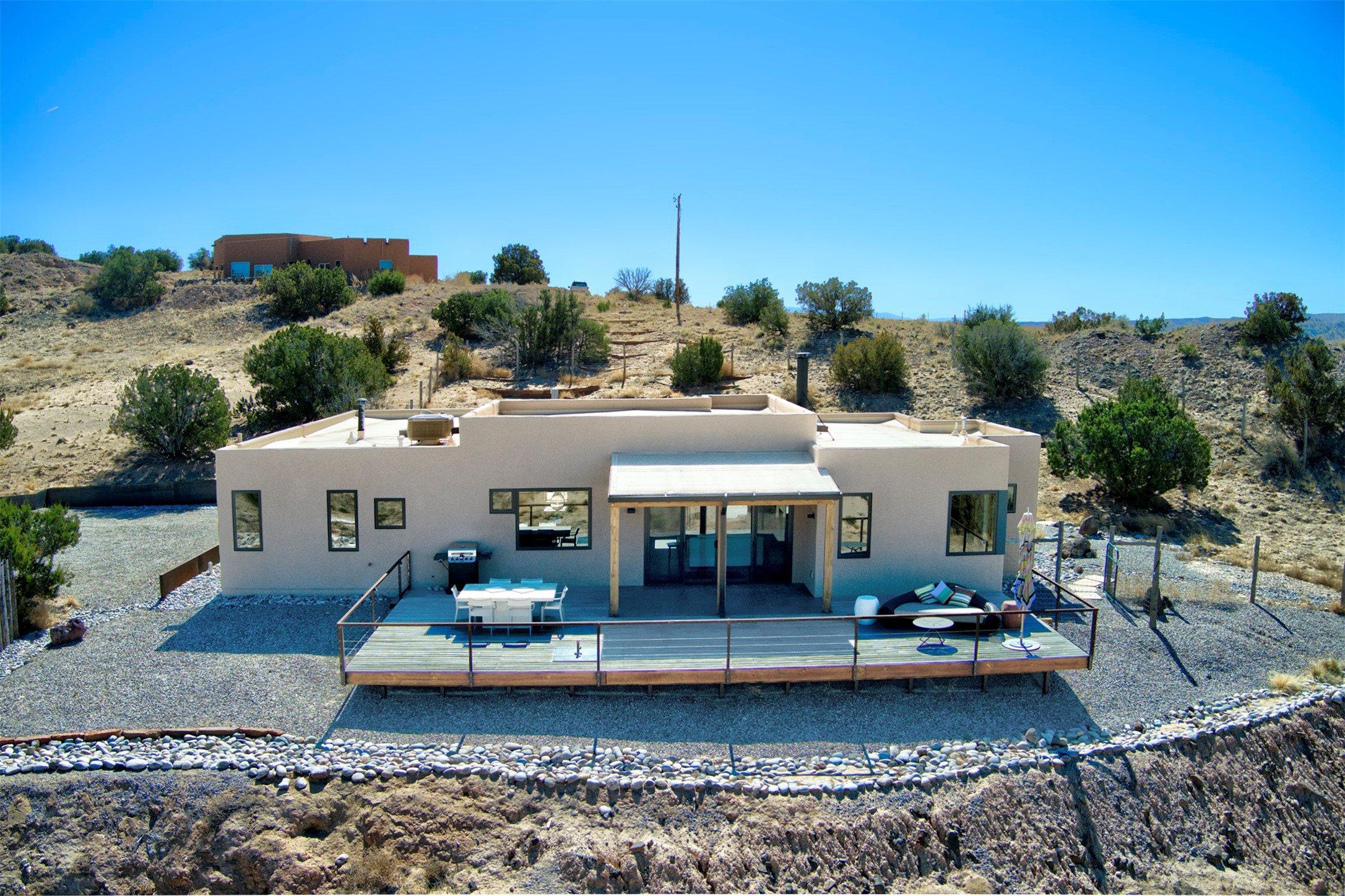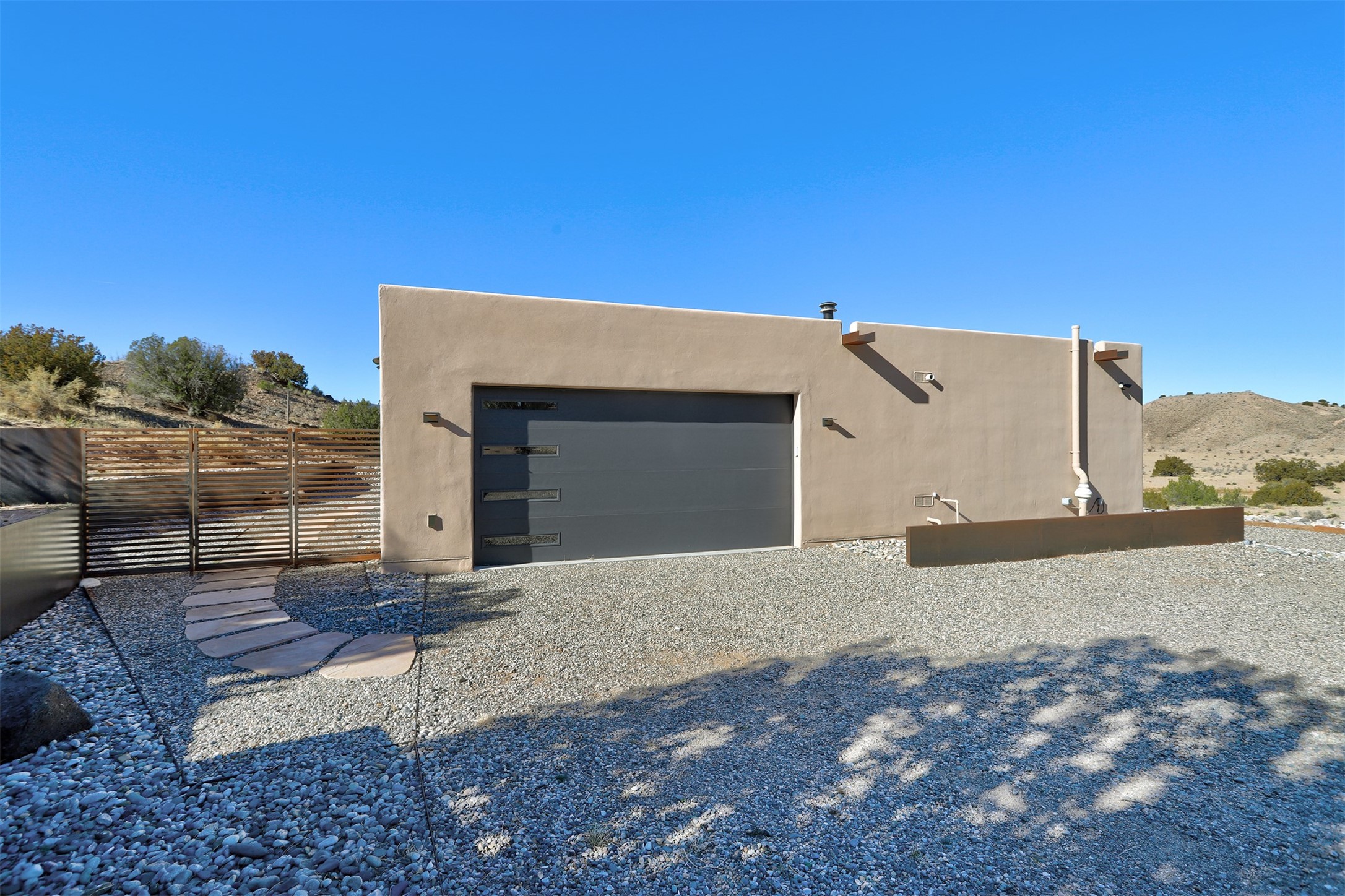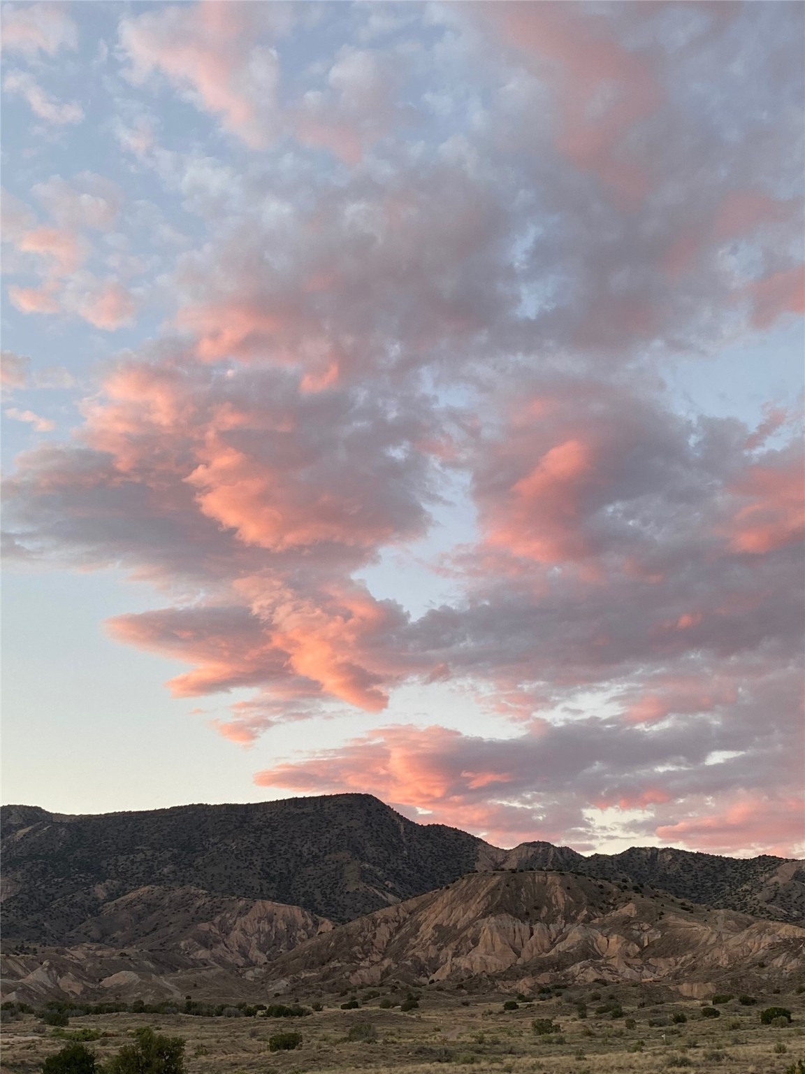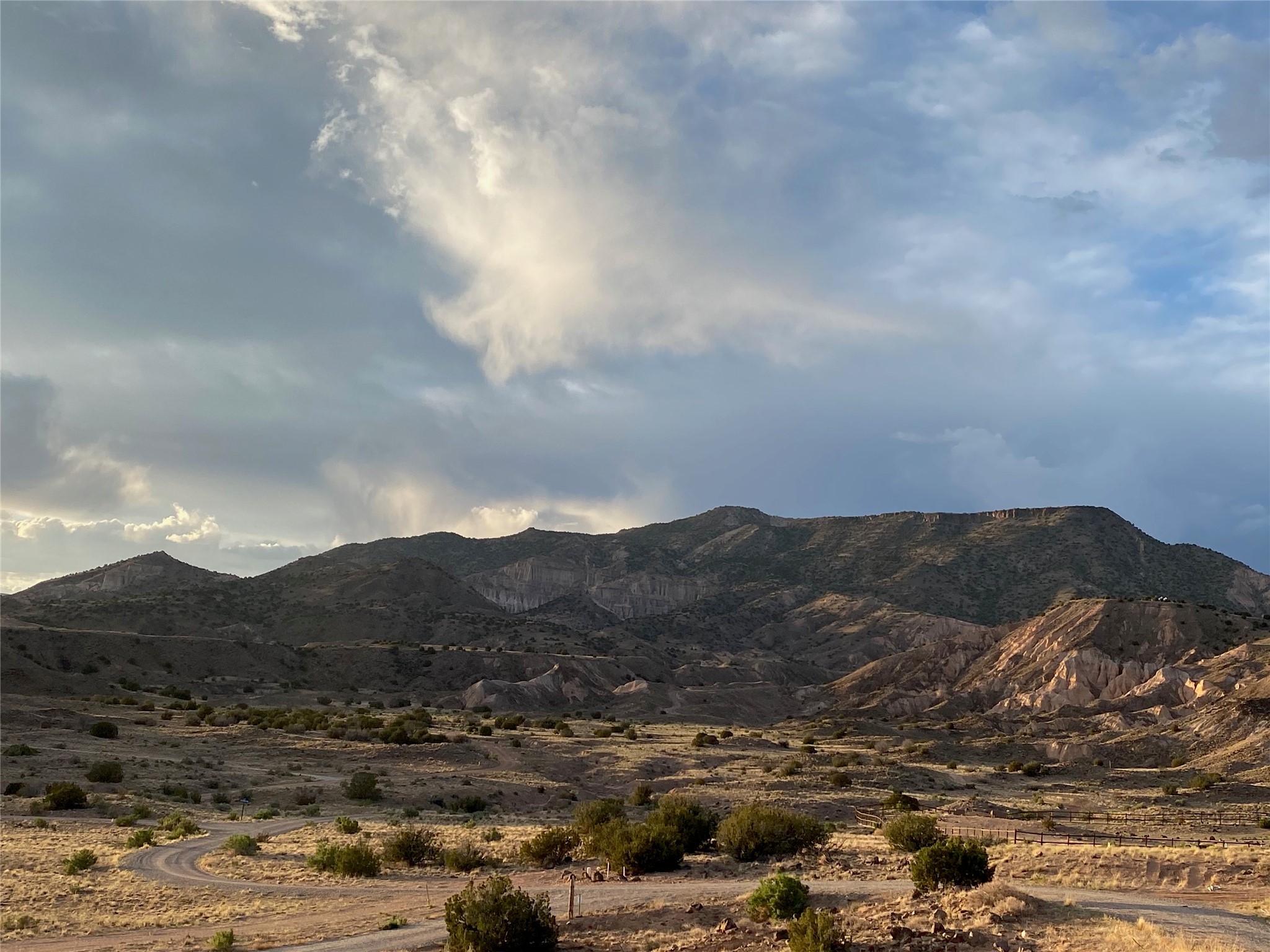 Rare new construction on nearly 8 acres with endless views and luxury finishes in a private Abiquiu community. This 1,620 sq. ft. home offers two bedrooms, two bathrooms and separate office, as well as chef's kitchen and generous great room. The Great Room is accented by a marble tiled high-efficiency wood burning fireplace. Luxury finishes and features throughout include marble kitchen counters, custom tile, designer lighting/flooring, high-end appliances. Architectural landscape design is sophisticated with near-zero maintenance. A 700 sq. ft. elevated deck provides ample entertainment space and unimpeded sunset, mountain, and valley views --including Pedernal!The property's location in gated la Canada de Abiquiu offers convenient distances to Santa Fe (45 min.), Ghost Ranch (20 min.),Bodes/Abiquiu Inn (7 min.), as well as gate security and a well-maintained community. High quality construction includes high efficiency wall/ceiling insulation, Low-E windows, high efficiency water heater, in-floor radiant heat, high efficiency evaporative cooler, a full-house reverse osmosis water system and full-size insulated two car garage.Adjacent 7.3 acre lot with electric transformer and water is available under separate contract. The additional lot would provide an additional building opportunity or privacy and unobstructed mountain views.