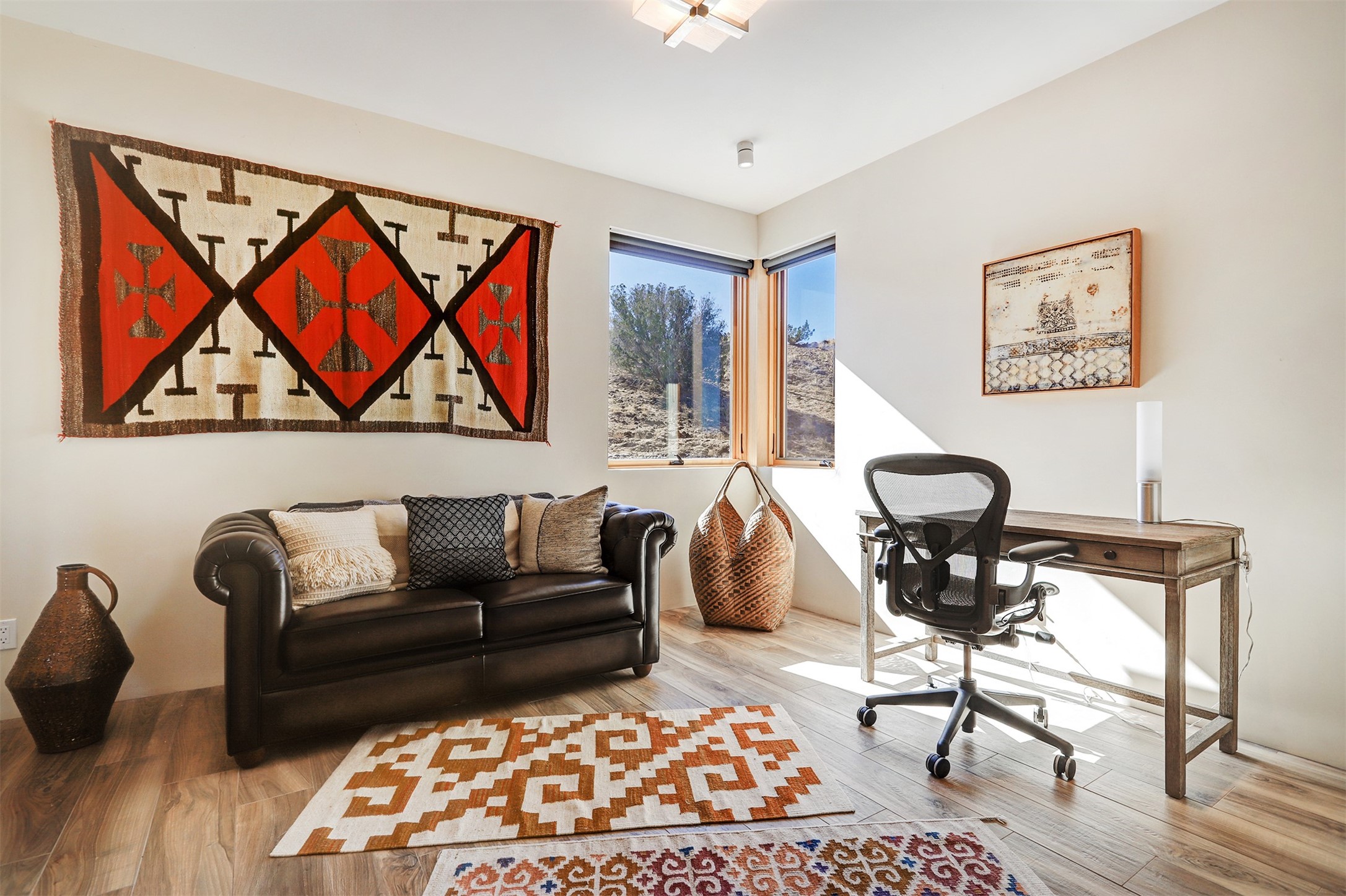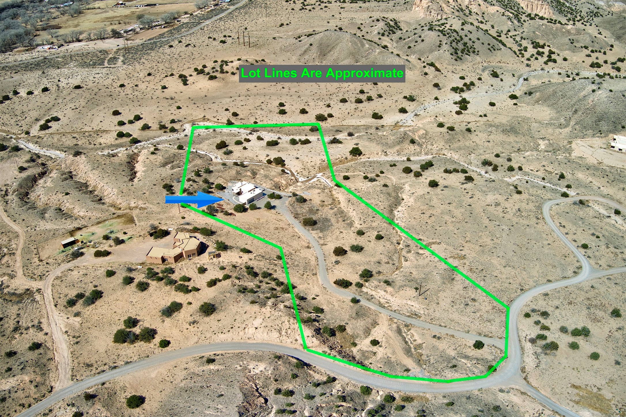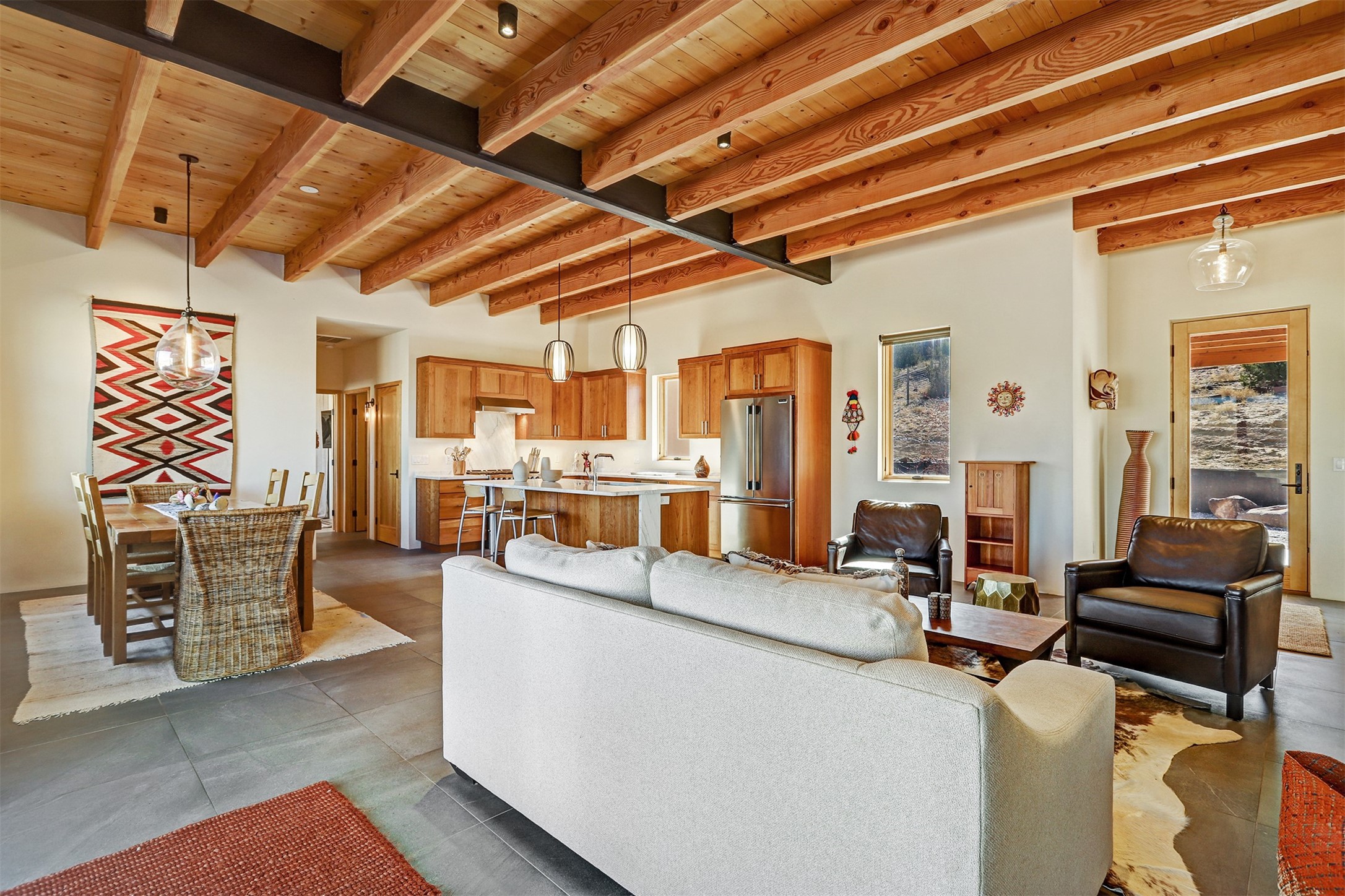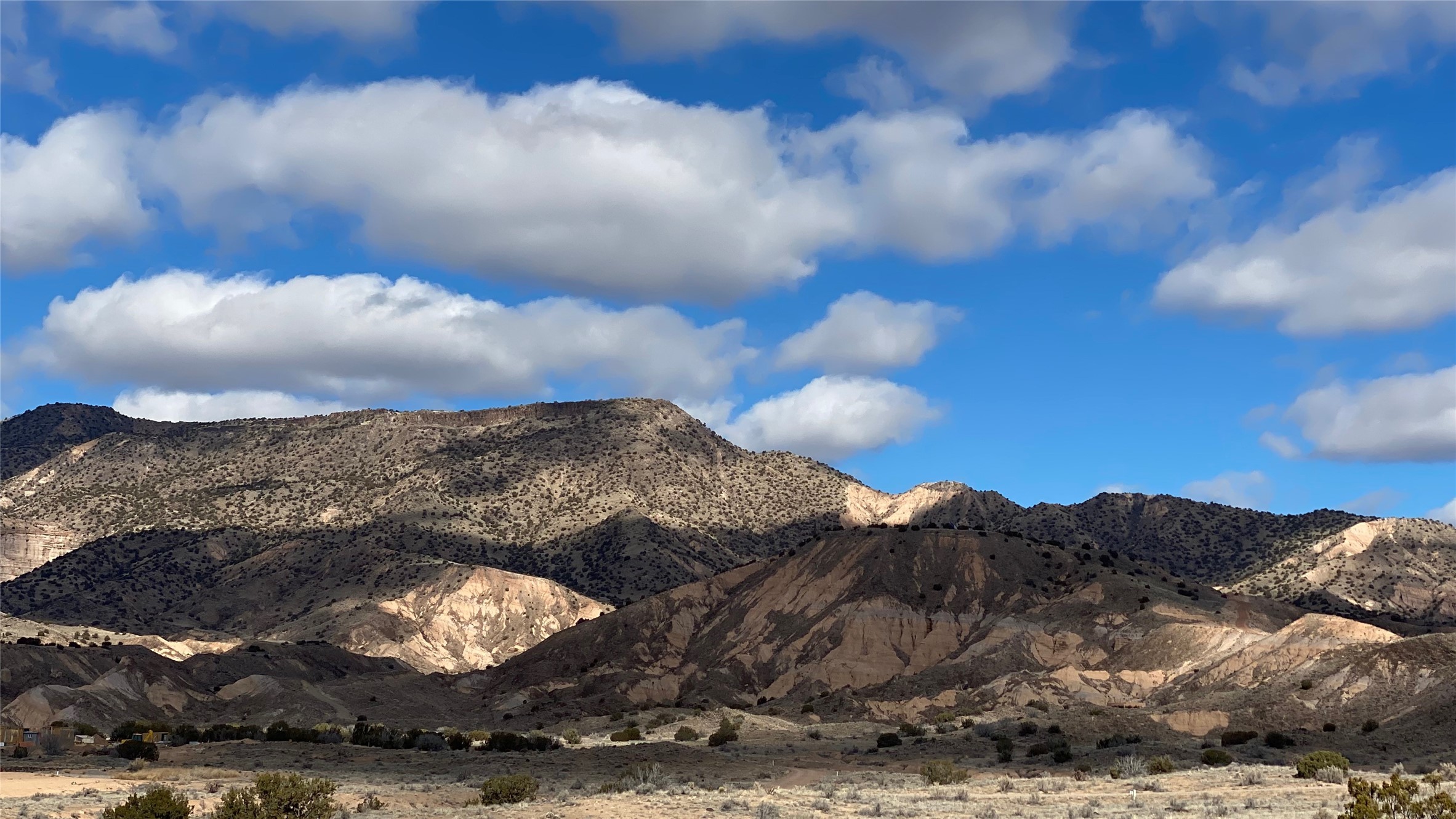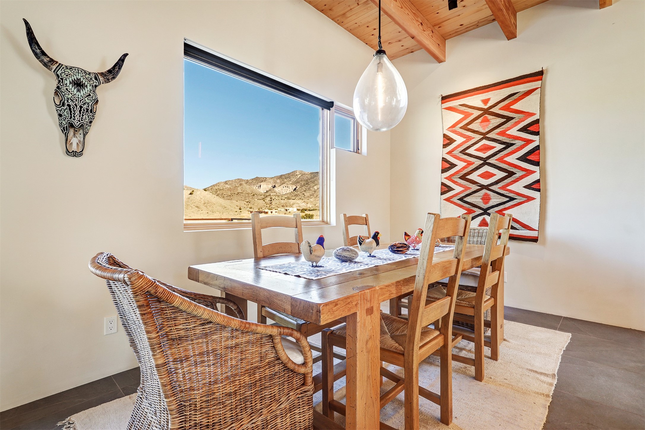 Rare new construction on nearly 8 acres with endless views and luxury finishes in a private Abiquiu community. This 1,620 sq. ft. home offers two bedrooms, two bathrooms and separate office, as well as chef's kitchen and generous great room. The Great Room is accented by a marble tiled high-efficiency wood burning fireplace. Luxury finishes and features throughout include marble kitchen counters, custom tile, designer lighting/flooring, high-end appliances. Architectural landscape design is sophisticated with near-zero maintenance. A 700 sq. ft. elevated deck provides ample entertainment space and unimpeded sunset, mountain, and valley views --including Pedernal!The property's location in gated la Canada de Abiquiu offers convenient distances to Santa Fe (45 min.), Ghost Ranch (20 min.),Bodes/Abiquiu Inn (7 min.), as well as gate security and a well-maintained community. High quality construction includes high efficiency wall/ceiling insulation, Low-E windows, high efficiency water heater, in-floor radiant heat, high efficiency evaporative cooler, a full-house reverse osmosis water system and full-size insulated two car garage.Adjacent 7.3 acre lot with electric transformer and water is available under separate contract. The additional lot would provide an additional building opportunity or privacy and unobstructed mountain views.