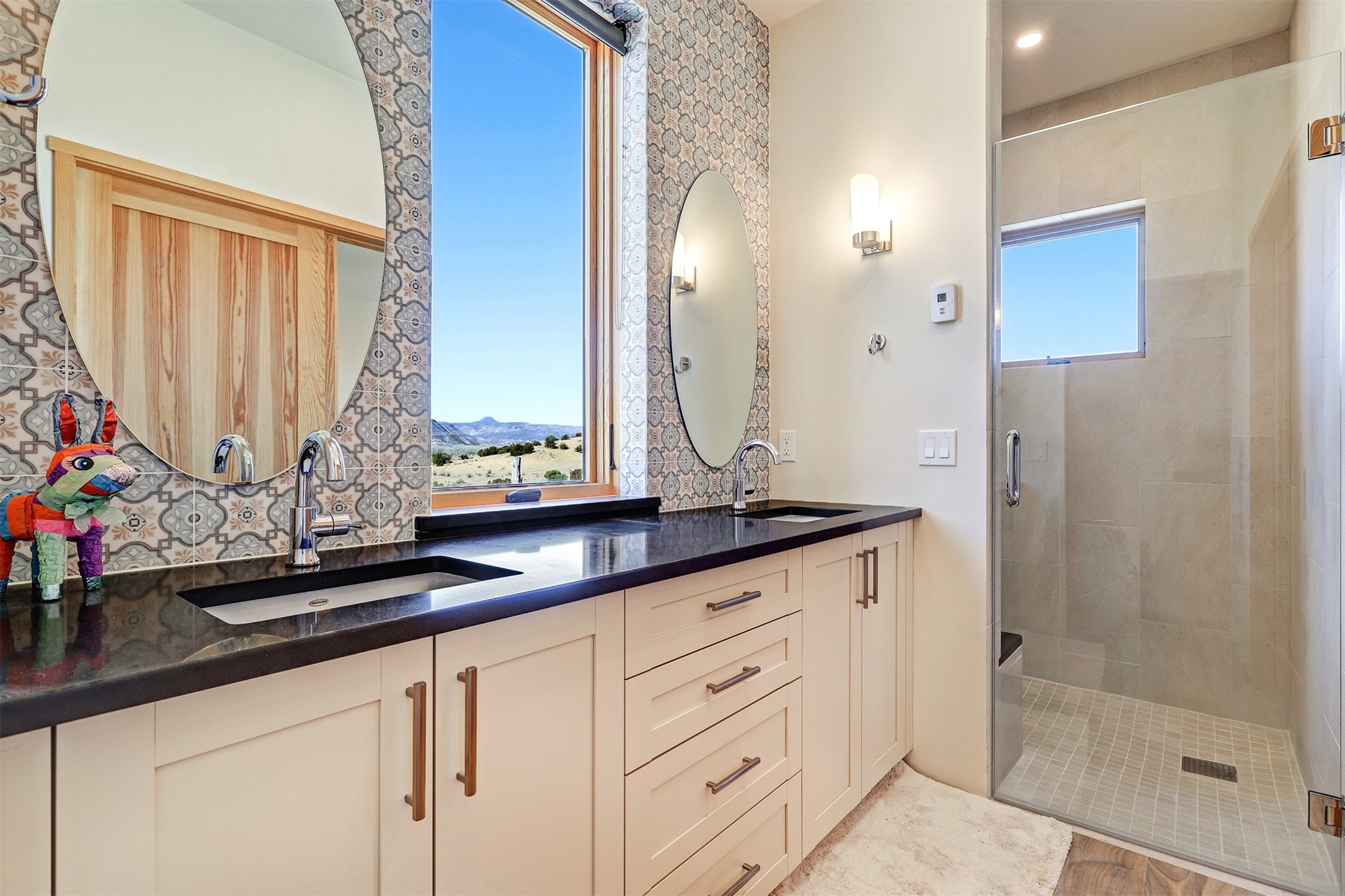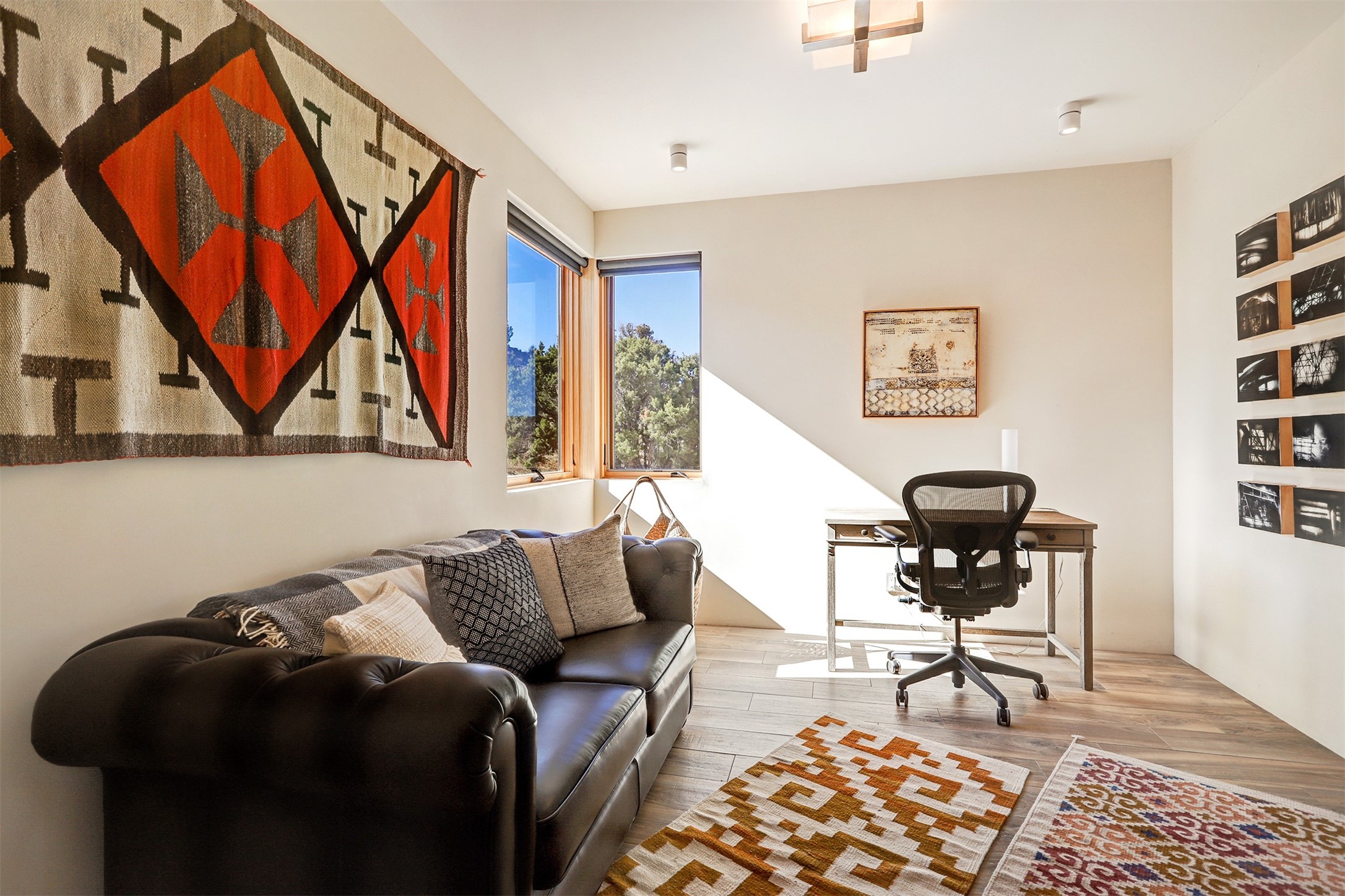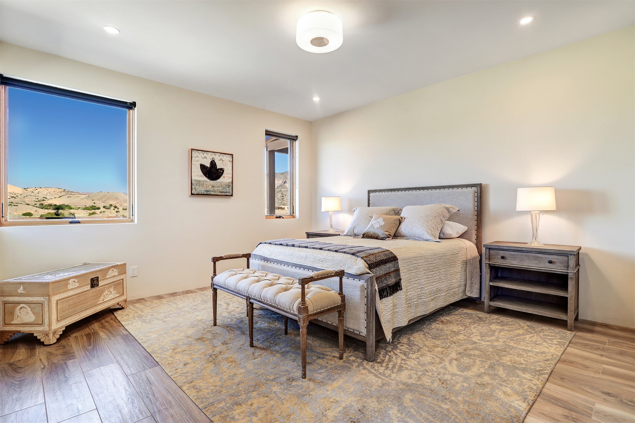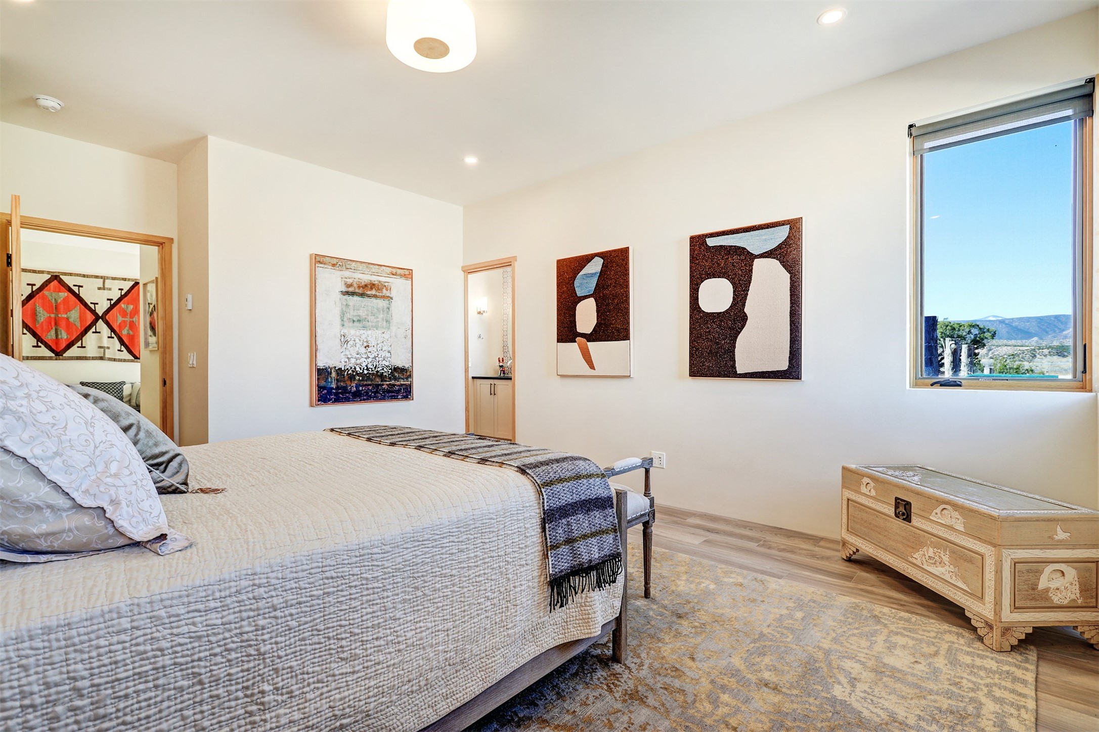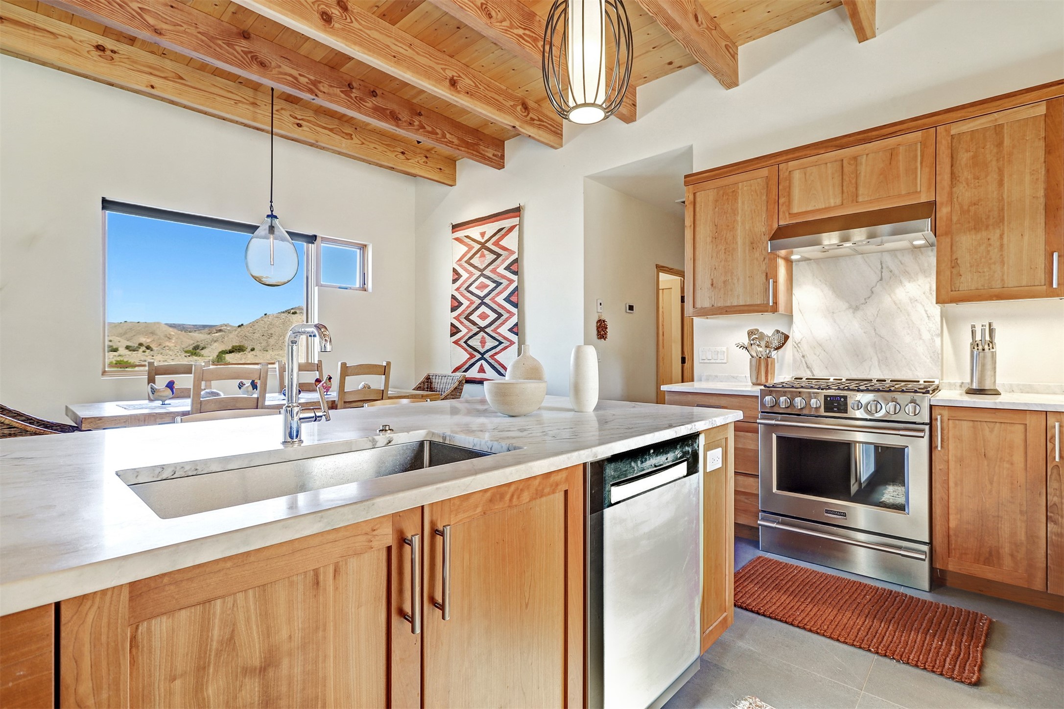 Rare new construction on nearly 8 acres with endless views and luxury finishes in a private Abiquiu community. This 1,620 sq. ft. home offers two bedrooms, two bathrooms and separate office, as well as chef's kitchen and generous great room. The Great Room is accented by a marble tiled high-efficiency wood burning fireplace. Luxury finishes and features throughout include marble kitchen counters, custom tile, designer lighting/flooring, high-end appliances. Architectural landscape design is sophisticated with near-zero maintenance. A 700 sq. ft. elevated deck provides ample entertainment space and unimpeded sunset, mountain, and valley views --including Pedernal!The property's location in gated la Canada de Abiquiu offers convenient distances to Santa Fe (45 min.), Ghost Ranch (20 min.),Bodes/Abiquiu Inn (7 min.), as well as gate security and a well-maintained community. High quality construction includes high efficiency wall/ceiling insulation, Low-E windows, high efficiency water heater, in-floor radiant heat, high efficiency evaporative cooler, a full-house reverse osmosis water system and full-size insulated two car garage.Adjacent 7.3 acre lot with electric transformer and water is available under separate contract. The additional lot would provide an additional building opportunity or privacy and unobstructed mountain views.