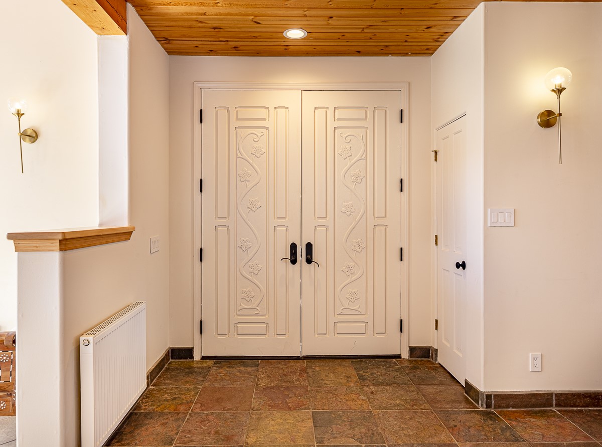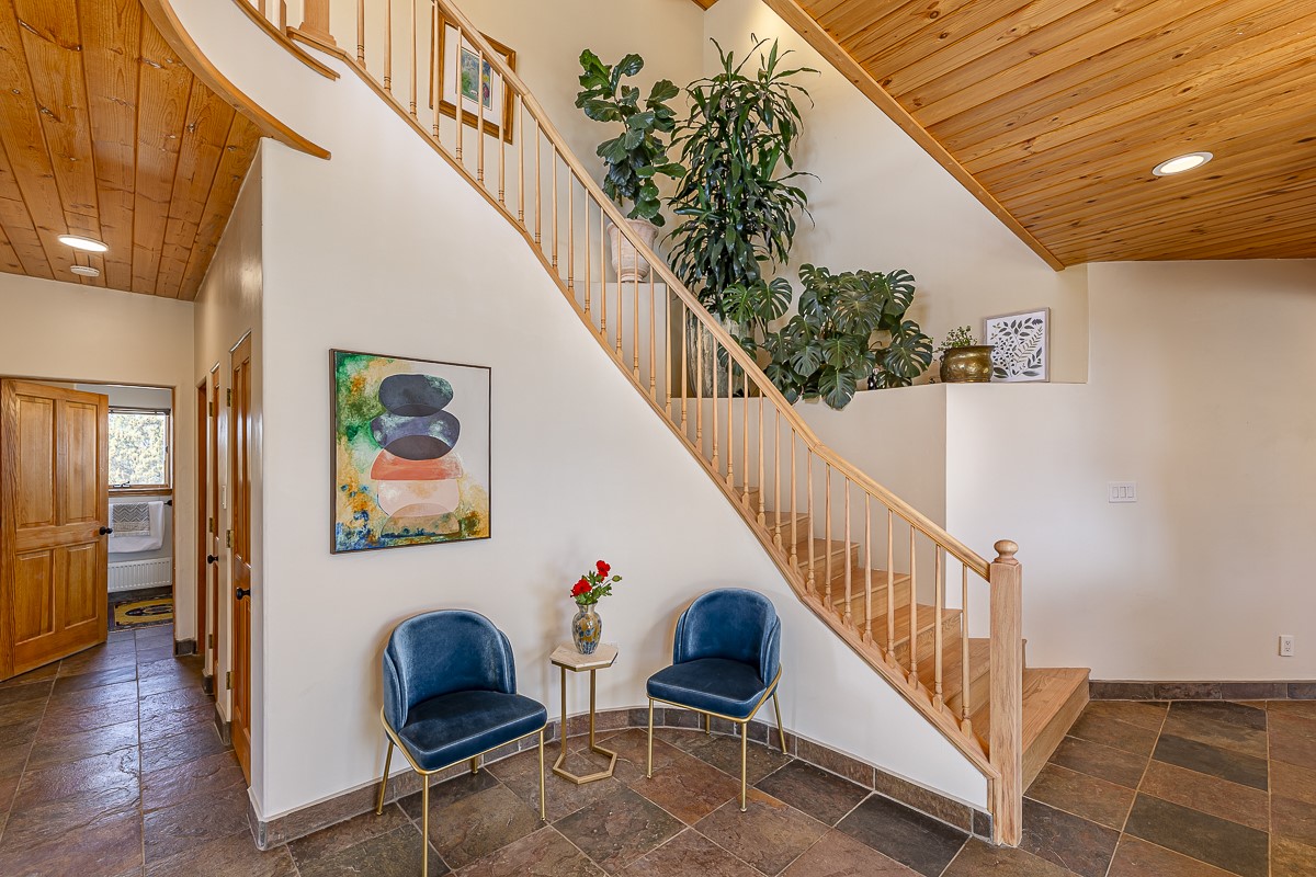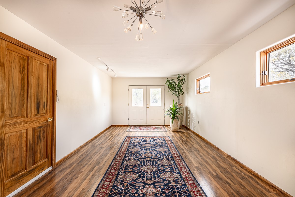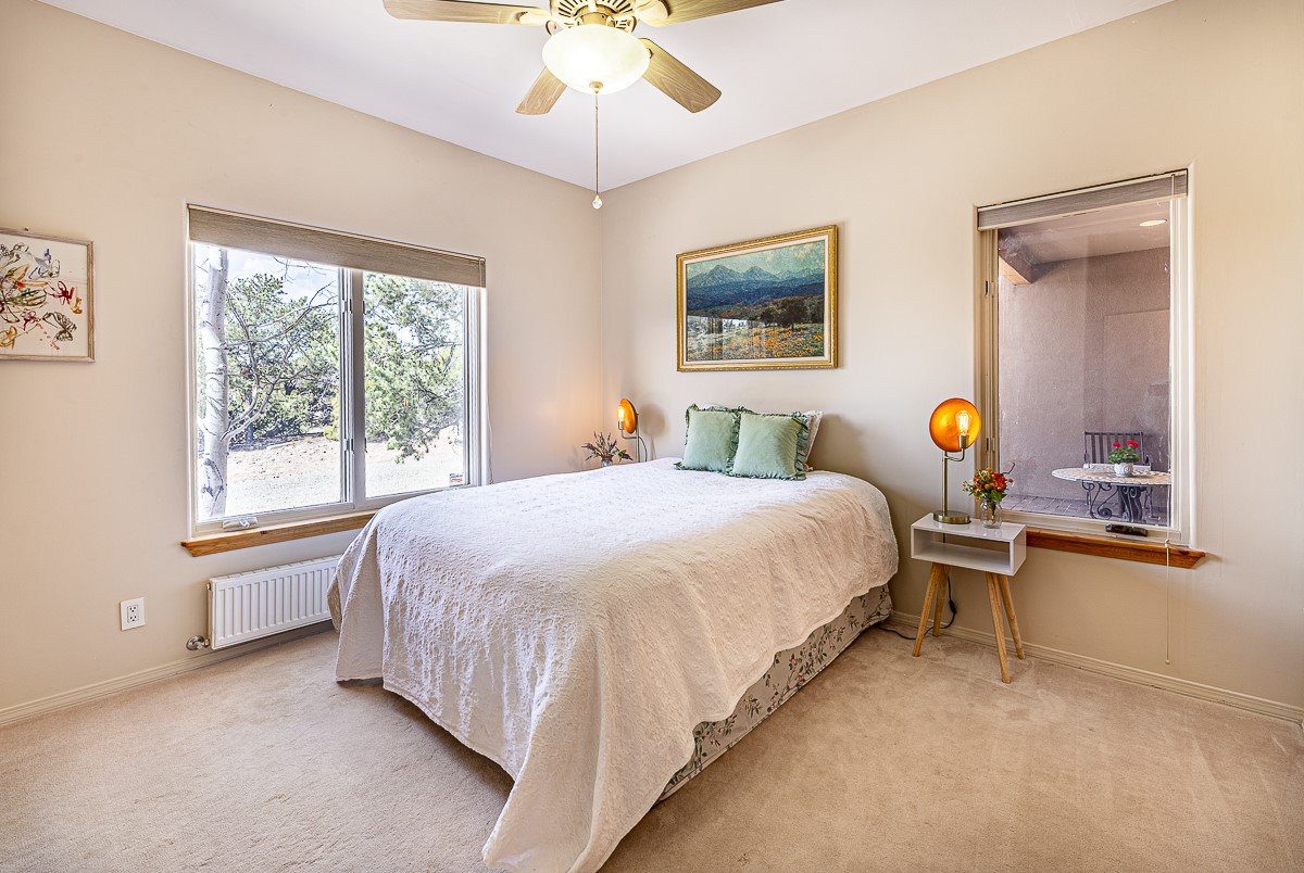 Welcome to the tranquil community of La Mariposa - at a great price! This light filled home has been extensively updated with beautiful, new hardwood floors, new lighting, a hot water on demand water heater, and hot water baseboard heat to the studio. The primary bedroom suite offers a private patio with stunning views of the Sangre de Cristo Mountains. With outdoor patios throughout, this home offers lots of privacy and serenity. The open concept kitchen is quite spacious for gatherings, with a large pantry and intimate seating areas. The back portal, located off of the dining room, is perfect for outdoor dining during the warm weather, with a water fountain nearby. The mature gardens surrounding the home are breathtaking in bloom and include mature apple, peach, cherry, and pear trees. There is also a greywater system for the landscaping. The heated studio is privately located off the garage with its own exterior entrances. There are no steps from the studio and throughout the first floor of the house. This home has lots to offer!