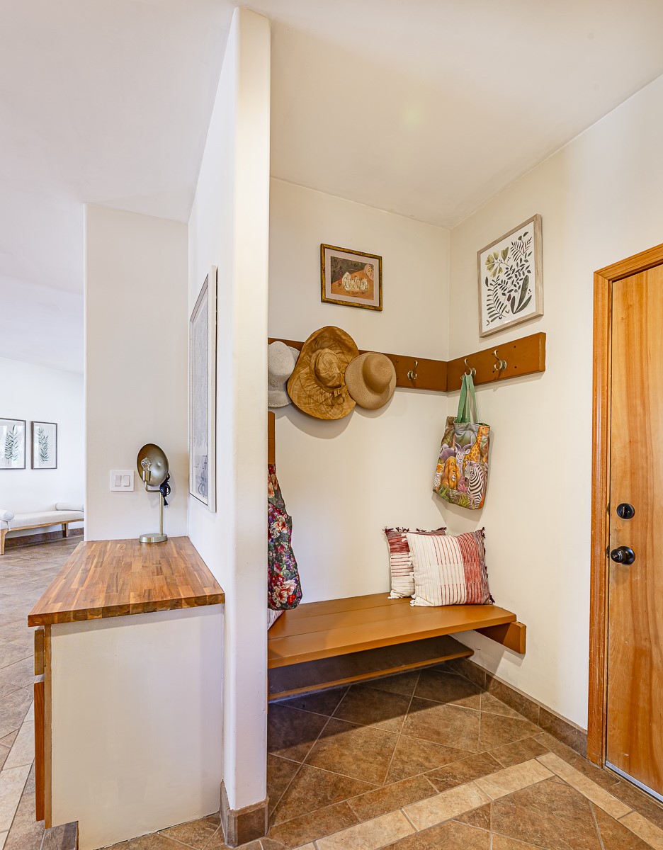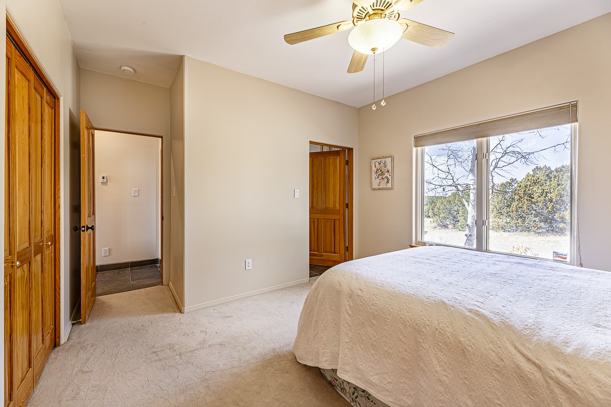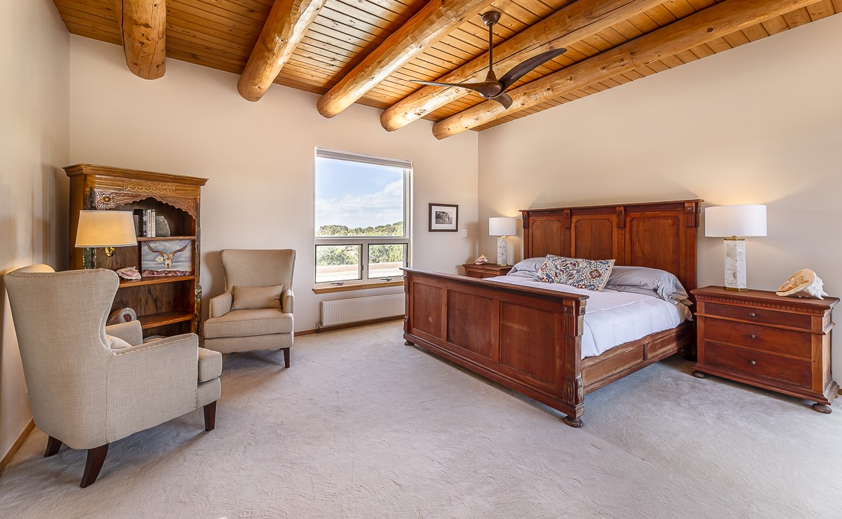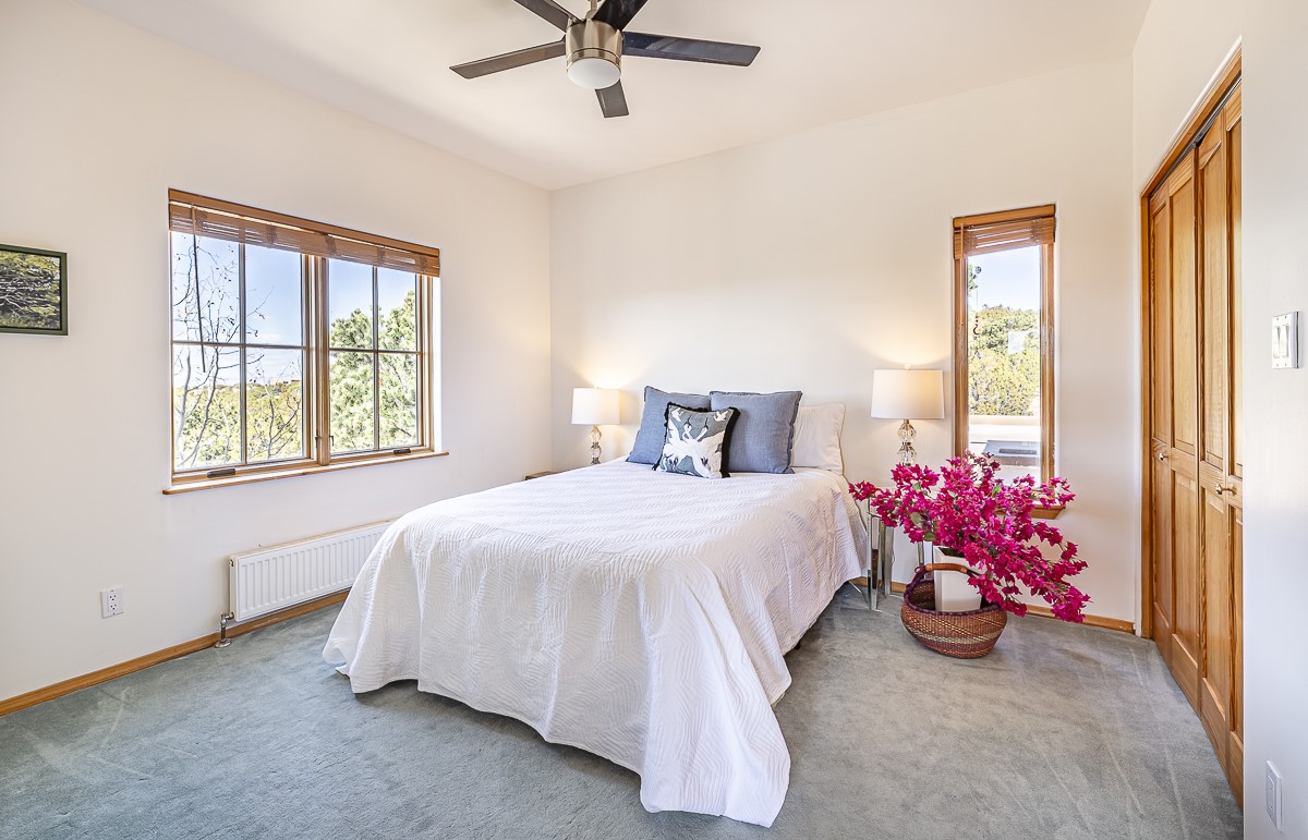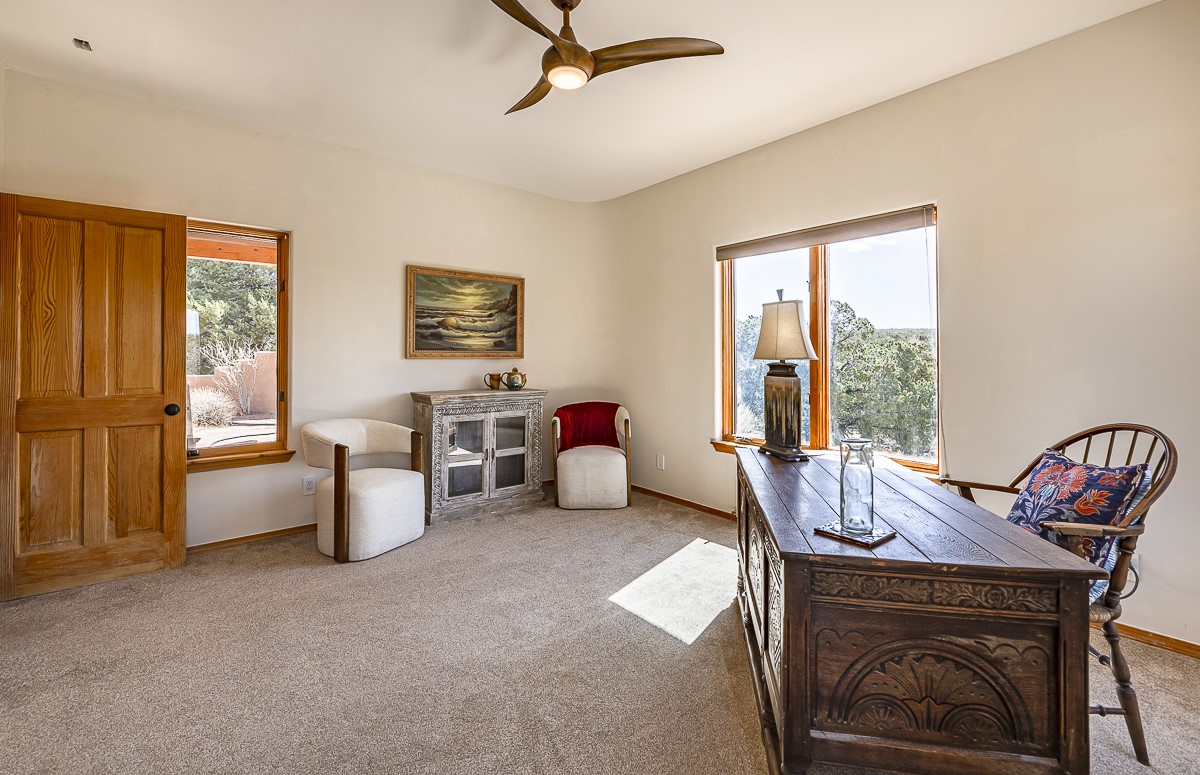 Welcome to the tranquil community of La Mariposa - at a great price! This light filled home has been extensively updated with beautiful, new hardwood floors, new lighting, a hot water on demand water heater, and hot water baseboard heat to the studio. The primary bedroom suite offers a private patio with stunning views of the Sangre de Cristo Mountains. With outdoor patios throughout, this home offers lots of privacy and serenity. The open concept kitchen is quite spacious for gatherings, with a large pantry and intimate seating areas. The back portal, located off of the dining room, is perfect for outdoor dining during the warm weather, with a water fountain nearby. The mature gardens surrounding the home are breathtaking in bloom and include mature apple, peach, cherry, and pear trees. There is also a greywater system for the landscaping. The heated studio is privately located off the garage with its own exterior entrances. There are no steps from the studio and throughout the first floor of the house. This home has lots to offer!