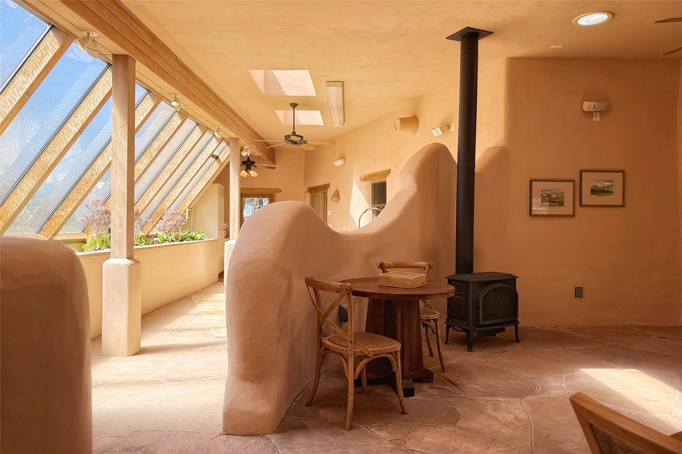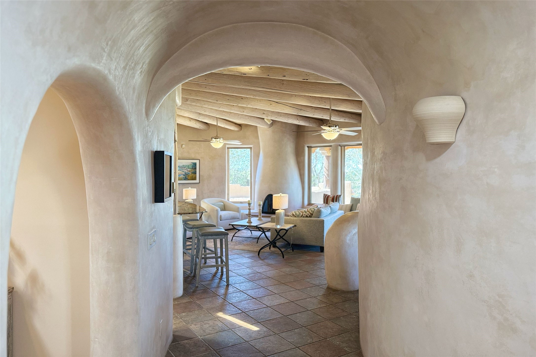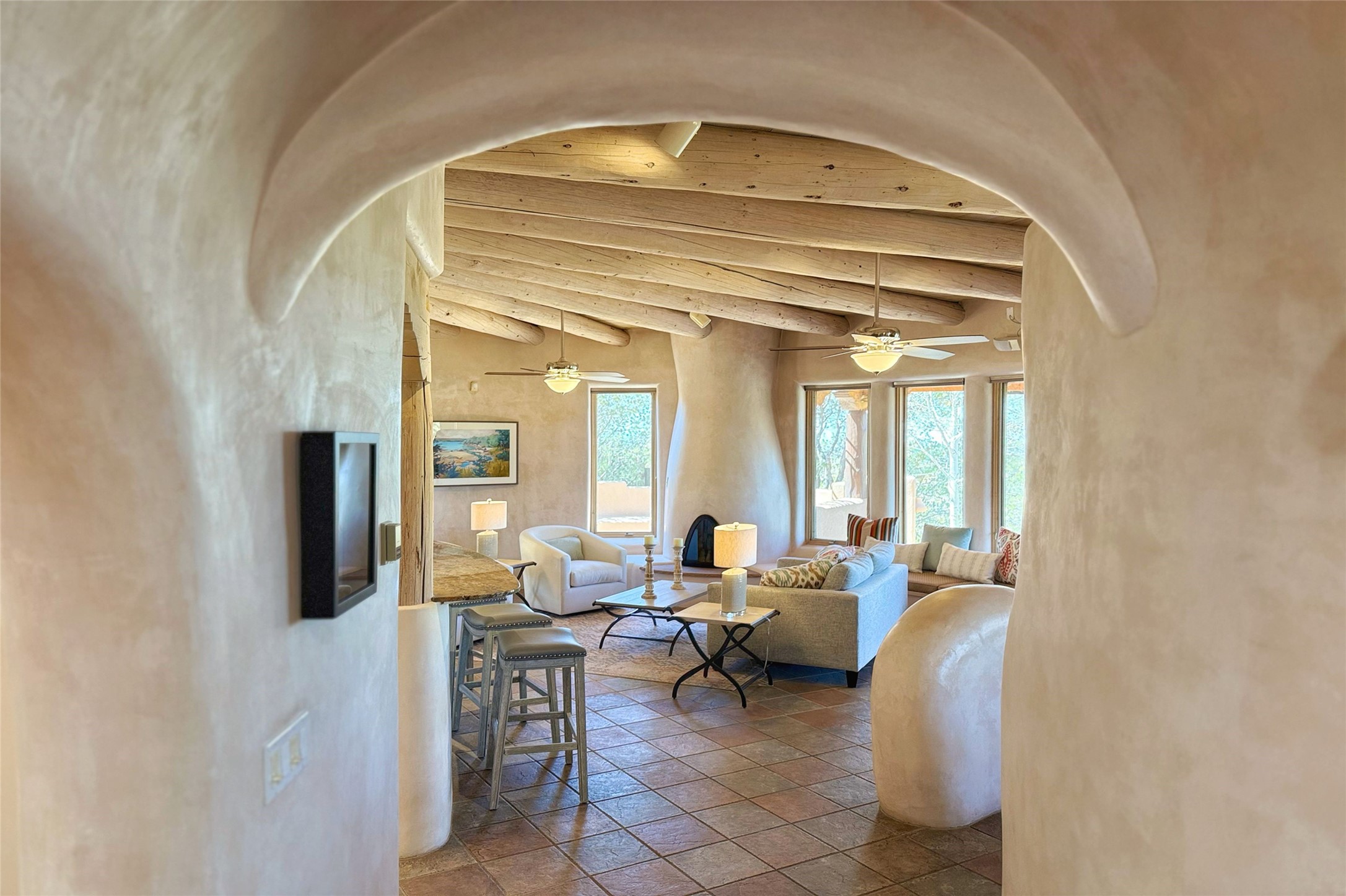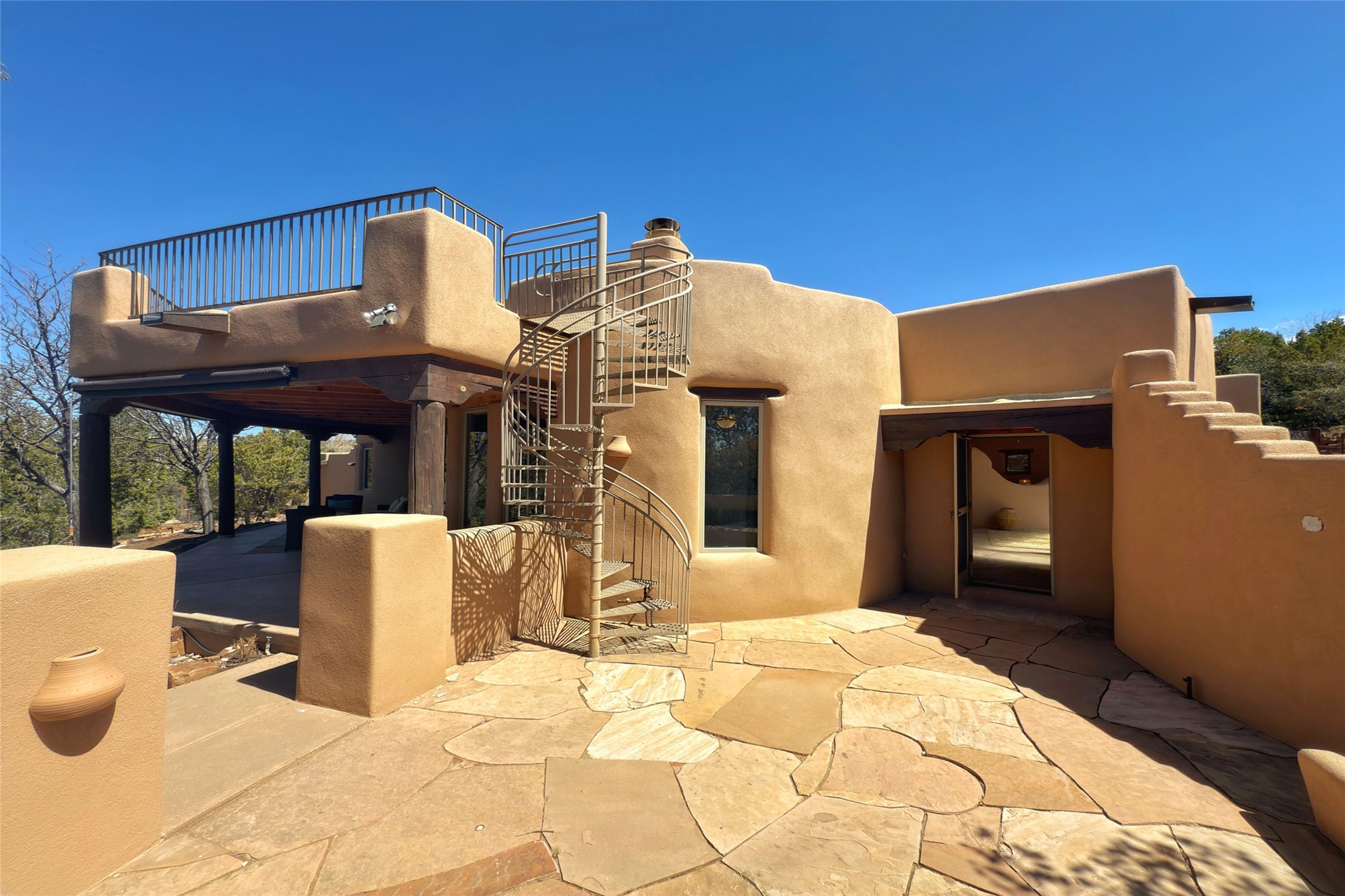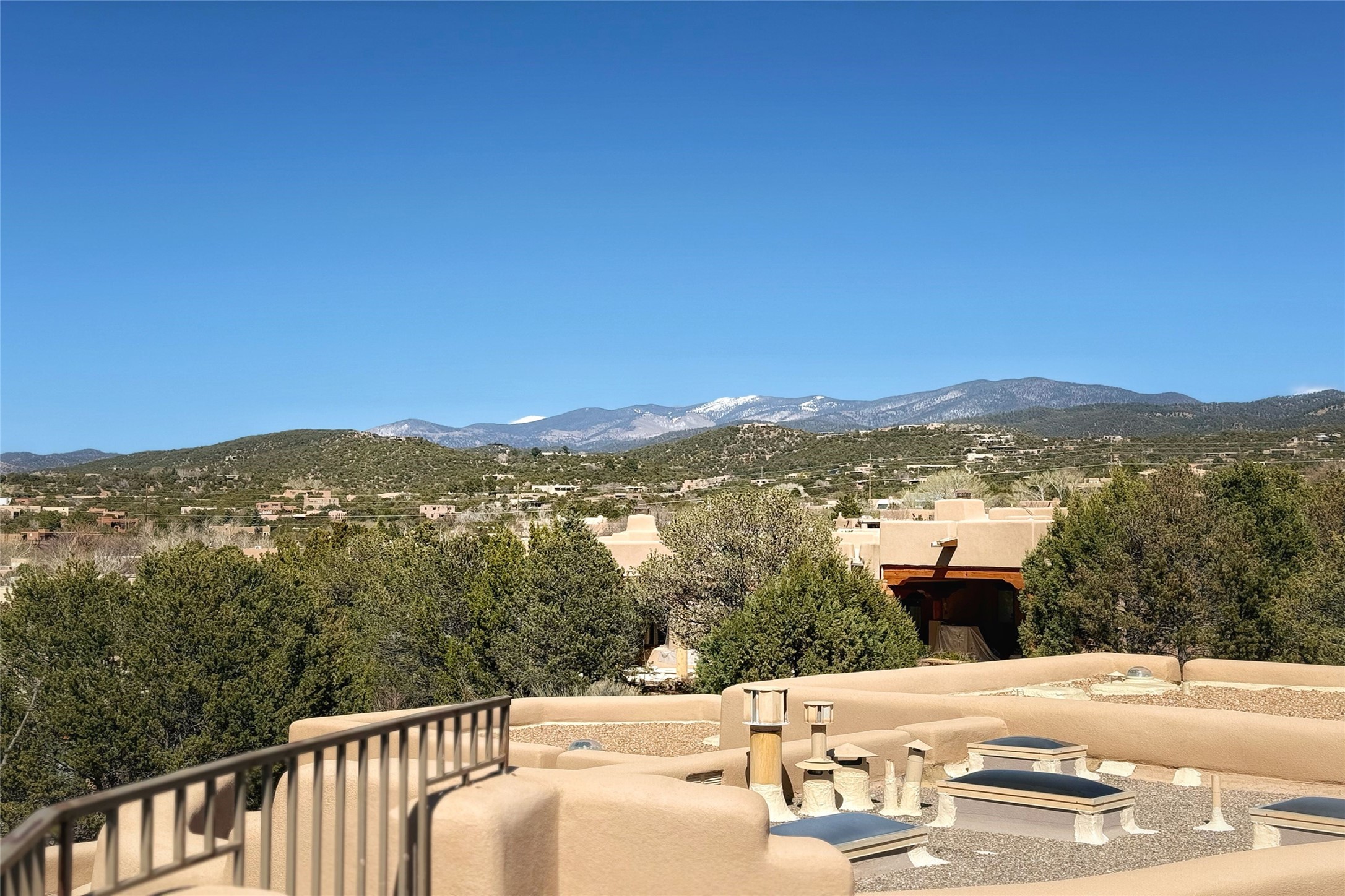 Stunning custom home with circular floor plan, archways and designer touches throughout. The spacious kitchen includes granite countertops, bar seating, walk-in butler's pantry and two new gas ranges. The light filled living area features a gas fireplace and large windows, with adjoining dining room. The primary suite offers a private retreat with a sitting room, soaking tub, bidet, and walk-in shower along with massive closet with built in storage. The best part is the massive sunroom with flagstone floors and a gas fireplace. A plant-lover's dream. Just two minutes to the plaza, yet surrounded by pion, the terraced outdoor landscaping offers nature and seclusion. While the large shaded portal boasts banco seating. Plus a rooftop terrace provides 360 views. Additional highlights include radiant floor heating, a bonus studio/home gym, a Murphy bed in the media roomLocated near walking paths, parks, dining, shops and world renowned galleries, this home combines comfort, style, and convenience. Don't miss this one-of-a-kind property!