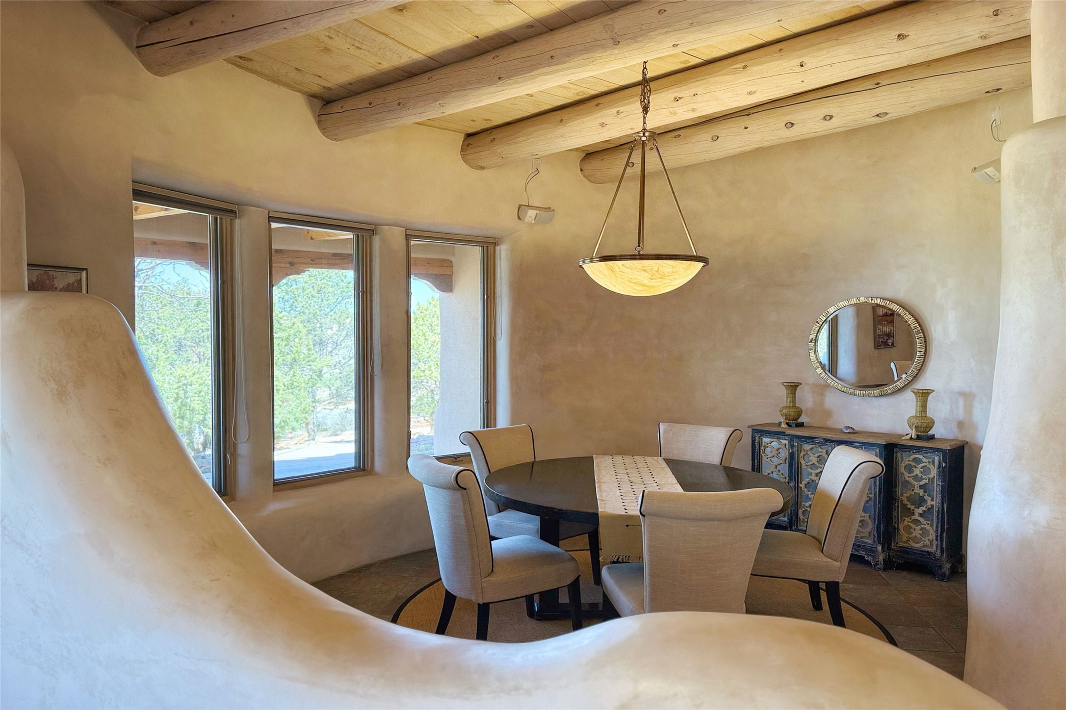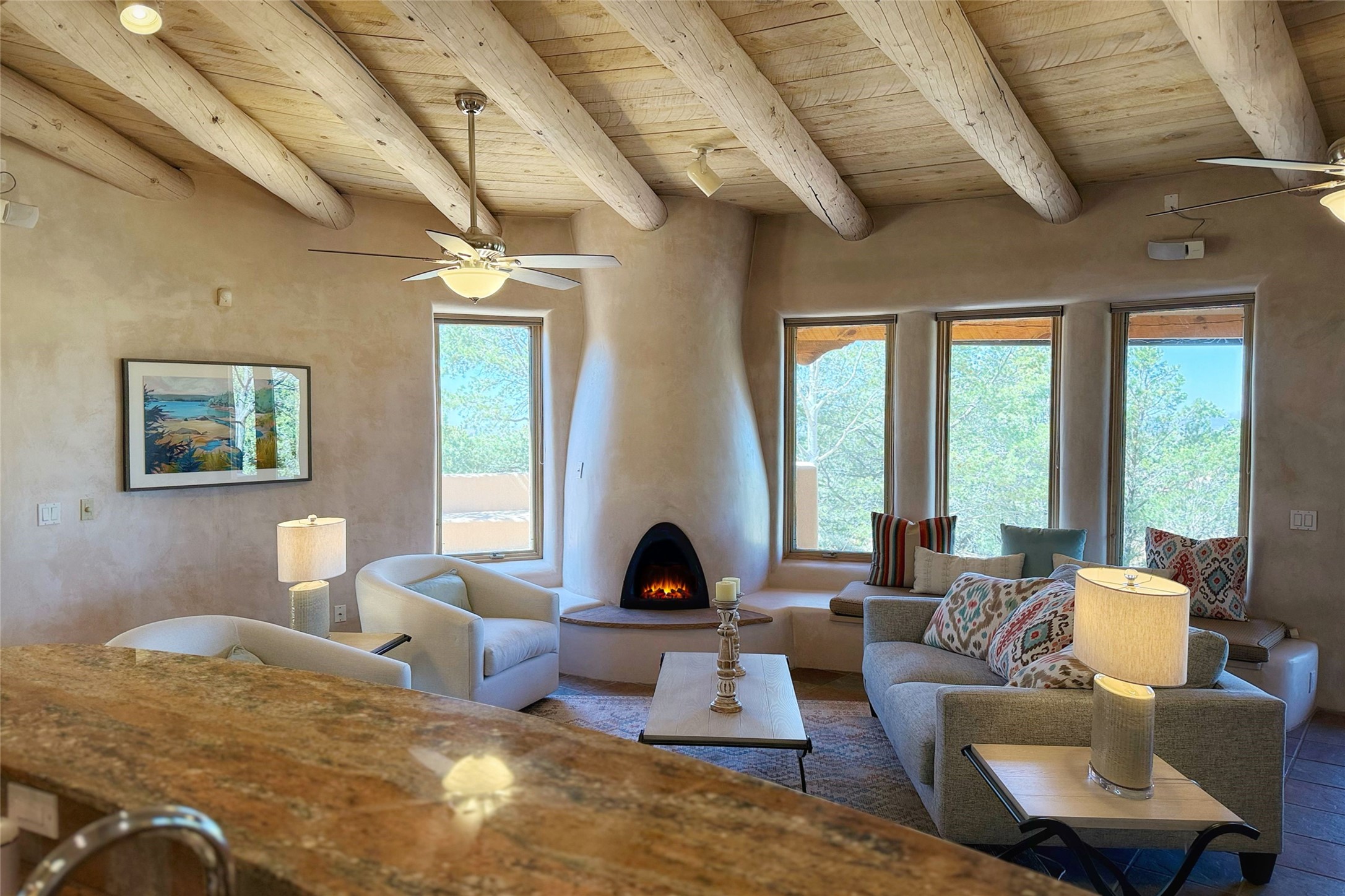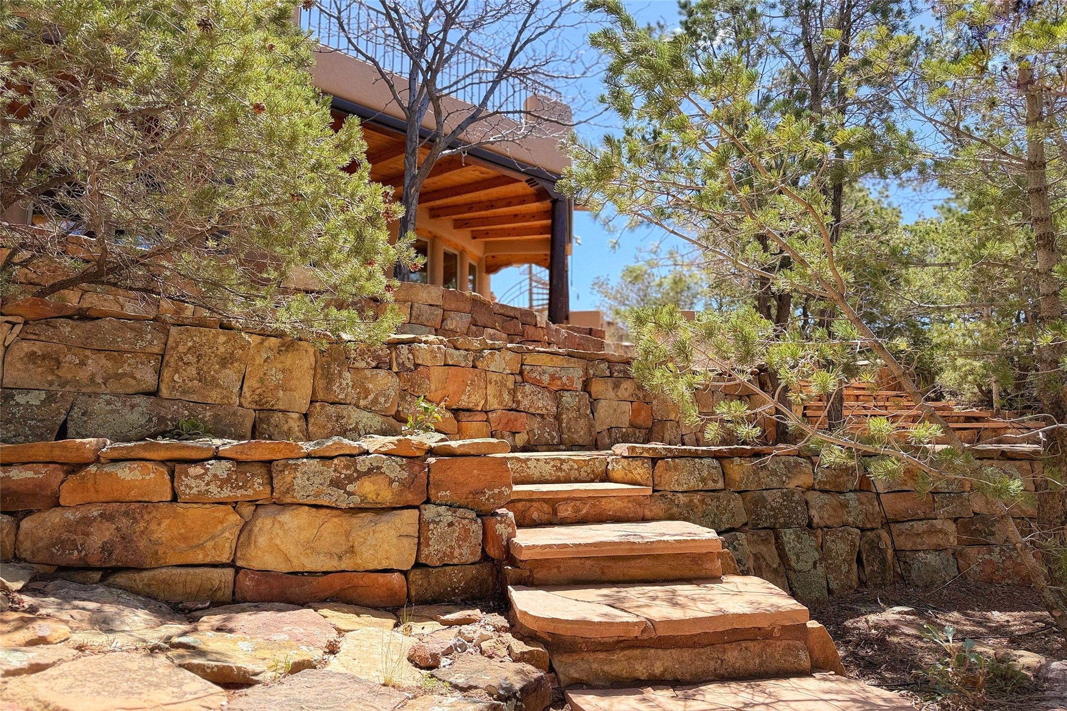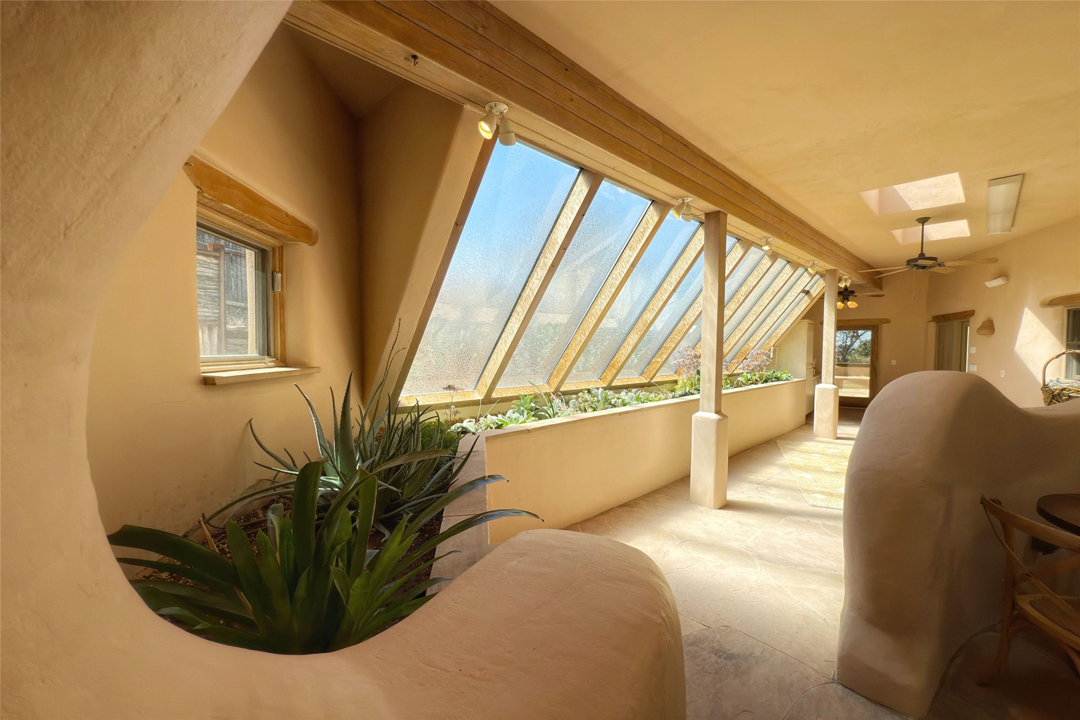 Stunning custom home with circular floor plan, archways and designer touches throughout. The spacious kitchen includes granite countertops, bar seating, walk-in butler's pantry and two new gas ranges. The light filled living area features a gas fireplace and large windows, with adjoining dining room. The primary suite offers a private retreat with a sitting room, soaking tub, bidet, and walk-in shower along with massive closet with built in storage. The best part is the massive sunroom with flagstone floors and a gas fireplace. A plant-lover's dream. Just two minutes to the plaza, yet surrounded by pion, the terraced outdoor landscaping offers nature and seclusion. While the large shaded portal boasts banco seating. Plus a rooftop terrace provides 360 views. Additional highlights include radiant floor heating, a bonus studio/home gym, a Murphy bed in the media roomLocated near walking paths, parks, dining, shops and world renowned galleries, this home combines comfort, style, and convenience. Don't miss this one-of-a-kind property!