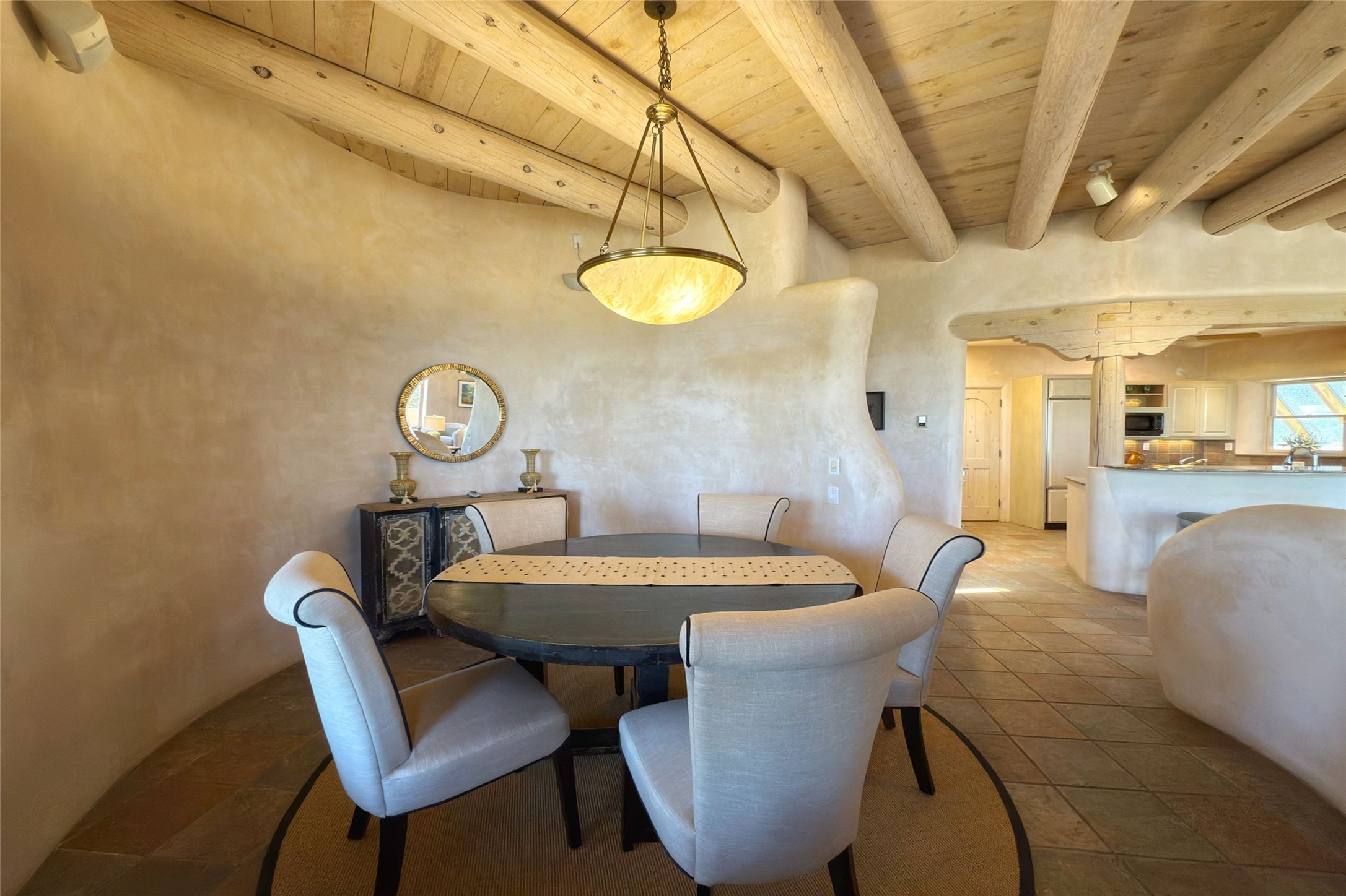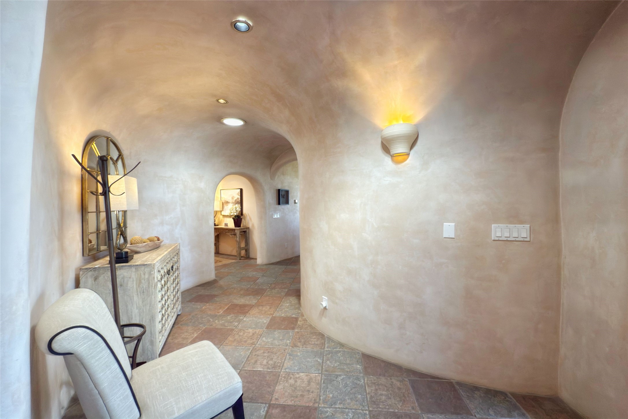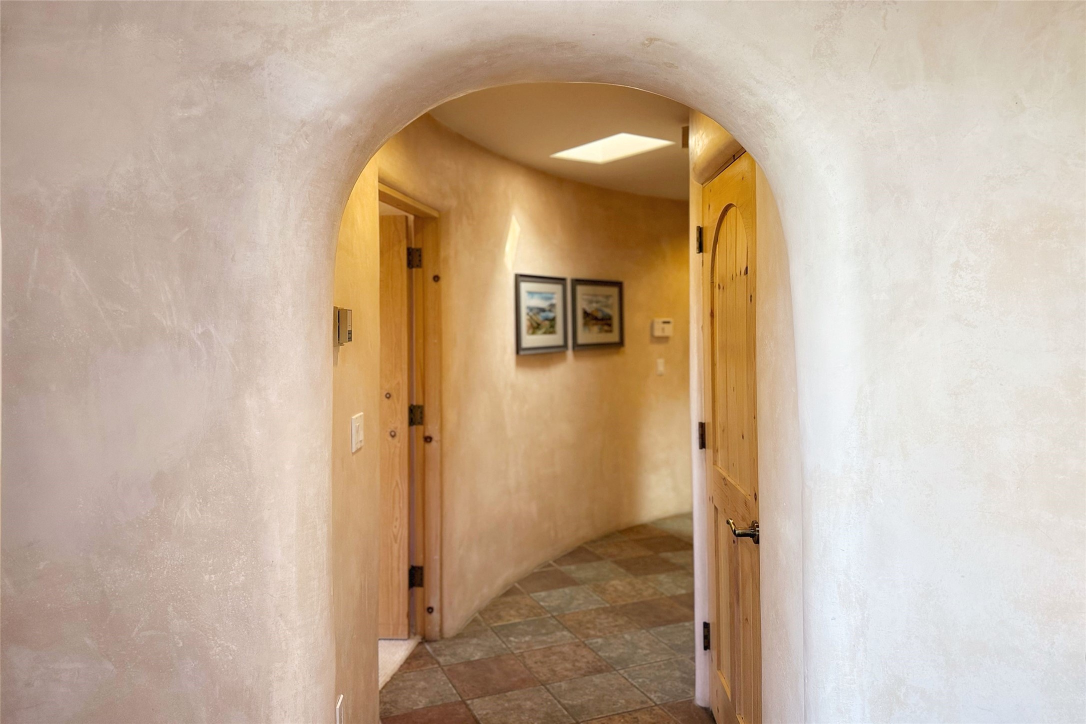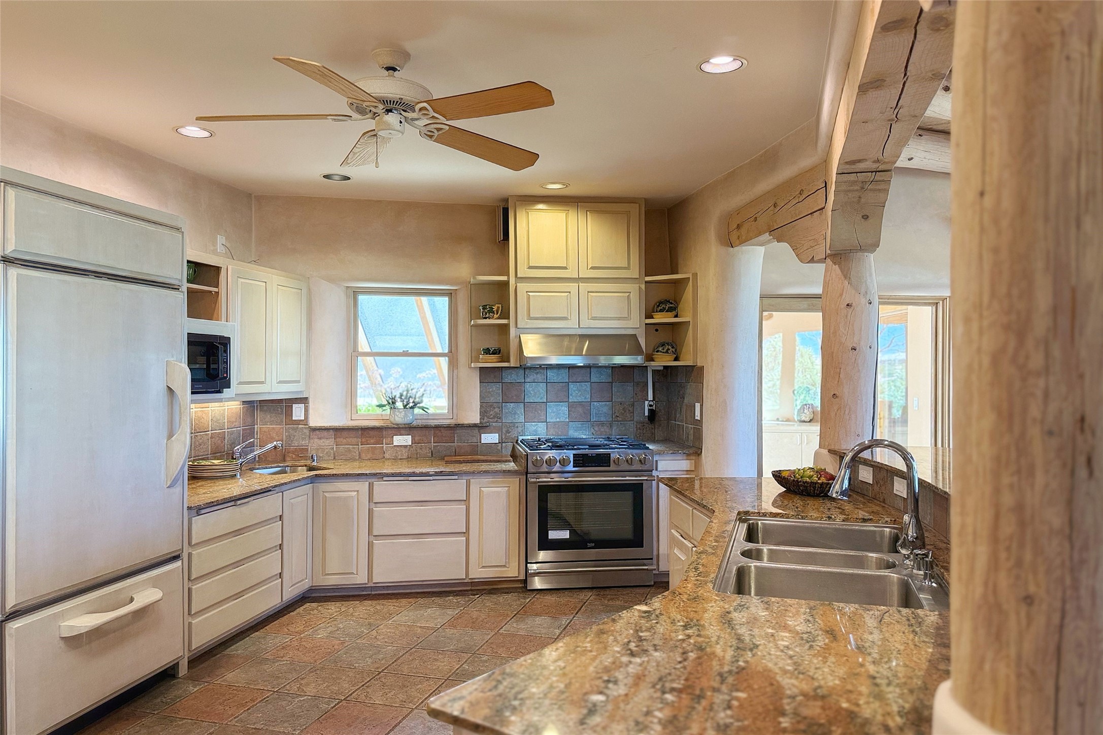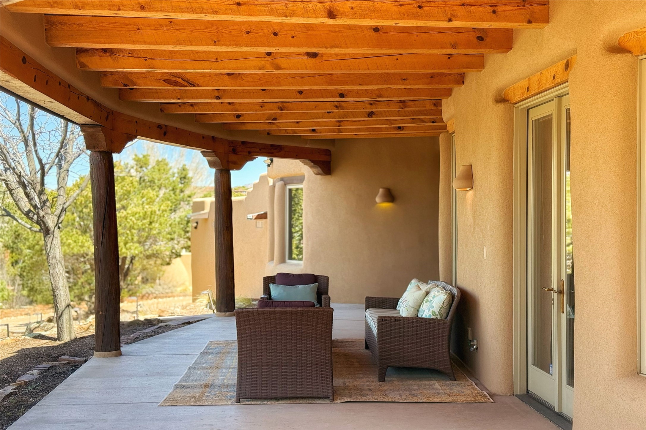 Stunning custom home with circular floor plan, archways and designer touches throughout. The spacious kitchen includes granite countertops, bar seating, walk-in butler's pantry and two new gas ranges. The light filled living area features a gas fireplace and large windows, with adjoining dining room. The primary suite offers a private retreat with a sitting room, soaking tub, bidet, and walk-in shower along with massive closet with built in storage. The best part is the massive sunroom with flagstone floors and a gas fireplace. A plant-lover's dream. Just two minutes to the plaza, yet surrounded by pion, the terraced outdoor landscaping offers nature and seclusion. While the large shaded portal boasts banco seating. Plus a rooftop terrace provides 360 views. Additional highlights include radiant floor heating, a bonus studio/home gym, a Murphy bed in the media roomLocated near walking paths, parks, dining, shops and world renowned galleries, this home combines comfort, style, and convenience. Don't miss this one-of-a-kind property!
