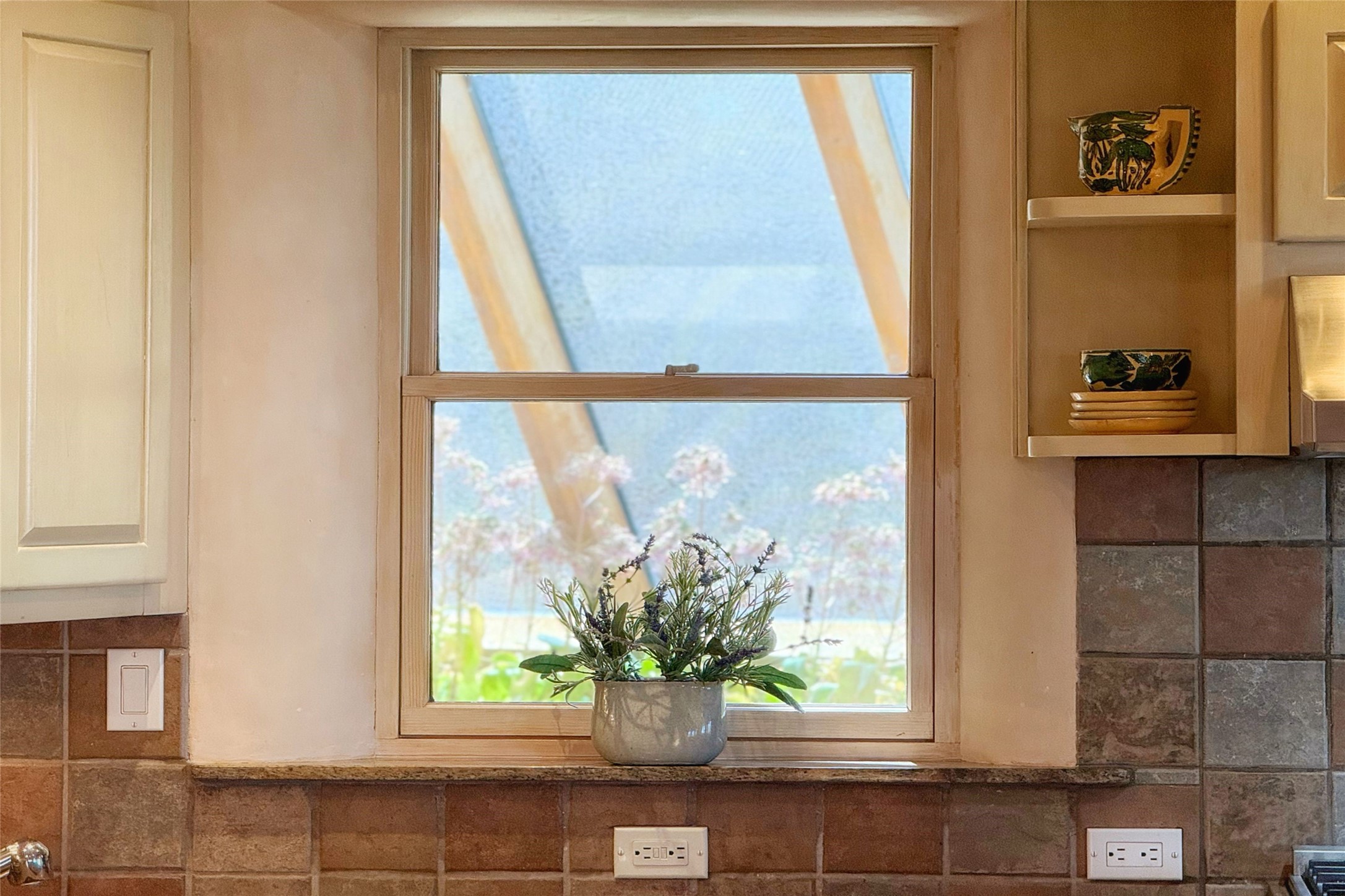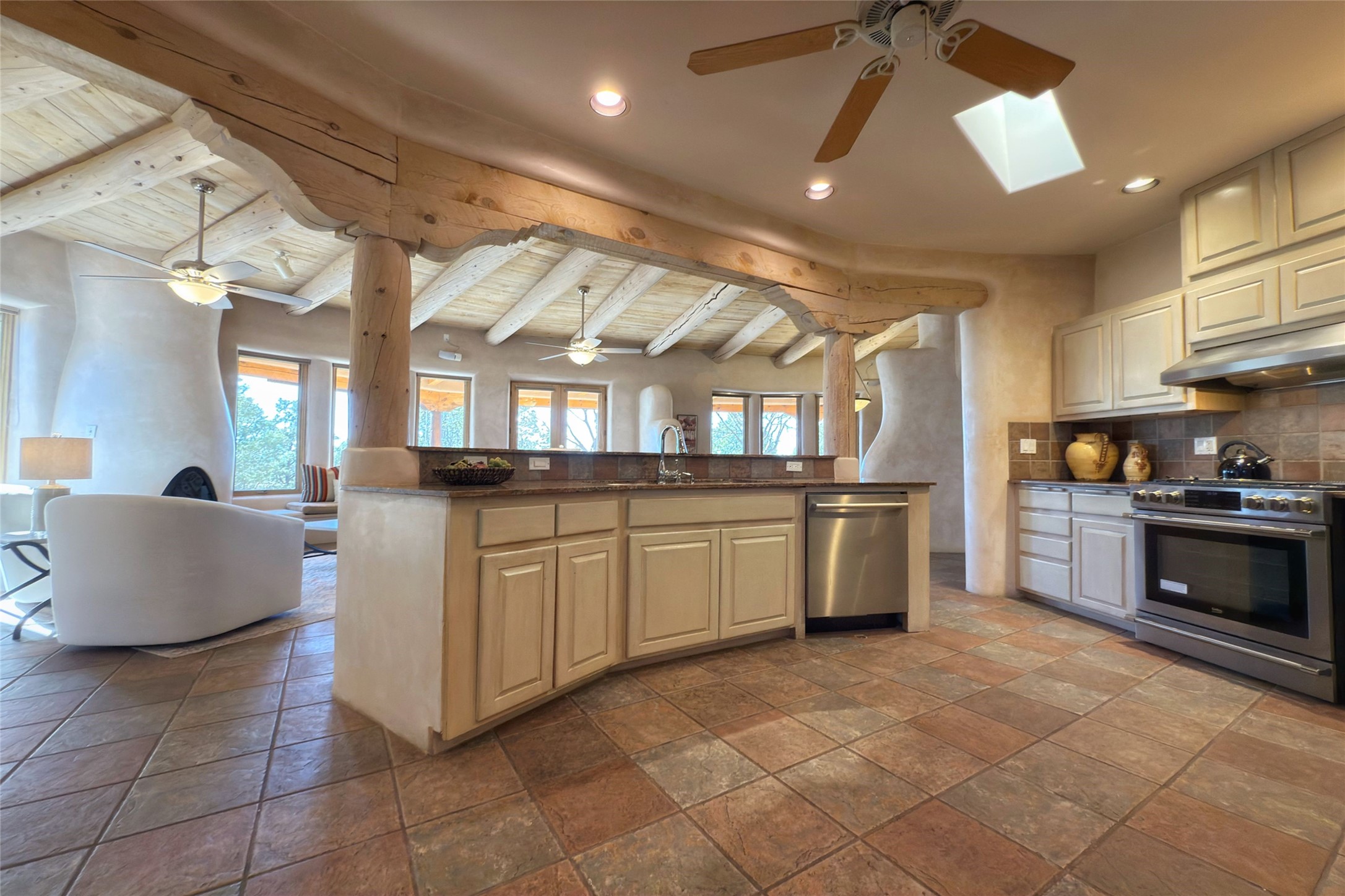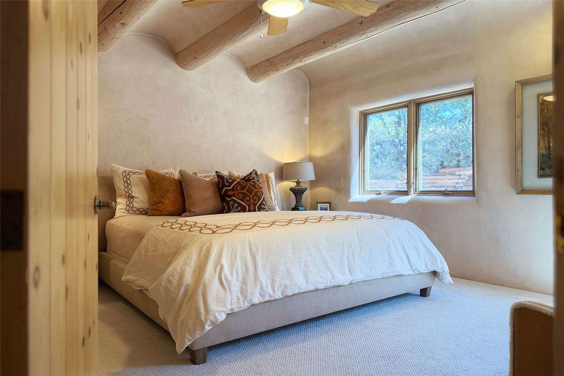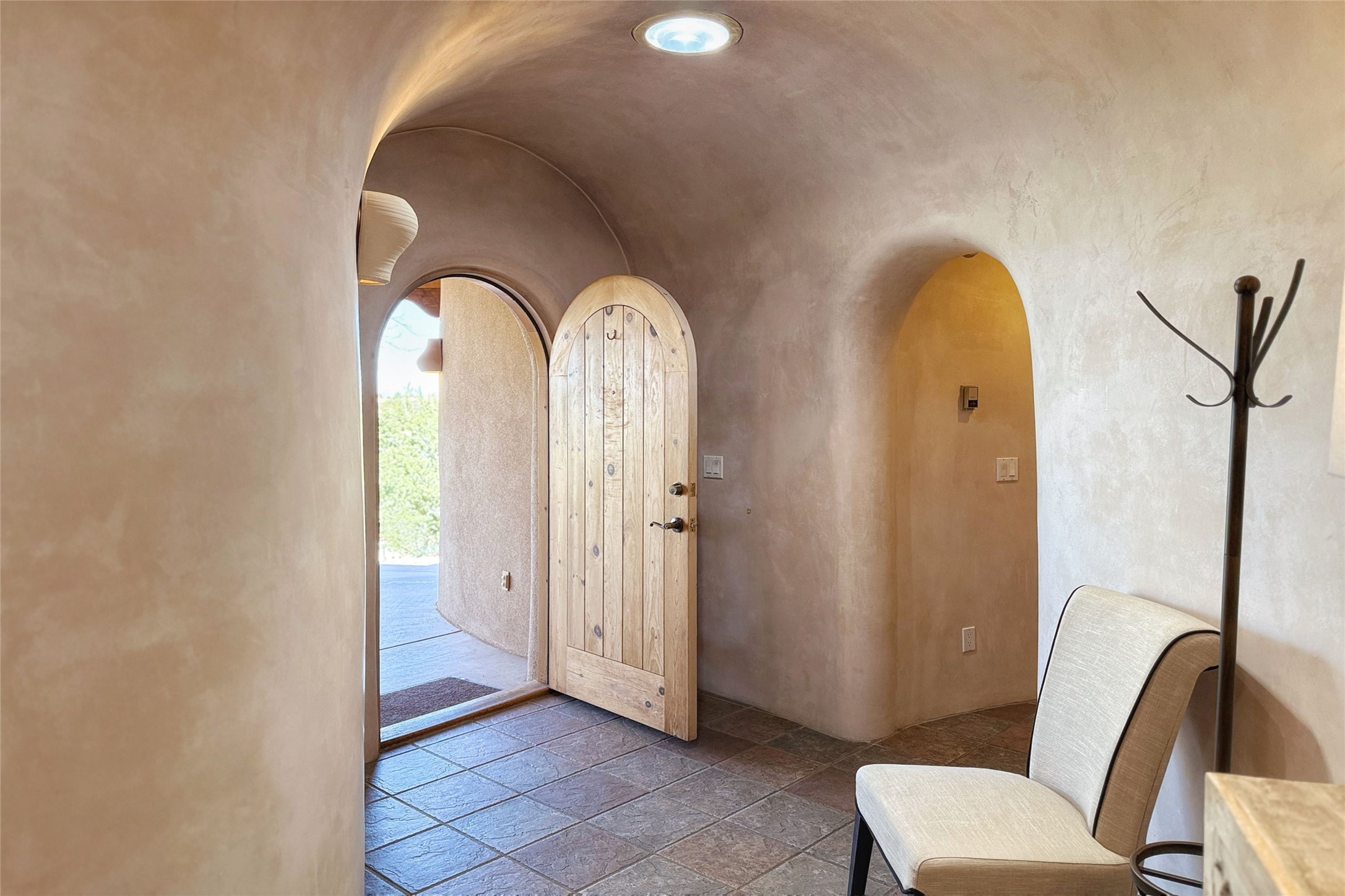 Stunning custom home with circular floor plan, archways and designer touches throughout. The spacious kitchen includes granite countertops, bar seating, walk-in butler's pantry and two new gas ranges. The light filled living area features a gas fireplace and large windows, with adjoining dining room. The primary suite offers a private retreat with a sitting room, soaking tub, bidet, and walk-in shower along with massive closet with built in storage. The best part is the massive sunroom with flagstone floors and a gas fireplace. A plant-lover's dream. Just two minutes to the plaza, yet surrounded by pion, the terraced outdoor landscaping offers nature and seclusion. While the large shaded portal boasts banco seating. Plus a rooftop terrace provides 360 views. Additional highlights include radiant floor heating, a bonus studio/home gym, a Murphy bed in the media roomLocated near walking paths, parks, dining, shops and world renowned galleries, this home combines comfort, style, and convenience. Don't miss this one-of-a-kind property!