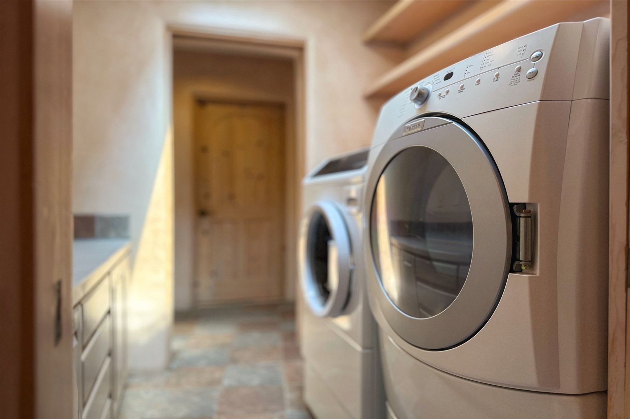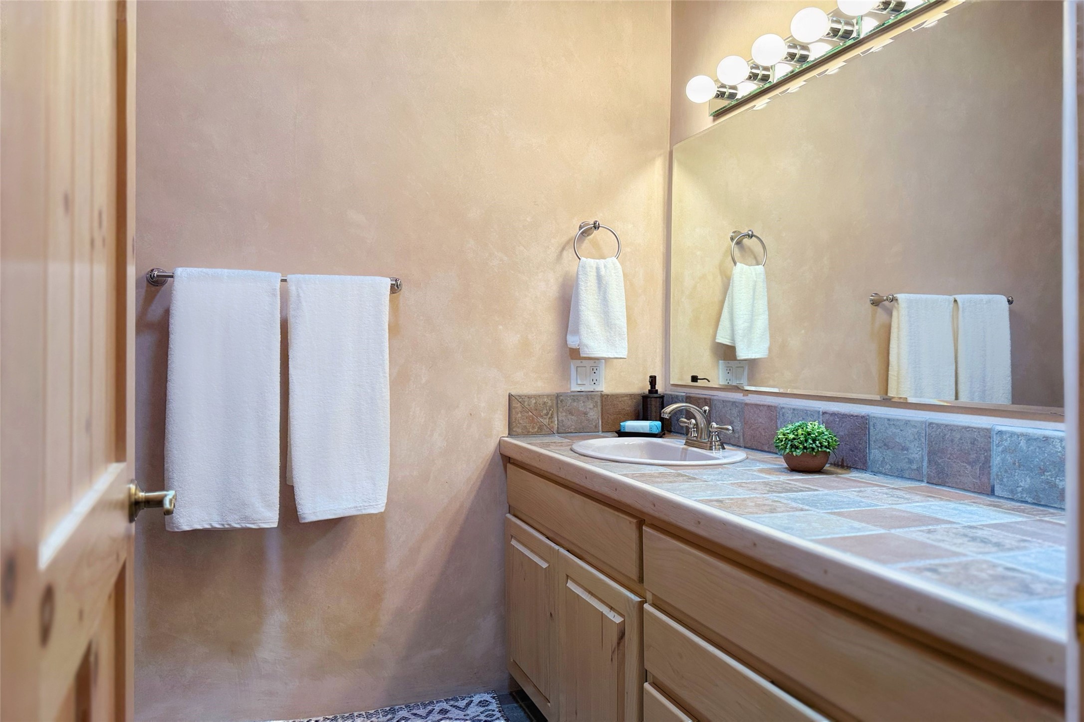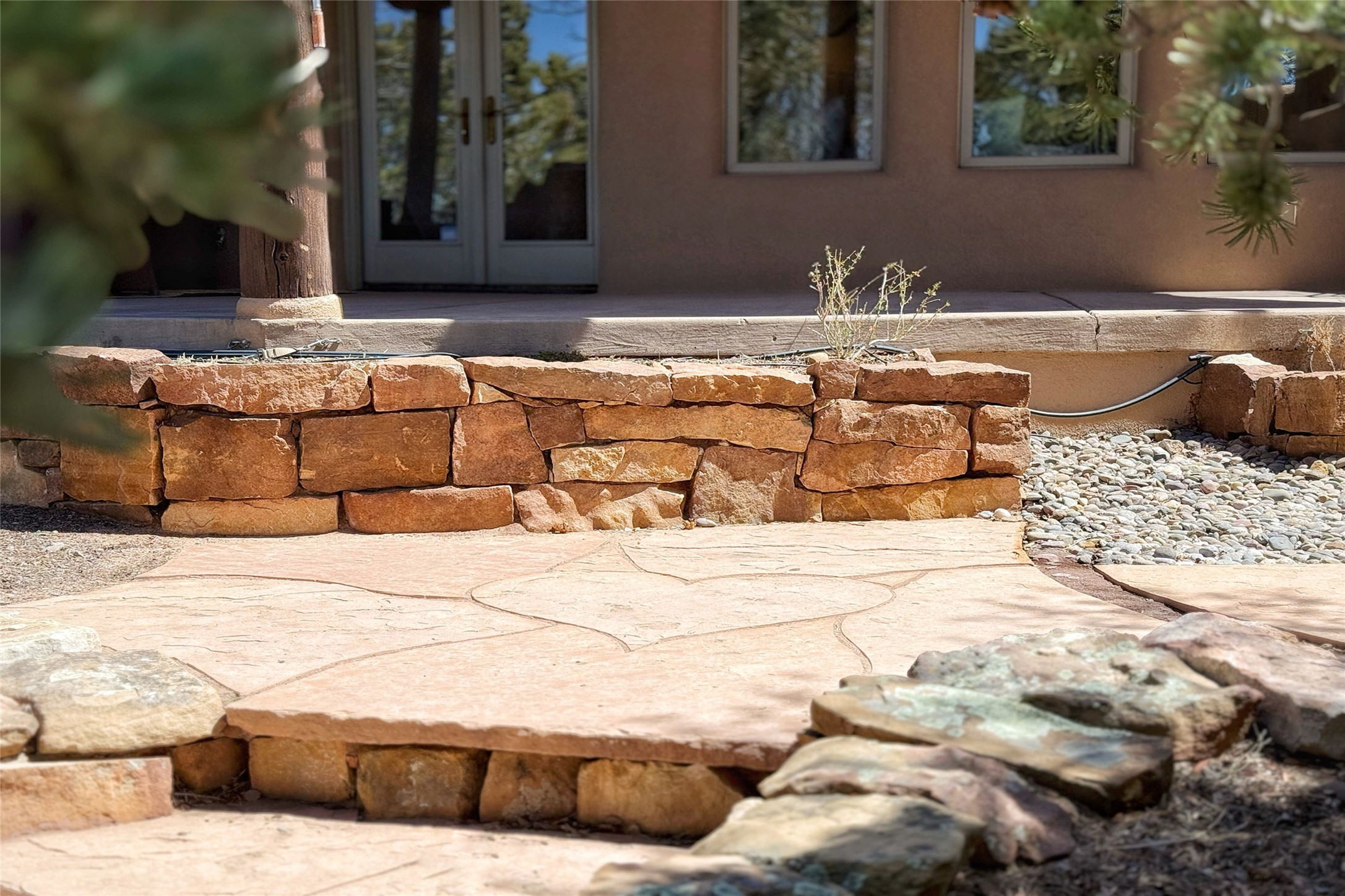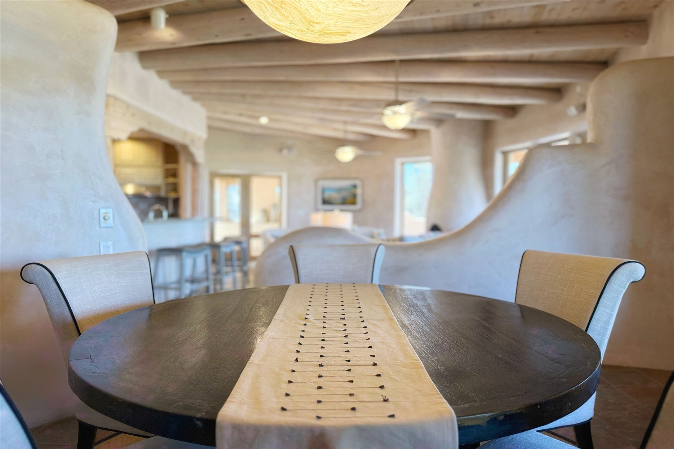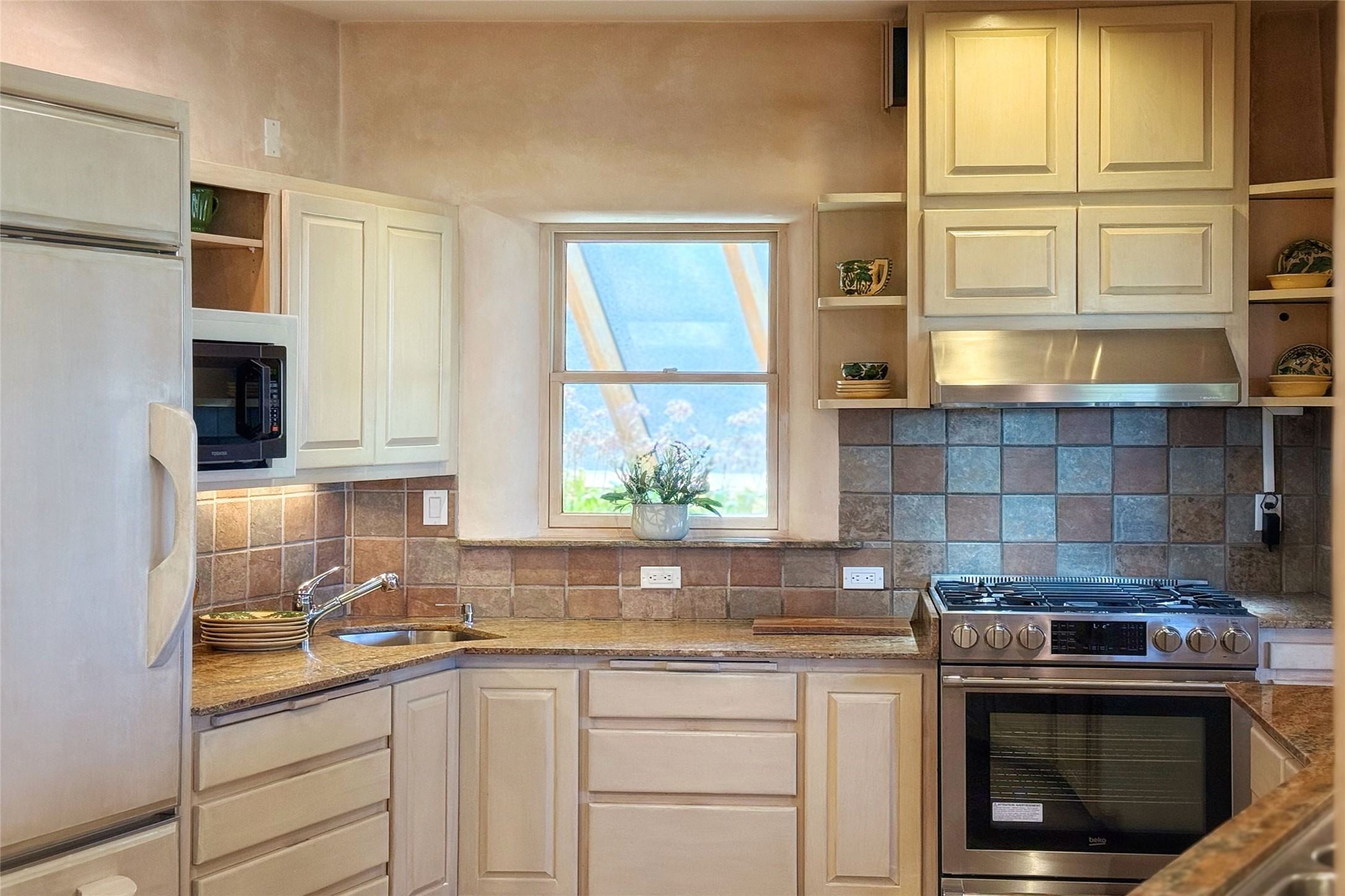 Stunning custom home with circular floor plan, archways and designer touches throughout. The spacious kitchen includes granite countertops, bar seating, walk-in butler's pantry and two new gas ranges. The light filled living area features a gas fireplace and large windows, with adjoining dining room. The primary suite offers a private retreat with a sitting room, soaking tub, bidet, and walk-in shower along with massive closet with built in storage. The best part is the massive sunroom with flagstone floors and a gas fireplace. A plant-lover's dream. Just two minutes to the plaza, yet surrounded by pion, the terraced outdoor landscaping offers nature and seclusion. While the large shaded portal boasts banco seating. Plus a rooftop terrace provides 360 views. Additional highlights include radiant floor heating, a bonus studio/home gym, a Murphy bed in the media roomLocated near walking paths, parks, dining, shops and world renowned galleries, this home combines comfort, style, and convenience. Don't miss this one-of-a-kind property!