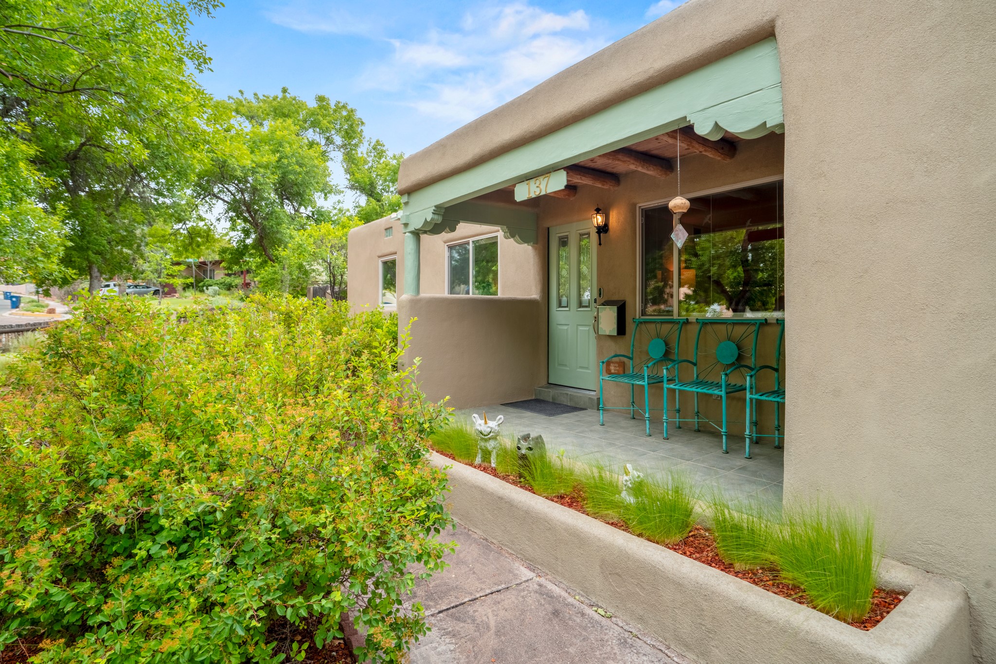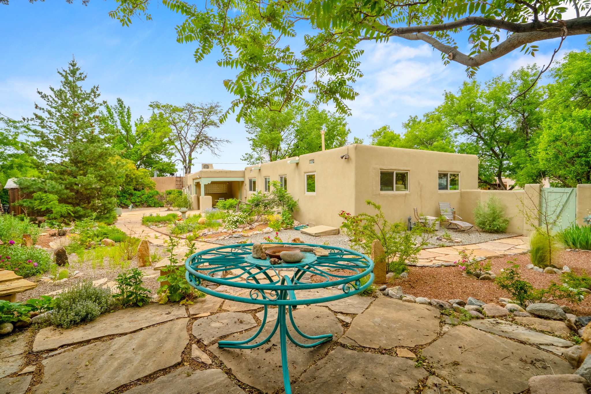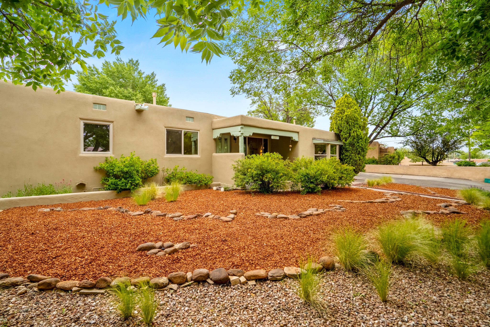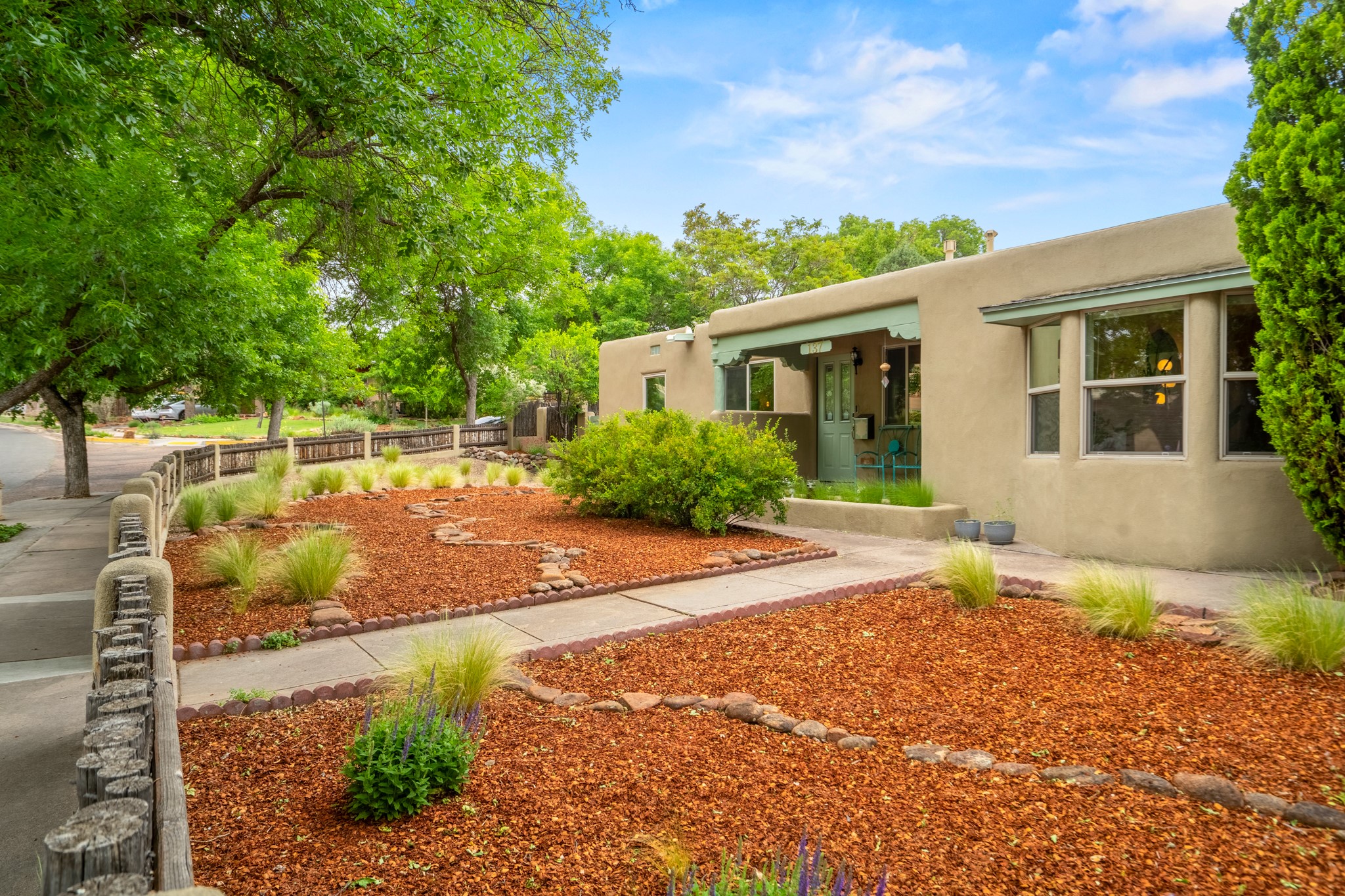This charming Stamm home in Casa Solana offers a blend of classic character and modern updates, and is mere minutes from the Santa Fe Plaza. Beautifully cared for oak floors flow through thoughtfully updated interiors. There is also a brand-new TPO roof topped with owned and completely paid for solar panels. The bright living room features a cozy Kiva fireplace, and extends into a second living space with a beautiful bay window, creating a welcoming gathering space. The cheery kitchen features stainless steel appliances and a sunny dining nook for informal dining. The primary suite, tucked at the end of the hall, boasts a private bath, while a second bedroom and full bath are thoughtfully placed nearby. There is a soundproof music studio on the other end of the home with it's own private entrance that can easily transform into a third bedroom or office. Situated on an oversized corner lot with lush landscaping watered by an underground rainwater tank, this home is move-in ready, full of warmth and perfectly balanced for comfort and style.