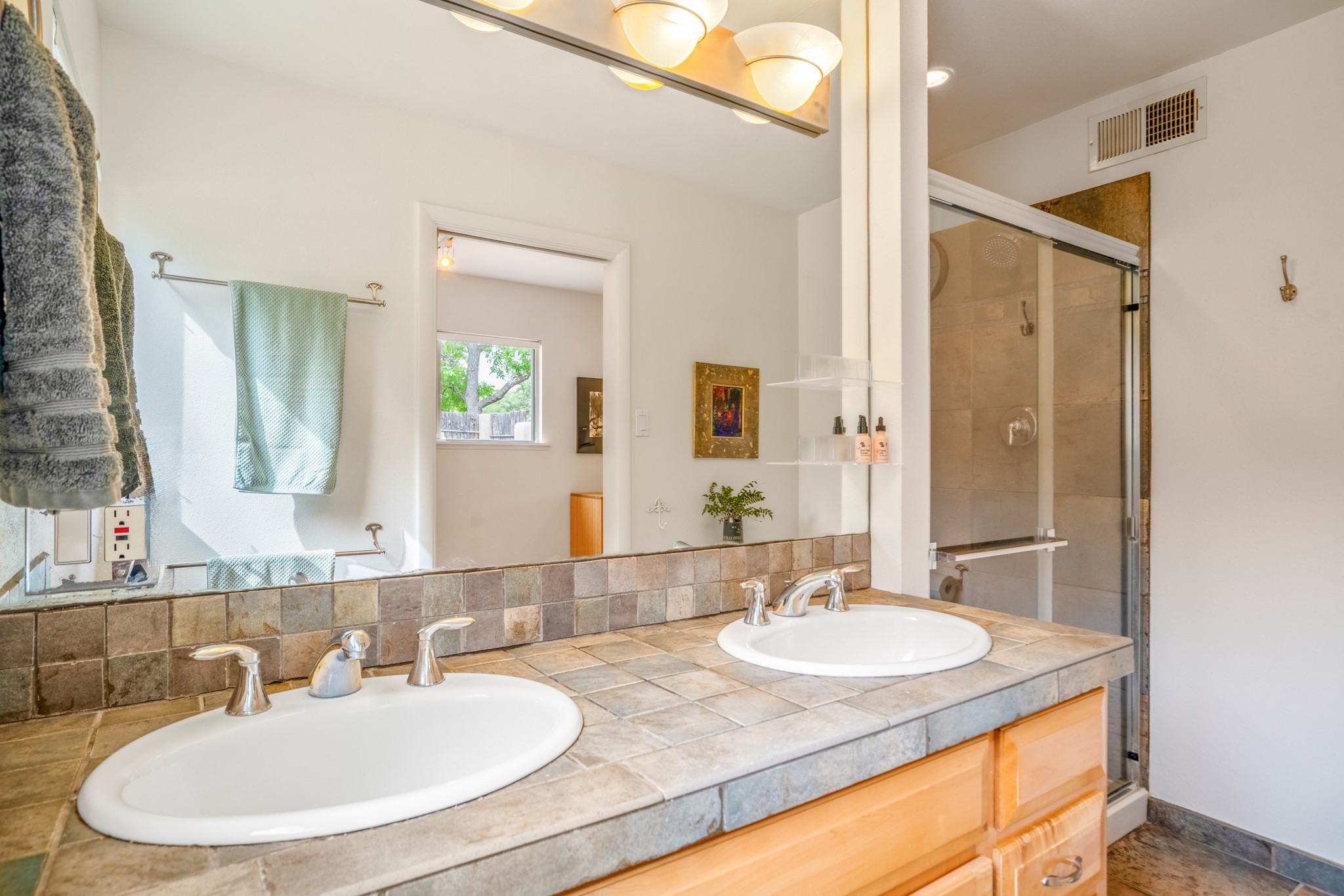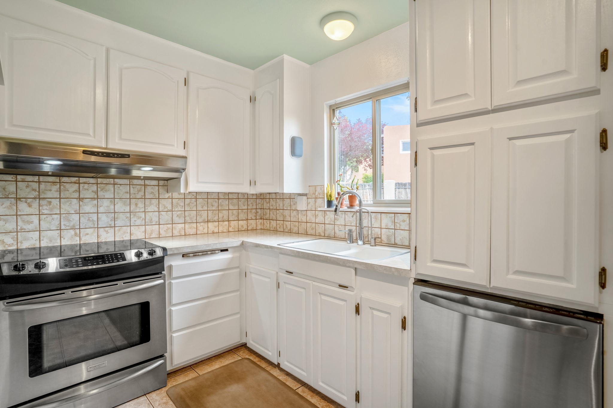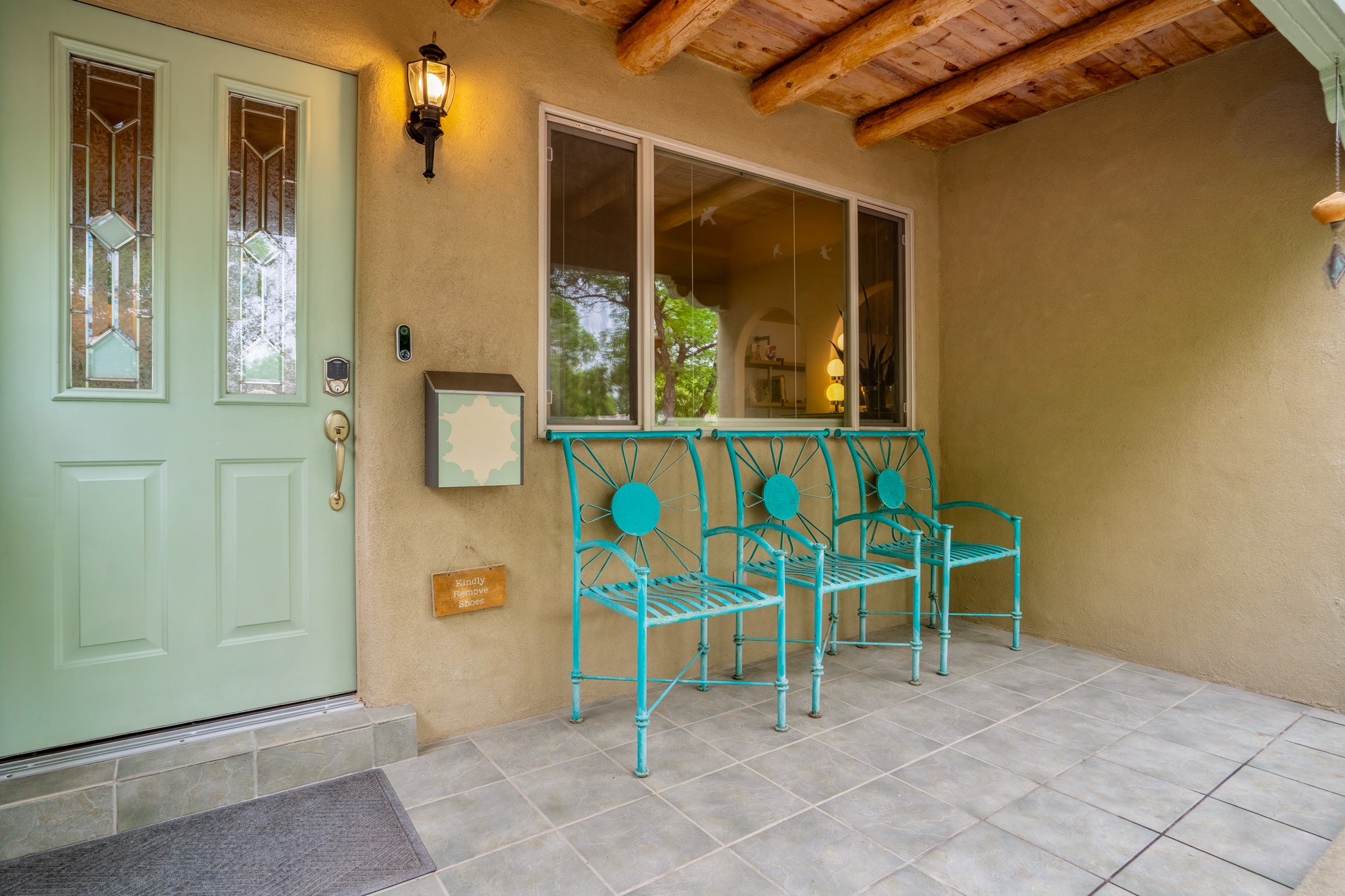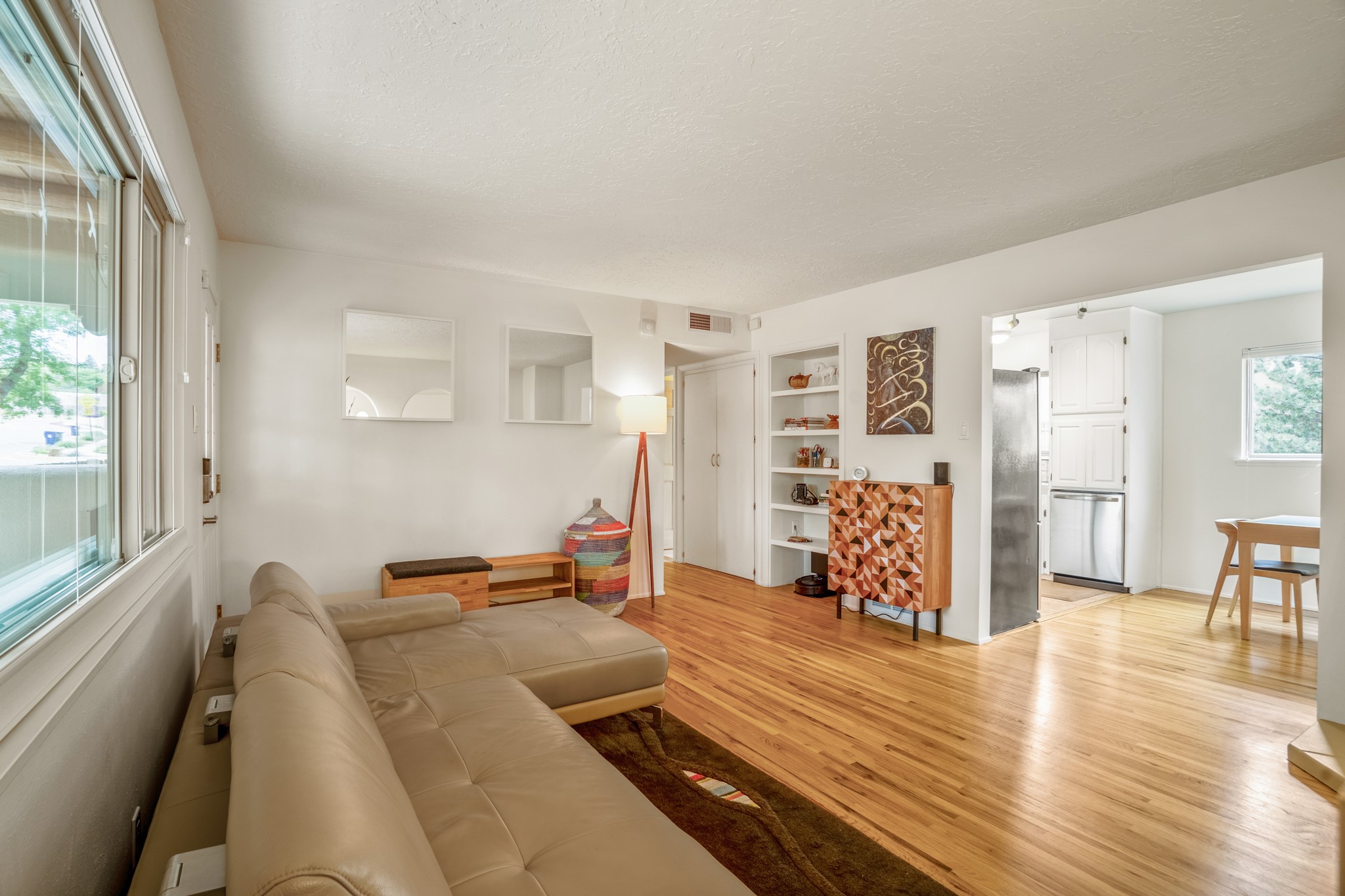 This charming Stamm home in Casa Solana offers a blend of classic character and modern updates, and is mere minutes from the Santa Fe Plaza. Beautifully cared for oak floors flow through thoughtfully updated interiors. There is also a brand-new TPO roof topped with owned and completely paid for solar panels. The bright living room features a cozy Kiva fireplace, and extends into a second living space with a beautiful bay window, creating a welcoming gathering space. The cheery kitchen features stainless steel appliances and a sunny dining nook for informal dining. The primary suite, tucked at the end of the hall, boasts a private bath, while a second bedroom and full bath are thoughtfully placed nearby. There is a soundproof music studio on the other end of the home with it's own private entrance that can easily transform into a third bedroom or office. Situated on an oversized corner lot with lush landscaping watered by an underground rainwater tank, this home is move-in ready, full of warmth and perfectly balanced for comfort and style.
