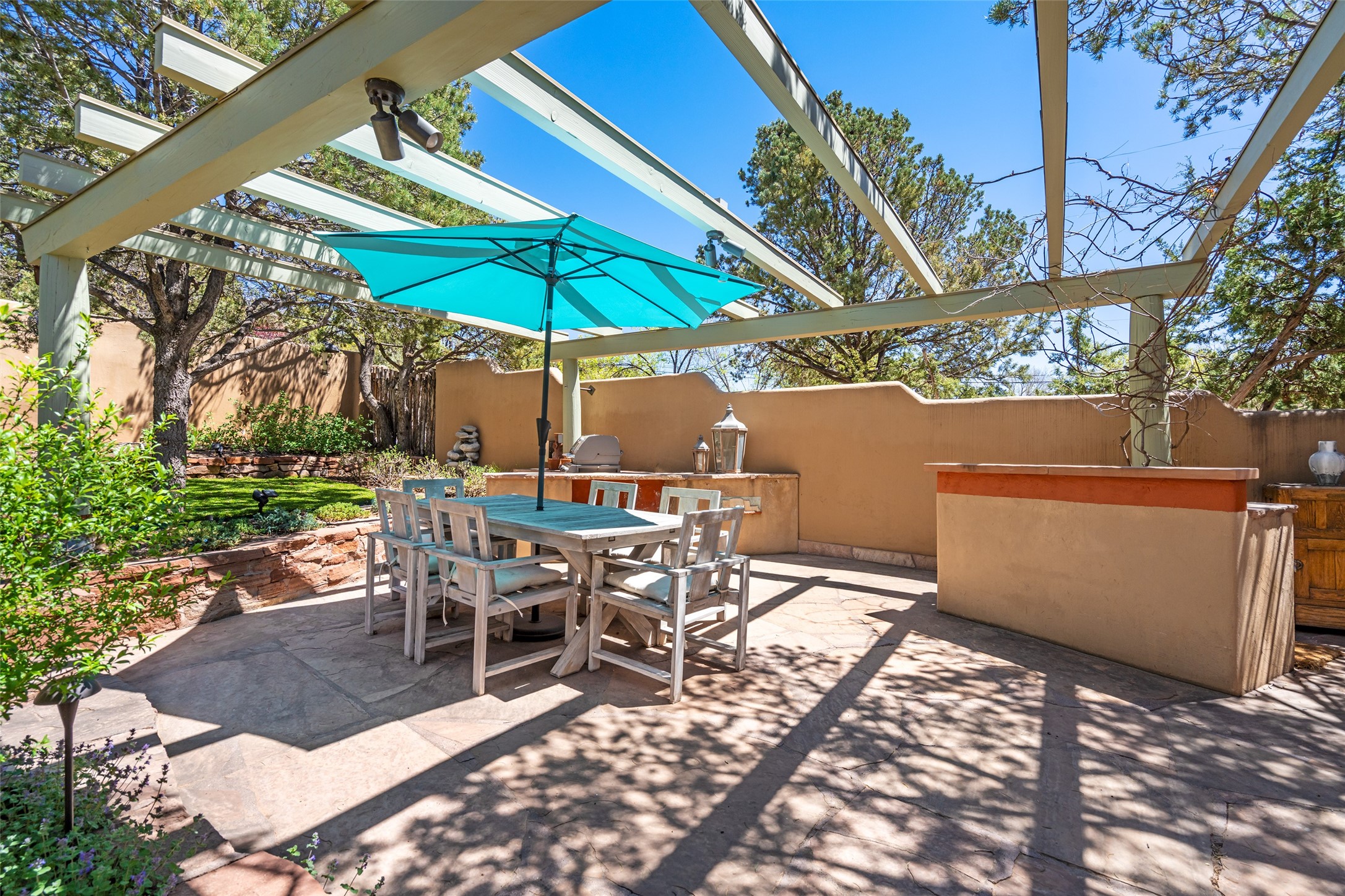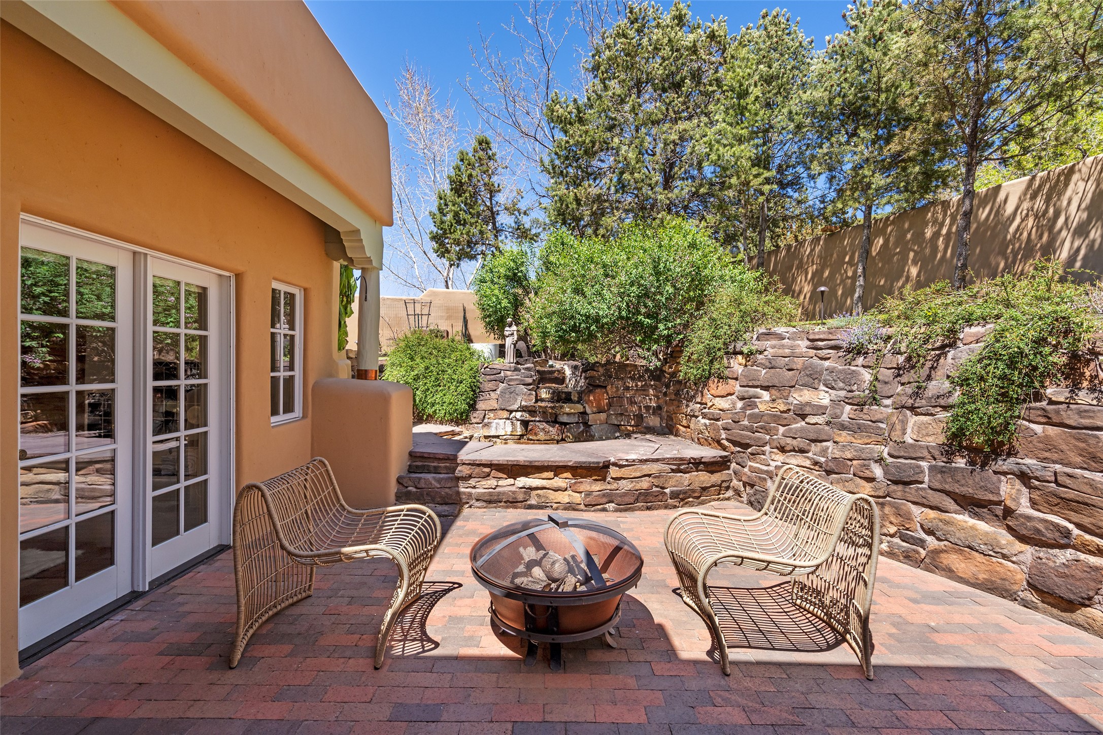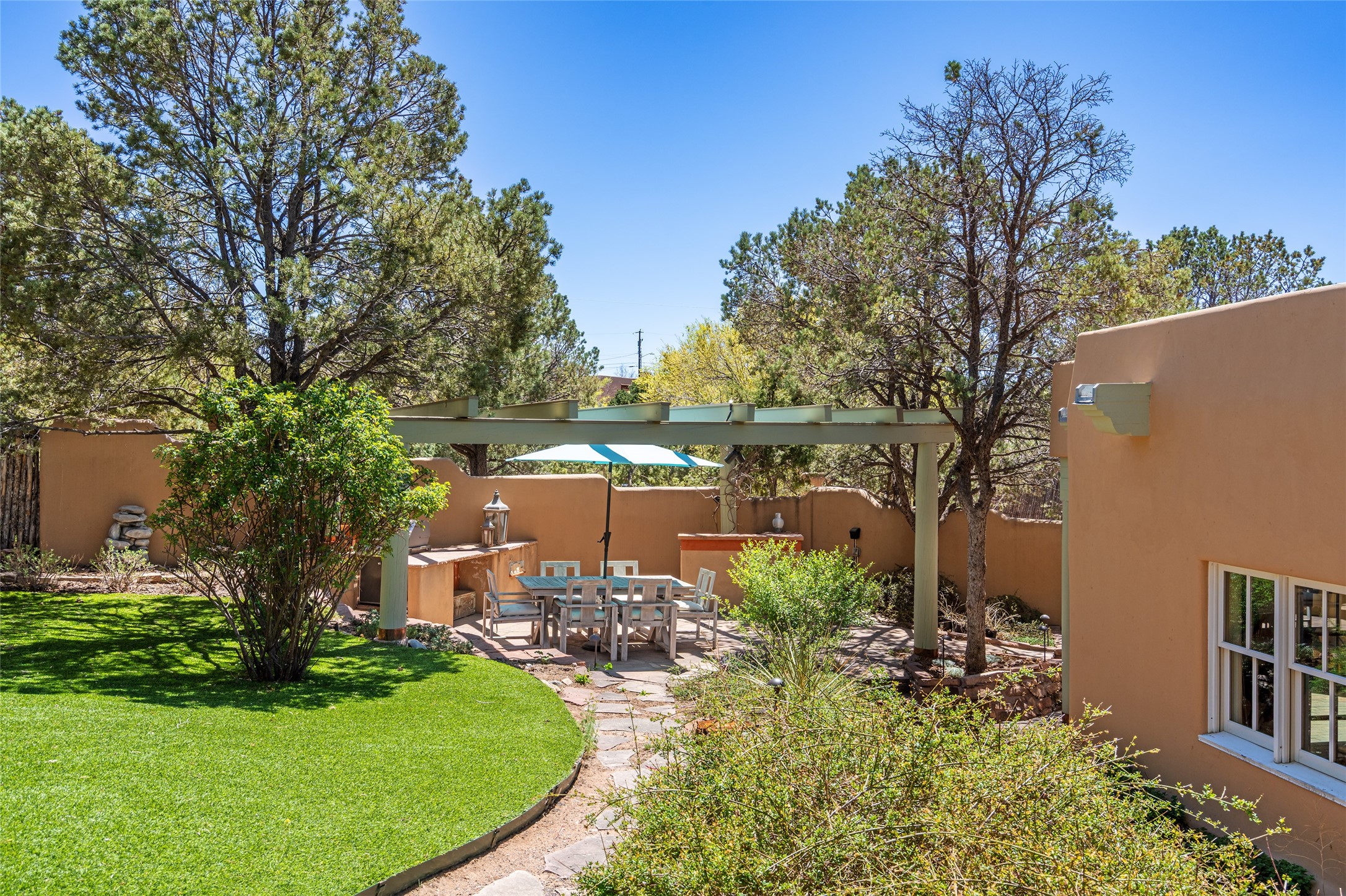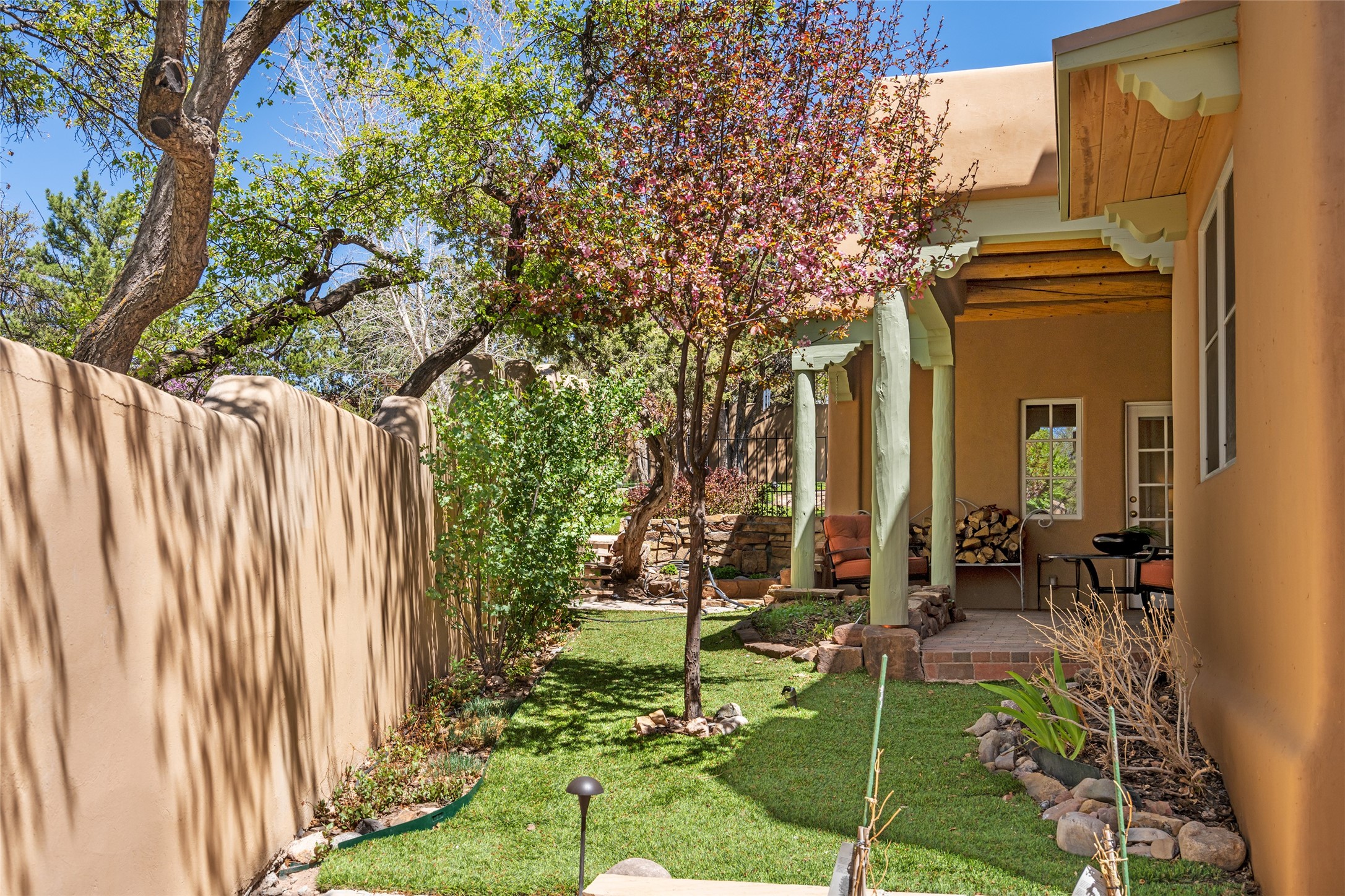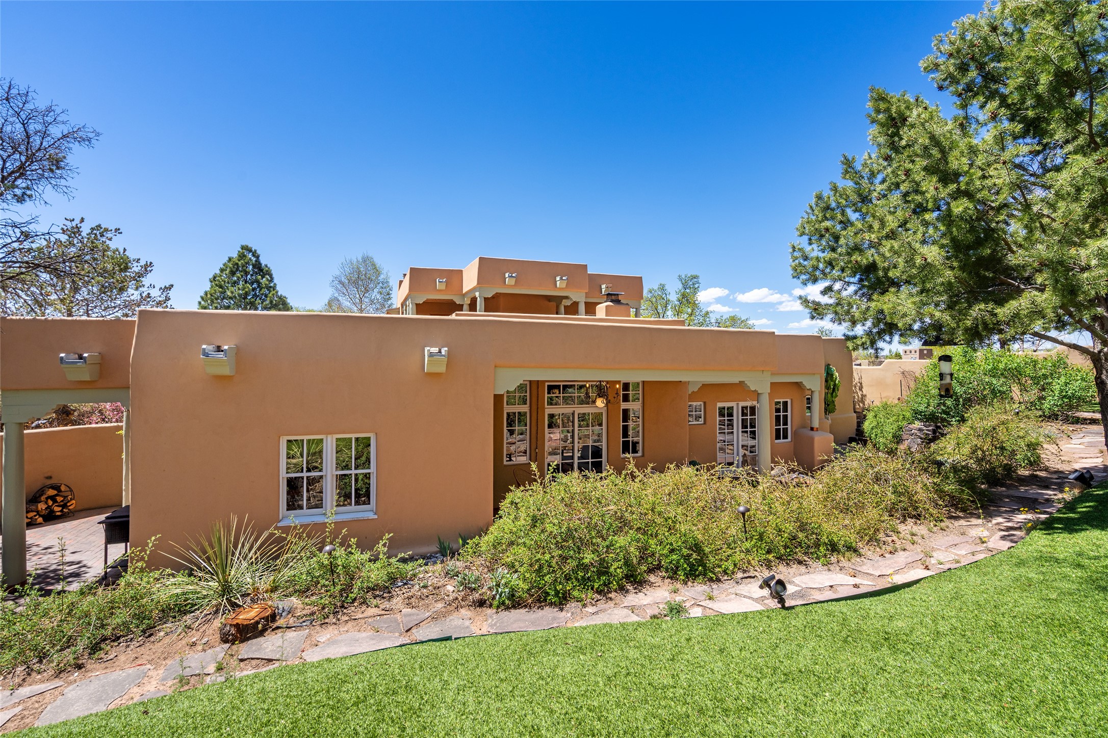 SECLUDED AT THE VERY END OF A LANE OFF GARCIA STREET THIS EASTSIDE SANTA FE HOME WITH AUTHENTIC CHARM & TIMELESS ELEGANCE HAS PHENOMENAL INDOOR/OUTDOOR ENTERTAINING SPACES COUPLED WITH A GARAGE AND PLENTY OF PRIVATE PARKING SO YOU CAN INVITE YOUR FRIENDS TO COME ENJOY TIME TOGETHER. Nestled in one of Santa Fe's most sought-after neighborhoods, just moments from the historic Plaza, this exceptional Eastside residence offers a blend of traditional Santa Fe style and refined comfort. With approximately 3,298 square feet in the main house and an additional 144 square feet in charming, attached studio, this two-story home is full of warmth, character, and rare privacy. Featuring 3 bedrooms and 4 bathrooms, the home is graced with classic Saltillo tile floors, coved ceiling treatments, and a seamless indoor-outdoor flow that celebrates the region's enchanting climate. The upstairs level offers a private retreat, ideal as a guest suite, complete with its own terrace. Outdoor living shines here - mature landscaping, a soothing water feature, a pergola-shaded grill area for al fresco dining, multiple patios, and second story terraces create the perfect setting for entertaining or quiet relaxation. Inside, both formal and informal dining areas cater to every occasion, while the attached studio offers flexible space for creativity or work. A 2-car garage, generous off-street parking, central heating and cooling, and close proximity to world-class dining, galleries, and cultural landmarks make this a rare Eastside offering. A true sanctuary in the heart of the city, this property captures the essence of Santa Fe living at its finest.