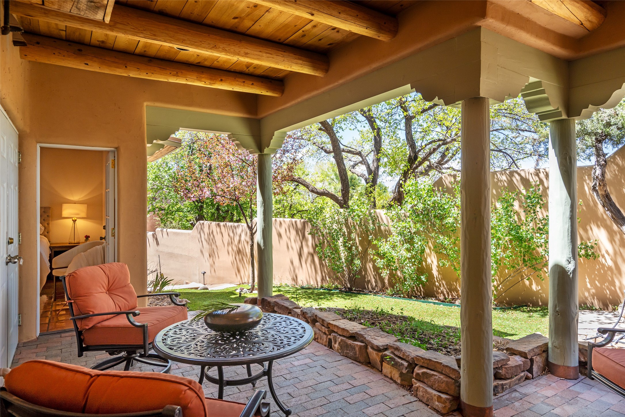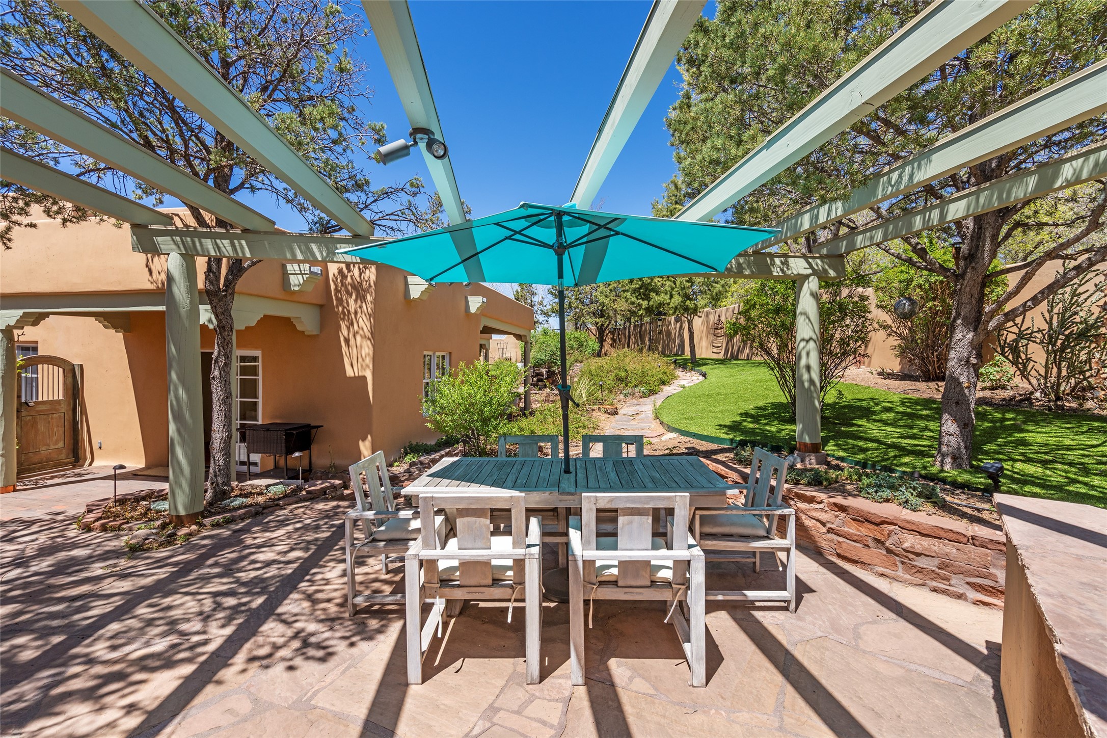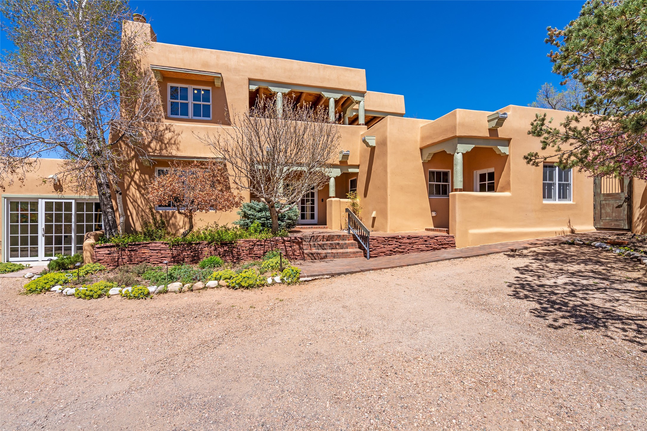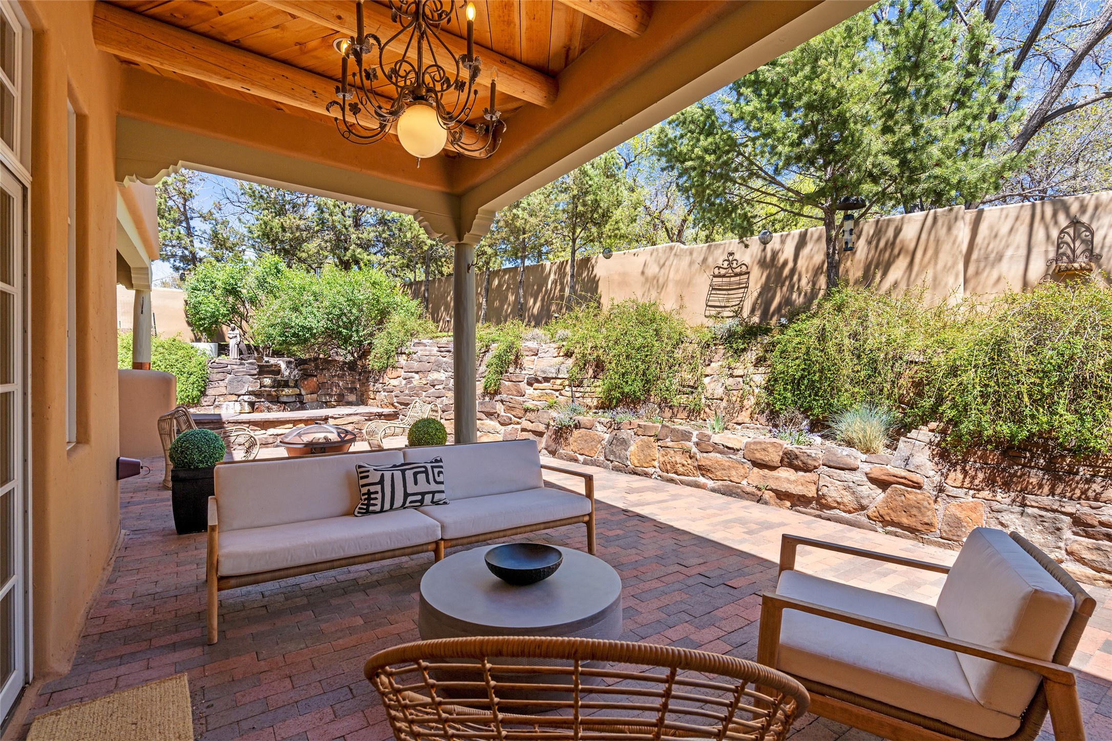 SECLUDED AT THE VERY END OF A LANE OFF GARCIA STREET THIS EASTSIDE SANTA FE HOME WITH AUTHENTIC CHARM & TIMELESS ELEGANCE HAS PHENOMENAL INDOOR/OUTDOOR ENTERTAINING SPACES COUPLED WITH A GARAGE AND PLENTY OF PRIVATE PARKING SO YOU CAN INVITE YOUR FRIENDS TO COME ENJOY TIME TOGETHER. Nestled in one of Santa Fe's most sought-after neighborhoods, just moments from the historic Plaza, this exceptional Eastside residence offers a blend of traditional Santa Fe style and refined comfort. With approximately 3,298 square feet in the main house and an additional 144 square feet in charming, attached studio, this two-story home is full of warmth, character, and rare privacy. Featuring 3 bedrooms and 4 bathrooms, the home is graced with classic Saltillo tile floors, coved ceiling treatments, and a seamless indoor-outdoor flow that celebrates the region's enchanting climate. The upstairs level offers a private retreat, ideal as a guest suite, complete with its own terrace. Outdoor living shines here - mature landscaping, a soothing water feature, a pergola-shaded grill area for al fresco dining, multiple patios, and second story terraces create the perfect setting for entertaining or quiet relaxation. Inside, both formal and informal dining areas cater to every occasion, while the attached studio offers flexible space for creativity or work. A 2-car garage, generous off-street parking, central heating and cooling, and close proximity to world-class dining, galleries, and cultural landmarks make this a rare Eastside offering. A true sanctuary in the heart of the city, this property captures the essence of Santa Fe living at its finest.