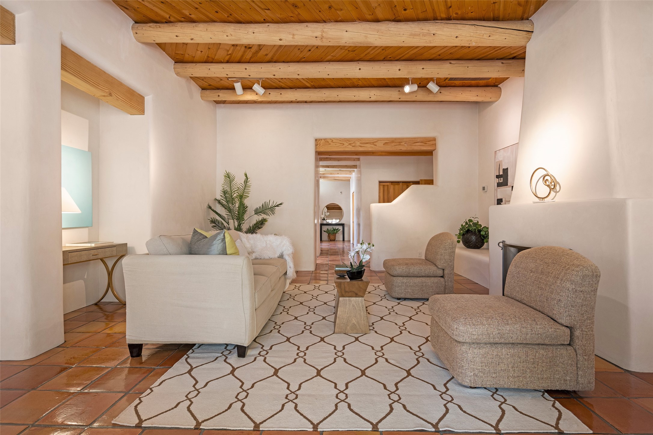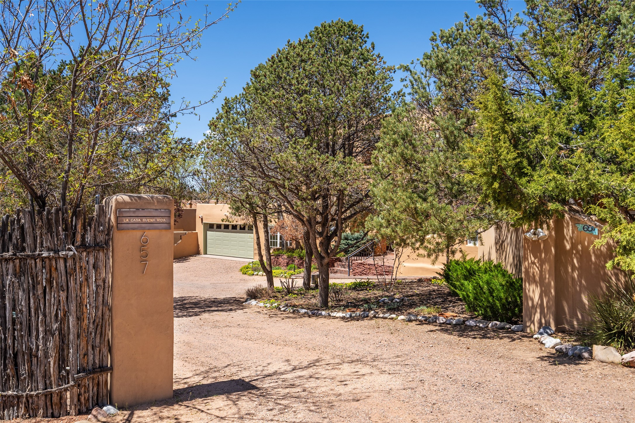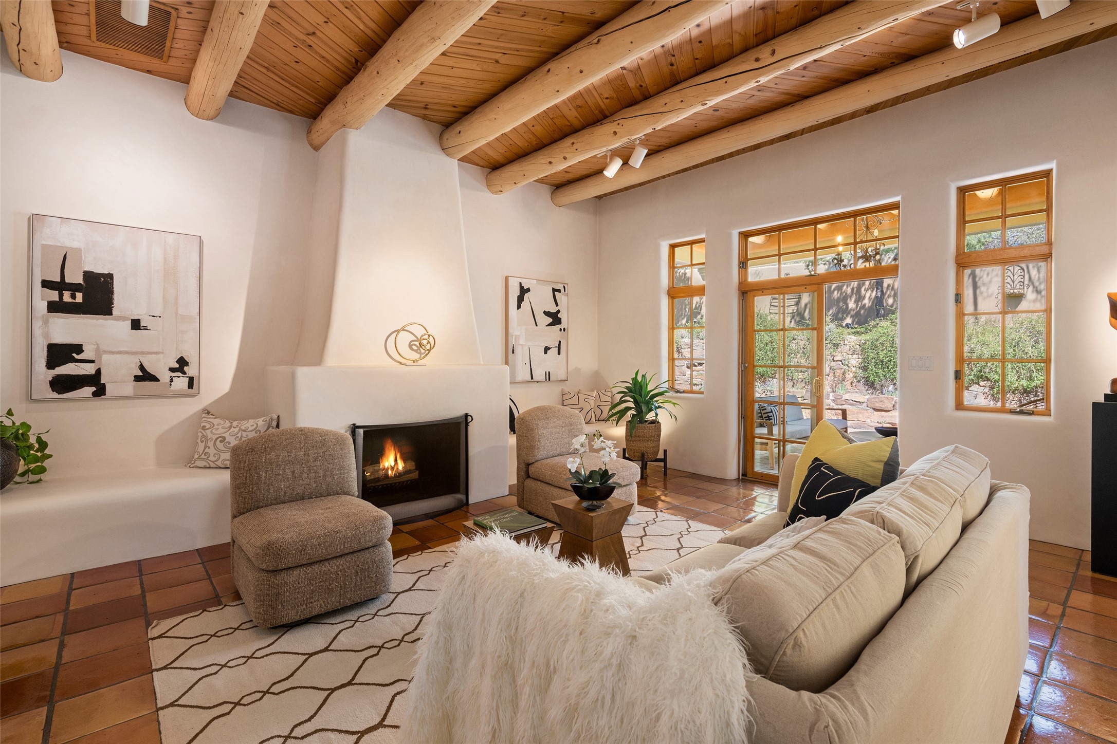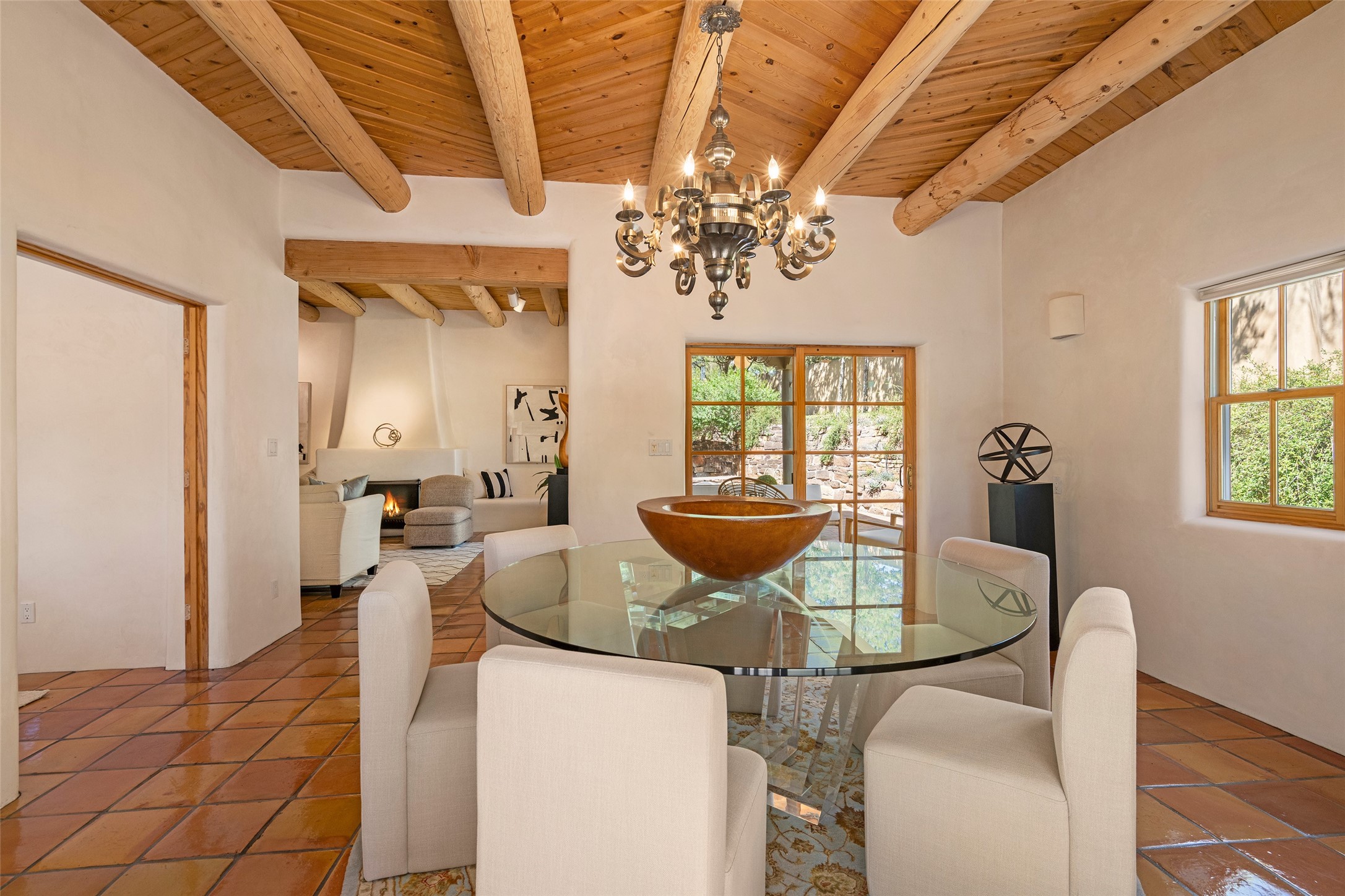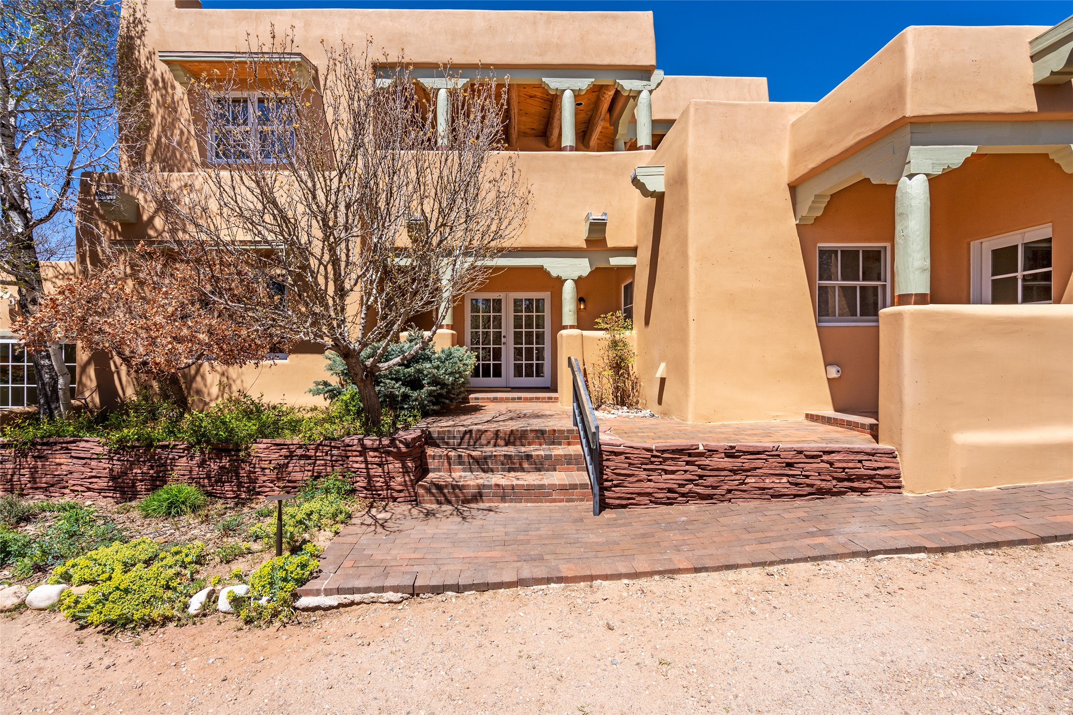 SECLUDED AT THE VERY END OF A LANE OFF GARCIA STREET THIS EASTSIDE SANTA FE HOME WITH AUTHENTIC CHARM & TIMELESS ELEGANCE HAS PHENOMENAL INDOOR/OUTDOOR ENTERTAINING SPACES COUPLED WITH A GARAGE AND PLENTY OF PRIVATE PARKING SO YOU CAN INVITE YOUR FRIENDS TO COME ENJOY TIME TOGETHER. Nestled in one of Santa Fe's most sought-after neighborhoods, just moments from the historic Plaza, this exceptional Eastside residence offers a blend of traditional Santa Fe style and refined comfort. With approximately 3,298 square feet in the main house and an additional 144 square feet in charming, attached studio, this two-story home is full of warmth, character, and rare privacy. Featuring 3 bedrooms and 4 bathrooms, the home is graced with classic Saltillo tile floors, coved ceiling treatments, and a seamless indoor-outdoor flow that celebrates the region's enchanting climate. The upstairs level offers a private retreat, ideal as a guest suite, complete with its own terrace. Outdoor living shines here - mature landscaping, a soothing water feature, a pergola-shaded grill area for al fresco dining, multiple patios, and second story terraces create the perfect setting for entertaining or quiet relaxation. Inside, both formal and informal dining areas cater to every occasion, while the attached studio offers flexible space for creativity or work. A 2-car garage, generous off-street parking, central heating and cooling, and close proximity to world-class dining, galleries, and cultural landmarks make this a rare Eastside offering. A true sanctuary in the heart of the city, this property captures the essence of Santa Fe living at its finest.