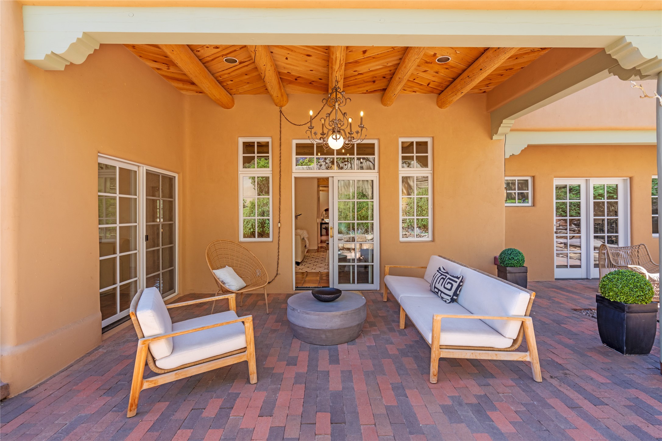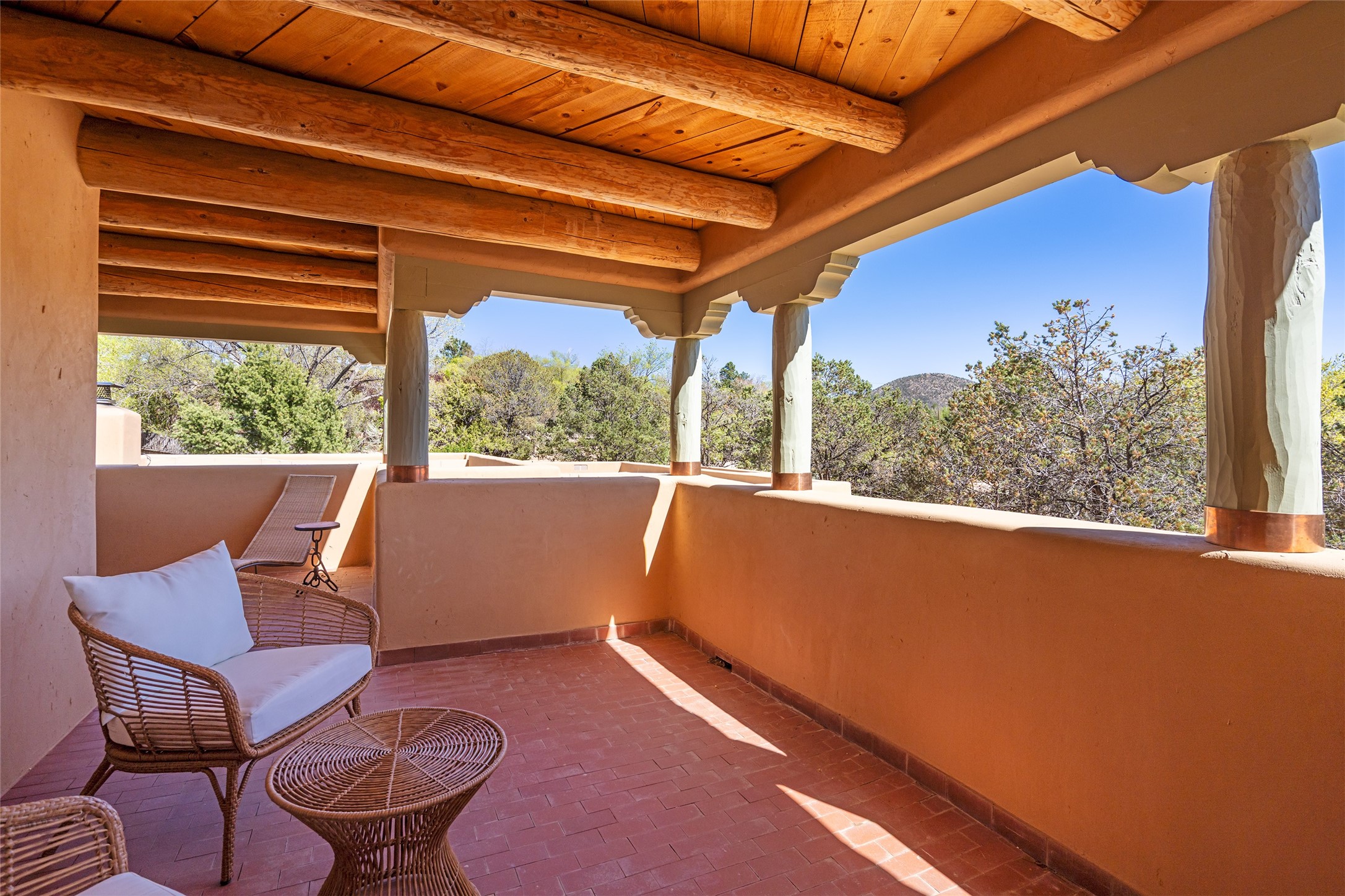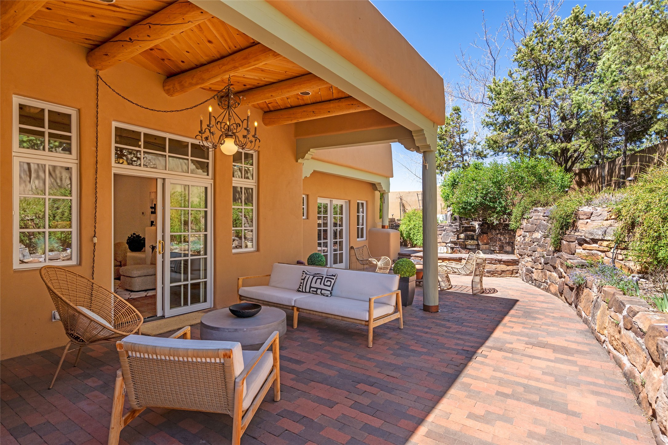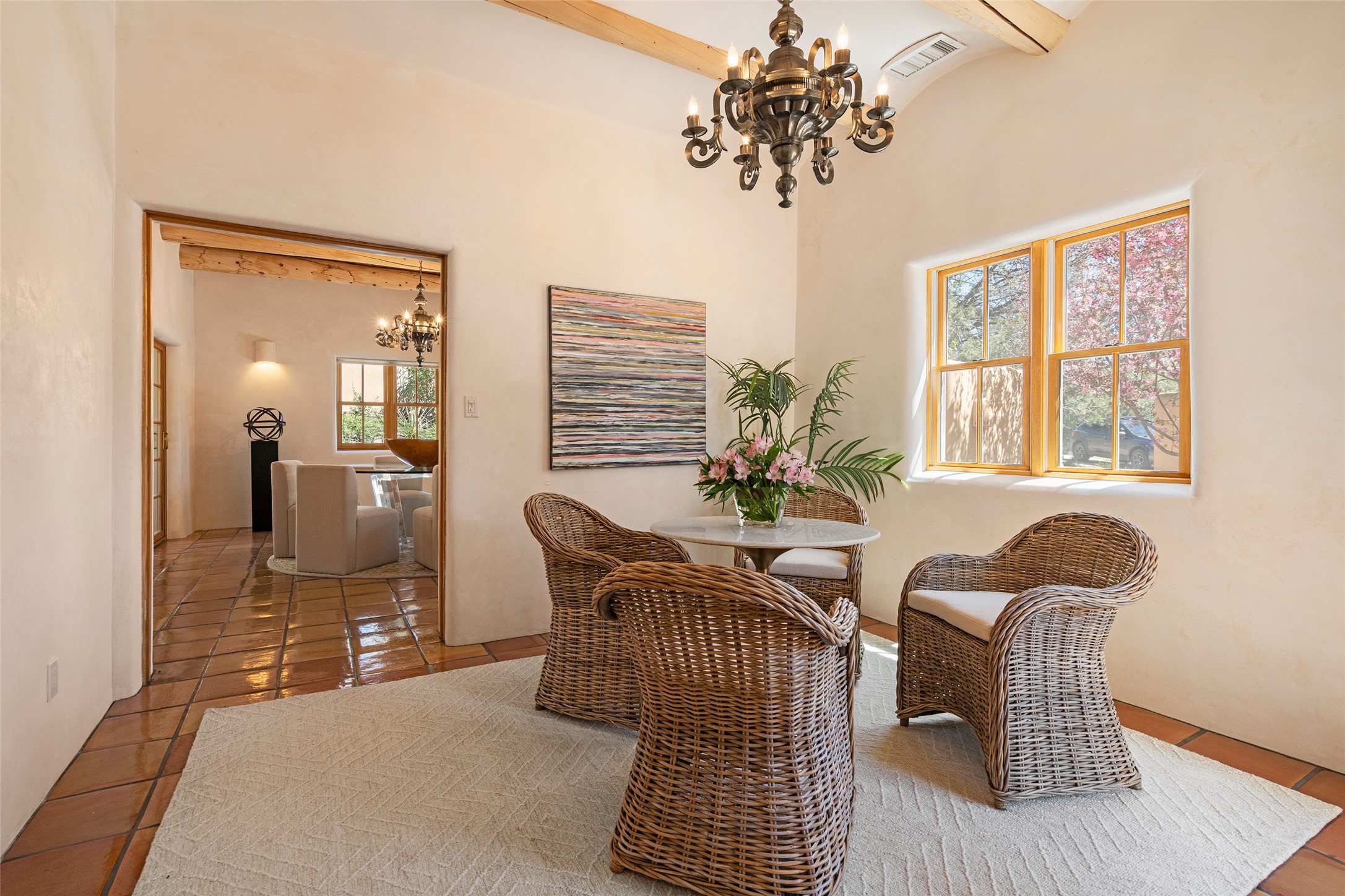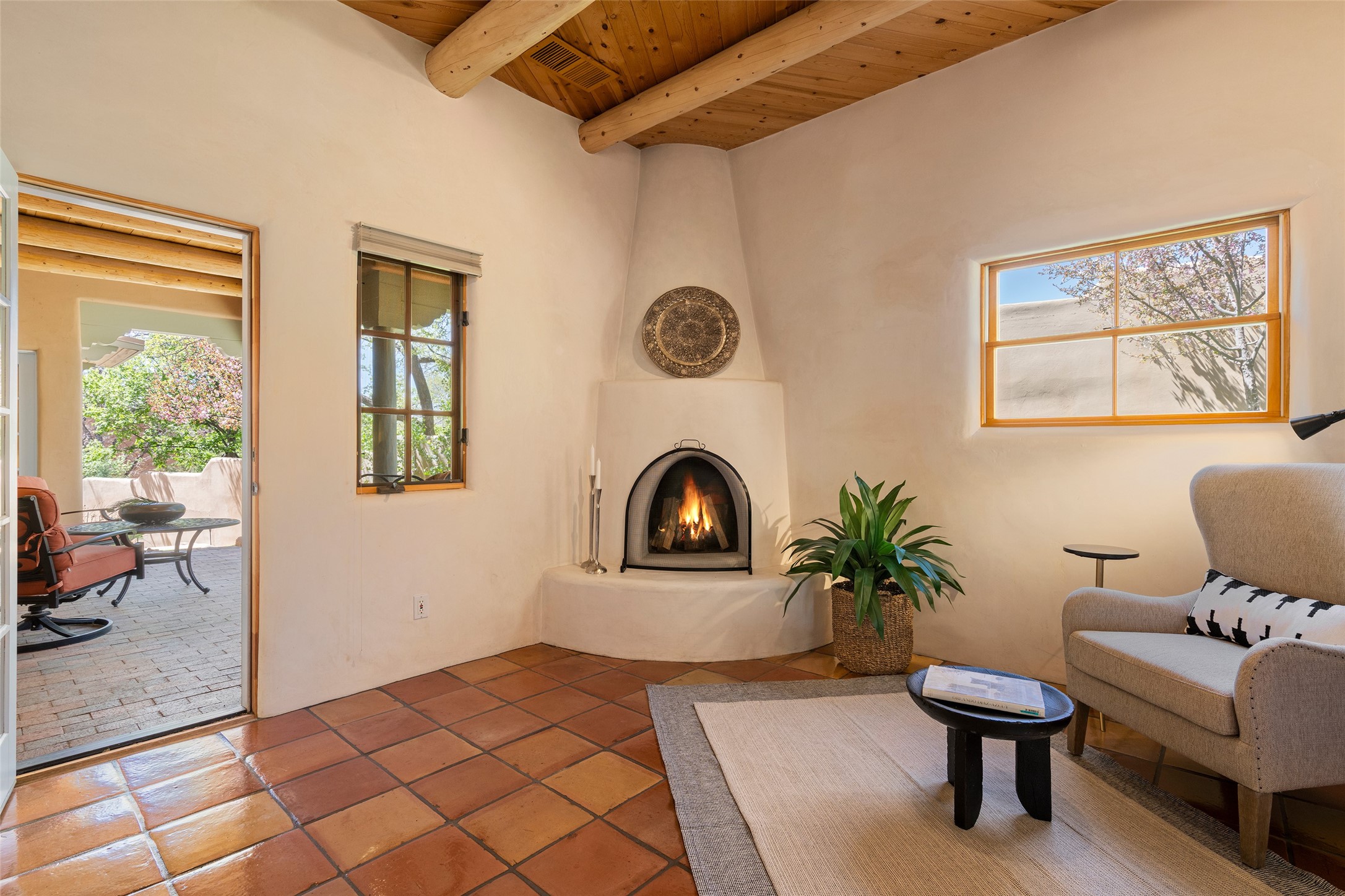 SECLUDED AT THE VERY END OF A LANE OFF GARCIA STREET THIS EASTSIDE SANTA FE HOME WITH AUTHENTIC CHARM & TIMELESS ELEGANCE HAS PHENOMENAL INDOOR/OUTDOOR ENTERTAINING SPACES COUPLED WITH A GARAGE AND PLENTY OF PRIVATE PARKING SO YOU CAN INVITE YOUR FRIENDS TO COME ENJOY TIME TOGETHER. Nestled in one of Santa Fe's most sought-after neighborhoods, just moments from the historic Plaza, this exceptional Eastside residence offers a blend of traditional Santa Fe style and refined comfort. With approximately 3,298 square feet in the main house and an additional 144 square feet in charming, attached studio, this two-story home is full of warmth, character, and rare privacy. Featuring 3 bedrooms and 4 bathrooms, the home is graced with classic Saltillo tile floors, coved ceiling treatments, and a seamless indoor-outdoor flow that celebrates the region's enchanting climate. The upstairs level offers a private retreat, ideal as a guest suite, complete with its own terrace. Outdoor living shines here - mature landscaping, a soothing water feature, a pergola-shaded grill area for al fresco dining, multiple patios, and second story terraces create the perfect setting for entertaining or quiet relaxation. Inside, both formal and informal dining areas cater to every occasion, while the attached studio offers flexible space for creativity or work. A 2-car garage, generous off-street parking, central heating and cooling, and close proximity to world-class dining, galleries, and cultural landmarks make this a rare Eastside offering. A true sanctuary in the heart of the city, this property captures the essence of Santa Fe living at its finest.