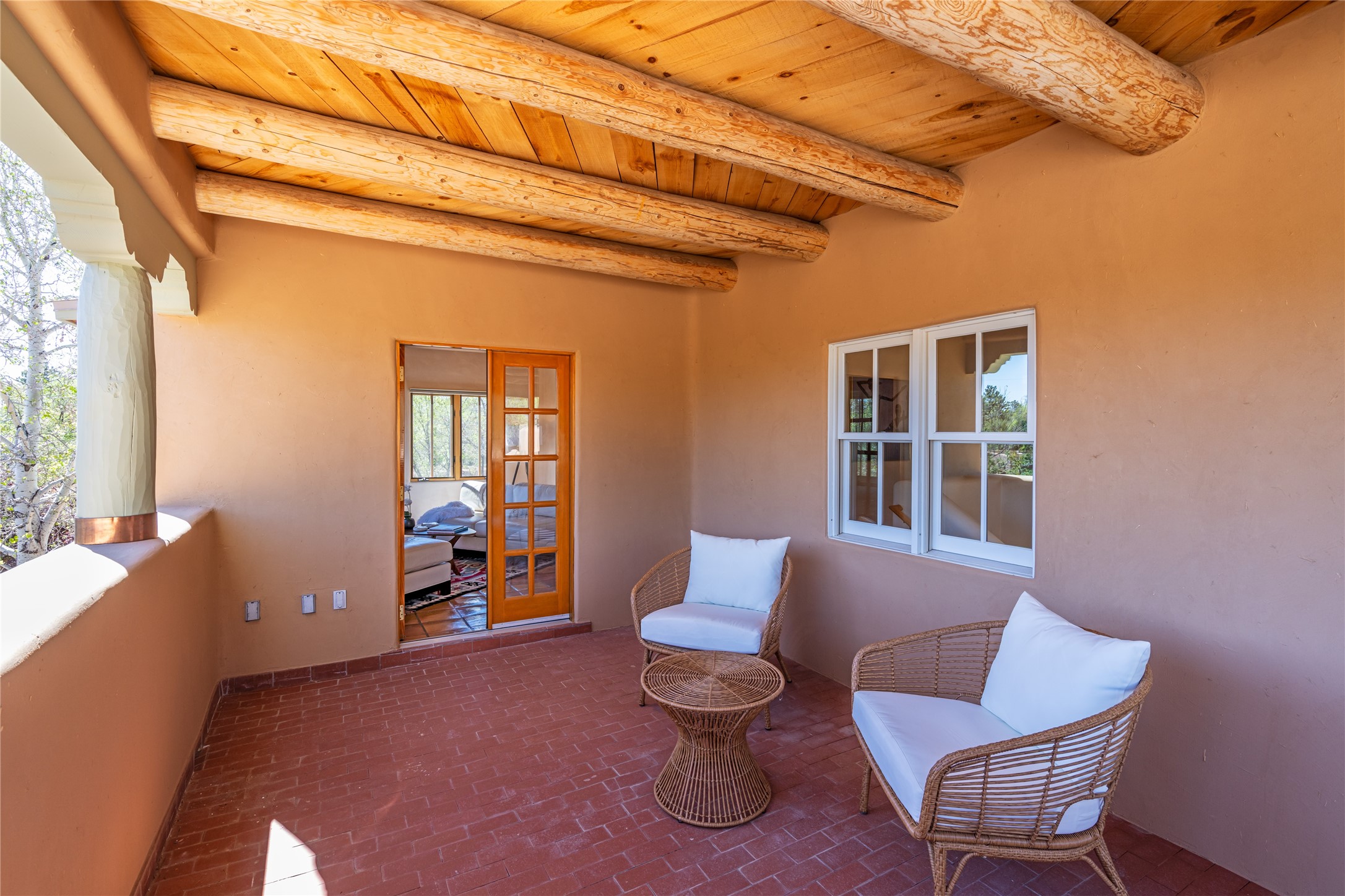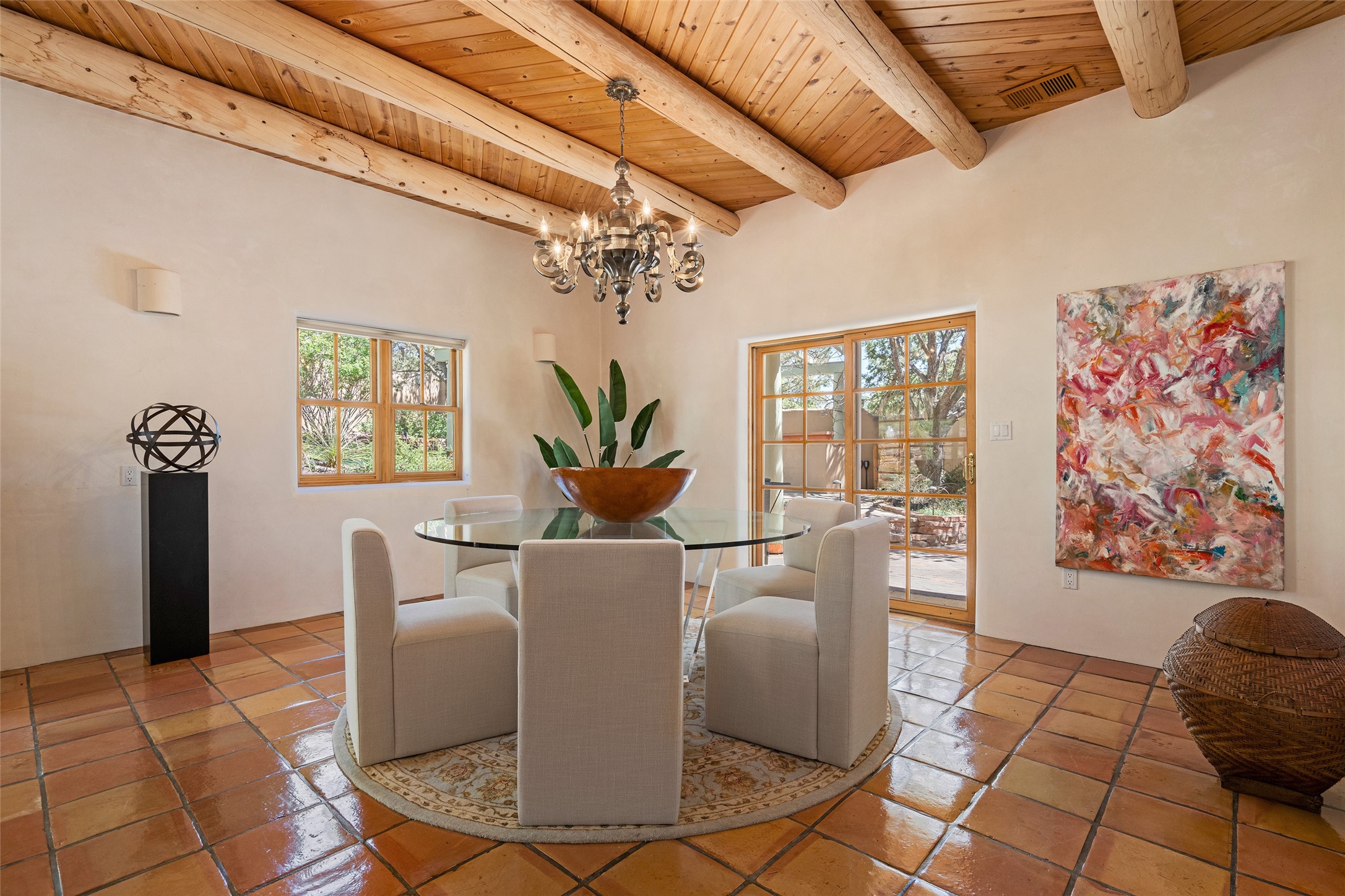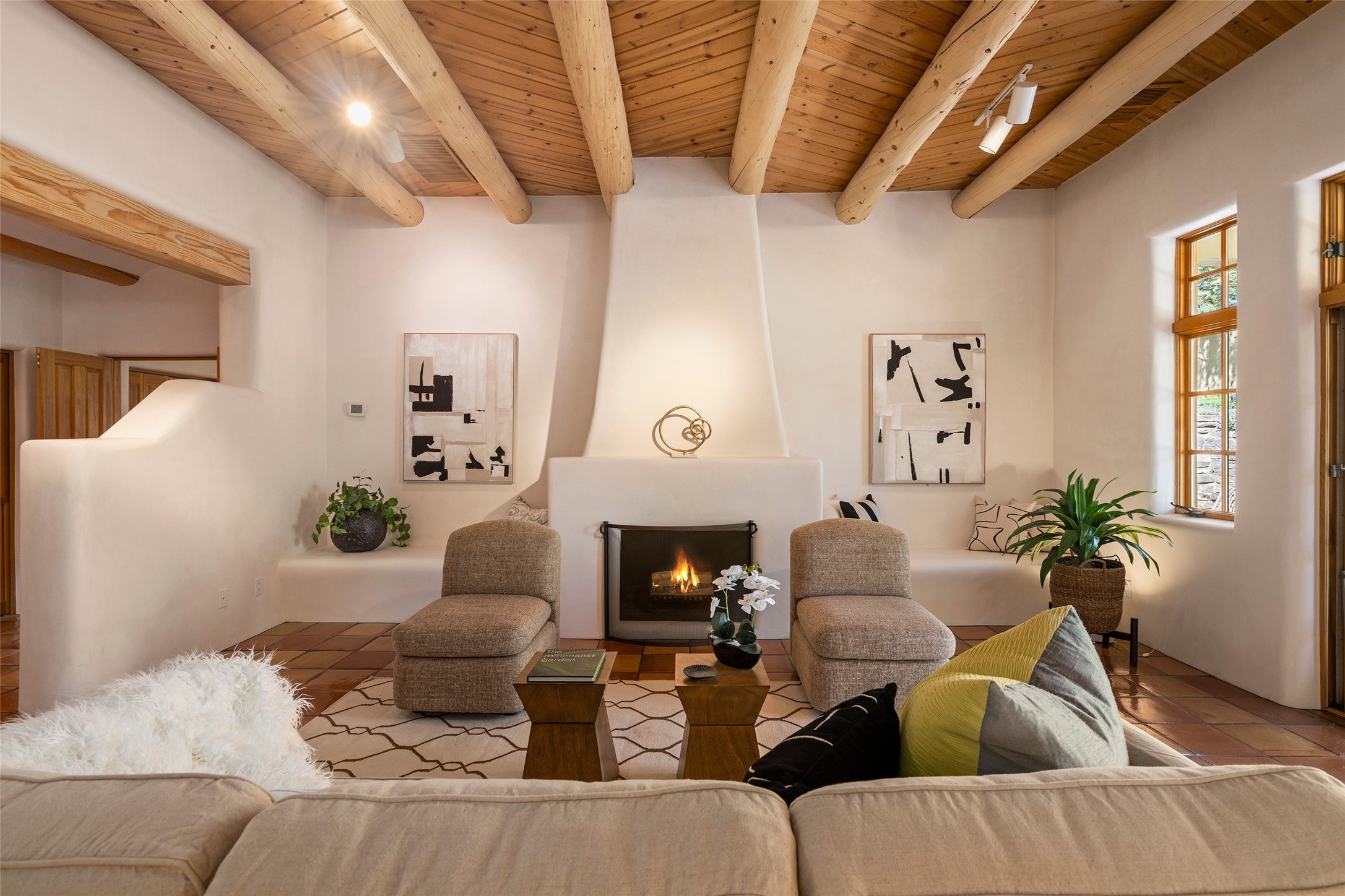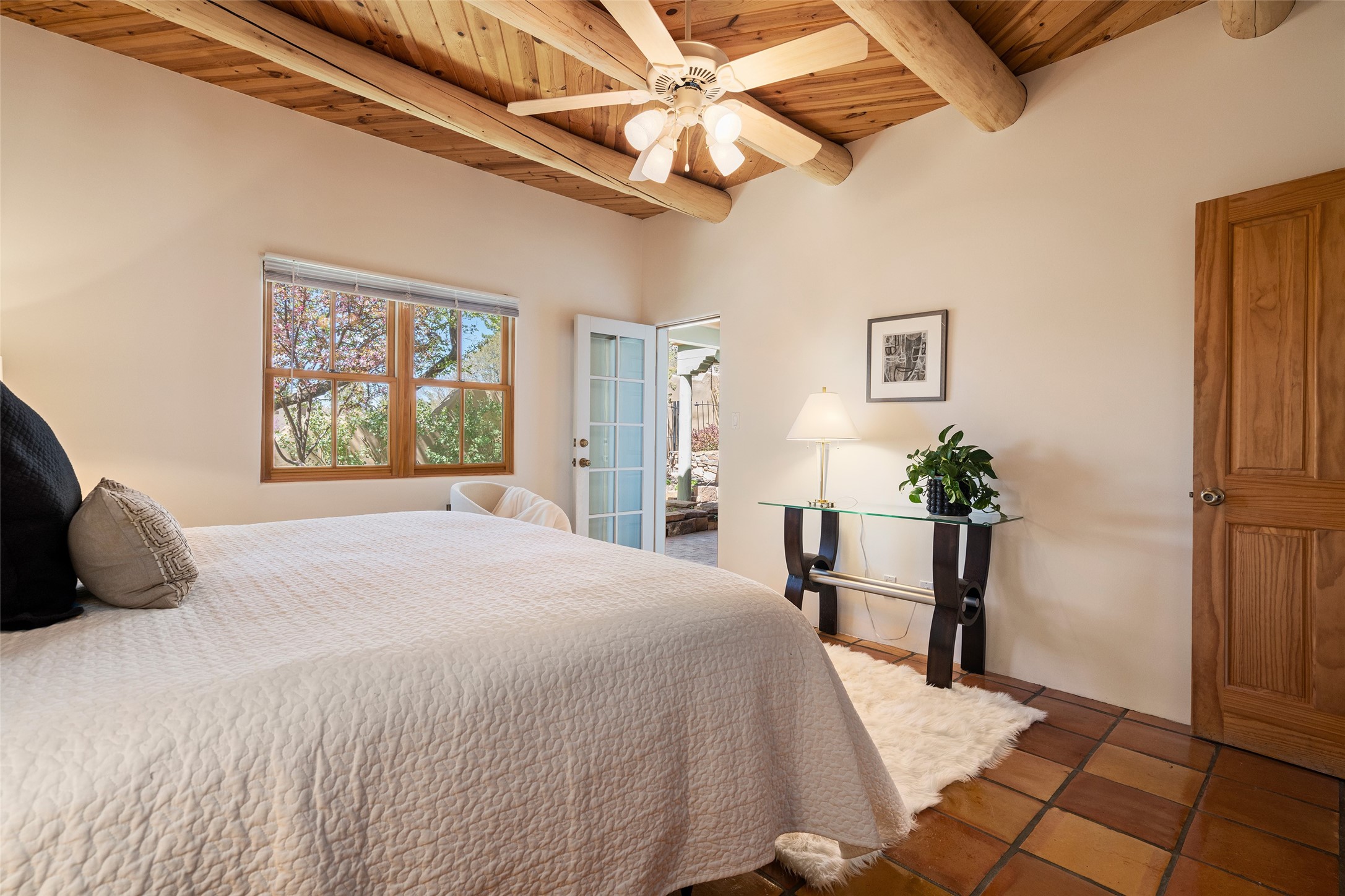 SECLUDED AT THE VERY END OF A LANE OFF GARCIA STREET THIS EASTSIDE SANTA FE HOME WITH AUTHENTIC CHARM & TIMELESS ELEGANCE HAS PHENOMENAL INDOOR/OUTDOOR ENTERTAINING SPACES COUPLED WITH A GARAGE AND PLENTY OF PRIVATE PARKING SO YOU CAN INVITE YOUR FRIENDS TO COME ENJOY TIME TOGETHER. Nestled in one of Santa Fe's most sought-after neighborhoods, just moments from the historic Plaza, this exceptional Eastside residence offers a blend of traditional Santa Fe style and refined comfort. With approximately 3,298 square feet in the main house and an additional 144 square feet in charming, attached studio, this two-story home is full of warmth, character, and rare privacy. Featuring 3 bedrooms and 4 bathrooms, the home is graced with classic Saltillo tile floors, coved ceiling treatments, and a seamless indoor-outdoor flow that celebrates the region's enchanting climate. The upstairs level offers a private retreat, ideal as a guest suite, complete with its own terrace. Outdoor living shines here - mature landscaping, a soothing water feature, a pergola-shaded grill area for al fresco dining, multiple patios, and second story terraces create the perfect setting for entertaining or quiet relaxation. Inside, both formal and informal dining areas cater to every occasion, while the attached studio offers flexible space for creativity or work. A 2-car garage, generous off-street parking, central heating and cooling, and close proximity to world-class dining, galleries, and cultural landmarks make this a rare Eastside offering. A true sanctuary in the heart of the city, this property captures the essence of Santa Fe living at its finest.
