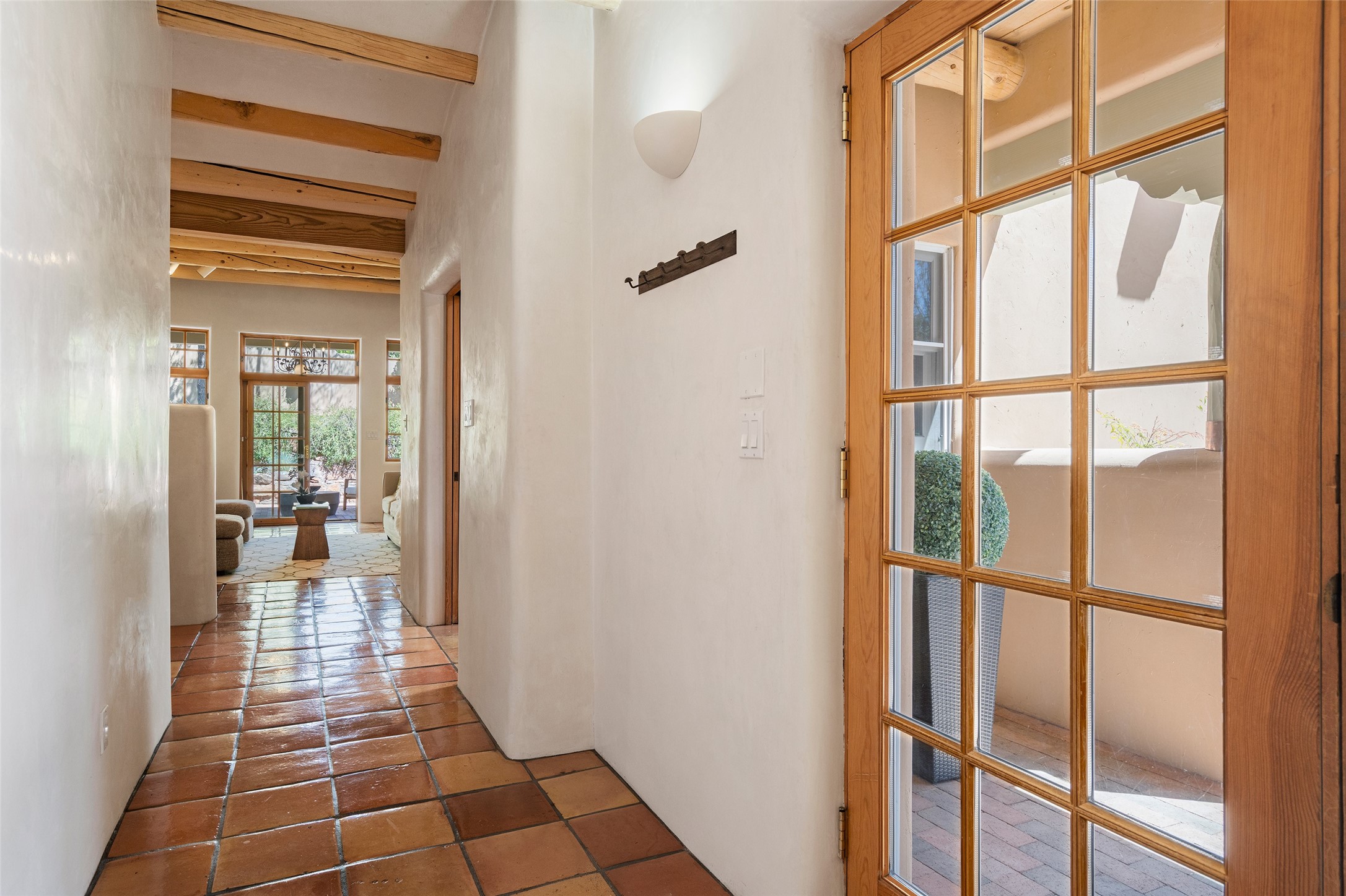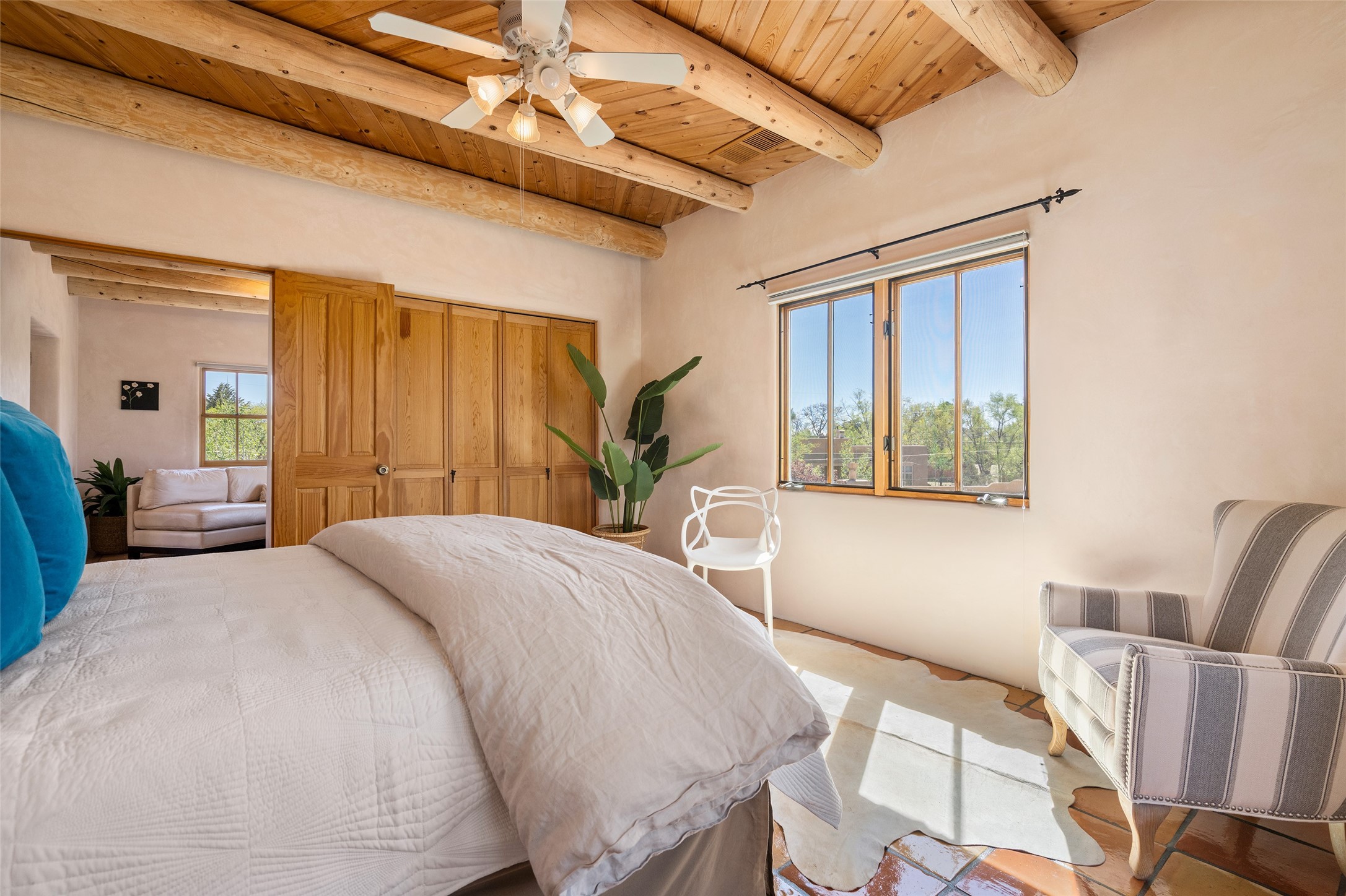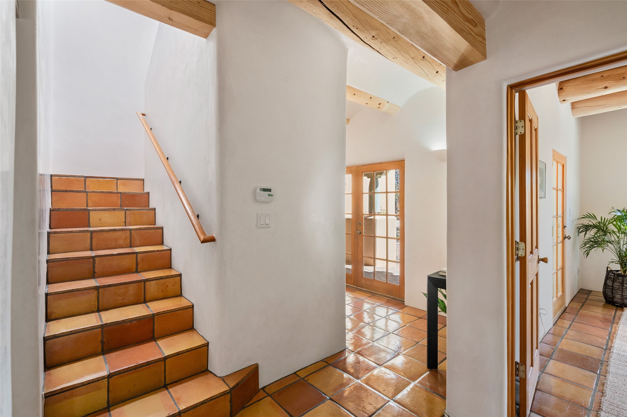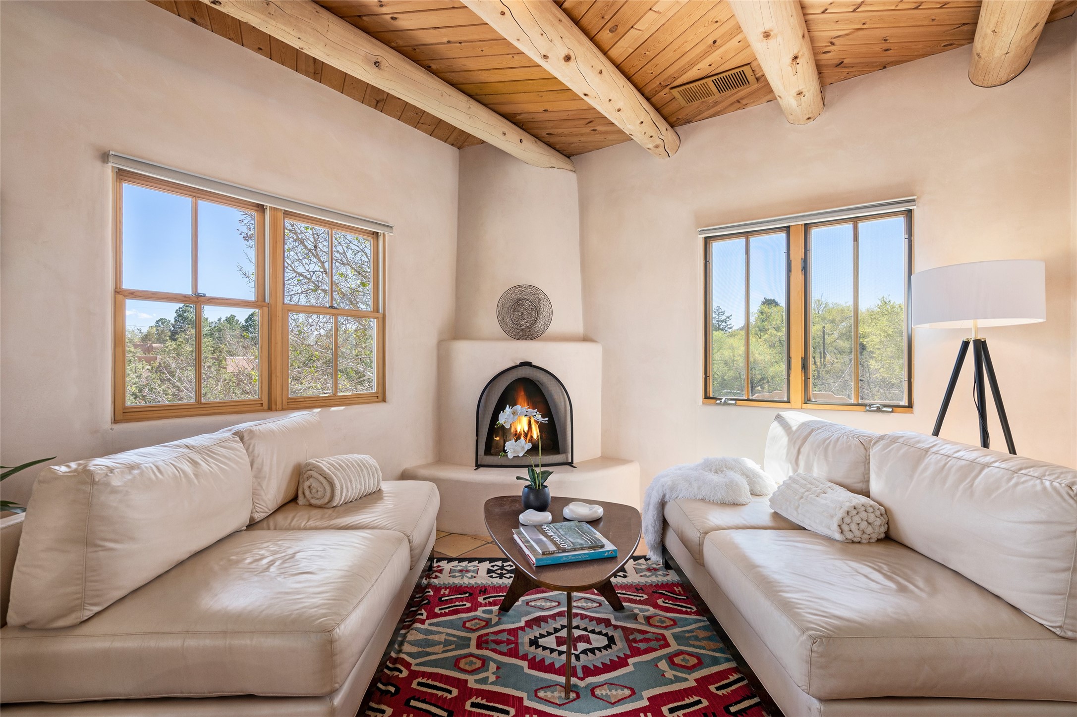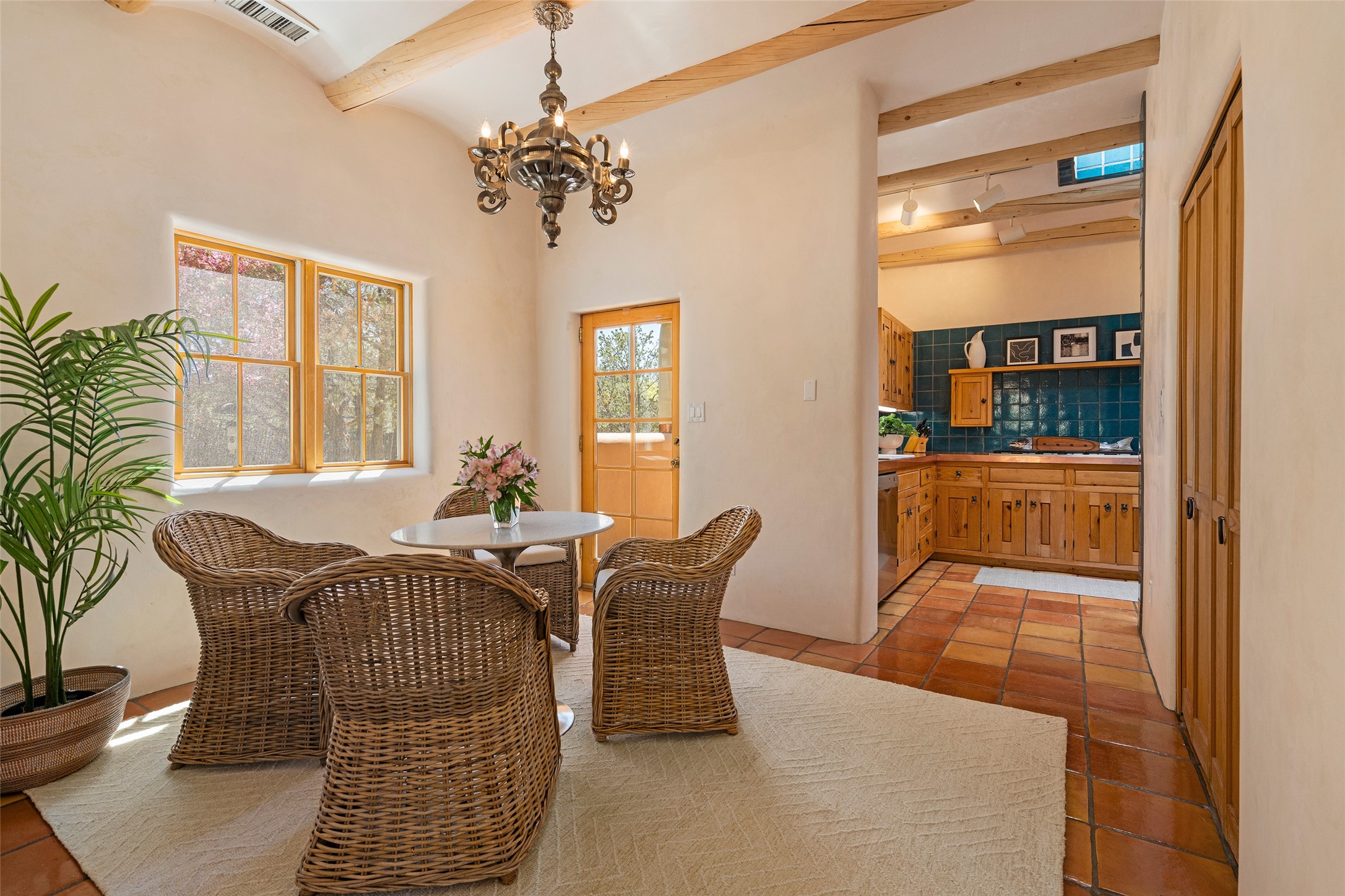SECLUDED AT THE VERY END OF A LANE OFF GARCIA STREET THIS EASTSIDE SANTA FE HOME WITH AUTHENTIC CHARM & TIMELESS ELEGANCE HAS PHENOMENAL INDOOR/OUTDOOR ENTERTAINING SPACES COUPLED WITH A GARAGE AND PLENTY OF PRIVATE PARKING SO YOU CAN INVITE YOUR FRIENDS TO COME ENJOY TIME TOGETHER. Nestled in one of Santa Fe's most sought-after neighborhoods, just moments from the historic Plaza, this exceptional Eastside residence offers a blend of traditional Santa Fe style and refined comfort. With approximately 3,298 square feet in the main house and an additional 144 square feet in charming, attached studio, this two-story home is full of warmth, character, and rare privacy. Featuring 3 bedrooms and 4 bathrooms, the home is graced with classic Saltillo tile floors, coved ceiling treatments, and a seamless indoor-outdoor flow that celebrates the region's enchanting climate. The upstairs level offers a private retreat, ideal as a guest suite, complete with its own terrace. Outdoor living shines here - mature landscaping, a soothing water feature, a pergola-shaded grill area for al fresco dining, multiple patios, and second story terraces create the perfect setting for entertaining or quiet relaxation. Inside, both formal and informal dining areas cater to every occasion, while the attached studio offers flexible space for creativity or work. A 2-car garage, generous off-street parking, central heating and cooling, and close proximity to world-class dining, galleries, and cultural landmarks make this a rare Eastside offering. A true sanctuary in the heart of the city, this property captures the essence of Santa Fe living at its finest.