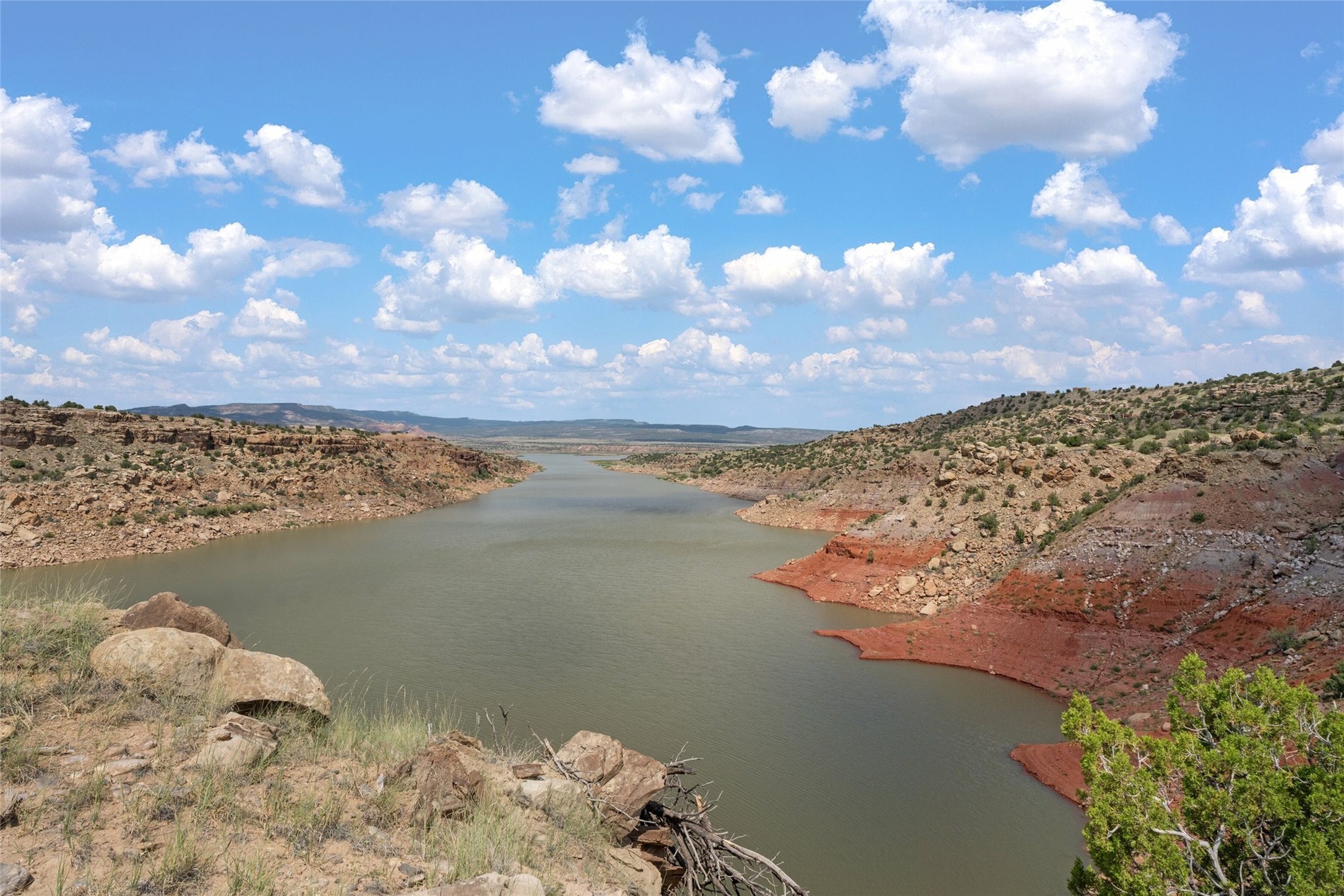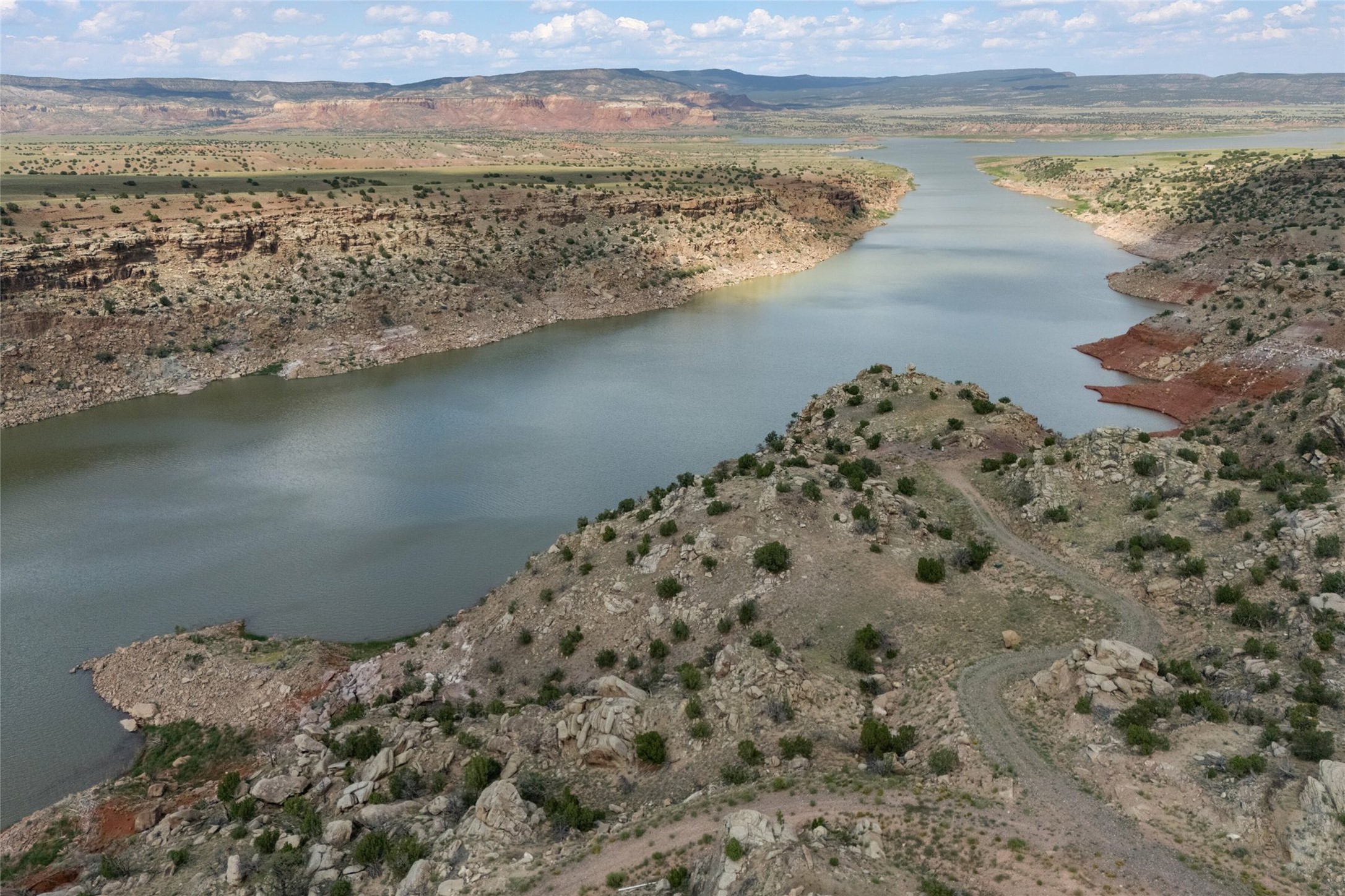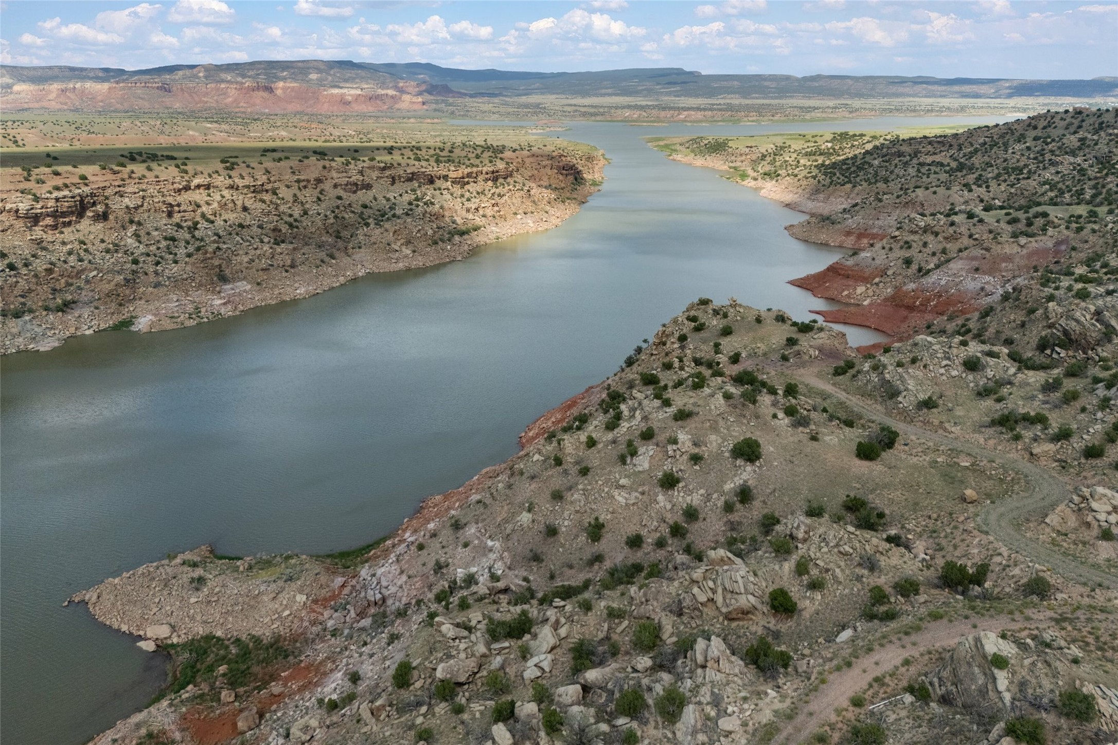 Who has waterfront property in New Mexico? It is unheard of! And yet, there is a rare, very special 14.49 acre view parcel right on the water at Lake Abiquiu! It sits on a private, majestic ridge surrounded by panoramas of Ghost Ranch and the legendary multi-colored cliffs memorialized in Georgia O'Keeffe's art, with views and access all the way up the Chama river as well. There are several spectacular building sites to choose from, magnificent character rocks, total privacy, peace, silence and tranquility in overwhelming beauty, looking out over the world and Lake Abiquiu. Electric is in, and a shared well, plus membership in the private community Lot 16 boat ramp and picnic area. 5 minutes to Abiquiu, an hour from Santa Fe, and a short drive south of the Colorado border, this is a once in a lifetime opportunity to experience waterfront property in New Mexico!