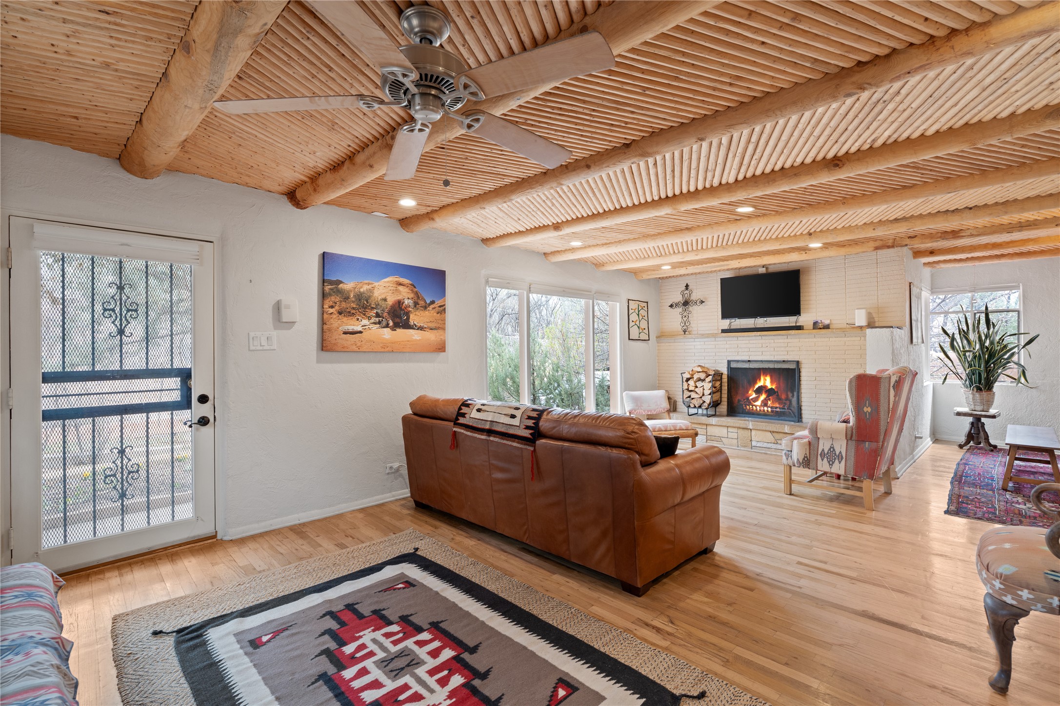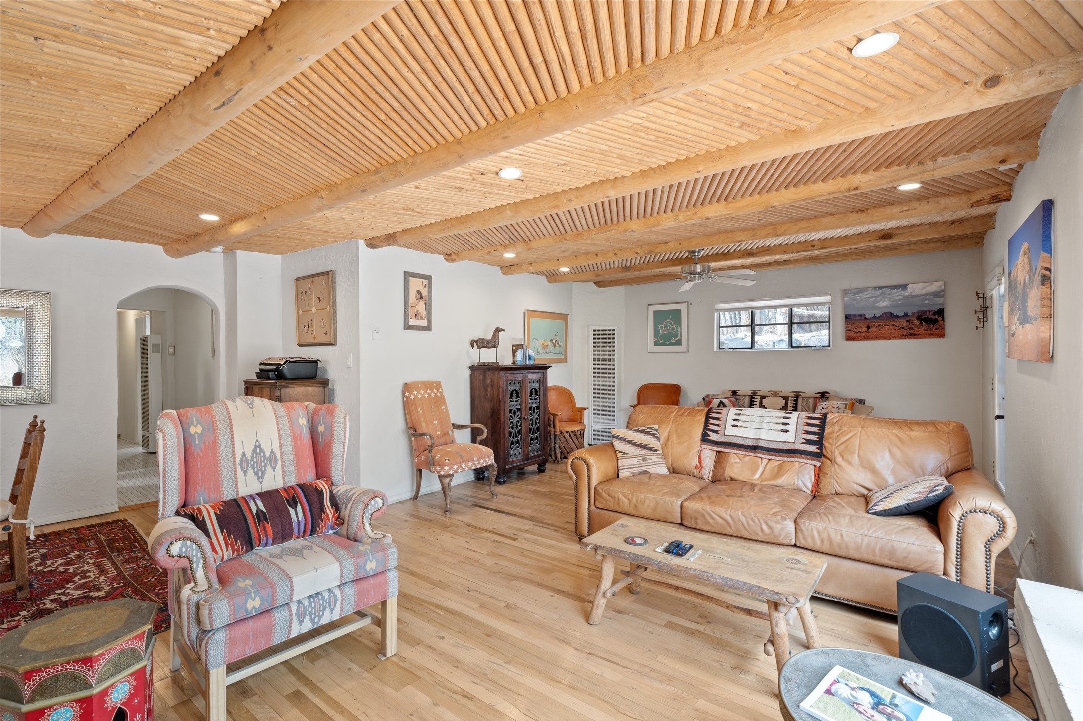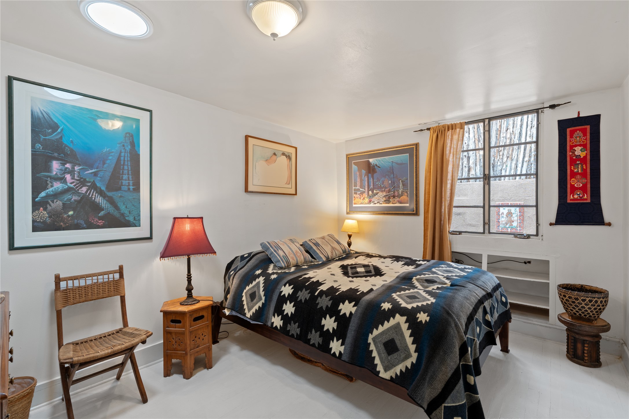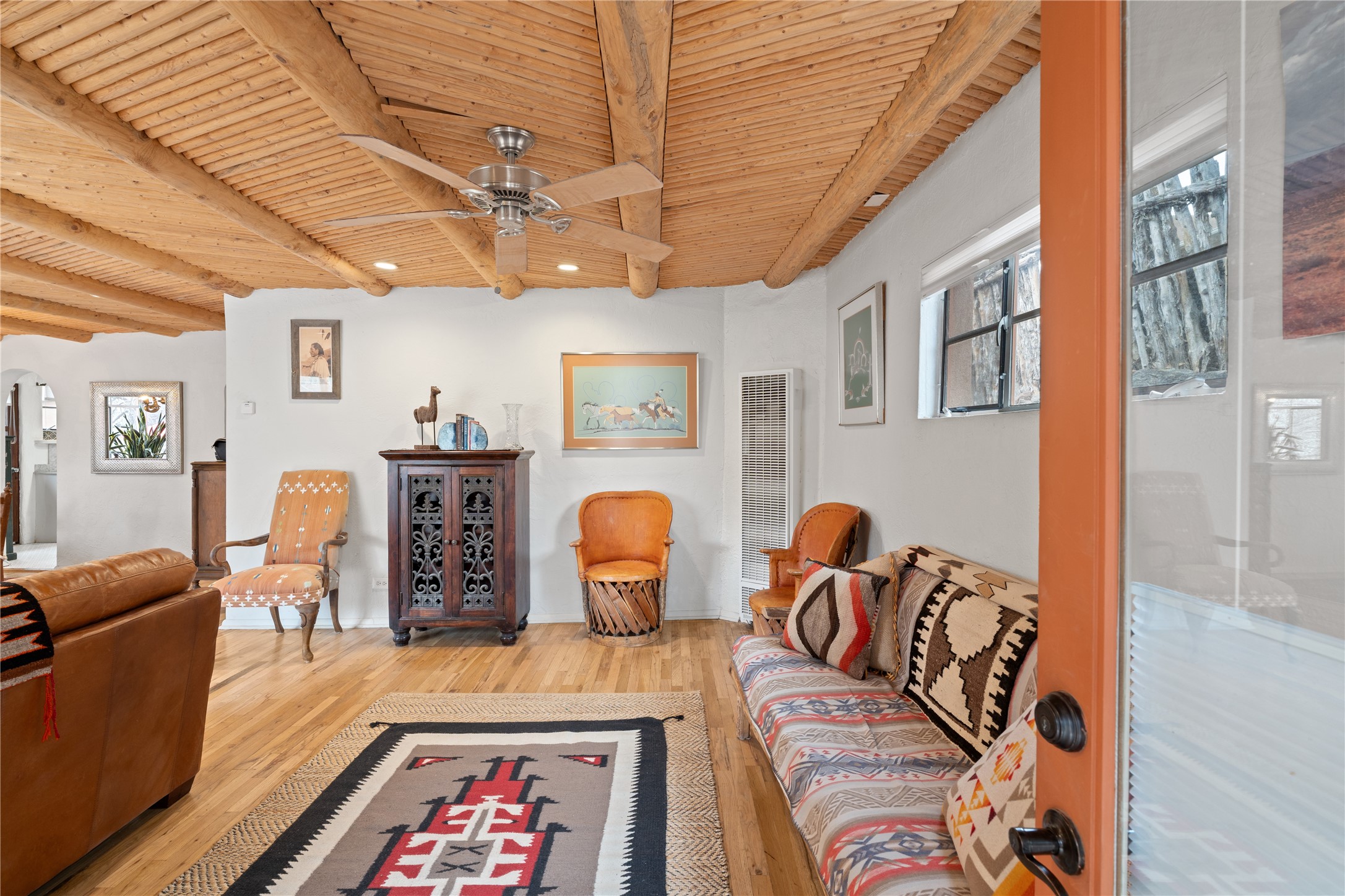 SHADE - TREES - WATER - all supreme attributes in this highly desirable location, as this historic Eastside pied-a-terre awaits at the east end of The Alameda with unlimited opportunities to enjoy the numerous old-growth large trees prevalent in the immediate area, water in the adjacent Acequia de la Muralla, and the popular and nurturing Santa Fe River walk along Camino Pequeno with its nature preserves and bird sanctuaries, and nearby Patrick Smith Park, the Water Park, and Canyon Road - all within a block or two and minutes from your new sanctuary. Hardwood floors, vigas and latillas, a living room fireplace, a ceiling fan, a private patio, an additional storage room (outside access), new kitchen appliances and upgrades, a new roof (2020) are some of the amenities and features of this home. As for the property's history, the original deed was conveyed to Salvador Gonzales in 1742 as the Canada Ancha Grant or Salvador Gonzales Grant consisting of approximately 200 acres of land from Gonzales Road to the hills of Cerro Gordo, from the Rio Santa Fe to Hyde Park Road. Lourdes Padilla Abeyta, a member of the Gonzales family and clan inherited the adobe casita in the 1940s from her parents, and her husband, a builder and mason, remodeled the original two rooms (today's bedrooms) and added all the other rooms and fireplace in the early 1950s. Opportunity knocks - rewards beckon - who will answer the call?