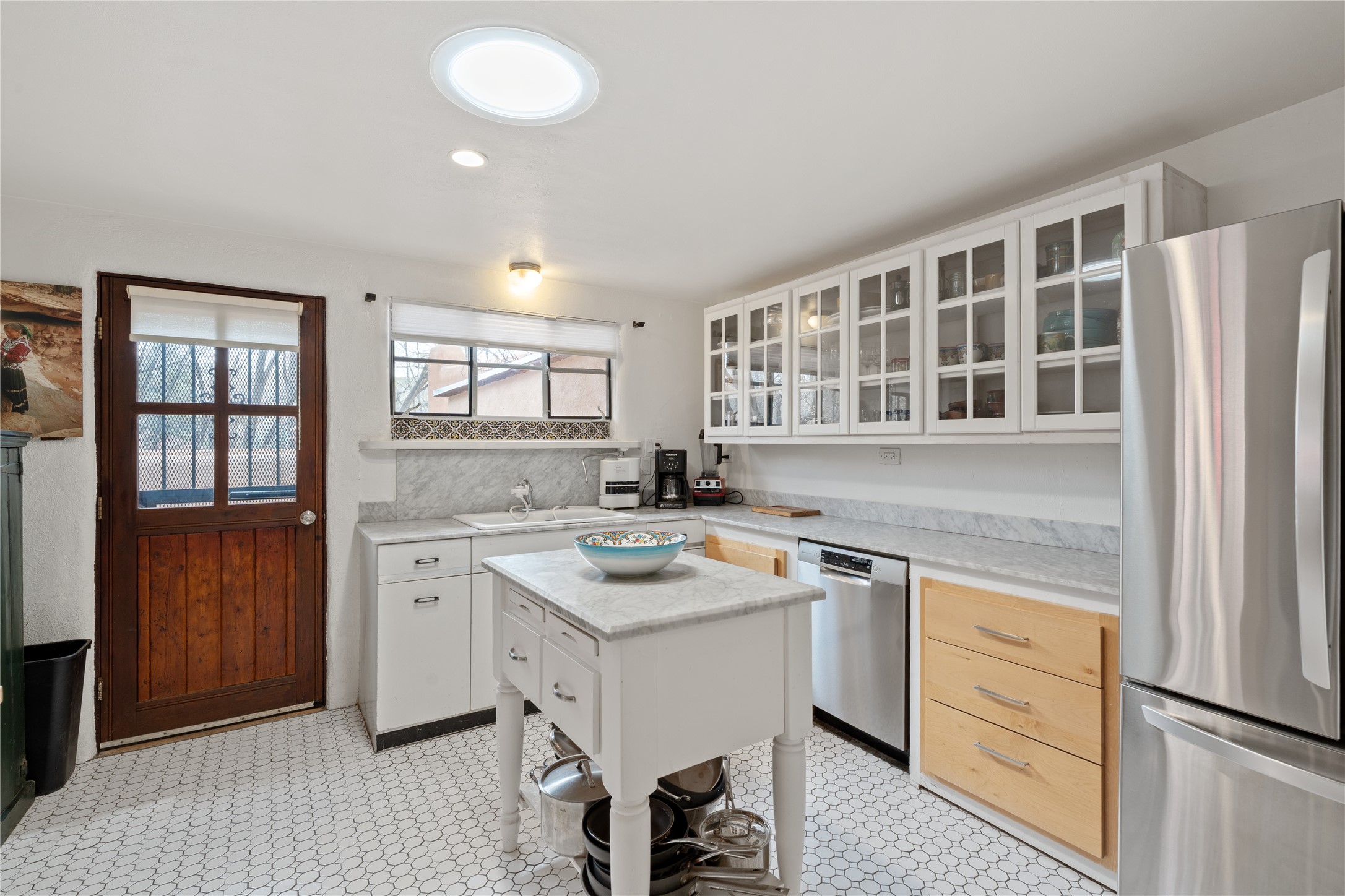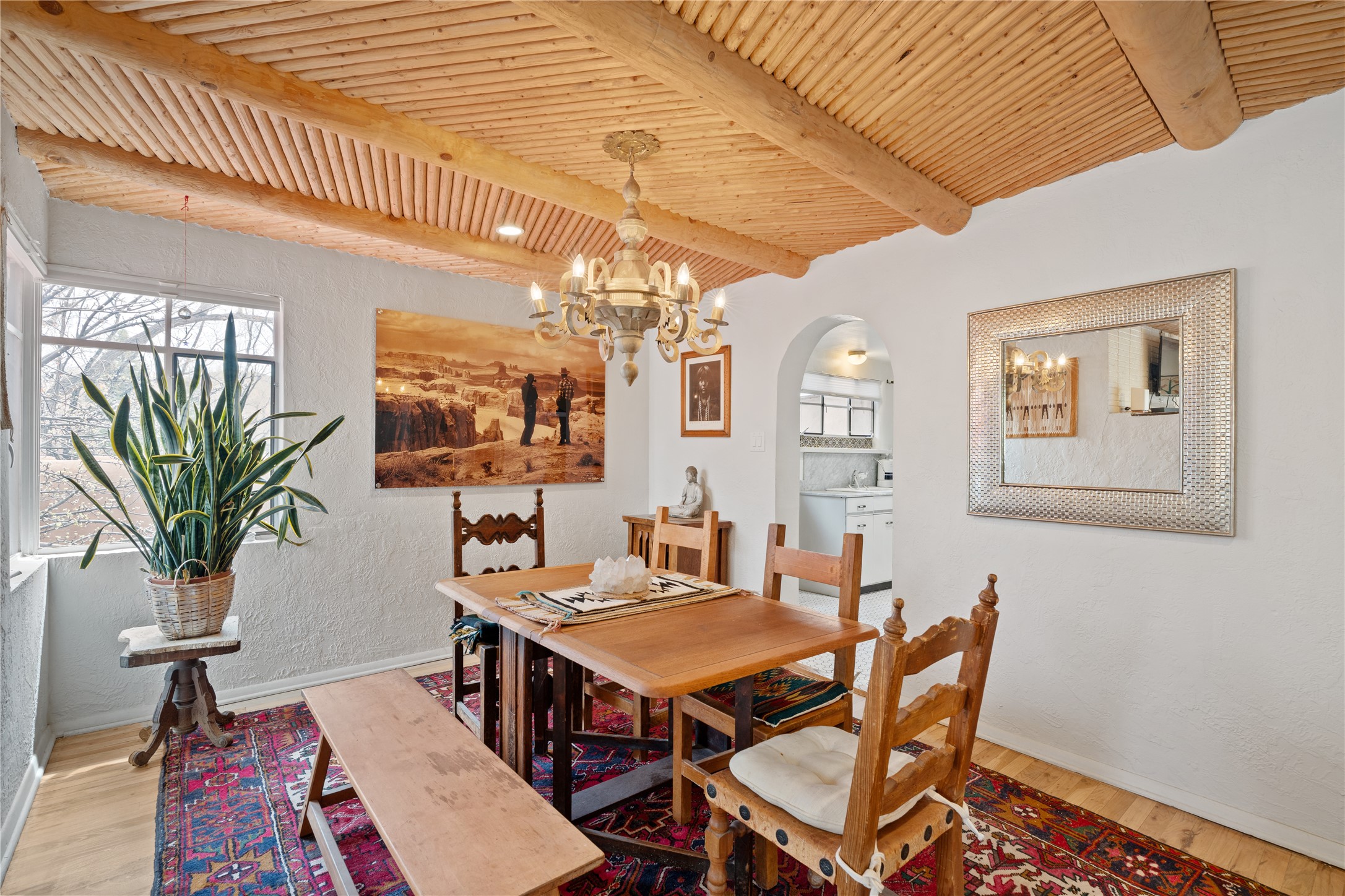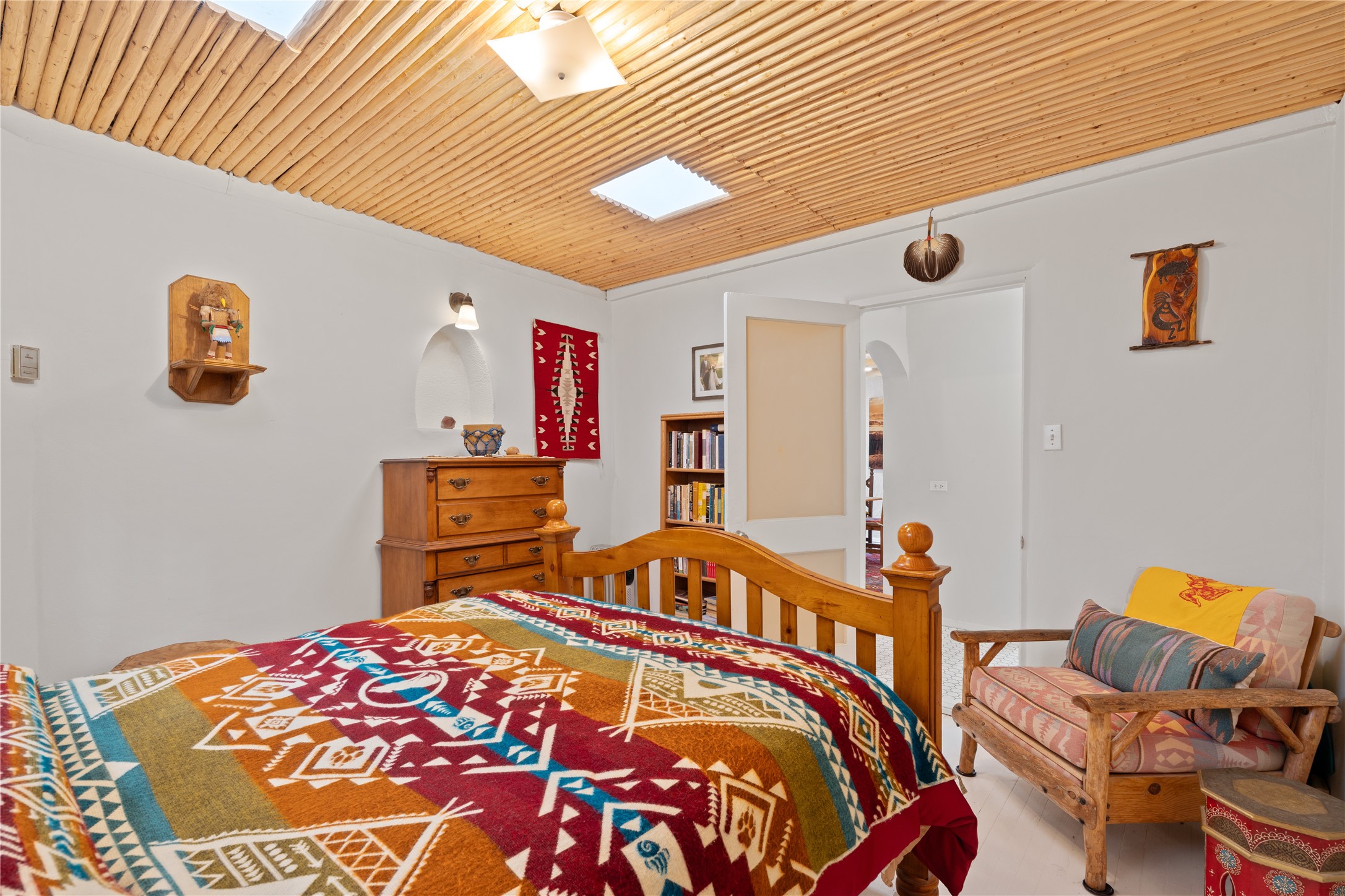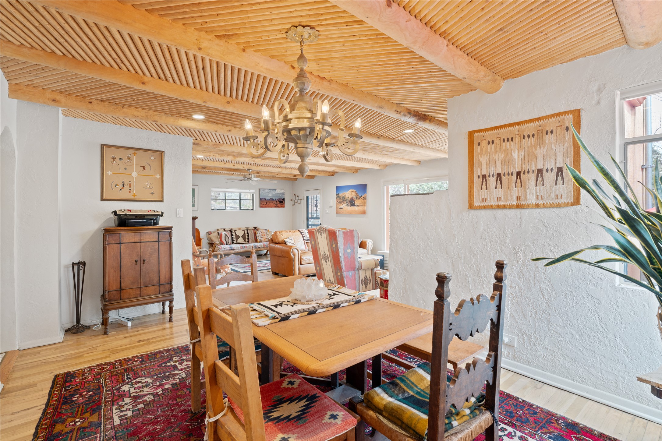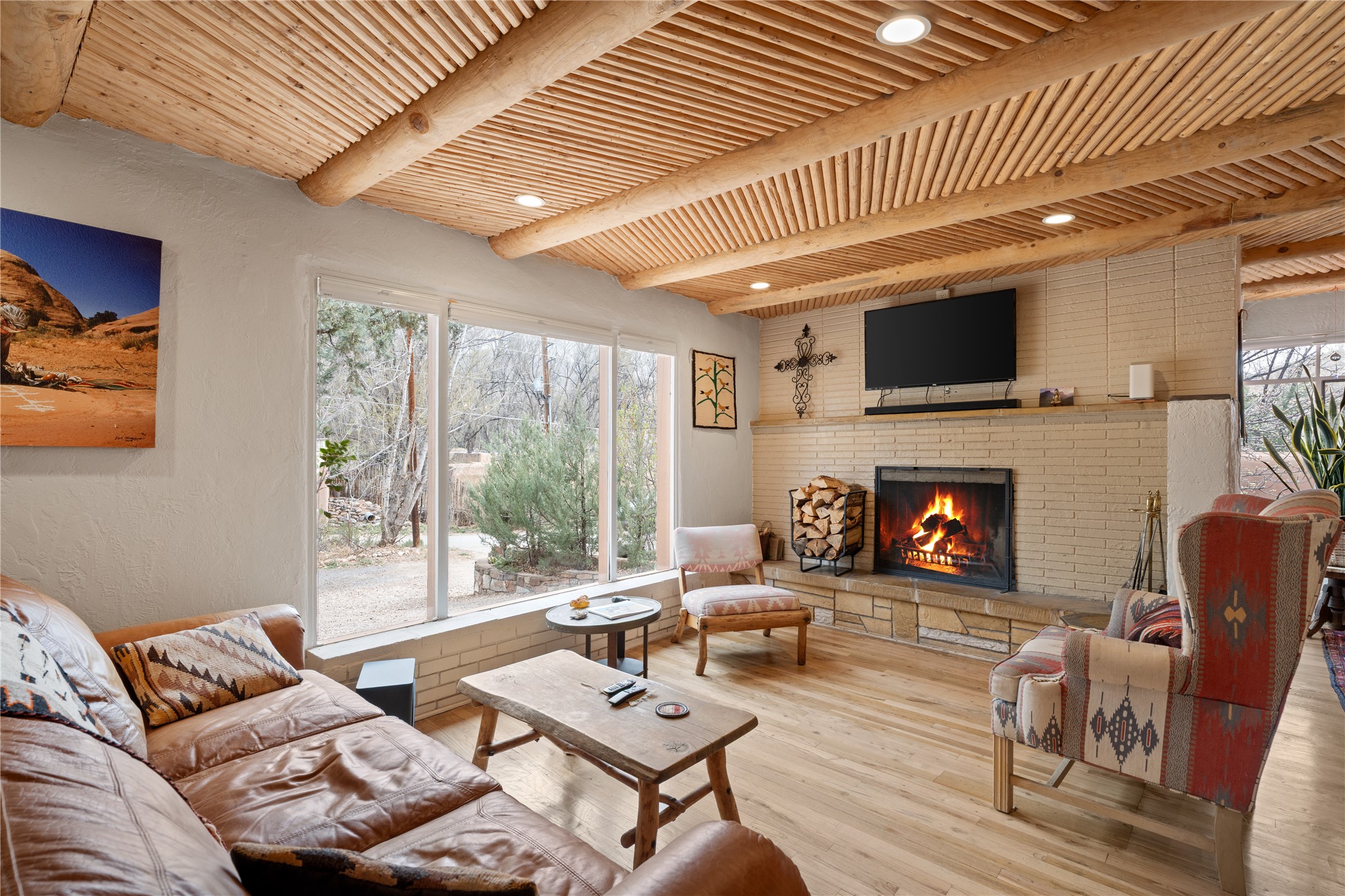 SHADE - TREES - WATER - all supreme attributes in this highly desirable location, as this historic Eastside pied-a-terre awaits at the east end of The Alameda with unlimited opportunities to enjoy the numerous old-growth large trees prevalent in the immediate area, water in the adjacent Acequia de la Muralla, and the popular and nurturing Santa Fe River walk along Camino Pequeno with its nature preserves and bird sanctuaries, and nearby Patrick Smith Park, the Water Park, and Canyon Road - all within a block or two and minutes from your new sanctuary. Hardwood floors, vigas and latillas, a living room fireplace, a ceiling fan, a private patio, an additional storage room (outside access), new kitchen appliances and upgrades, a new roof (2020) are some of the amenities and features of this home. As for the property's history, the original deed was conveyed to Salvador Gonzales in 1742 as the Canada Ancha Grant or Salvador Gonzales Grant consisting of approximately 200 acres of land from Gonzales Road to the hills of Cerro Gordo, from the Rio Santa Fe to Hyde Park Road. Lourdes Padilla Abeyta, a member of the Gonzales family and clan inherited the adobe casita in the 1940s from her parents, and her husband, a builder and mason, remodeled the original two rooms (today's bedrooms) and added all the other rooms and fireplace in the early 1950s. Opportunity knocks - rewards beckon - who will answer the call?