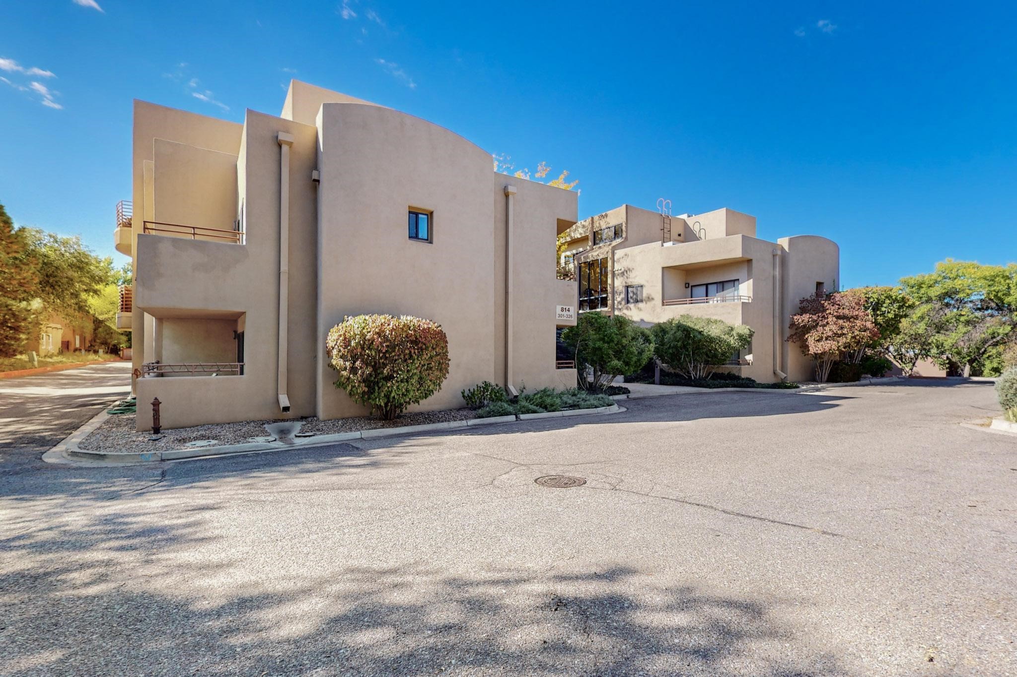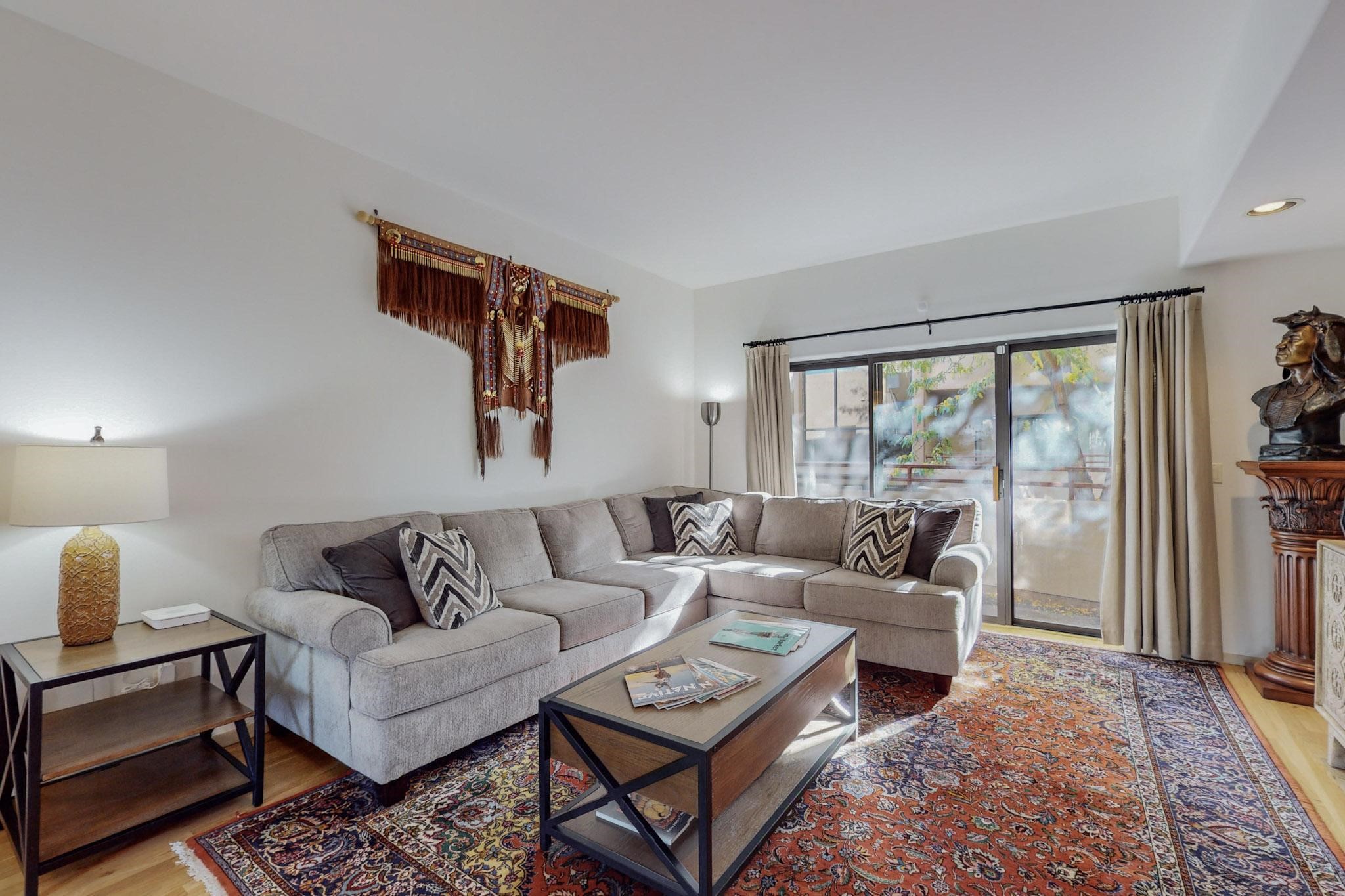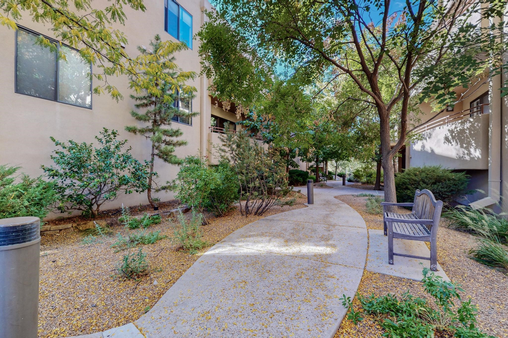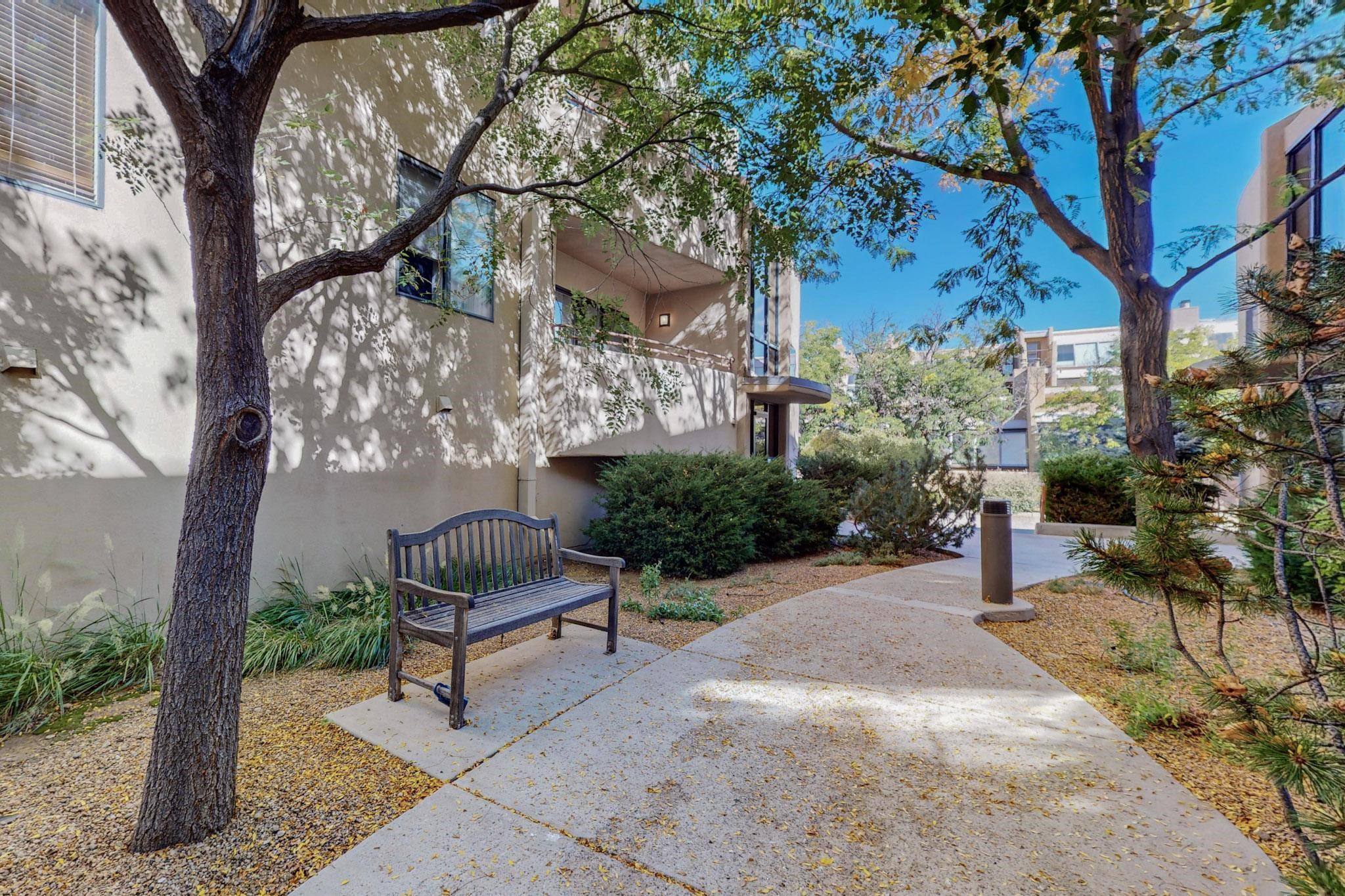 This beautiful home is an urban oasis surrounded by mature trees in a superb midtown location with beautifully inviting landscaped entry and walkways. Close to restaurants and shopping! Perfect for access to walking trails, biking or catching the Rail Runner train just a few blocks away. An upscale and mildly contemporary condo with 2 spacious balconies overlooking a courtyard with lots of greenery, and to the west, views of the Jemez mountains and magnificent colorful sunsets. Light filled, open and very comfortable floor plan with a large, exciting kitchen that includes granite counters and substantial cabinet space including a spacious pantry. The warm hardwood flooring adds additional beauty and dimensions to the home's spacious living area and lends itself well to a variety of layouts. Two comfortable bedrooms, a large bathroom for two and centrally located utility room with a washer & dryer. A surprisingly large 6.50' X 17' ground floor personal storage unit for your seasonal items and sports equipment. Covered parking keeps your vehicle protected from the elements. A NEW roof was added in 2024 and NEW stucco will be going in 2025! This very private and quiet location is centrally located, very affordable for Santa Fe, and is ready for you to call it home!