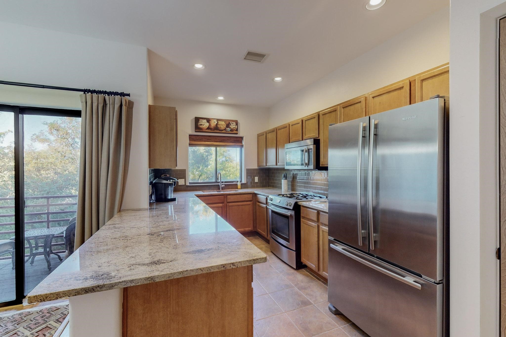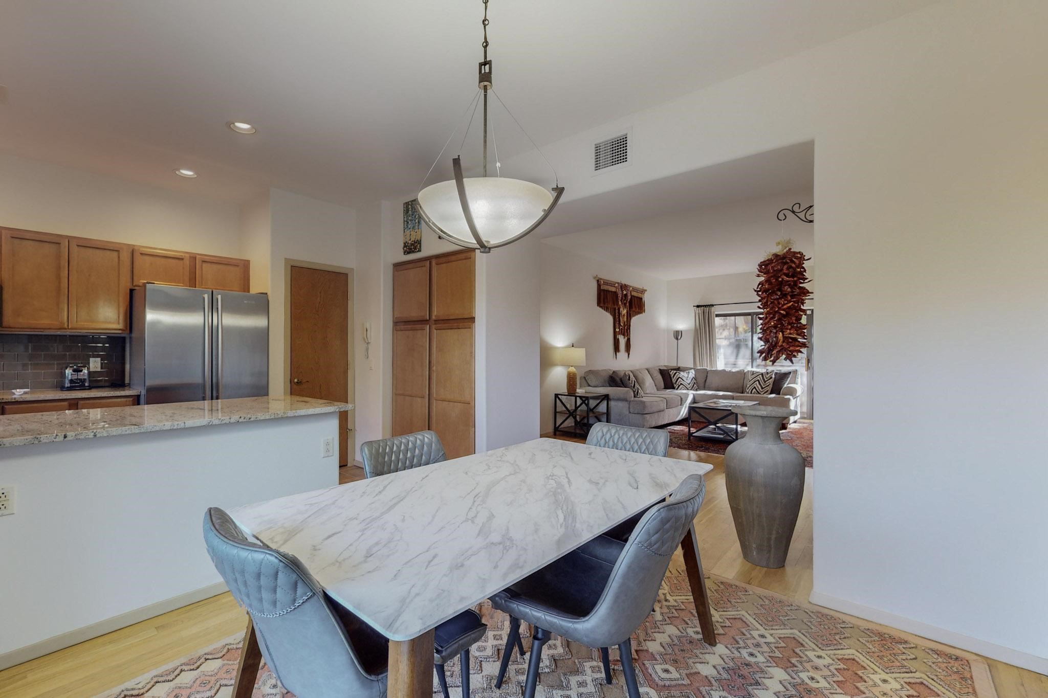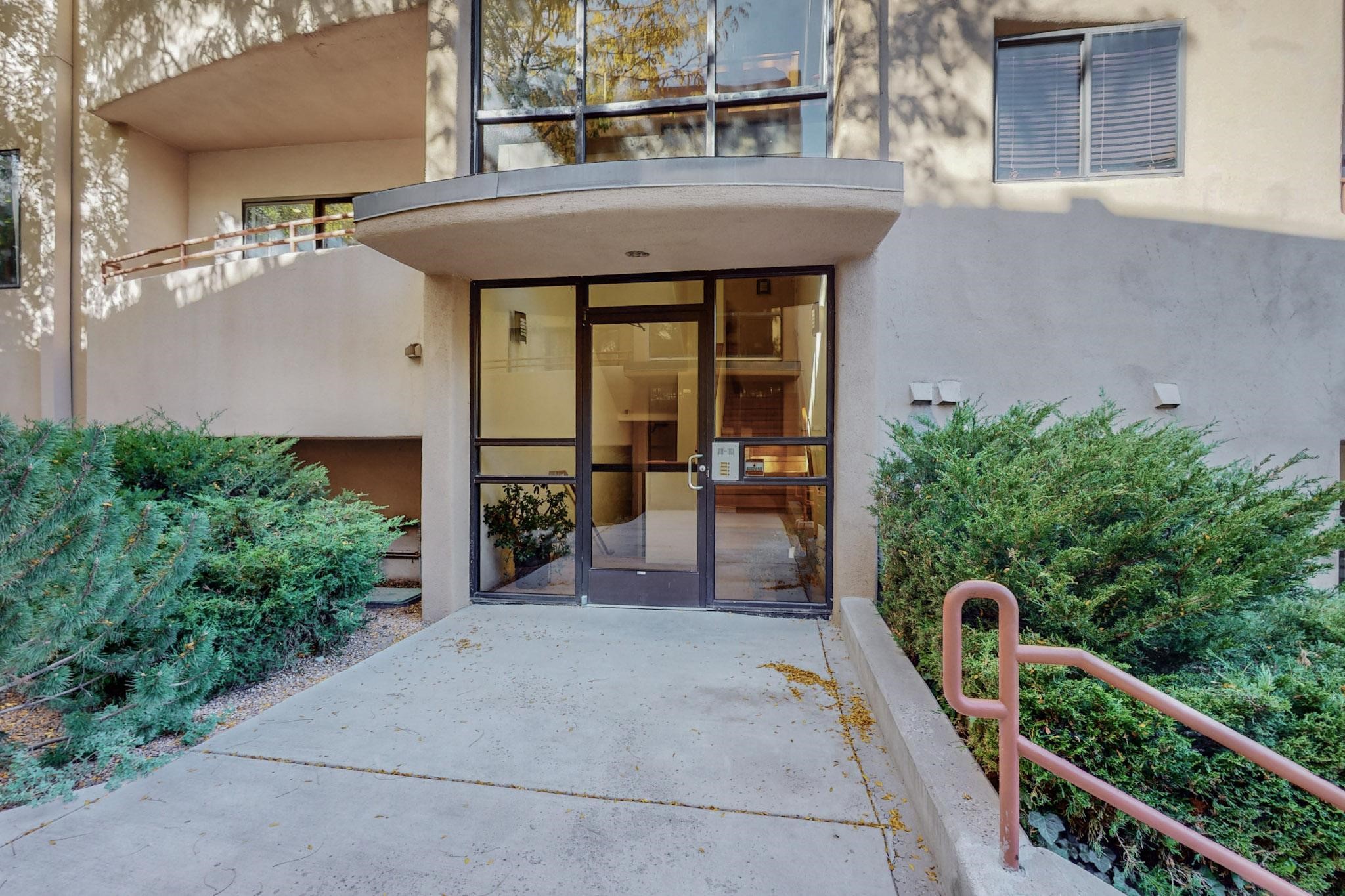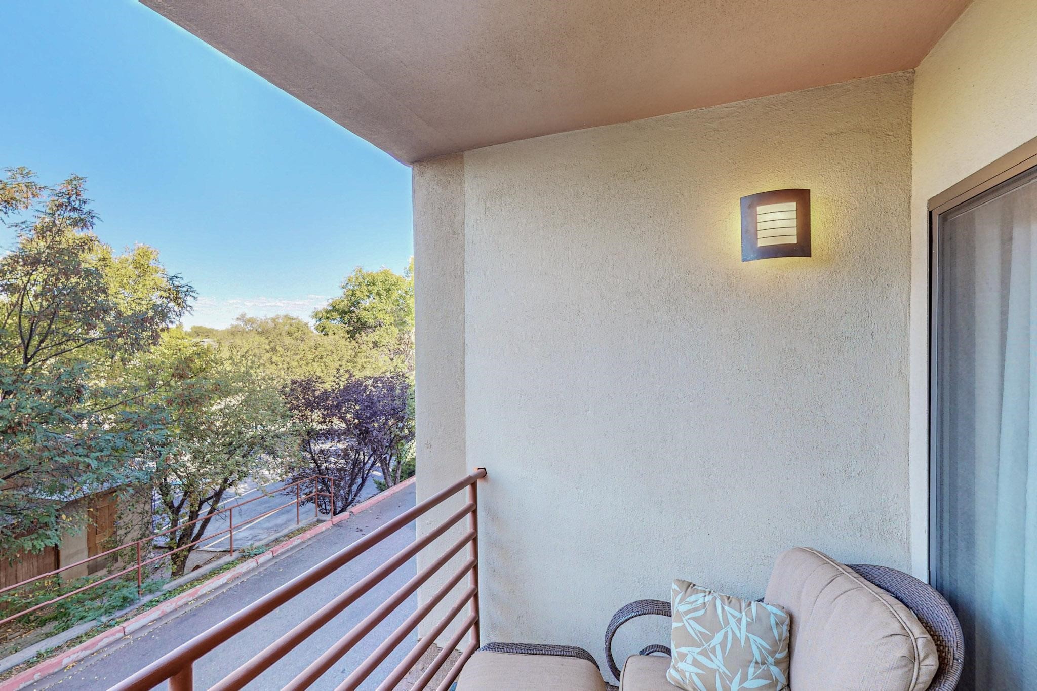 This beautiful home is an urban oasis surrounded by mature trees in a superb midtown location with beautifully inviting landscaped entry and walkways. Close to restaurants and shopping! Perfect for access to walking trails, biking or catching the Rail Runner train just a few blocks away. An upscale and mildly contemporary condo with 2 spacious balconies overlooking a courtyard with lots of greenery, and to the west, views of the Jemez mountains and magnificent colorful sunsets. Light filled, open and very comfortable floor plan with a large, exciting kitchen that includes granite counters and substantial cabinet space including a spacious pantry. The warm hardwood flooring adds additional beauty and dimensions to the home's spacious living area and lends itself well to a variety of layouts. Two comfortable bedrooms, a large bathroom for two and centrally located utility room with a washer & dryer. A surprisingly large 6.50' X 17' ground floor personal storage unit for your seasonal items and sports equipment. Covered parking keeps your vehicle protected from the elements. A NEW roof was added in 2024 and NEW stucco will be going in 2025! This very private and quiet location is centrally located, very affordable for Santa Fe, and is ready for you to call it home!