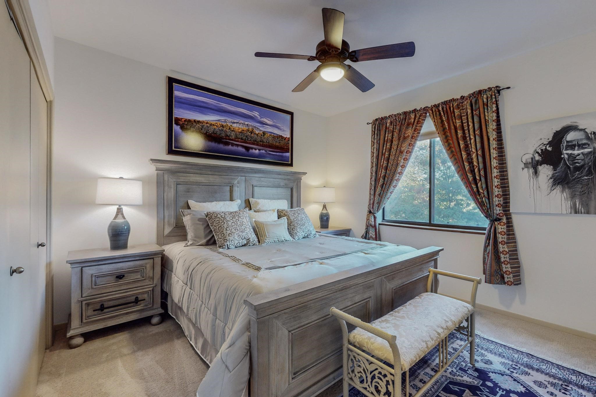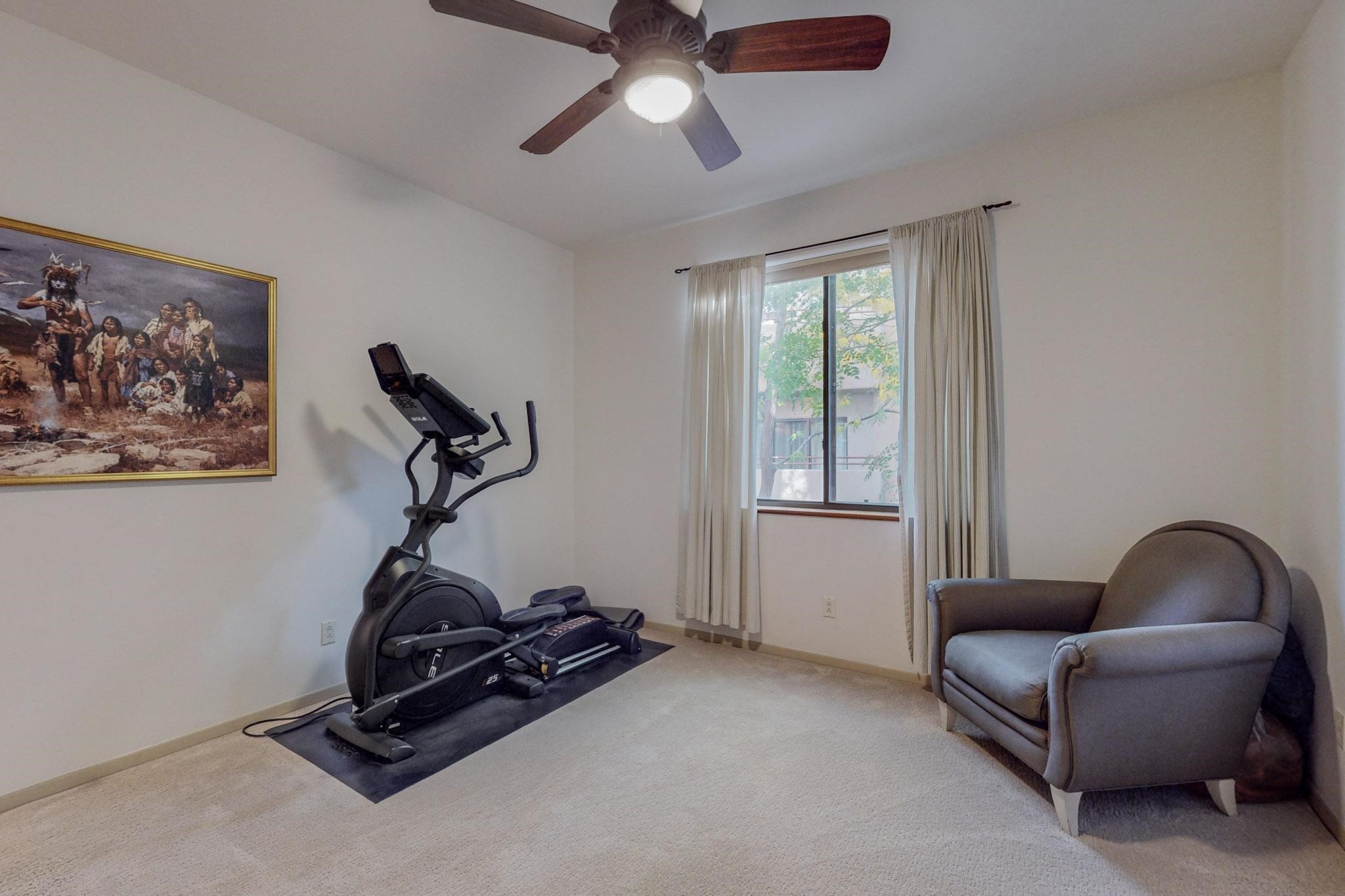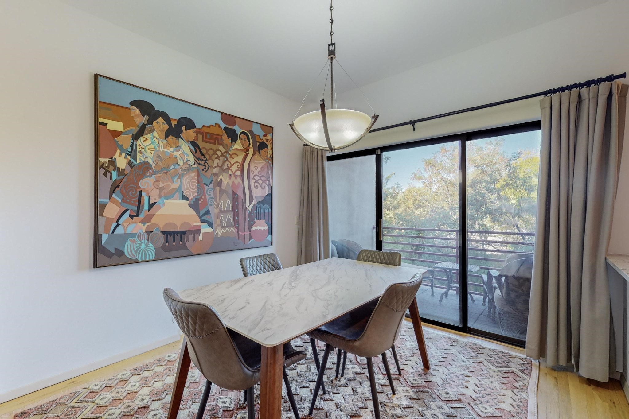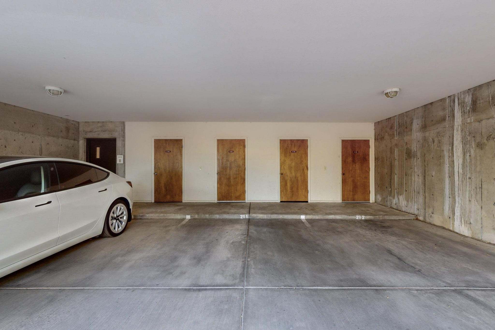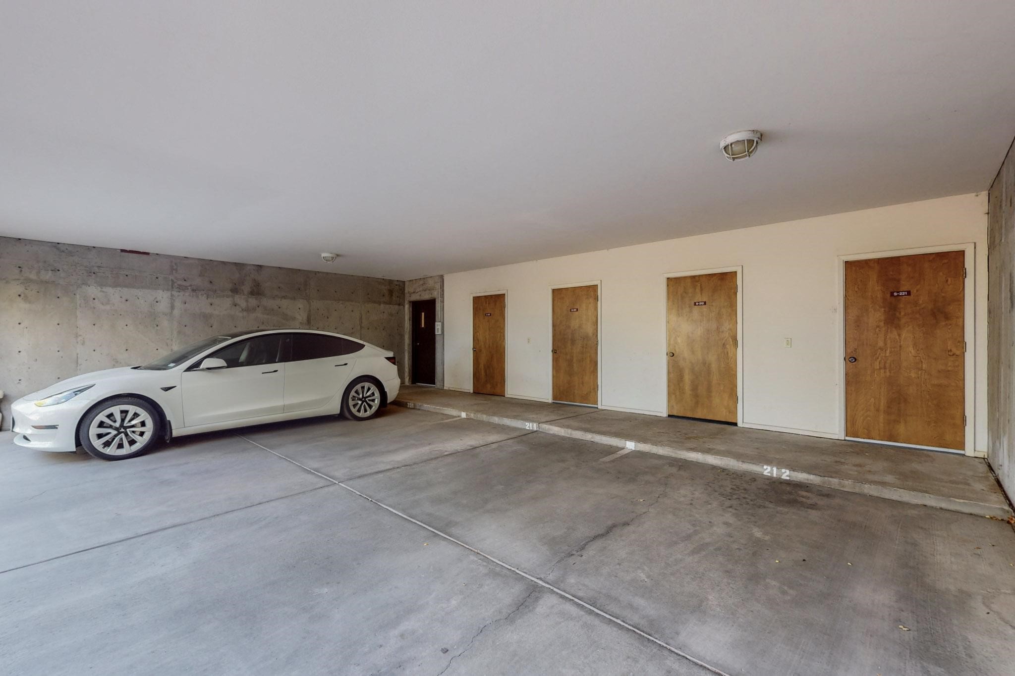 This beautiful home is an urban oasis surrounded by mature trees in a superb midtown location with beautifully inviting landscaped entry and walkways. Close to restaurants and shopping! Perfect for access to walking trails, biking or catching the Rail Runner train just a few blocks away. An upscale and mildly contemporary condo with 2 spacious balconies overlooking a courtyard with lots of greenery, and to the west, views of the Jemez mountains and magnificent colorful sunsets. Light filled, open and very comfortable floor plan with a large, exciting kitchen that includes granite counters and substantial cabinet space including a spacious pantry. The warm hardwood flooring adds additional beauty and dimensions to the home's spacious living area and lends itself well to a variety of layouts. Two comfortable bedrooms, a large bathroom for two and centrally located utility room with a washer & dryer. A surprisingly large 6.50' X 17' ground floor personal storage unit for your seasonal items and sports equipment. Covered parking keeps your vehicle protected from the elements. A NEW roof was added in 2024 and NEW stucco will be going in 2025! This very private and quiet location is centrally located, very affordable for Santa Fe, and is ready for you to call it home!