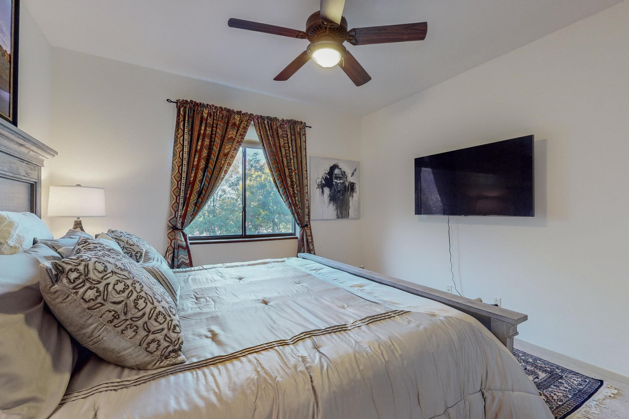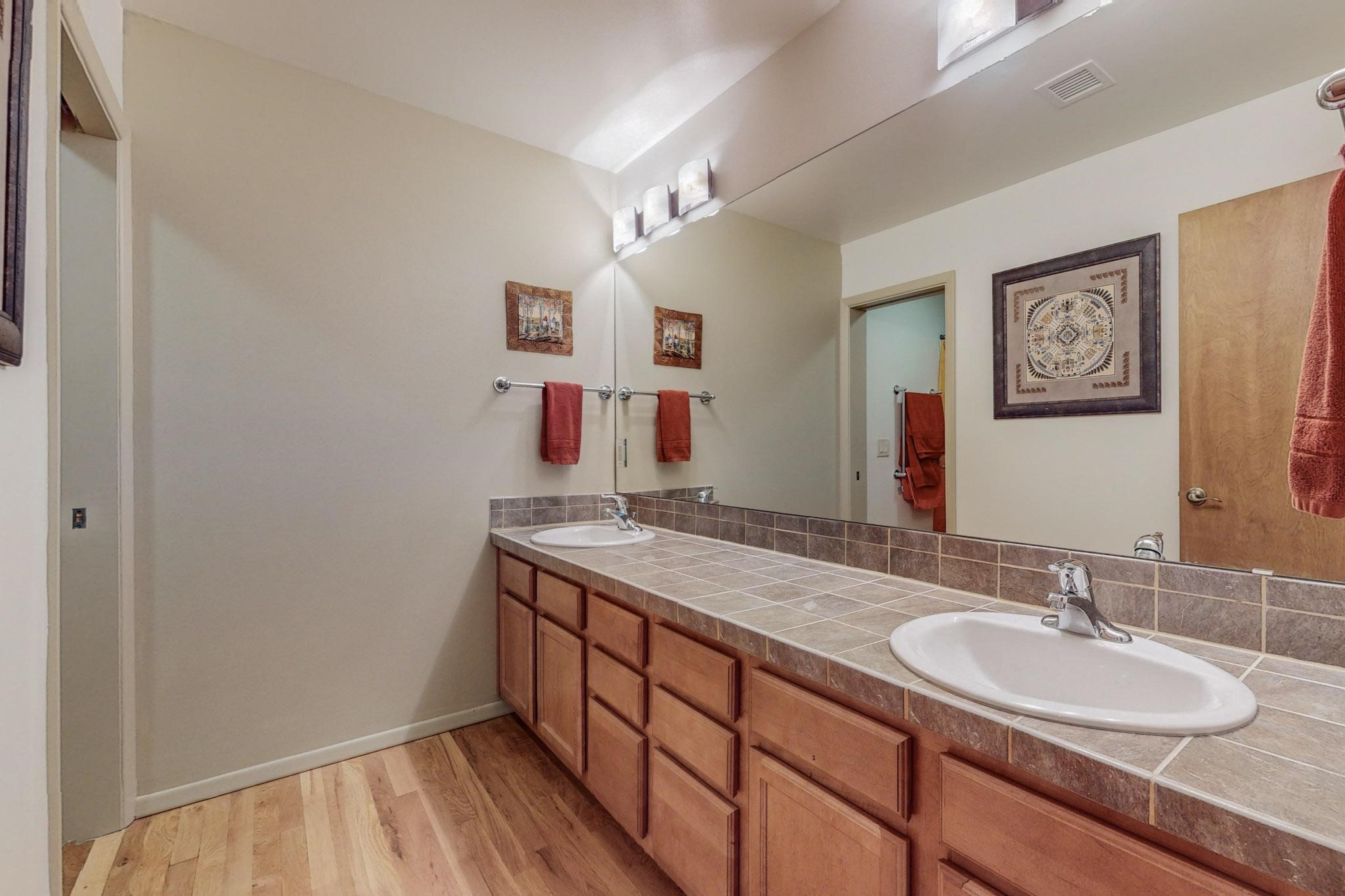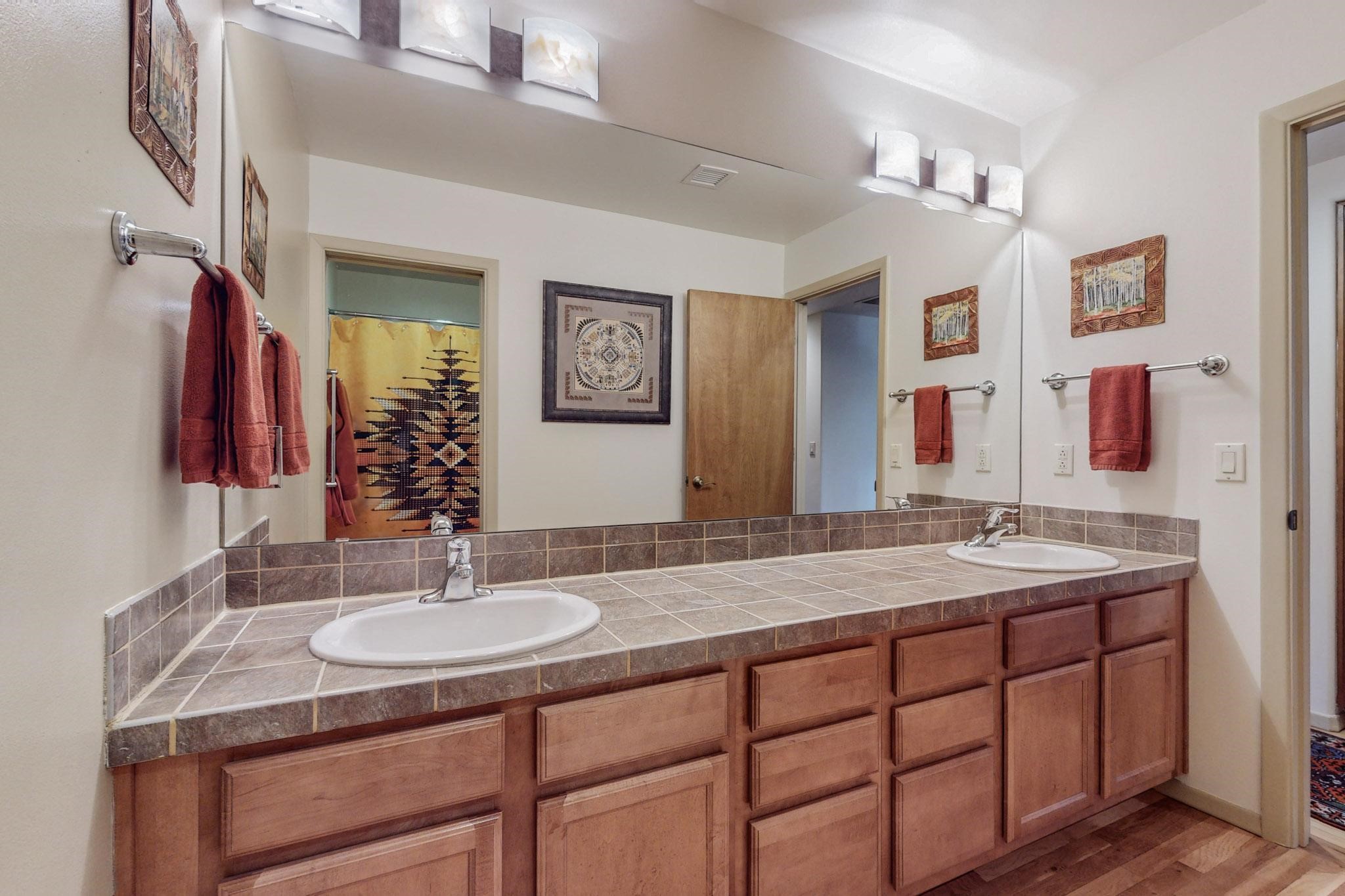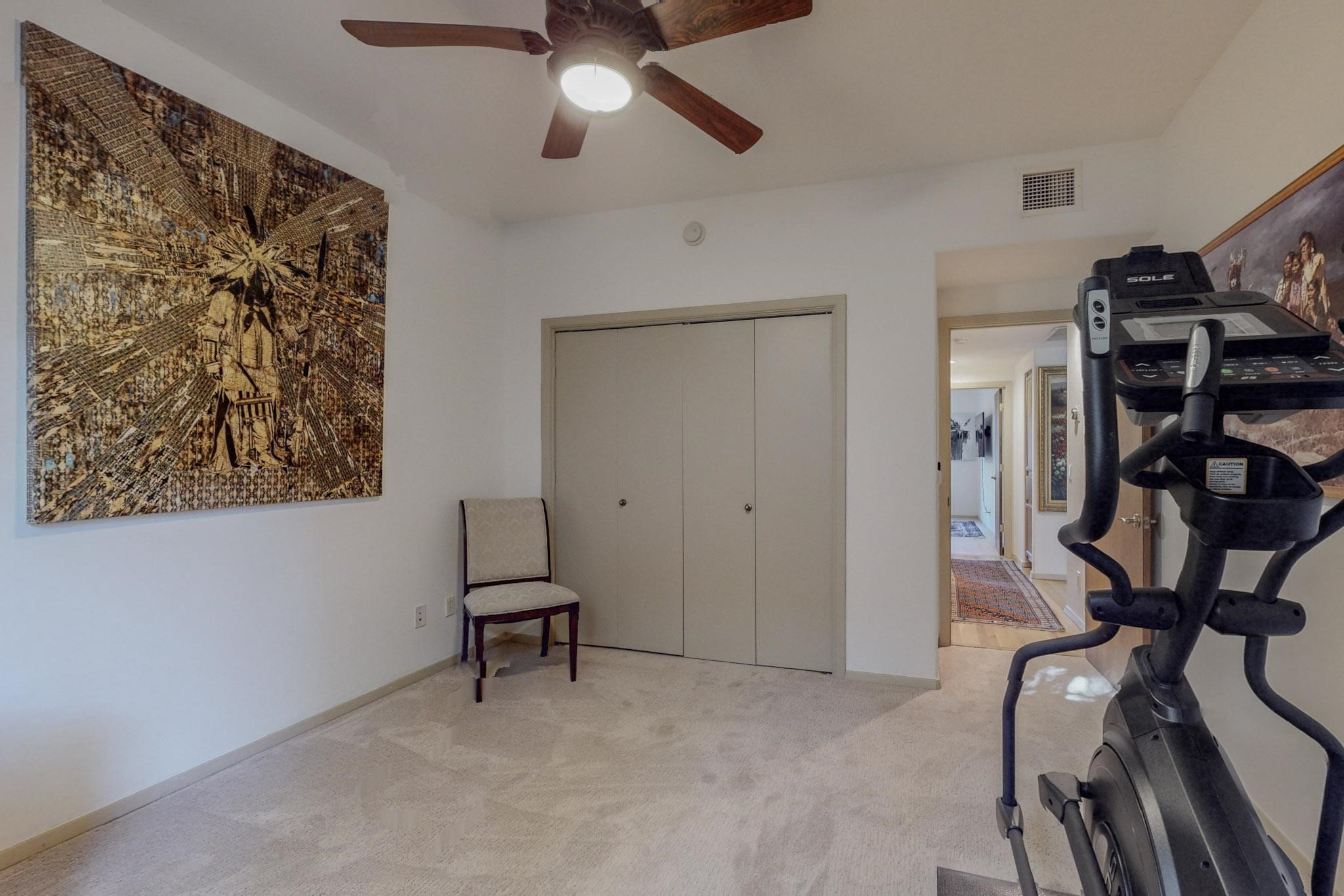 This beautiful home is an urban oasis surrounded by mature trees in a superb midtown location with beautifully inviting landscaped entry and walkways. Close to restaurants and shopping! Perfect for access to walking trails, biking or catching the Rail Runner train just a few blocks away. An upscale and mildly contemporary condo with 2 spacious balconies overlooking a courtyard with lots of greenery, and to the west, views of the Jemez mountains and magnificent colorful sunsets. Light filled, open and very comfortable floor plan with a large, exciting kitchen that includes granite counters and substantial cabinet space including a spacious pantry. The warm hardwood flooring adds additional beauty and dimensions to the home's spacious living area and lends itself well to a variety of layouts. Two comfortable bedrooms, a large bathroom for two and centrally located utility room with a washer & dryer. A surprisingly large 6.50' X 17' ground floor personal storage unit for your seasonal items and sports equipment. Covered parking keeps your vehicle protected from the elements. A NEW roof was added in 2024 and NEW stucco will be going in 2025! This very private and quiet location is centrally located, very affordable for Santa Fe, and is ready for you to call it home!