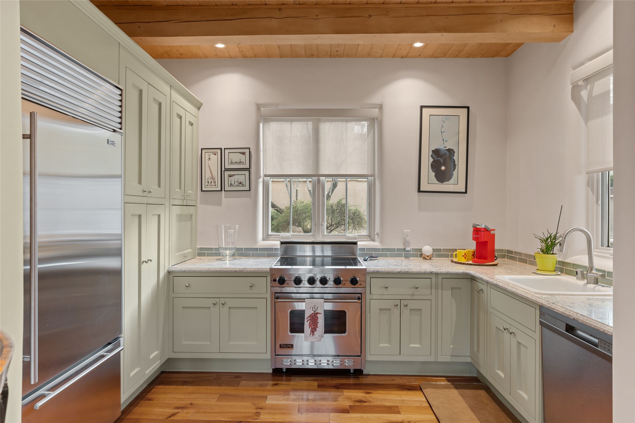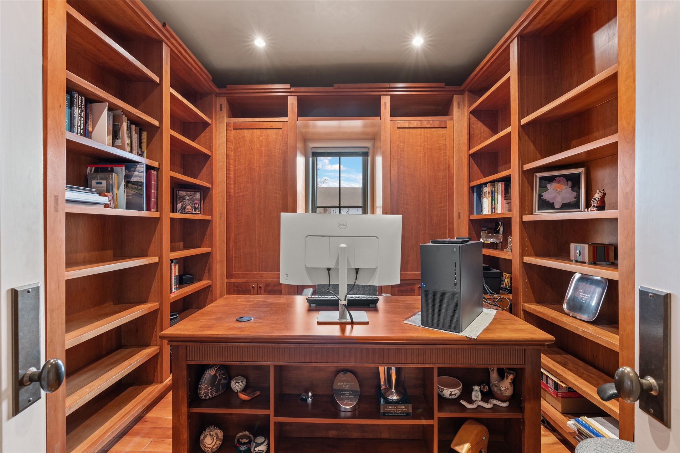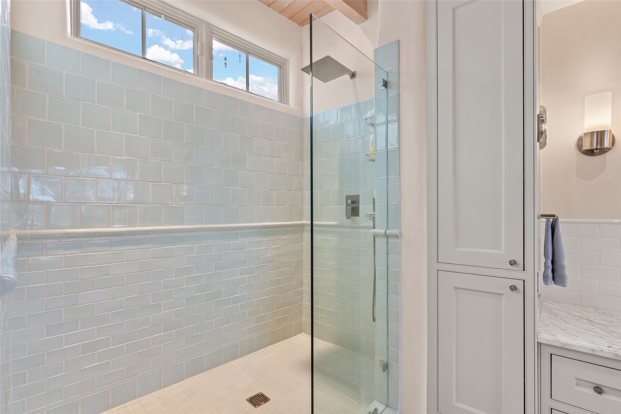 Panoramic Golf Course & Sangre de Cristo Mountain views are yours at this Soft Contemporary Masterpiece in Gated Las Campanas w 3 Bedrooms + Office + Media + 3-1/2 Baths, including a Guest House & 3-Car Garage & 6 Fireplaces. Spacious Living Room features a distinctive fireplace, wet bar & access to the back portal thru 4 glass doors that vanish into the wall, creating a 16-foot opening to the view. The Dining Room has space for 8 & a Chandelier of 6 stunning glass sculptures. The impressive Media Room has 11.2 sound system, refrigerator & reclining sectional couch. Gourmet Kitchen is designed for effortless meal preparation, w Wolf gas range/oven, Vent-a-Hood, Sub-Zero Refrigerator, double dishwasher + 4' x 9' island w prep sink & Insta-Hot water. The cozy Kitchen Nook has a wood-burning fireplace, room for casual dining + 2 lounge chairs.. The Main Bedroom Suite has a wood-burning fireplace, walk-in shower, 16-foot closet & & jetted tub w golf course view. Bedroom 2 is in a separate wing, located near the Den/Office. The free-standing Guest House offers the ultimate in privacy, w a Kitchen, Living area, Bedroom & washer/dryer. This Exquisite Residence has it All - 3 Bedrooms, Office, Media, 3-car garage, free-standing Guest House & recent major Stucco maintenance & GACO Roof Coating..The Outdoor Amenities make it a self-contained resort - Synthetic Putting Green, Fire Pit, Portal for the BBQ plus Golf & Mountain Views - Live the Resort Lifestyle in Las Campanas!