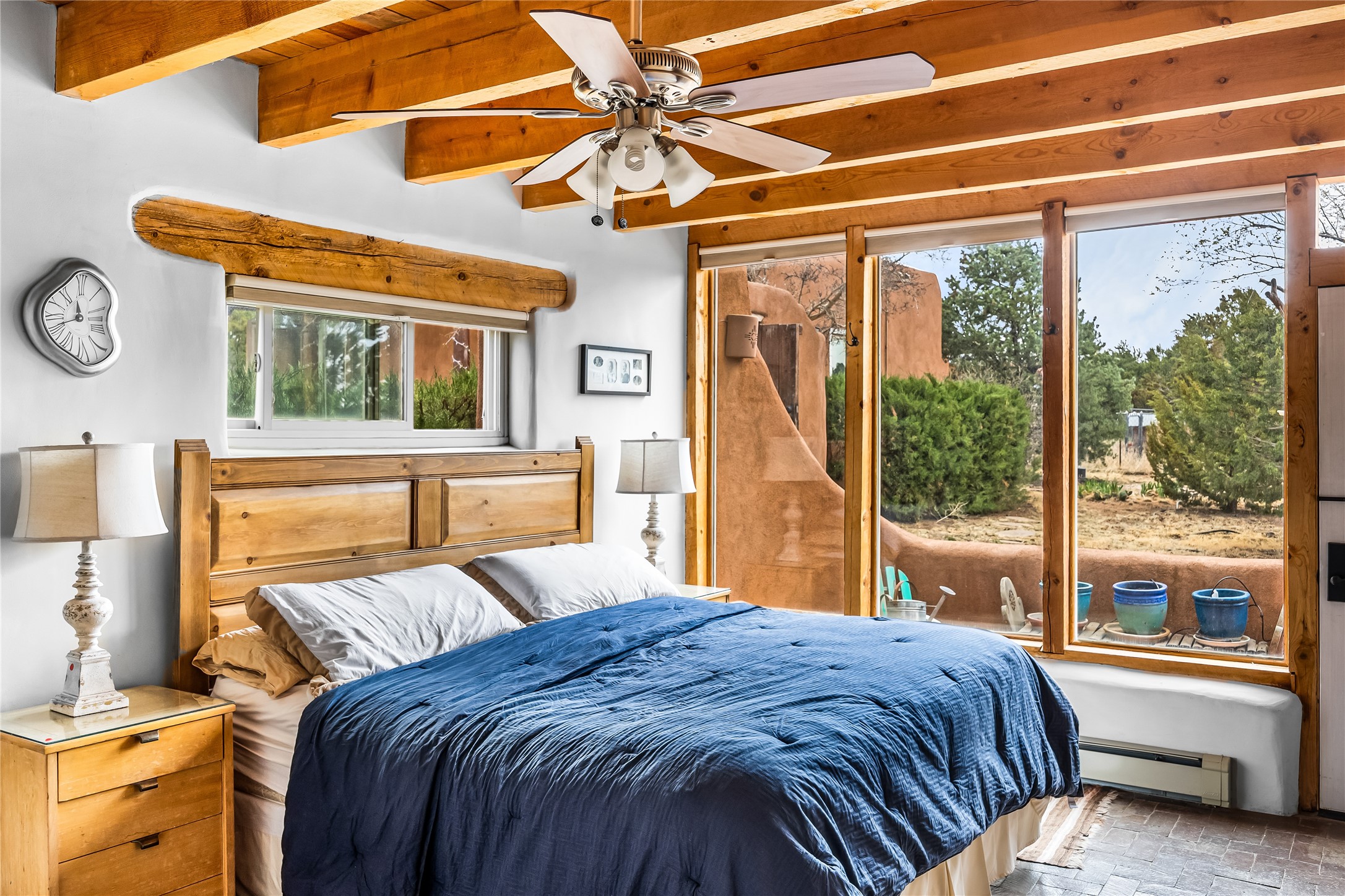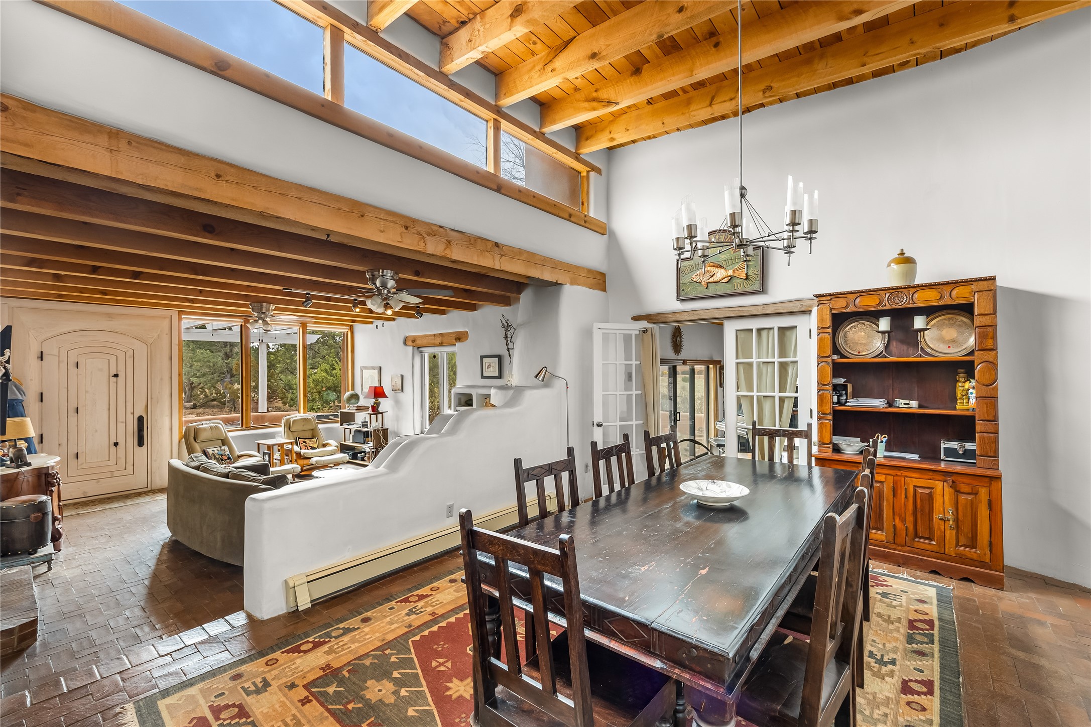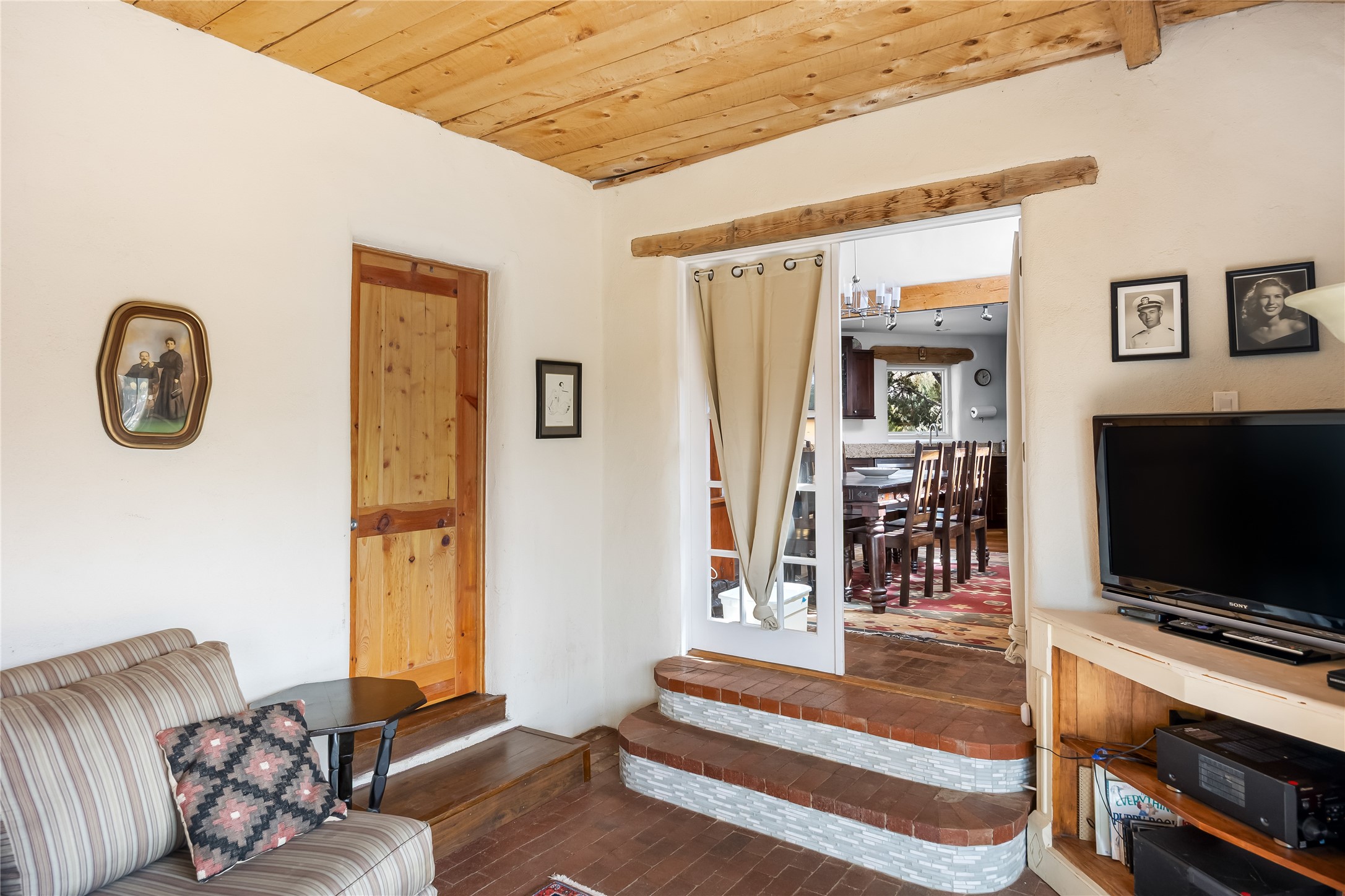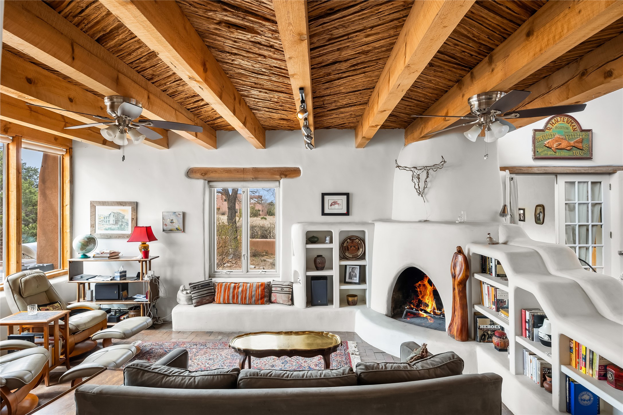 A very cool opportunity is knocking! Convenient in-town location for an adobemain home, plus a detached, spacious Guest House, plus an attached set of(unheated) studio spaces, currently used for music production, plus a detachedoutbuilding, all sited on a 1.8 acre lot! The magic begins as you enter the propertythrough a set of stylized stucco buffalo gates, built by local sculptor, Don Redman; the buffalo theme is repeated in theGuest House's entry. The main home, which has passive solar design, exudes warmth & quintessential Southwestcharm, with brick flooring, a beautifully designed kiva fireplace, high woodaccented ceilings and a Sunroom built by Tent Rock Construction.. An open floor plan and large dining room suggest wonderful times with friends and/or family!! Its two nicely sized bedrooms each featuredoors leading out to the inviting front patio; the primary bedroom also features akiva fireplace. Settings for outdoor gatherings at the home's entry abound. GuestHouse is currently leased. Property to be sold in as is condition.