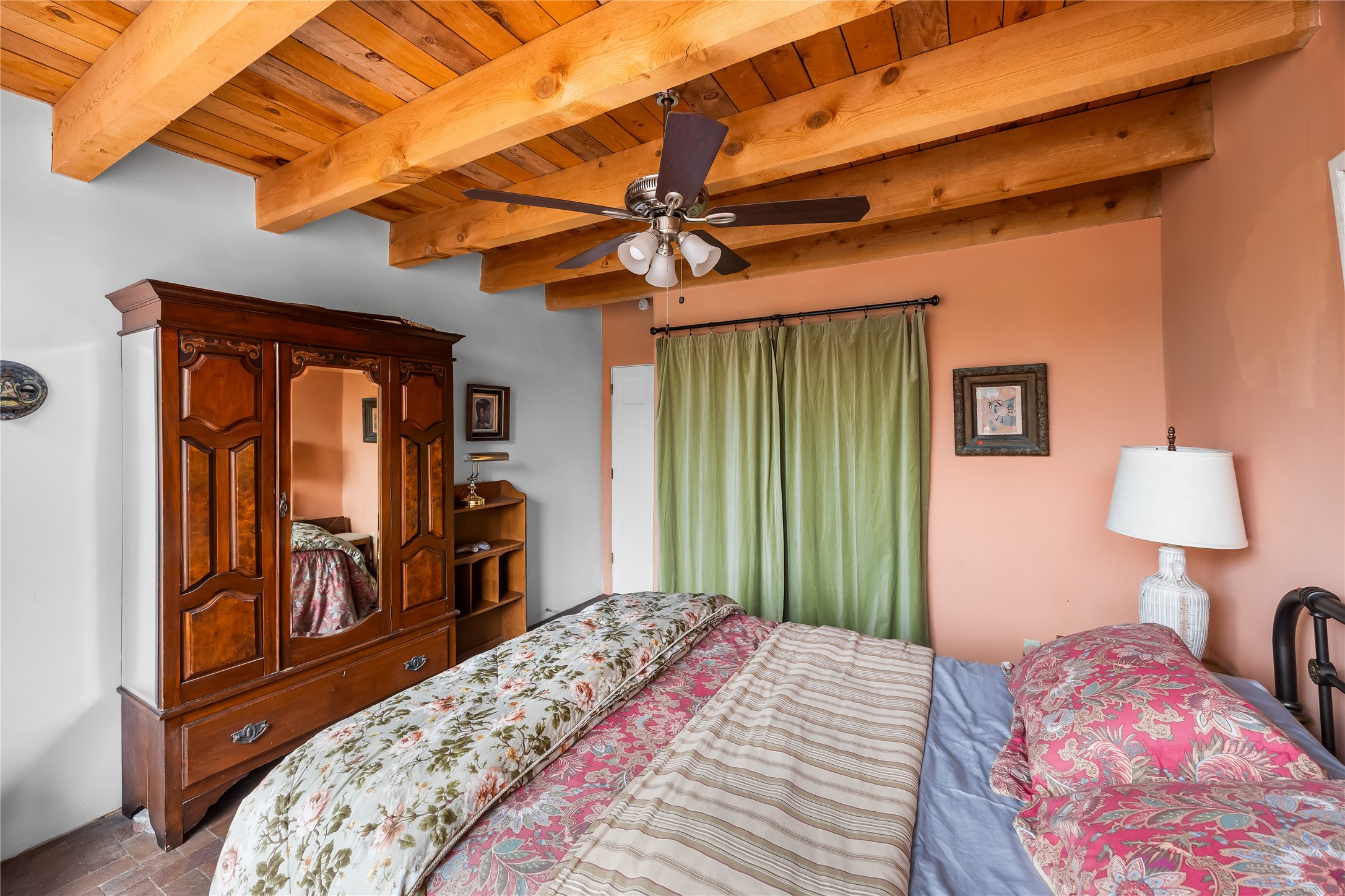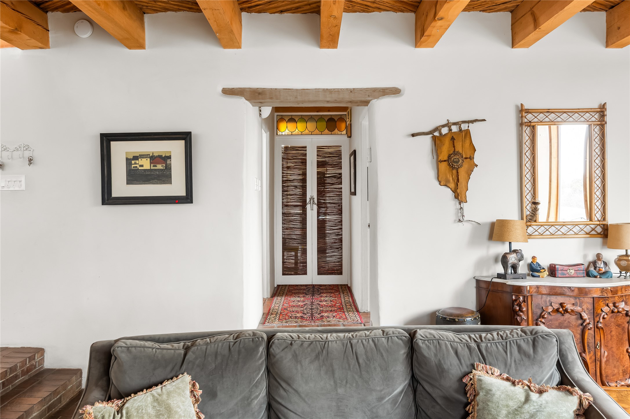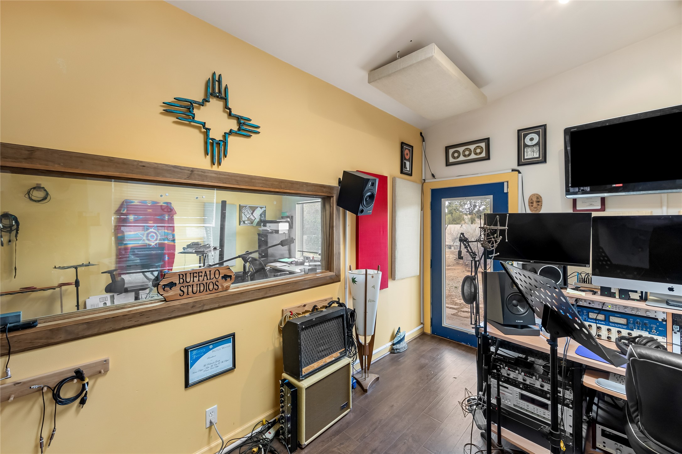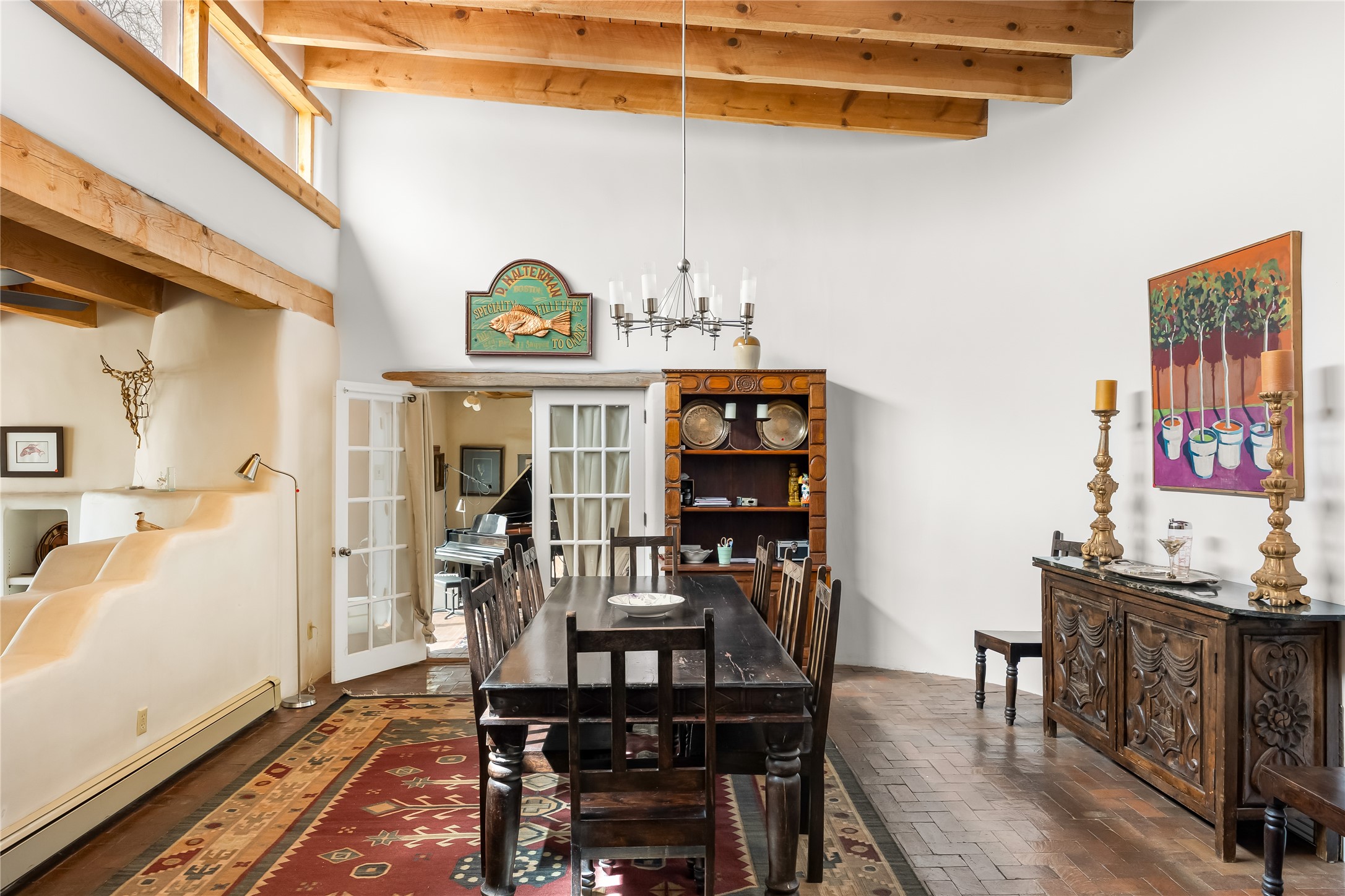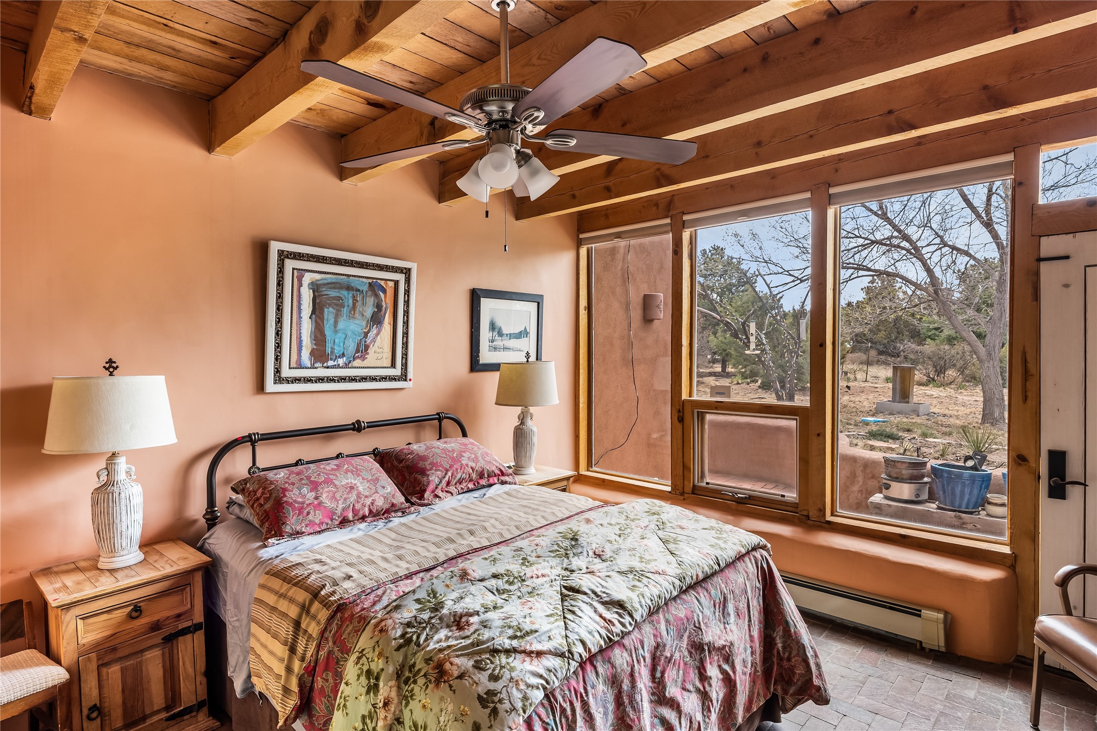 A very cool opportunity is knocking! Convenient in-town location for an adobemain home, plus a detached, spacious Guest House, plus an attached set of(unheated) studio spaces, currently used for music production, plus a detachedoutbuilding, all sited on a 1.8 acre lot! The magic begins as you enter the propertythrough a set of stylized stucco buffalo gates, built by local sculptor, Don Redman; the buffalo theme is repeated in theGuest House's entry. The main home, which has passive solar design, exudes warmth & quintessential Southwestcharm, with brick flooring, a beautifully designed kiva fireplace, high woodaccented ceilings and a Sunroom built by Tent Rock Construction.. An open floor plan and large dining room suggest wonderful times with friends and/or family!! Its two nicely sized bedrooms each featuredoors leading out to the inviting front patio; the primary bedroom also features akiva fireplace. Settings for outdoor gatherings at the home's entry abound. GuestHouse is currently leased. Property to be sold in as is condition.